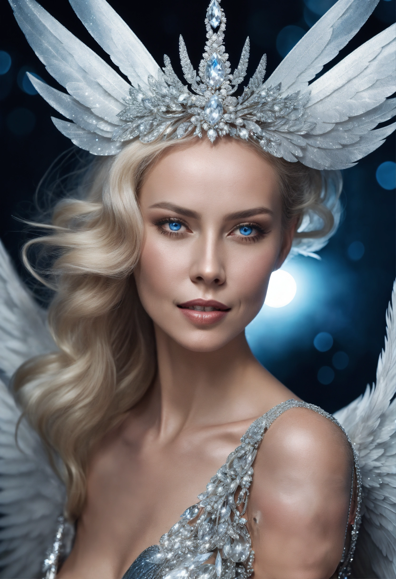 Surreal close up photo portrait of stunningly gorgeous graceful elegant ethereal sophisticated archangel of the moon with gigantic angel wings, staring at the camera, background is explosion of silver sparkles and full moon, forty-year-old very slim supermodel white woman blissfully joyous, high cheekbones, full lips, laughing and staring lovingly straight ahead directly into camera at me as if listening intently to me, gigantic white huge gigantic wings spreading out from her back, long silver hair with gentle wave, loving glowing ice-blue eyes centred directly on me, wearing alexander mcqueen white and diamond haute couture gown with high neckline, iconic, award winning photo