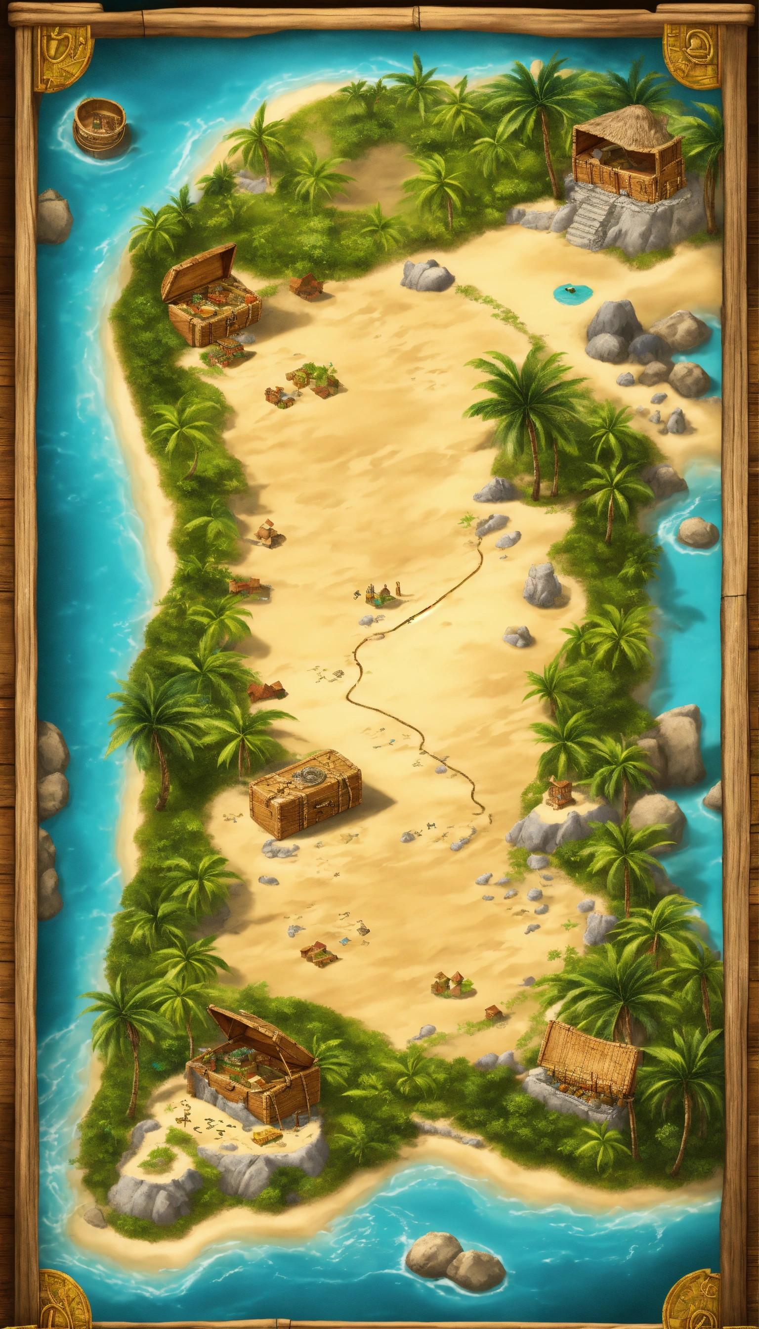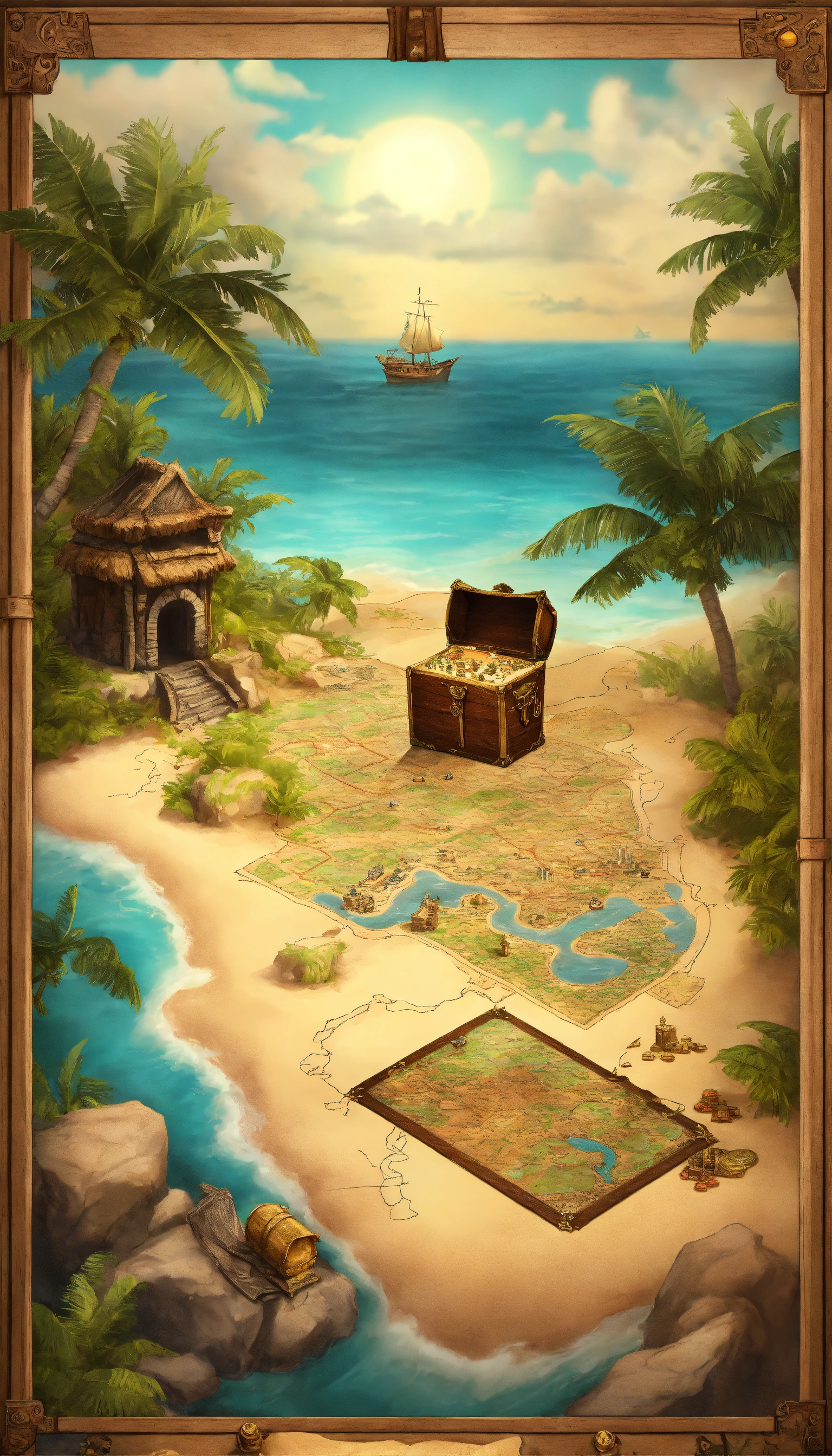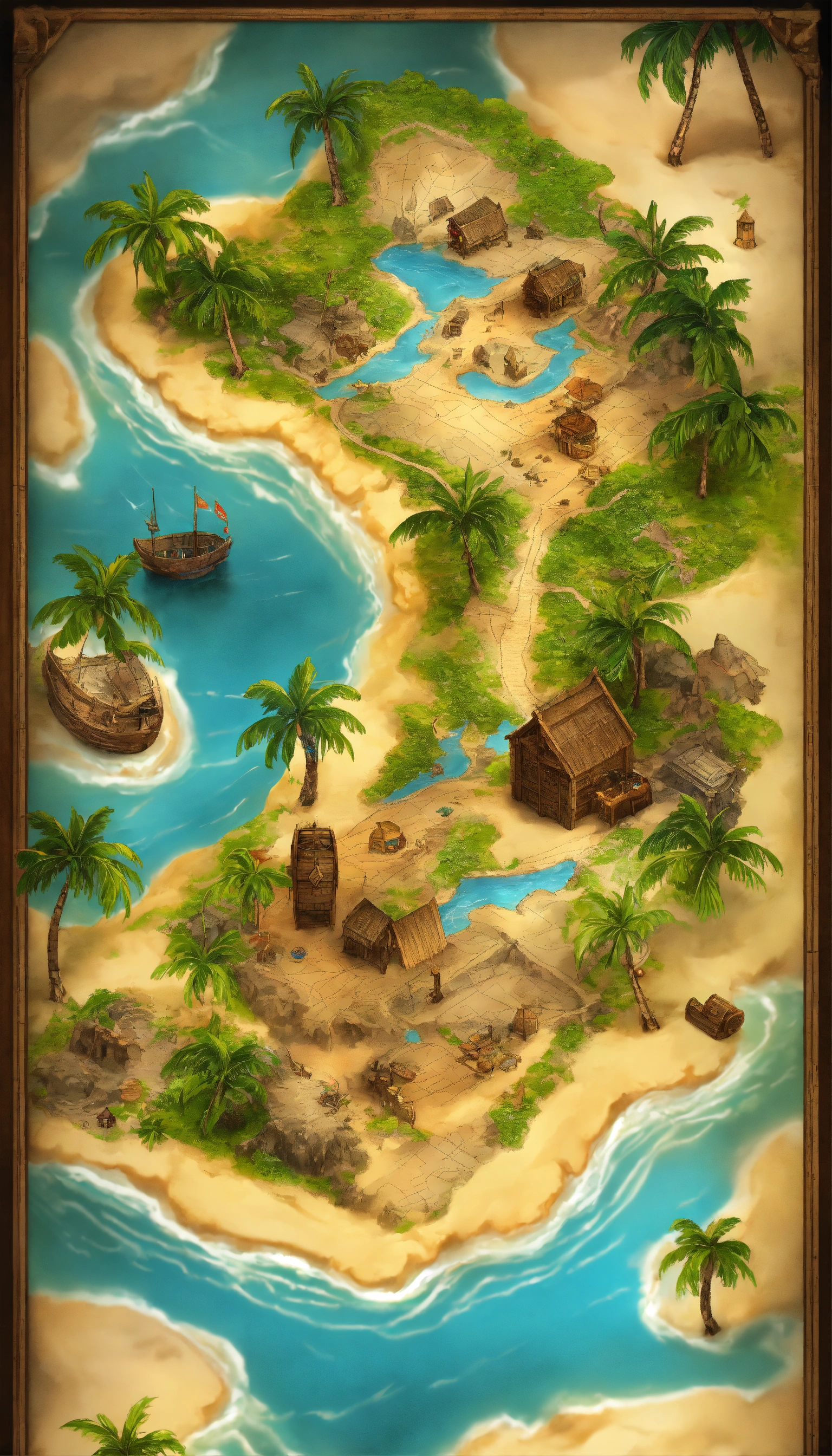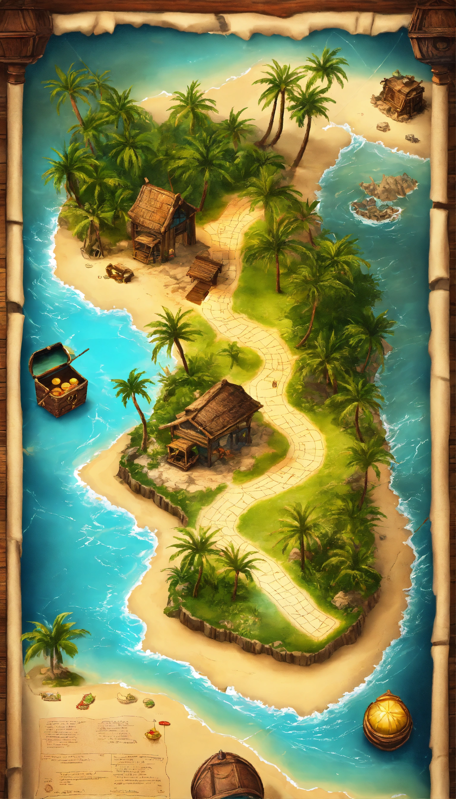 An old ancient map with a path to treasure chest, ocean with palms on a island, 8k, detailed hd, realistic, board game type with treasure chest on it