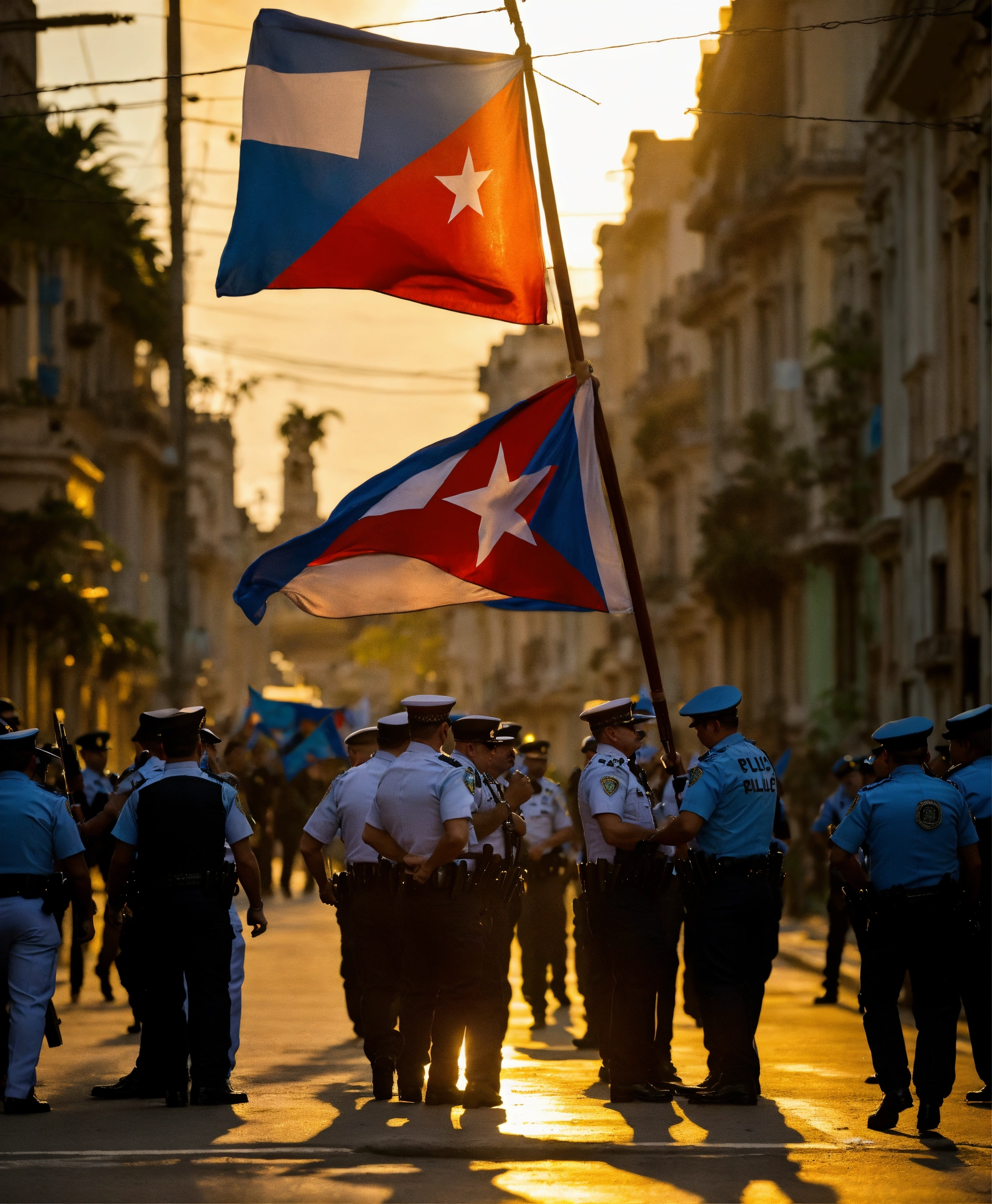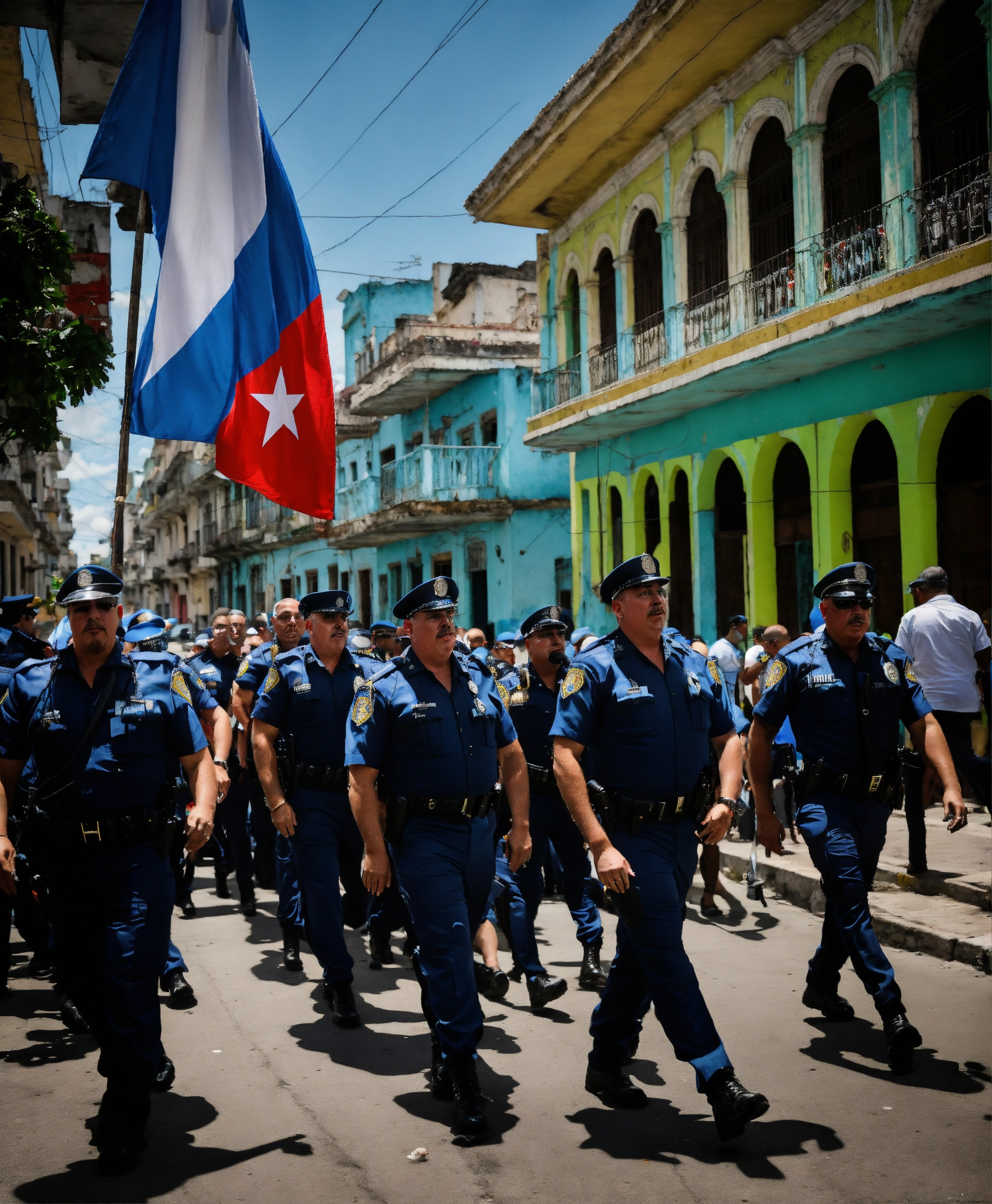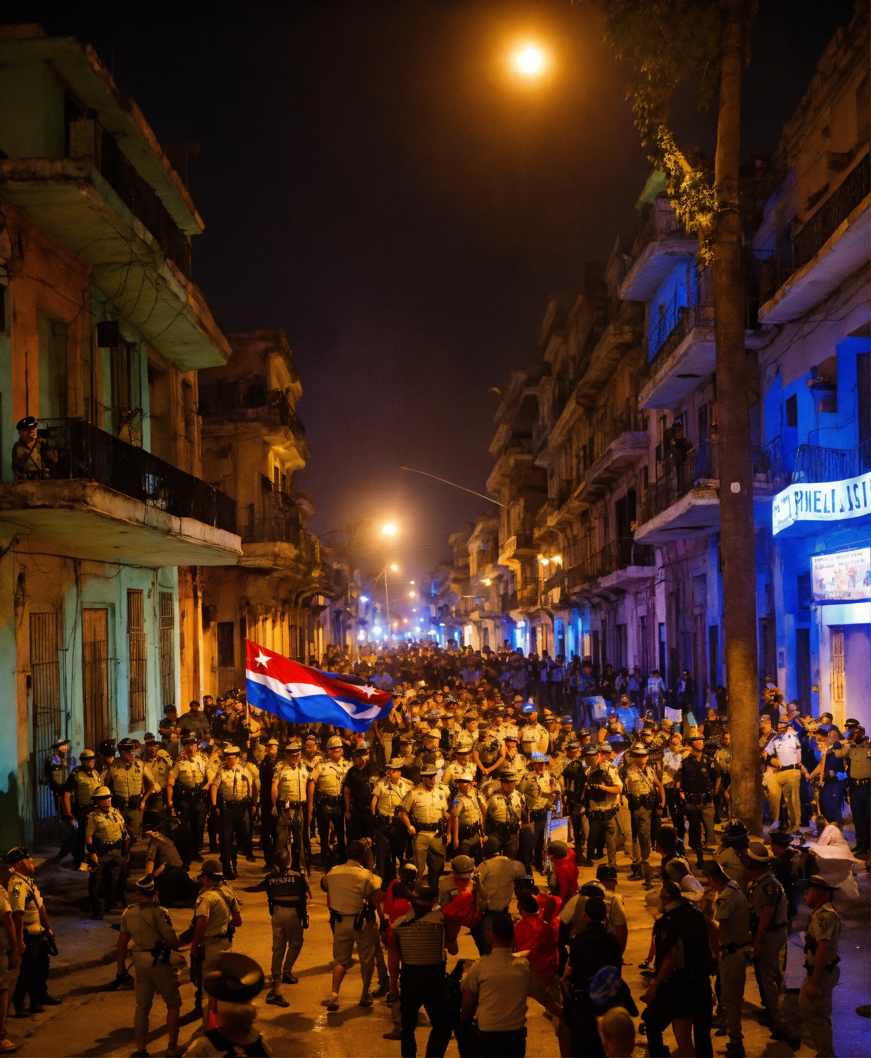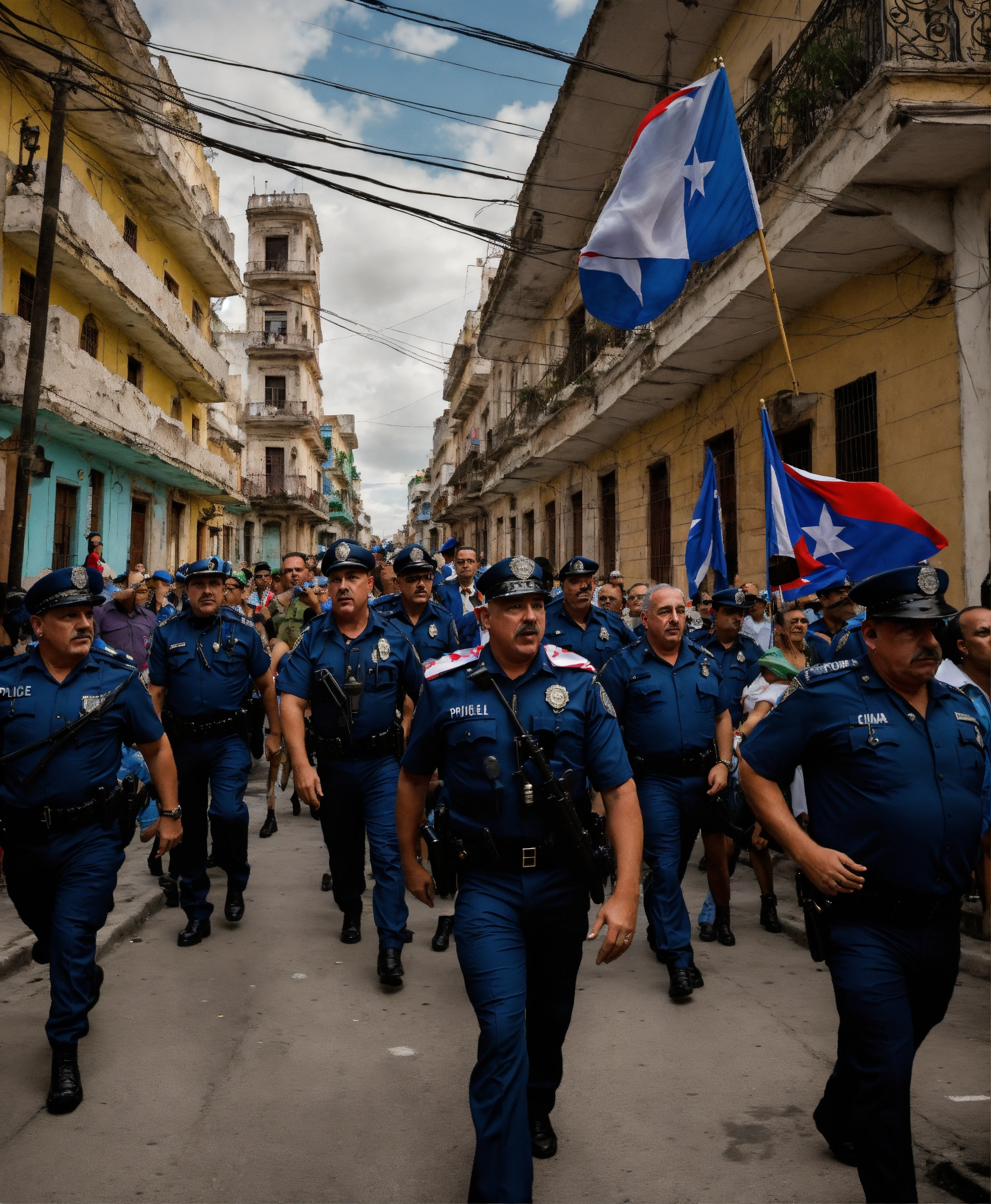 (un grupo de policias llevando preso al presidente de cuba, diaz canel) una calle de la habana vieja, con un mood melancolico, la calle rodeada de cubanos protestando y critando con banderas de cuba en sus manos y carteles que dicen libertad
