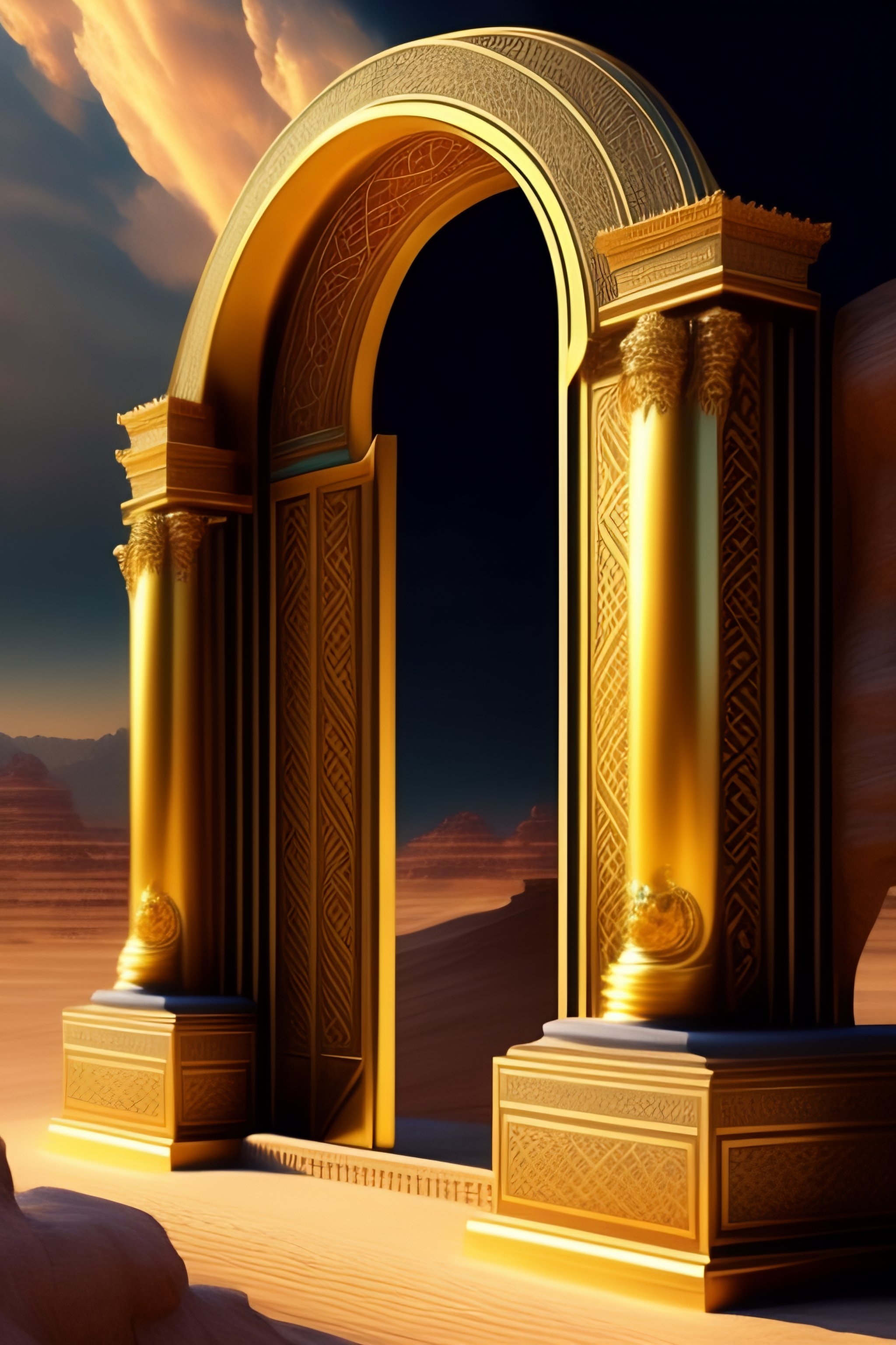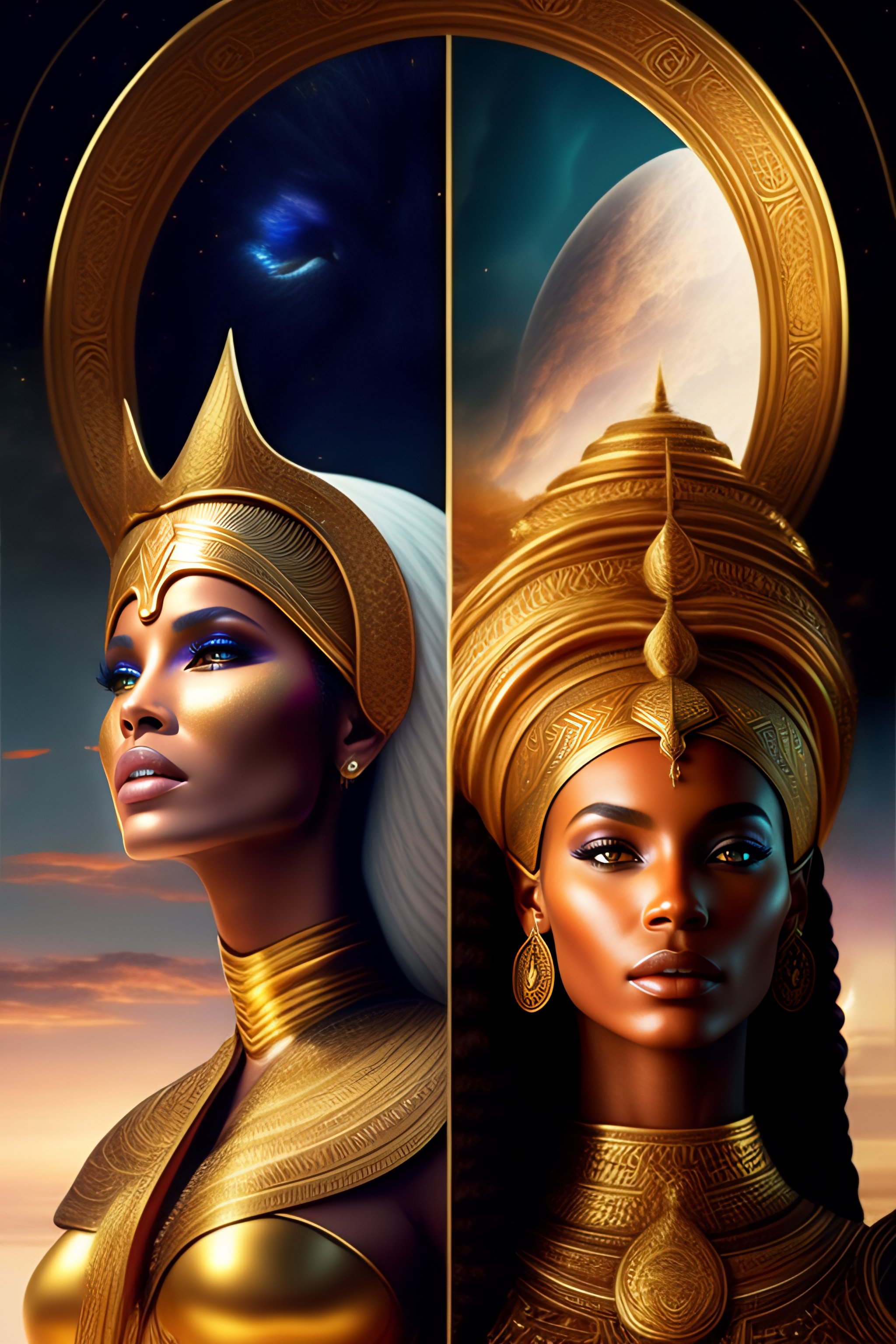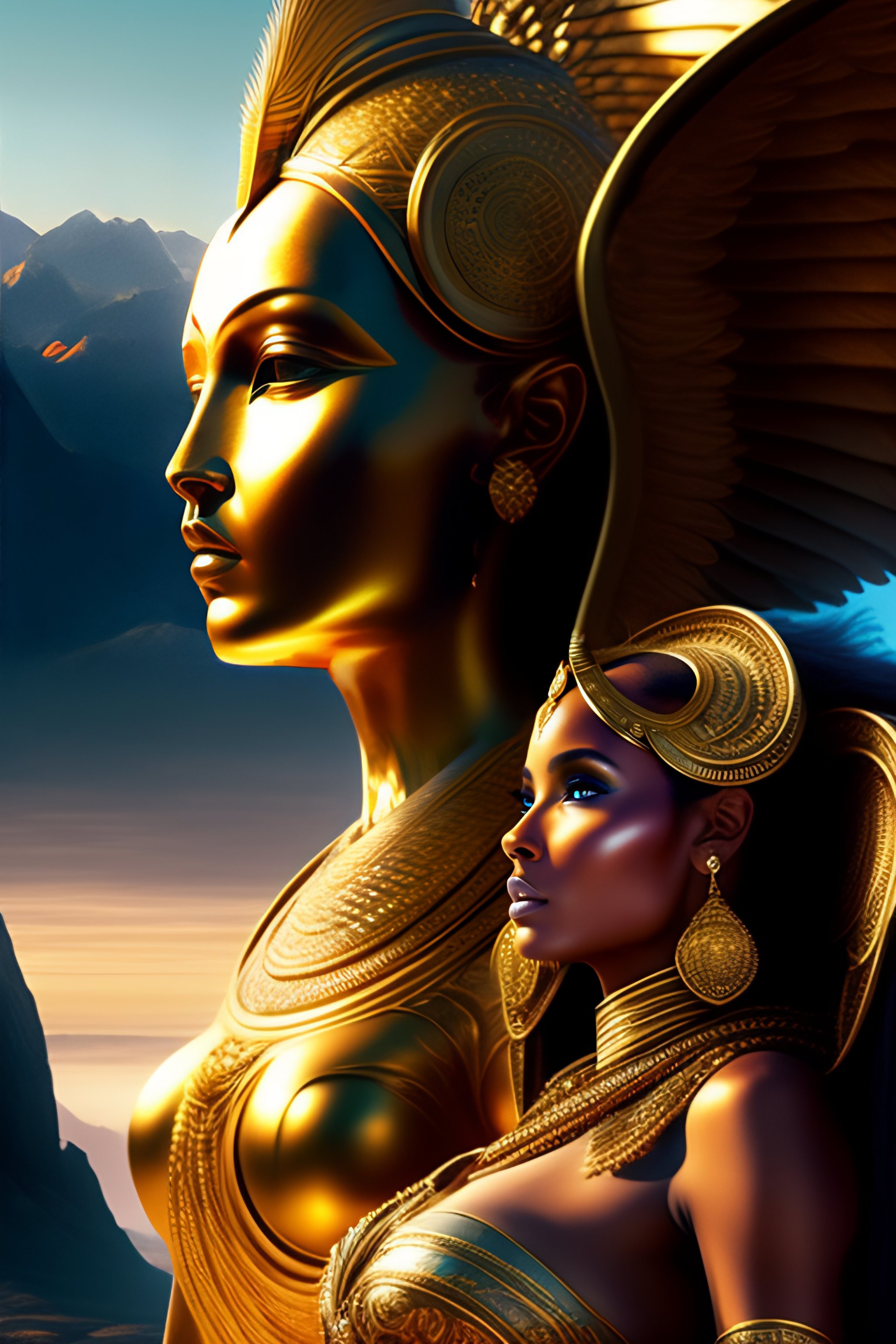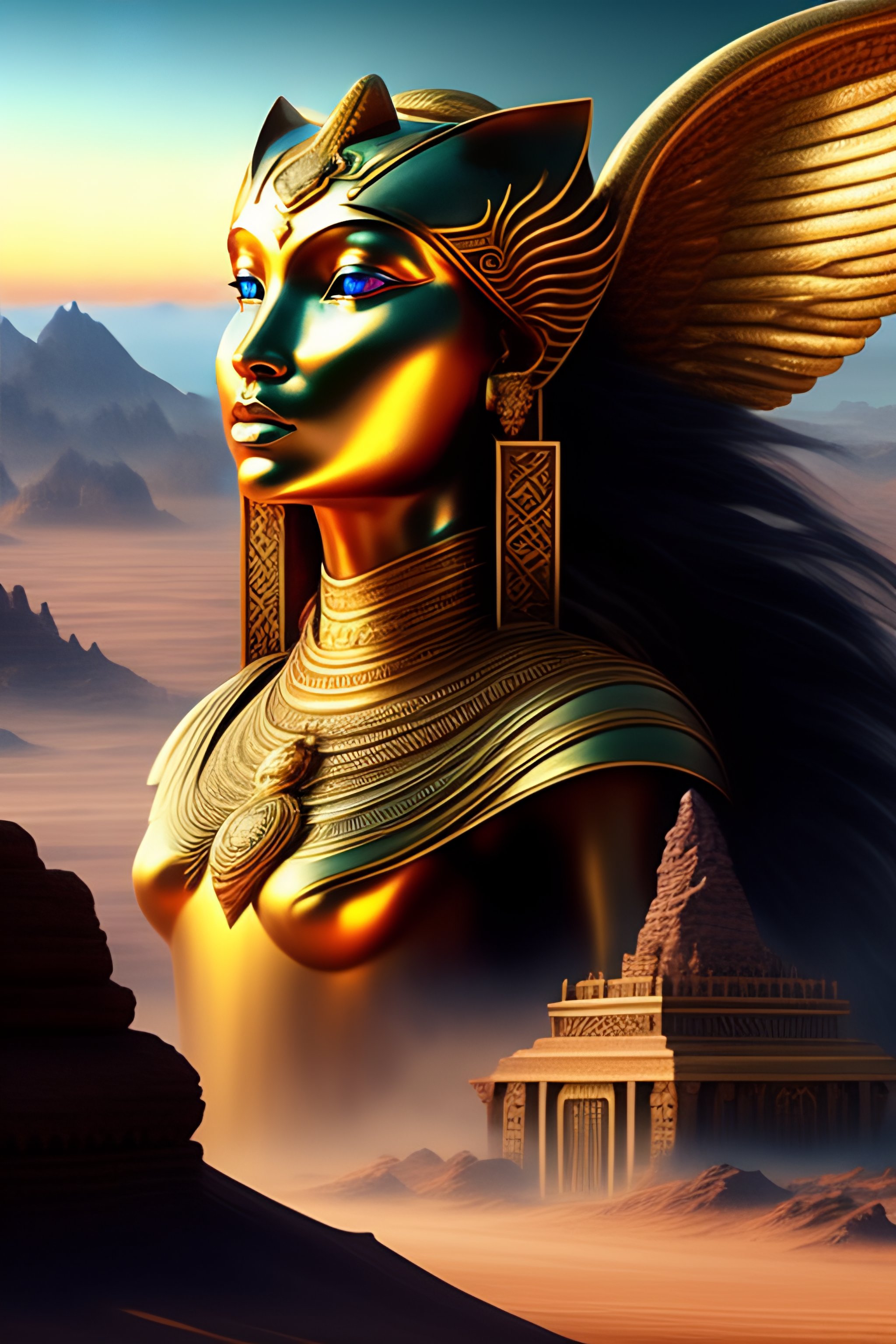 Neverending story, gate to the southern oracle, two golden beautiful woman sphinxes facing eachother, epic scale, cinematic view, hyperrealistic, fantasy movie scene