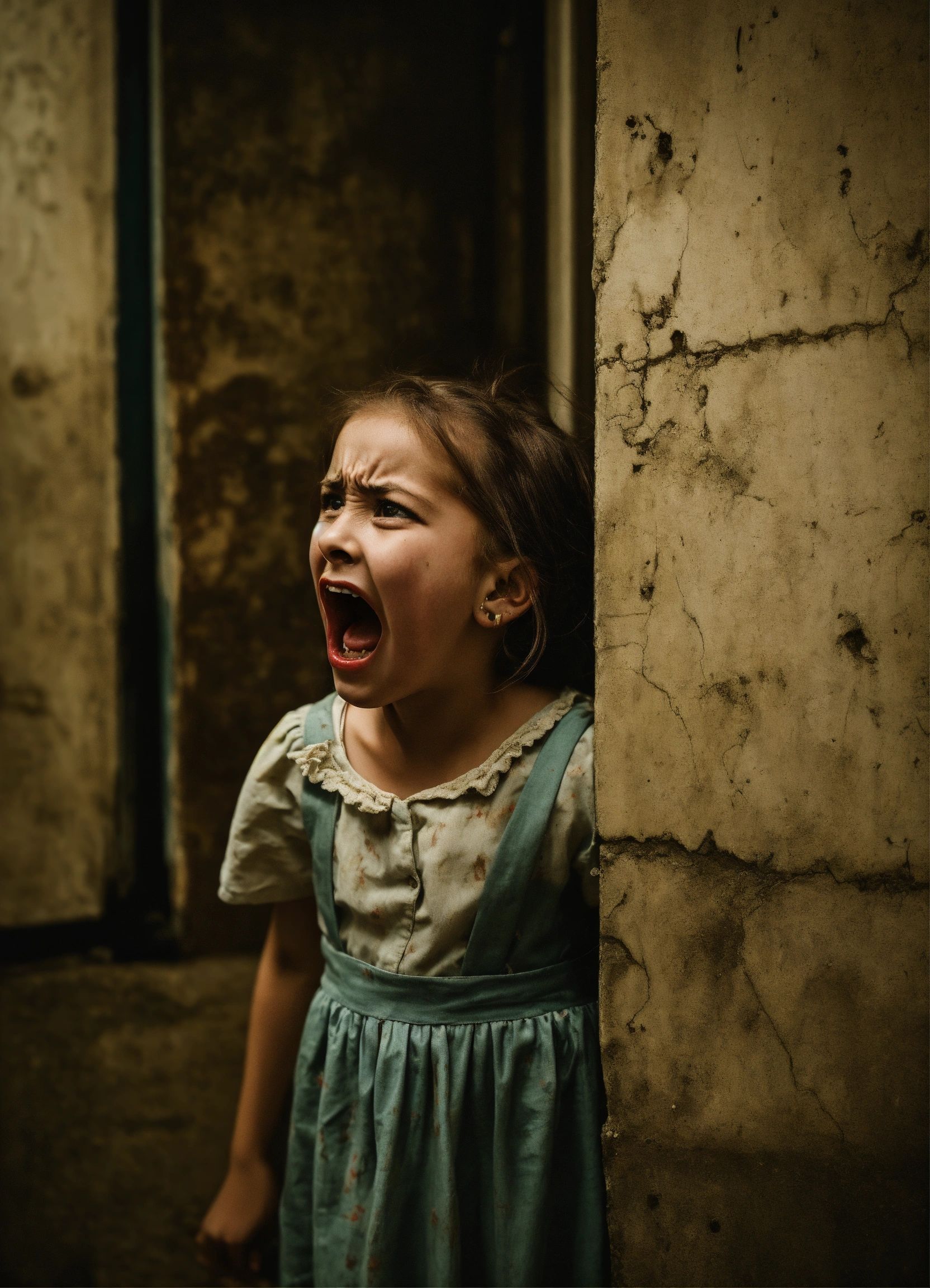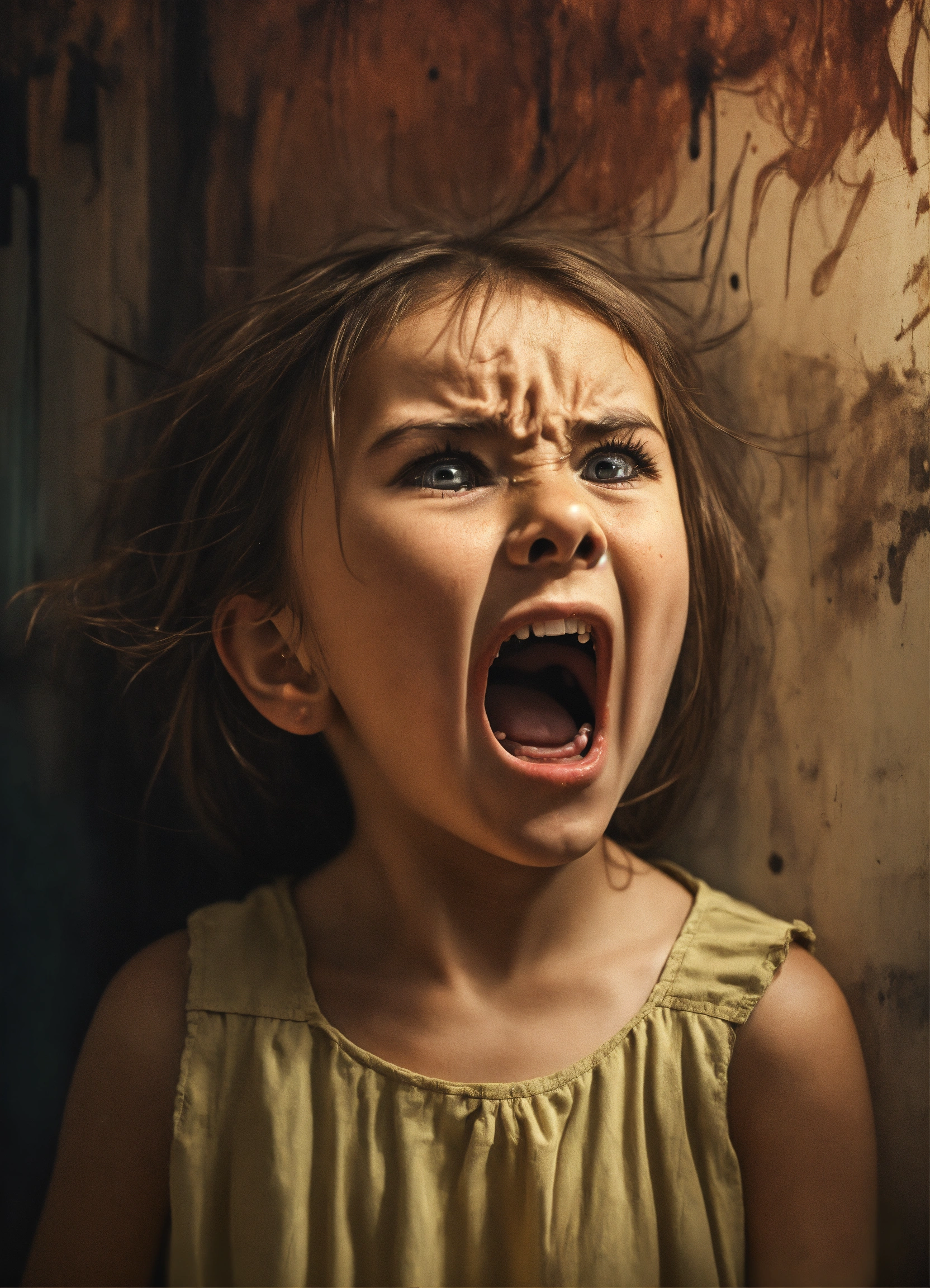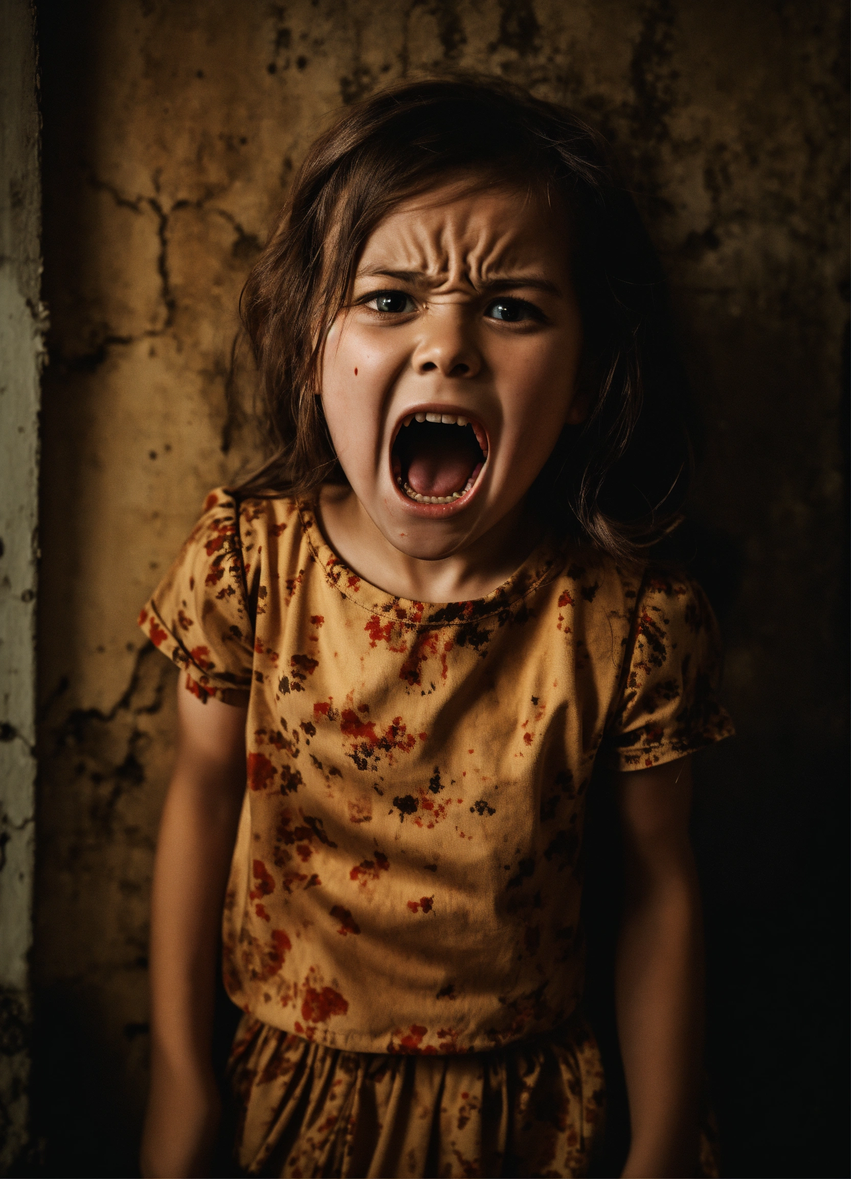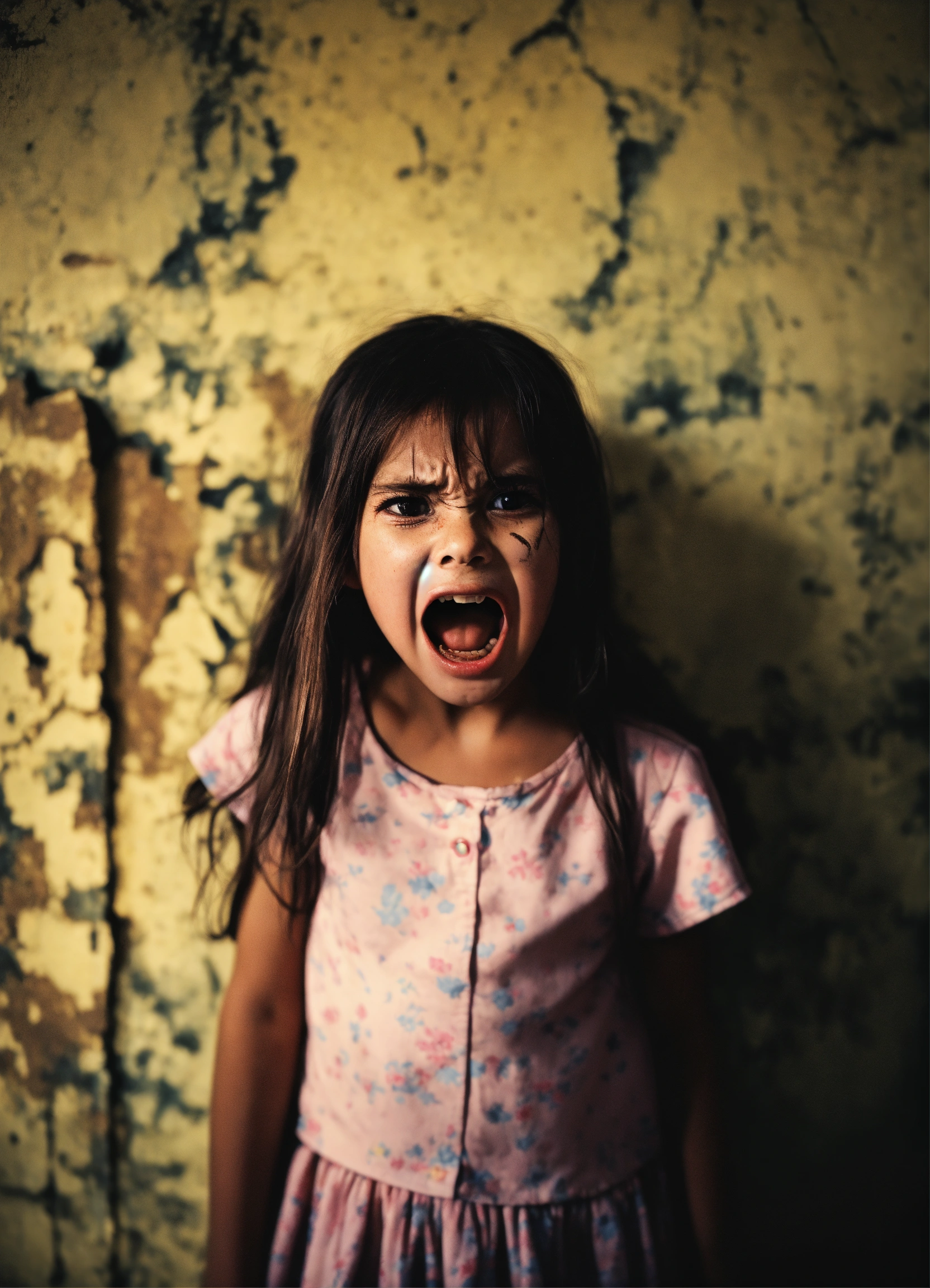 A little girl mentally ill screaming and shouting in front of a wall, black eyed and possessed by the evil