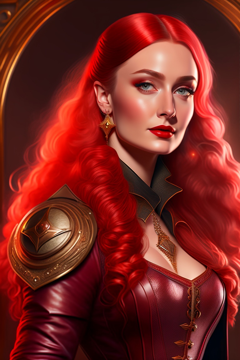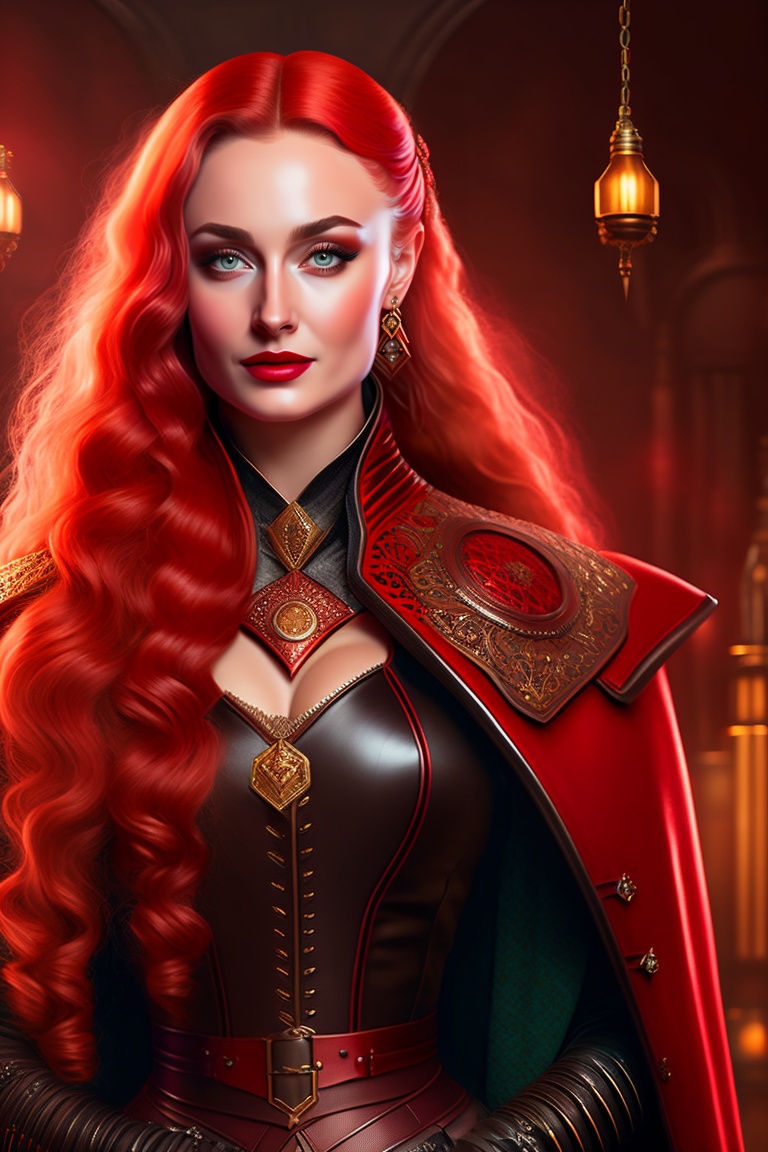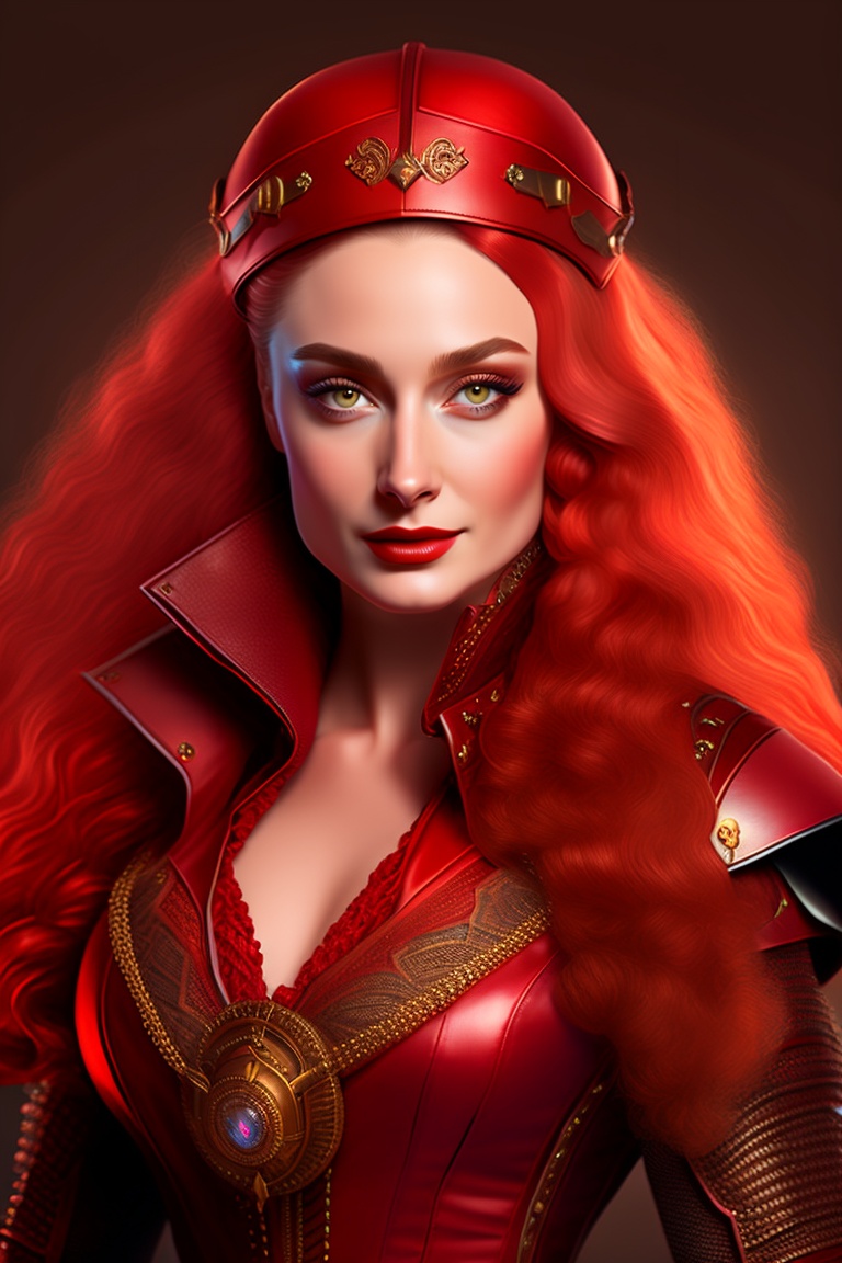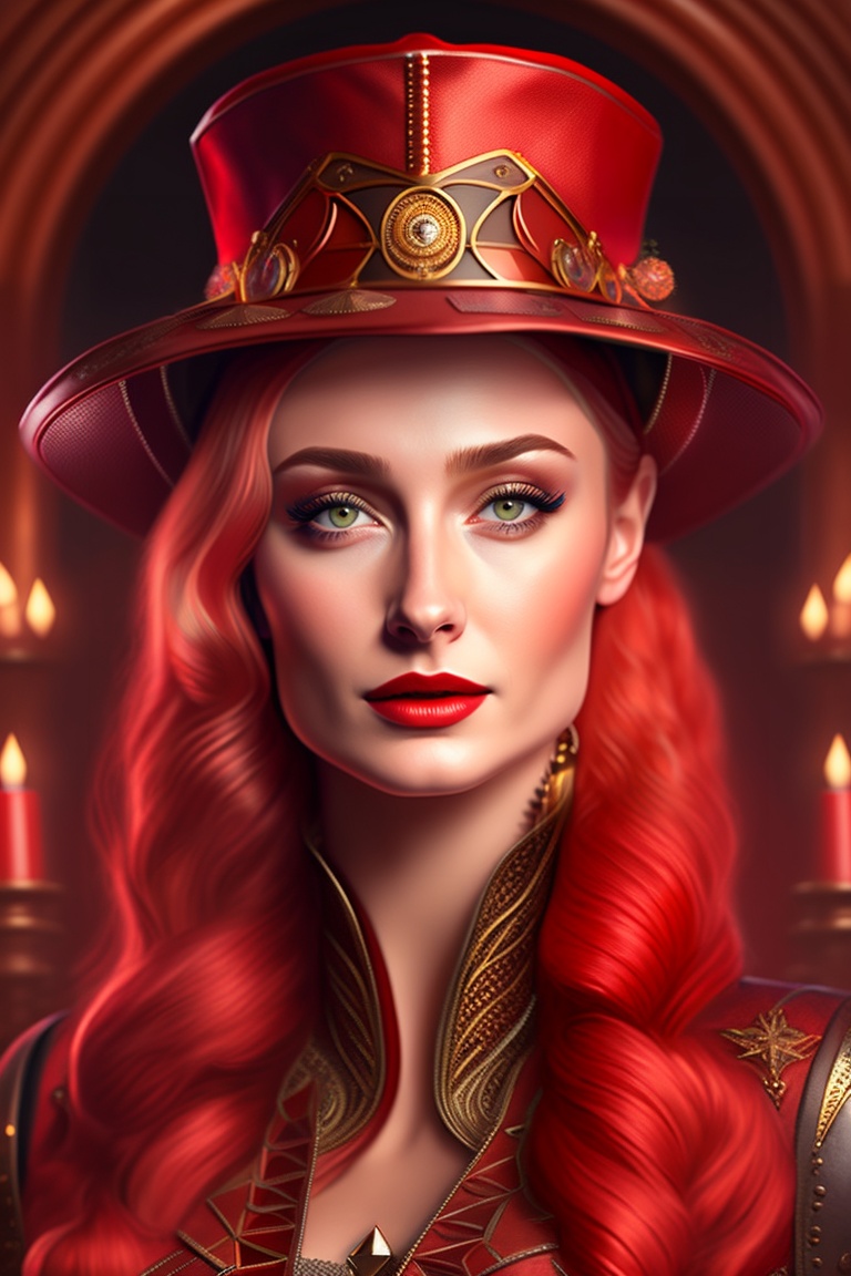 Sophie turner as wanda scarlet witch in steampunk style, highly detailed, realistic, cinematic, professional photography, red, black, studio lighting, intricate