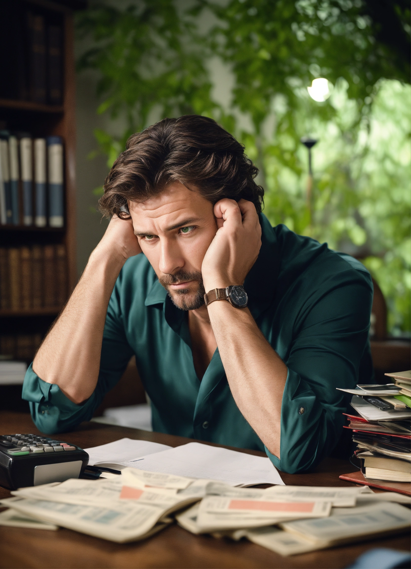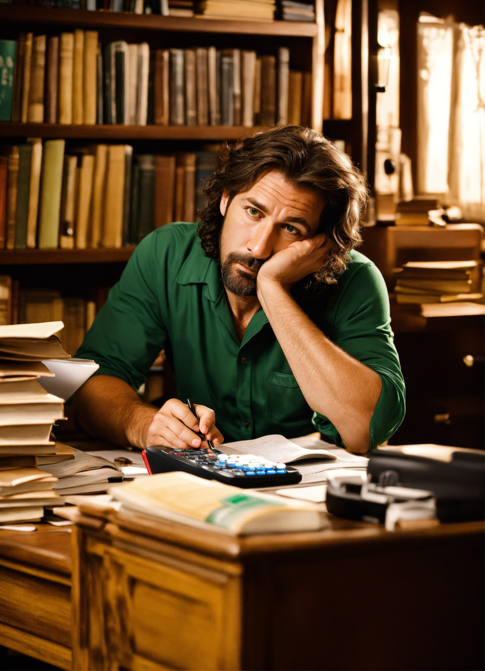 Please make for me an image with sharp photographic technique, the image of an attractive, caucasian man, in his 40s, wavy brown hair, green eyes, sitting at the desk in his library, in front of a calculator, adding bills or accounts payable, with a worried, thoughtful face, putting his hands to his head. there must be a lamp on the desk, and he is dressed in pajamas, that is, sleepwear.