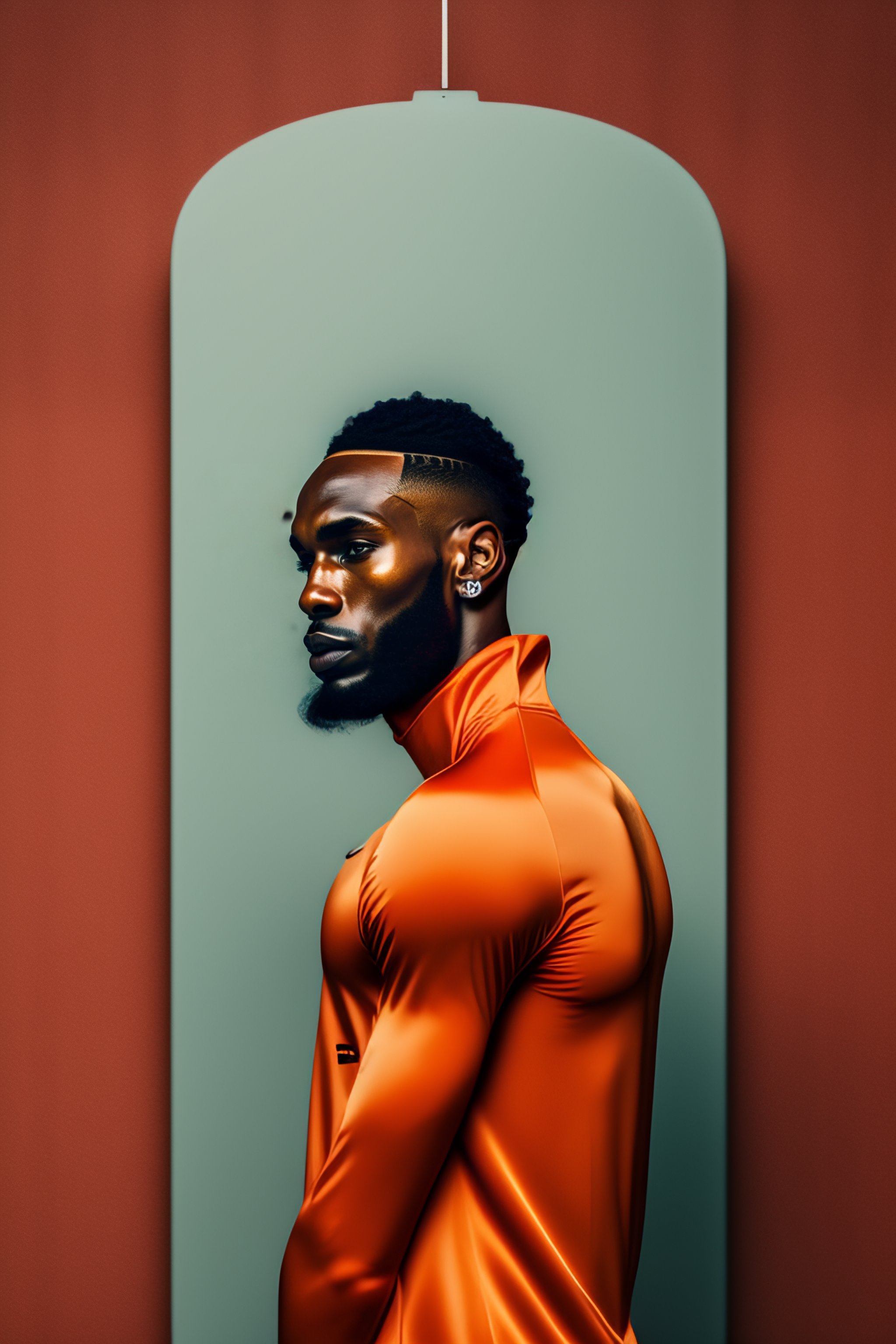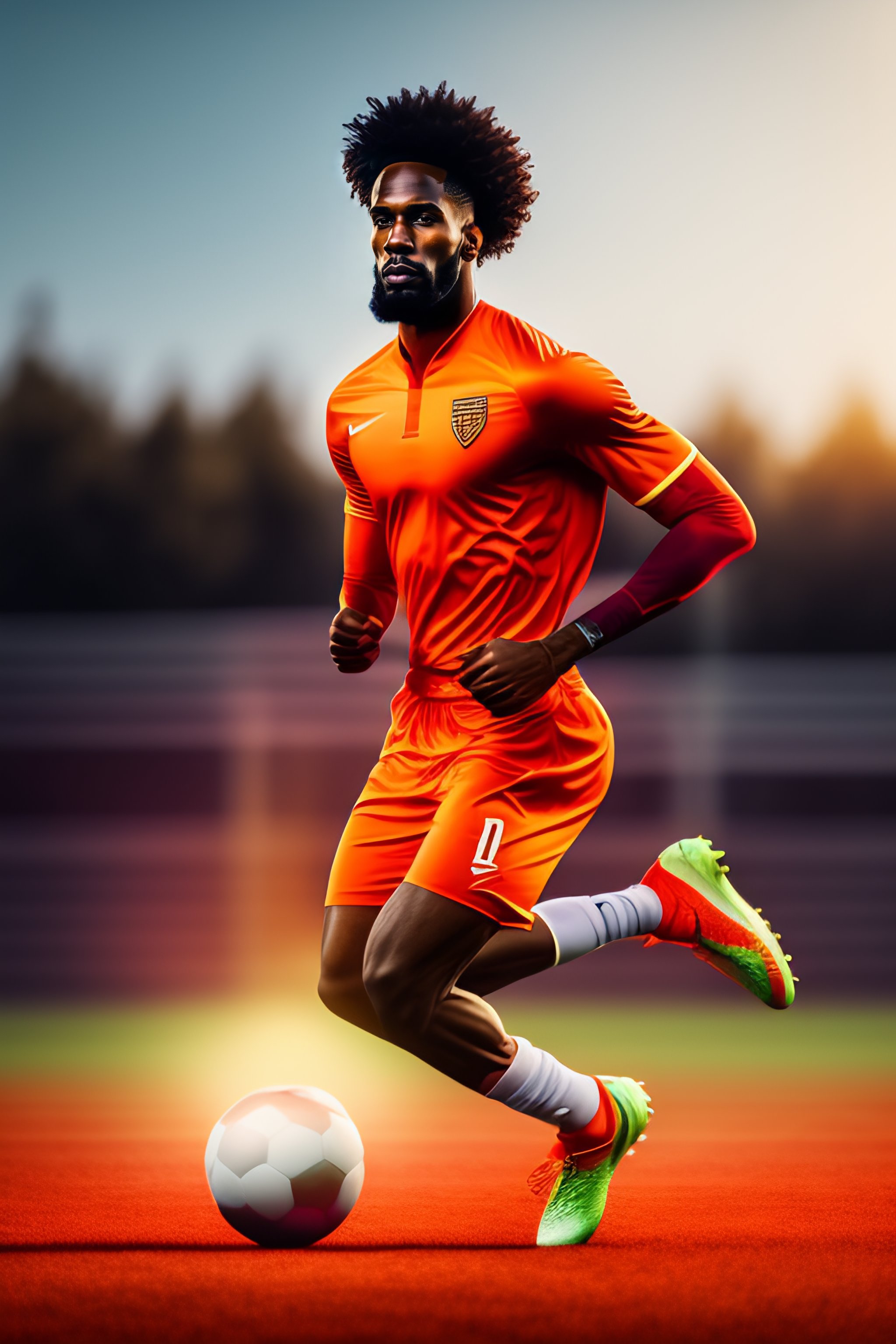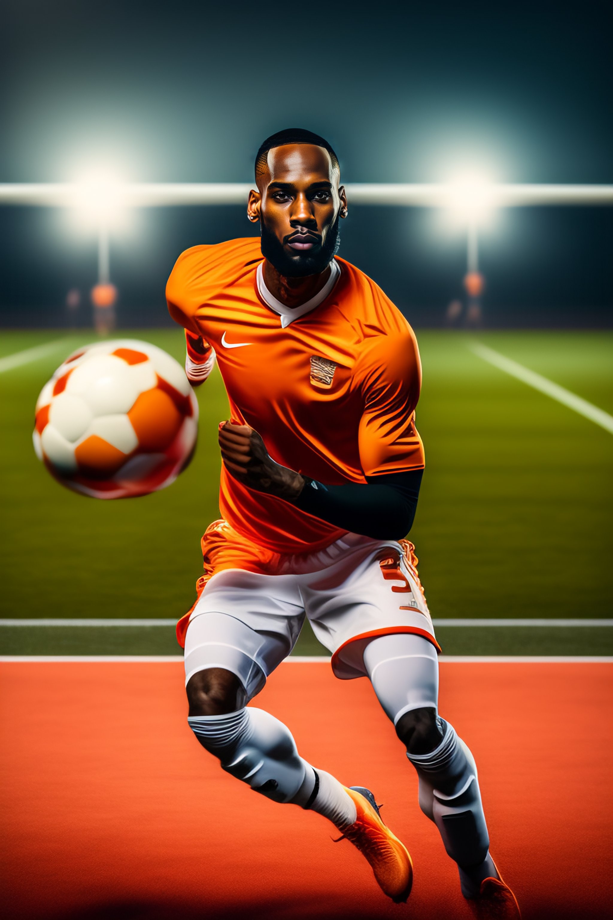 Portrait of modern light skinned skinny male model that resembles lebron james cooper dressed up as a carrot playing soccer