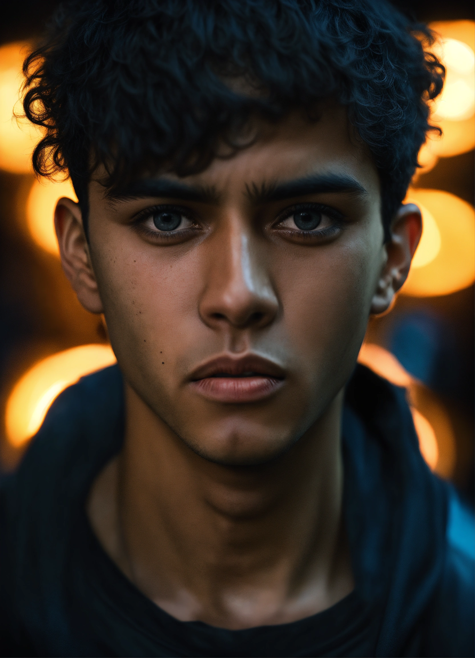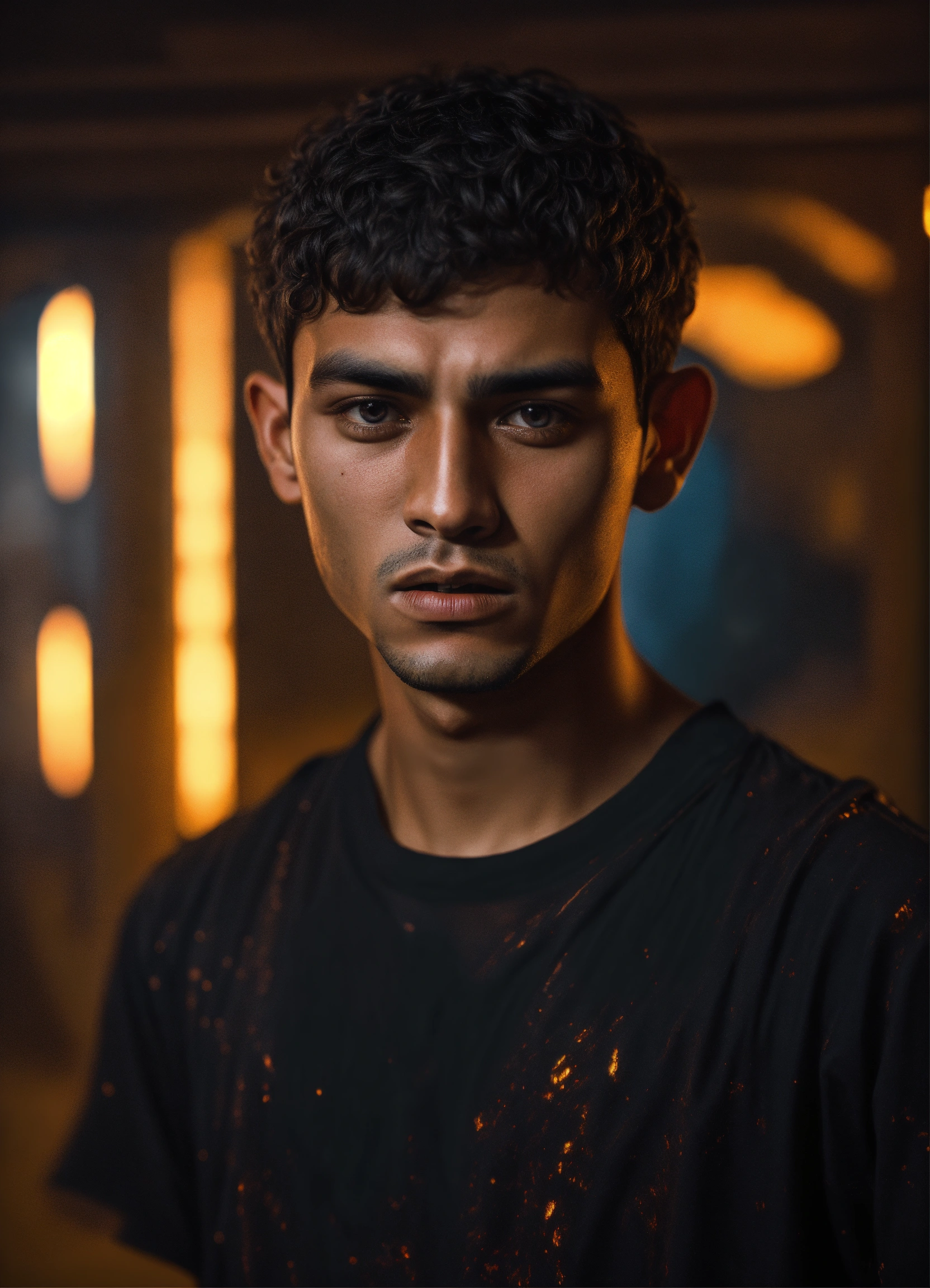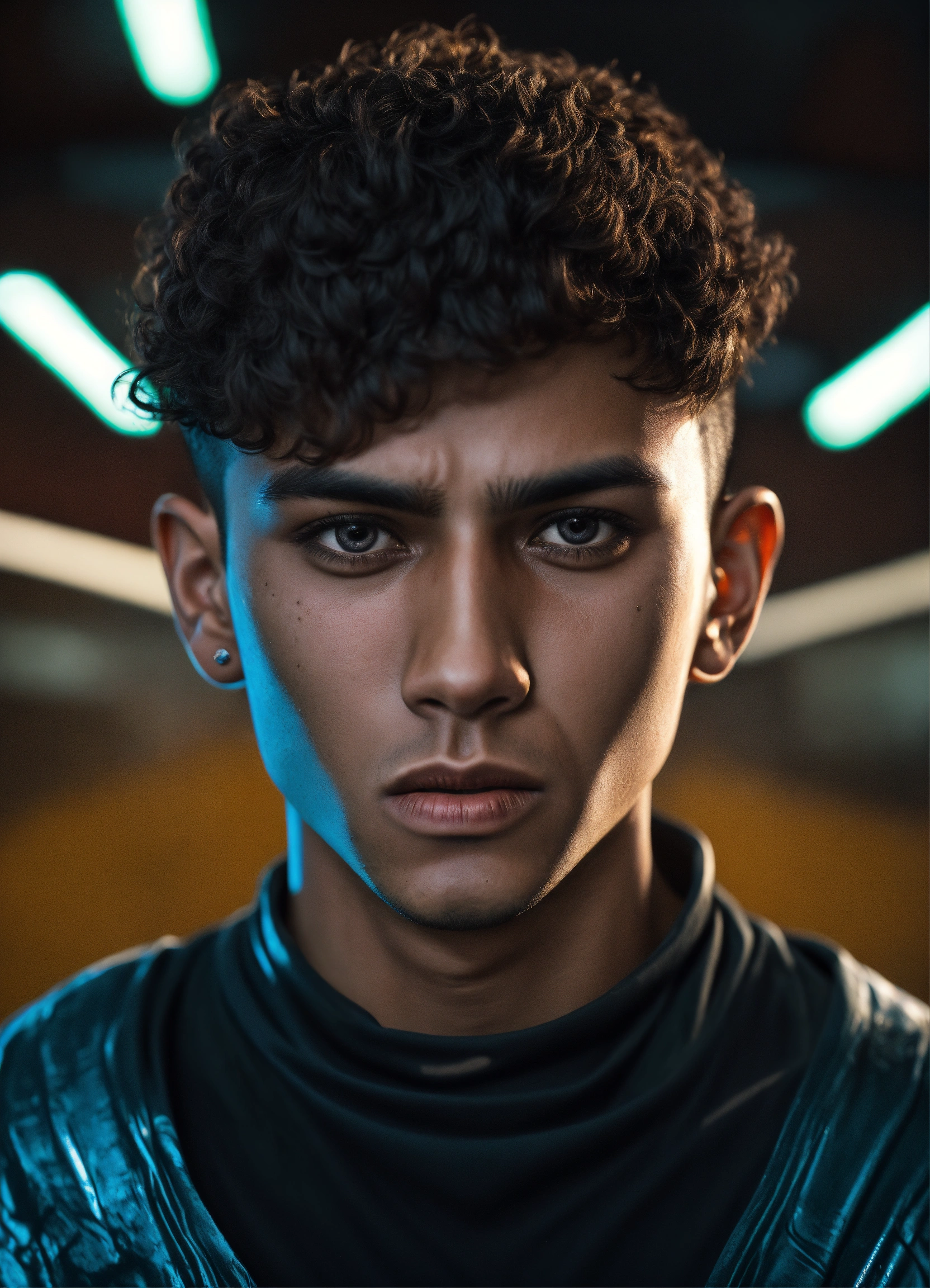 A realistic photograph of an ugly moroccan 20-year-old boy, with a serious expression, with very short hair, tanned skin, scary face, deep eyes, wearing a black sci-fi polymer shirt, strong body, dramatic illumination, hyperdetailed, hyperrealistic, 8 k