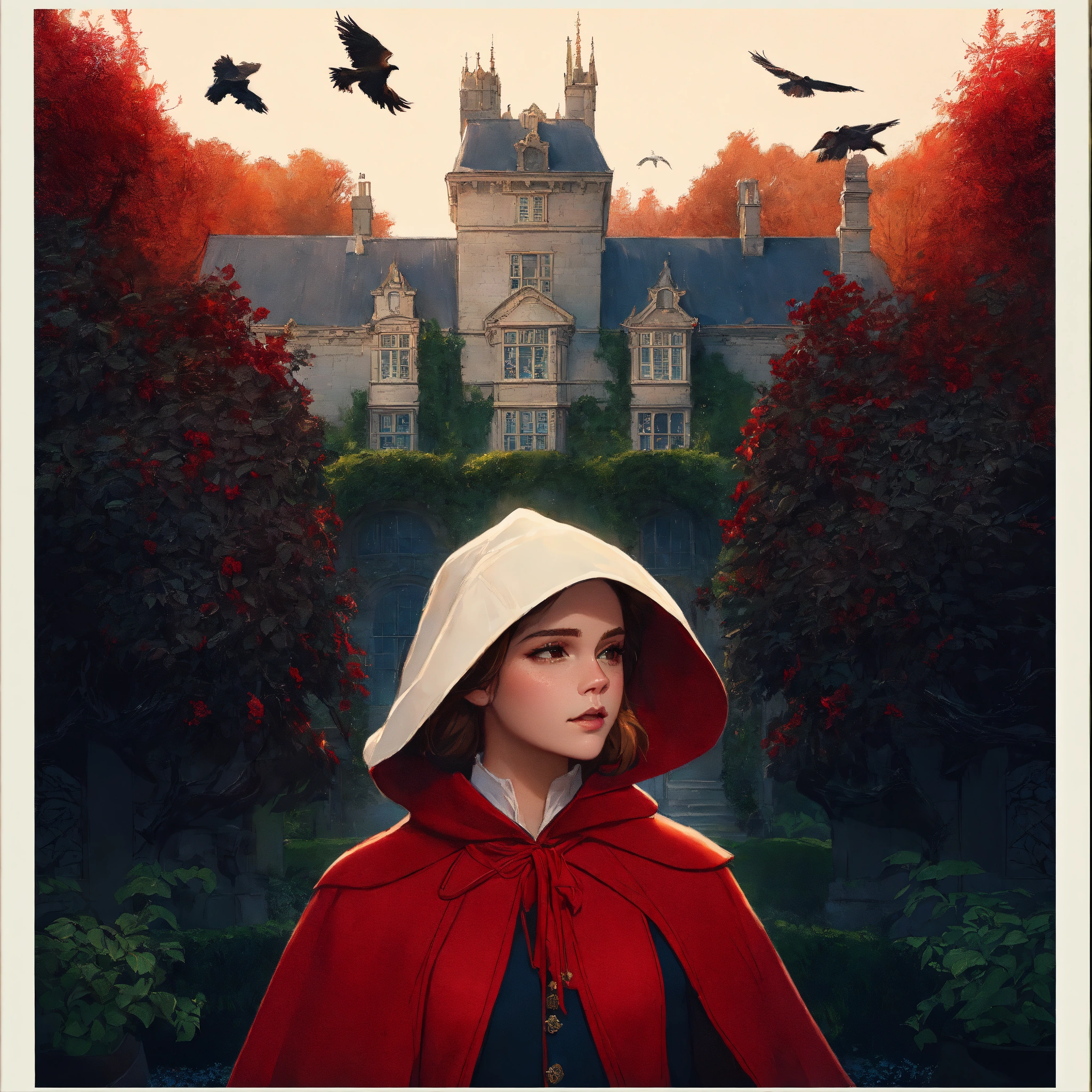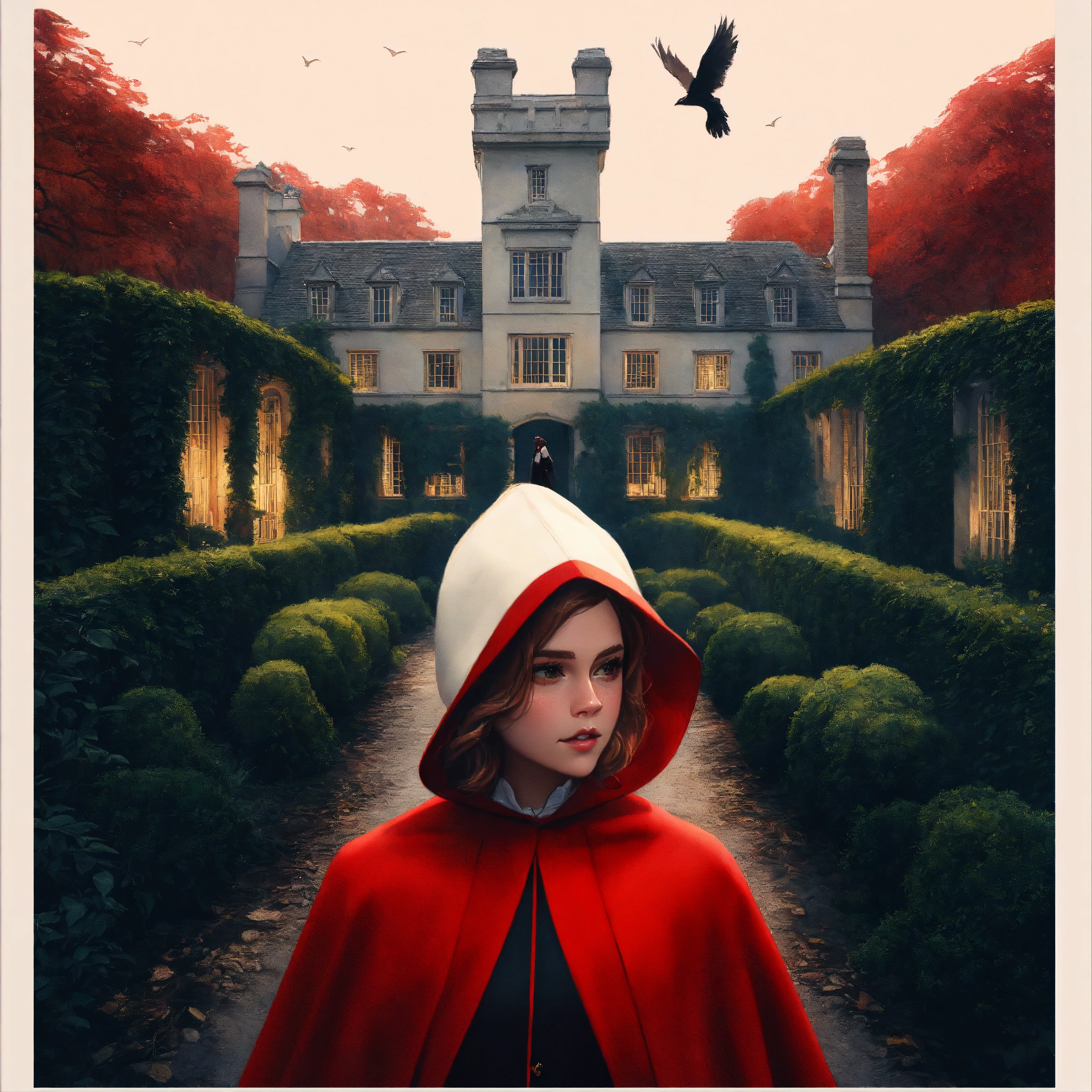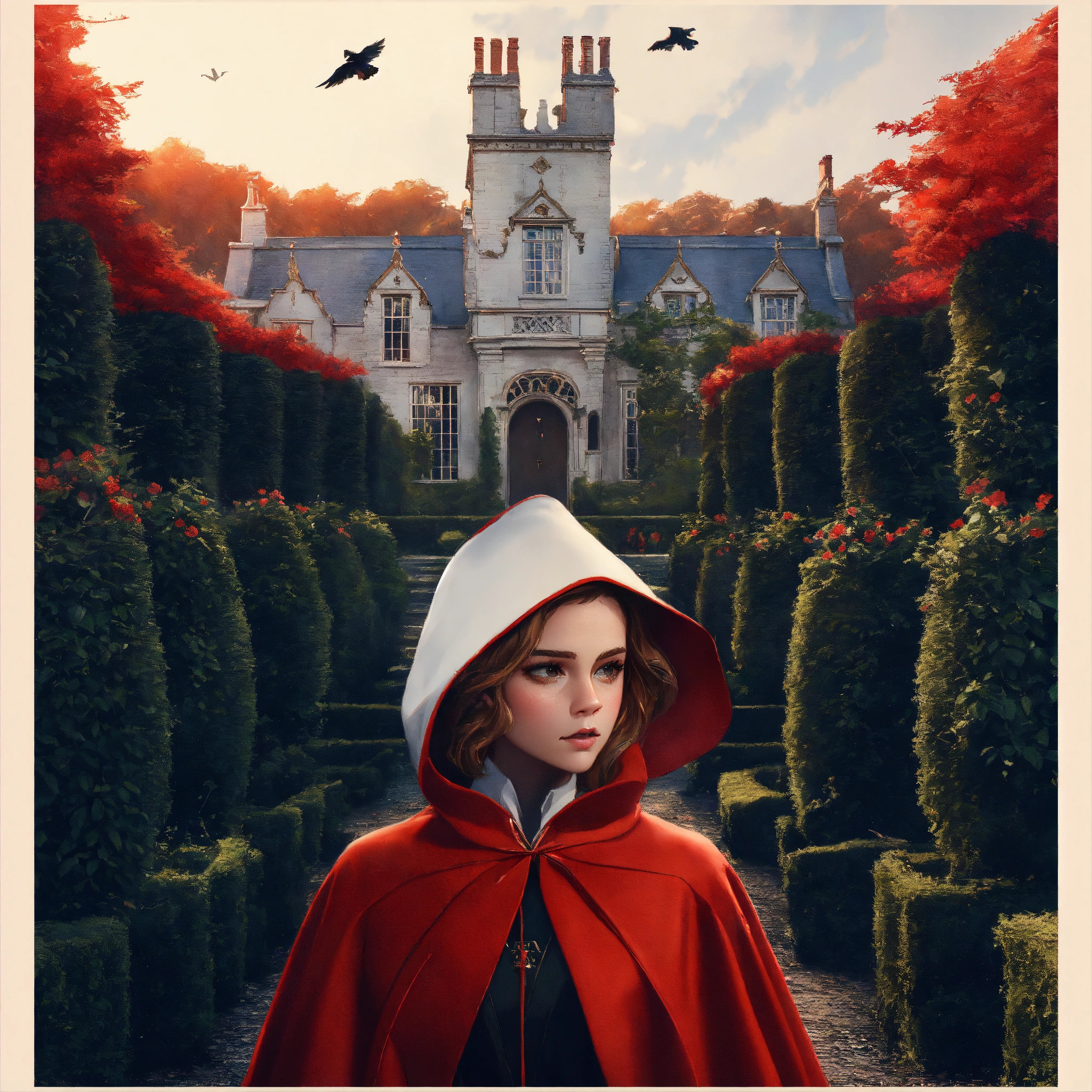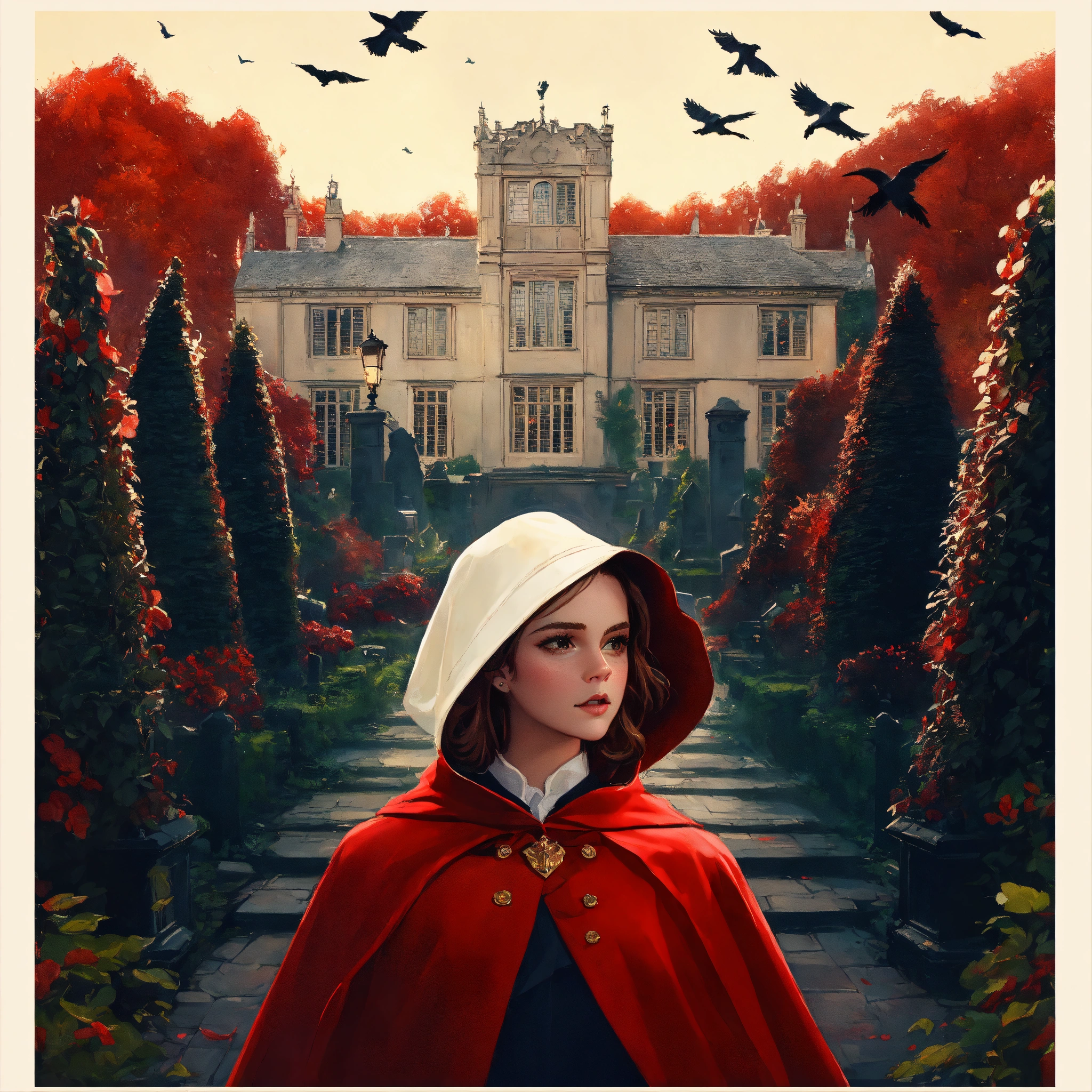 Masterpiece, highest quality, emma watson as hermione granger in a red cloak and white bonnet outside a gothic manor in the woods with parallel hedges and crows, detailed fine art, elegant, sharp focus, cinematic lighting, highly detailed, digital painting, concept art, art by wlop and artgerm