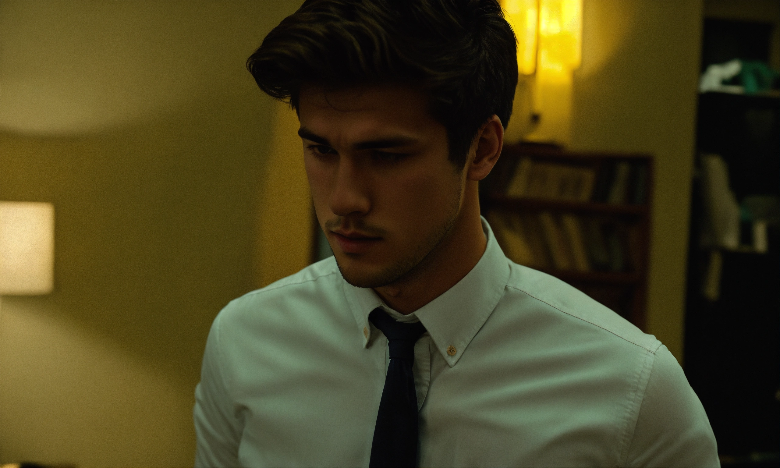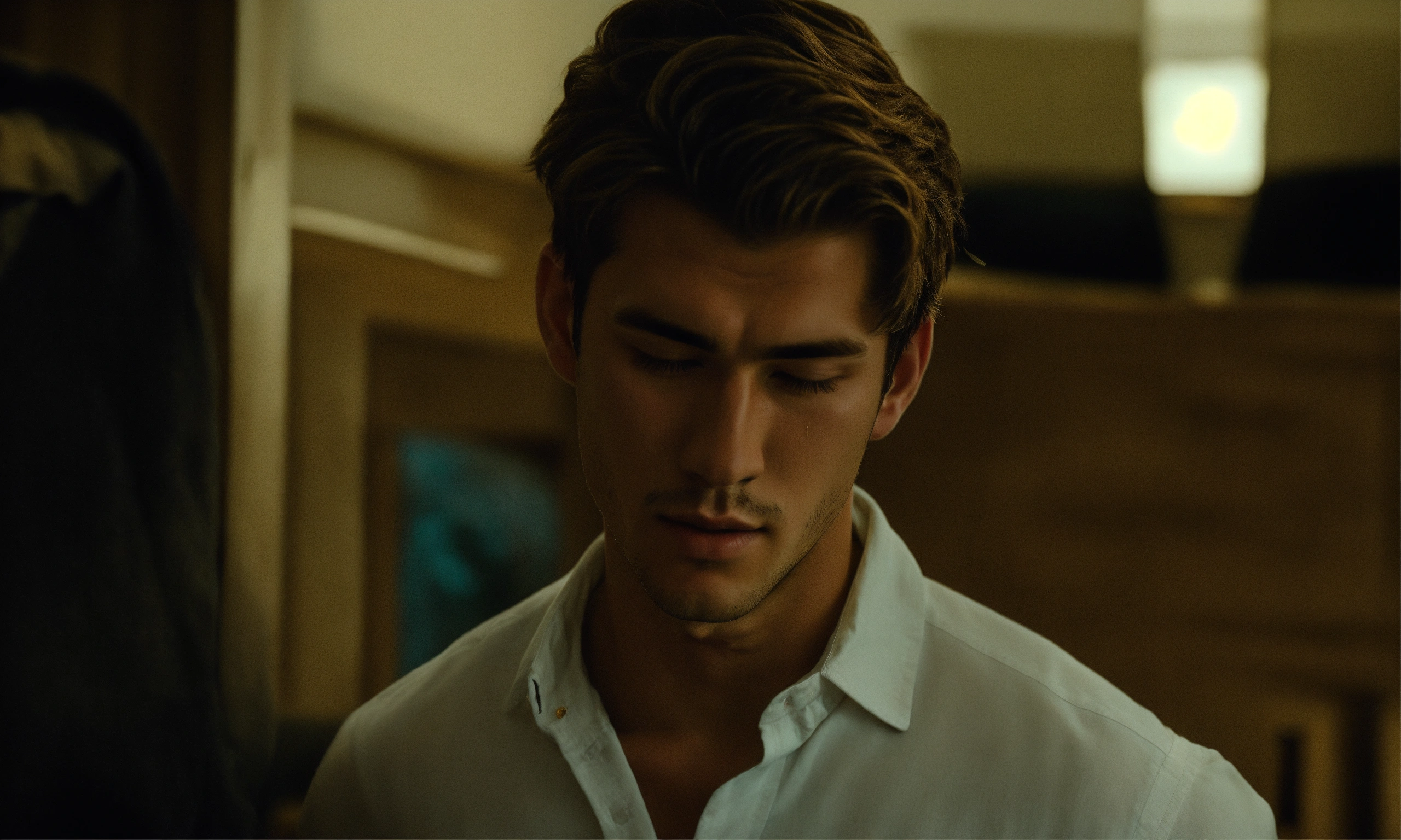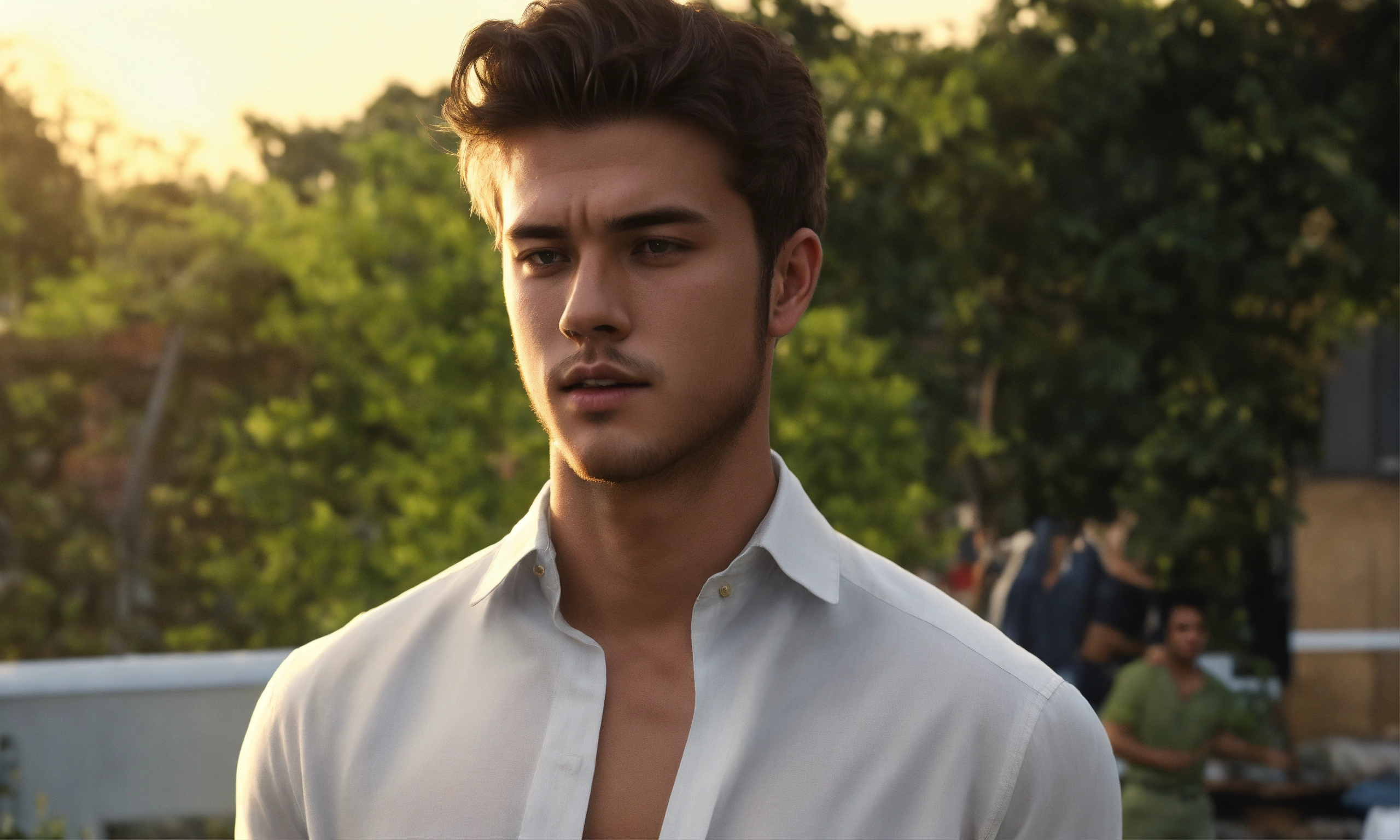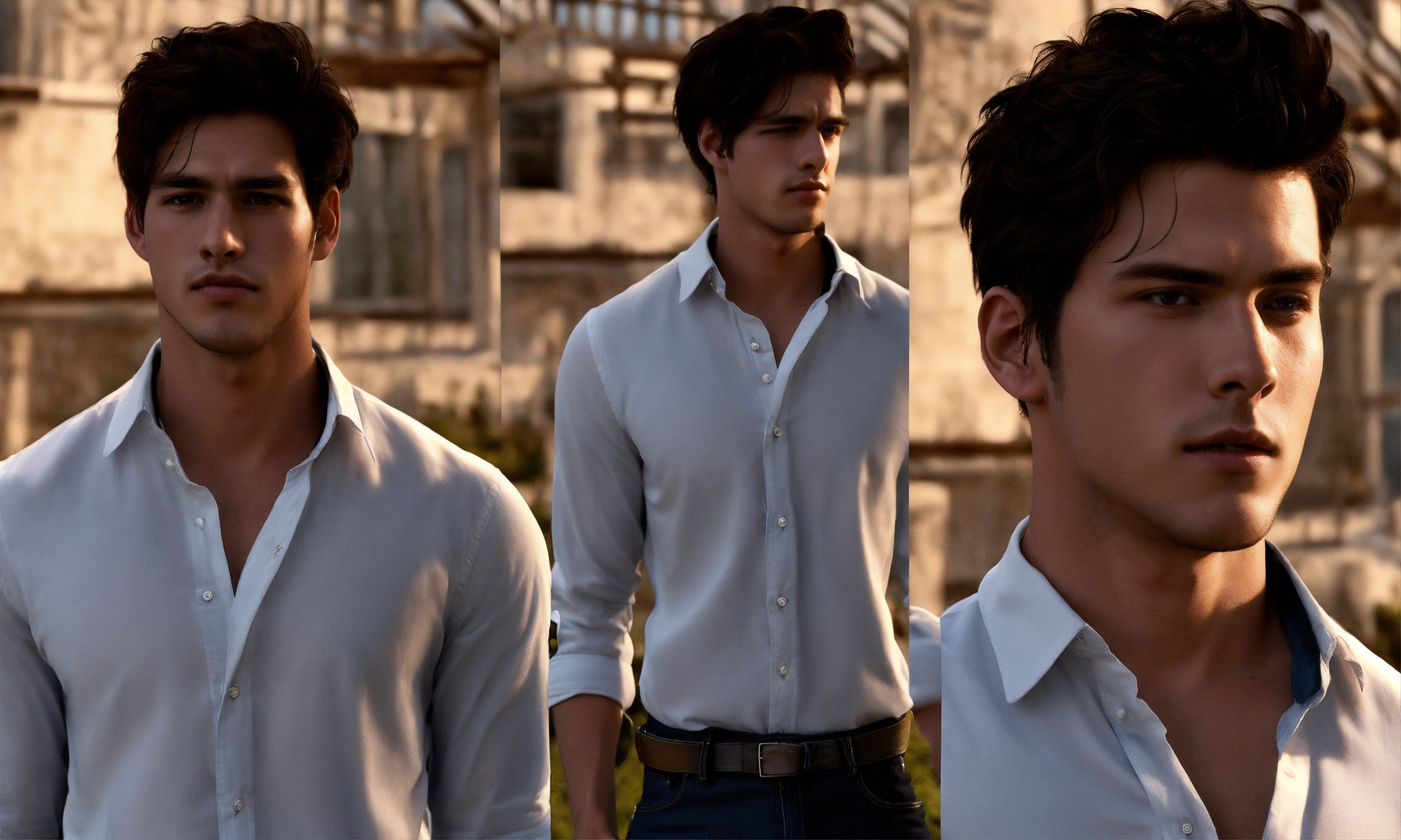 A hyper realistic 21 year old handsome man, in a long white button down shirt, sleeves slightly rolled up, black jeans. he is standing up and wiping off his sweat