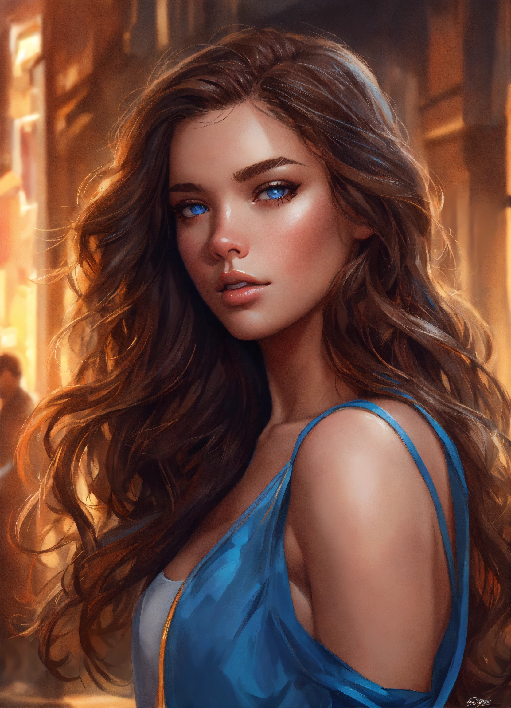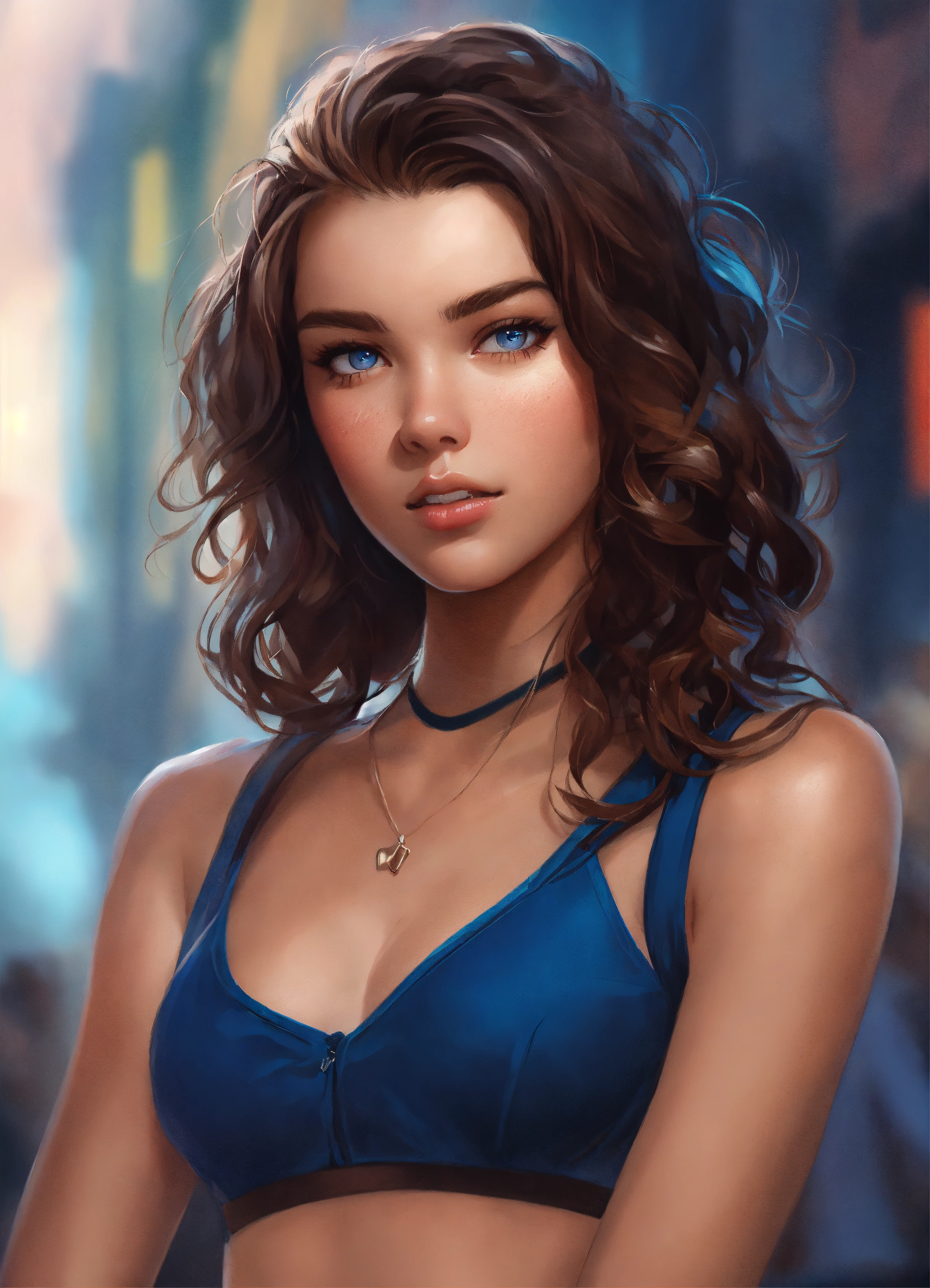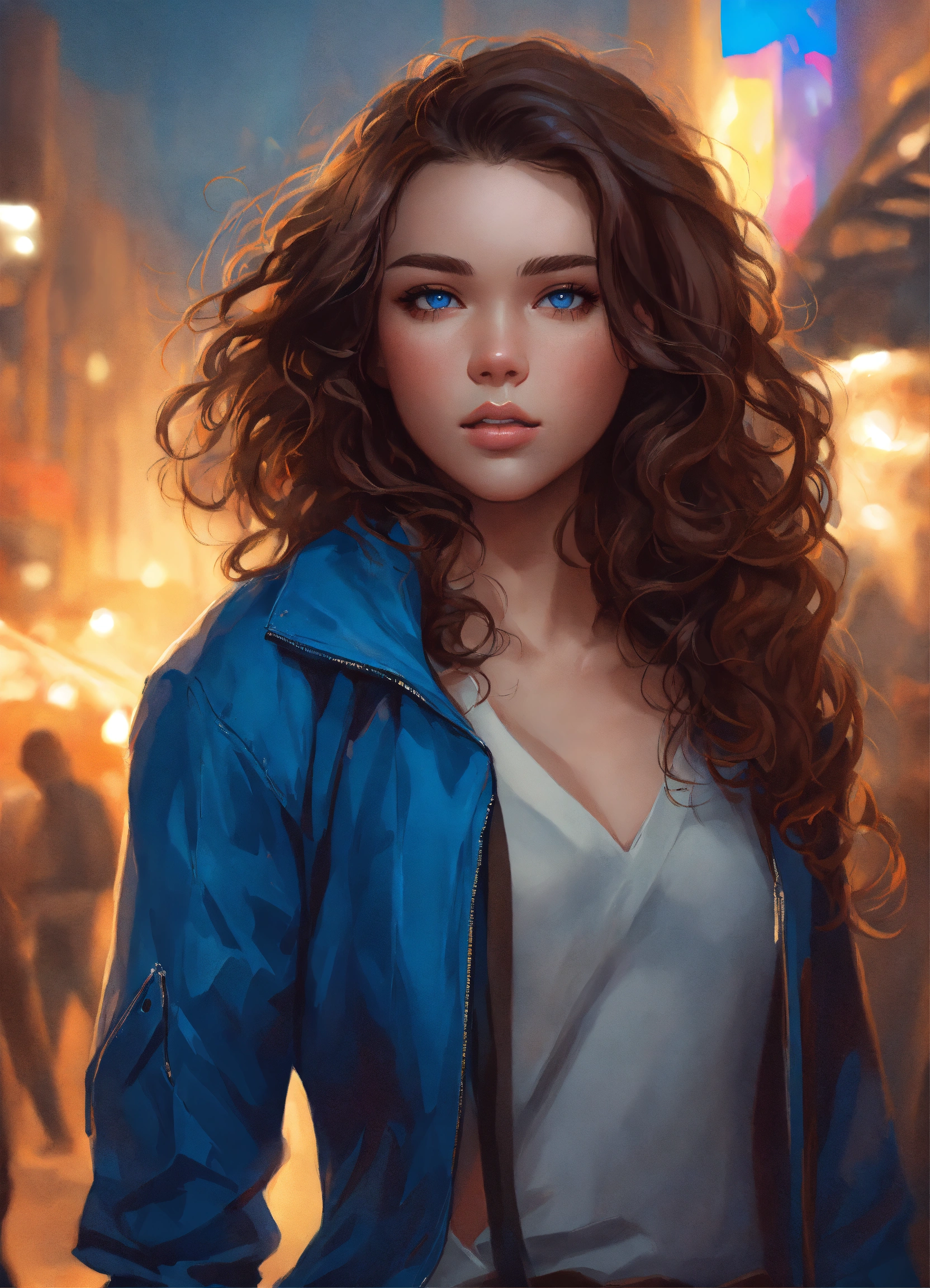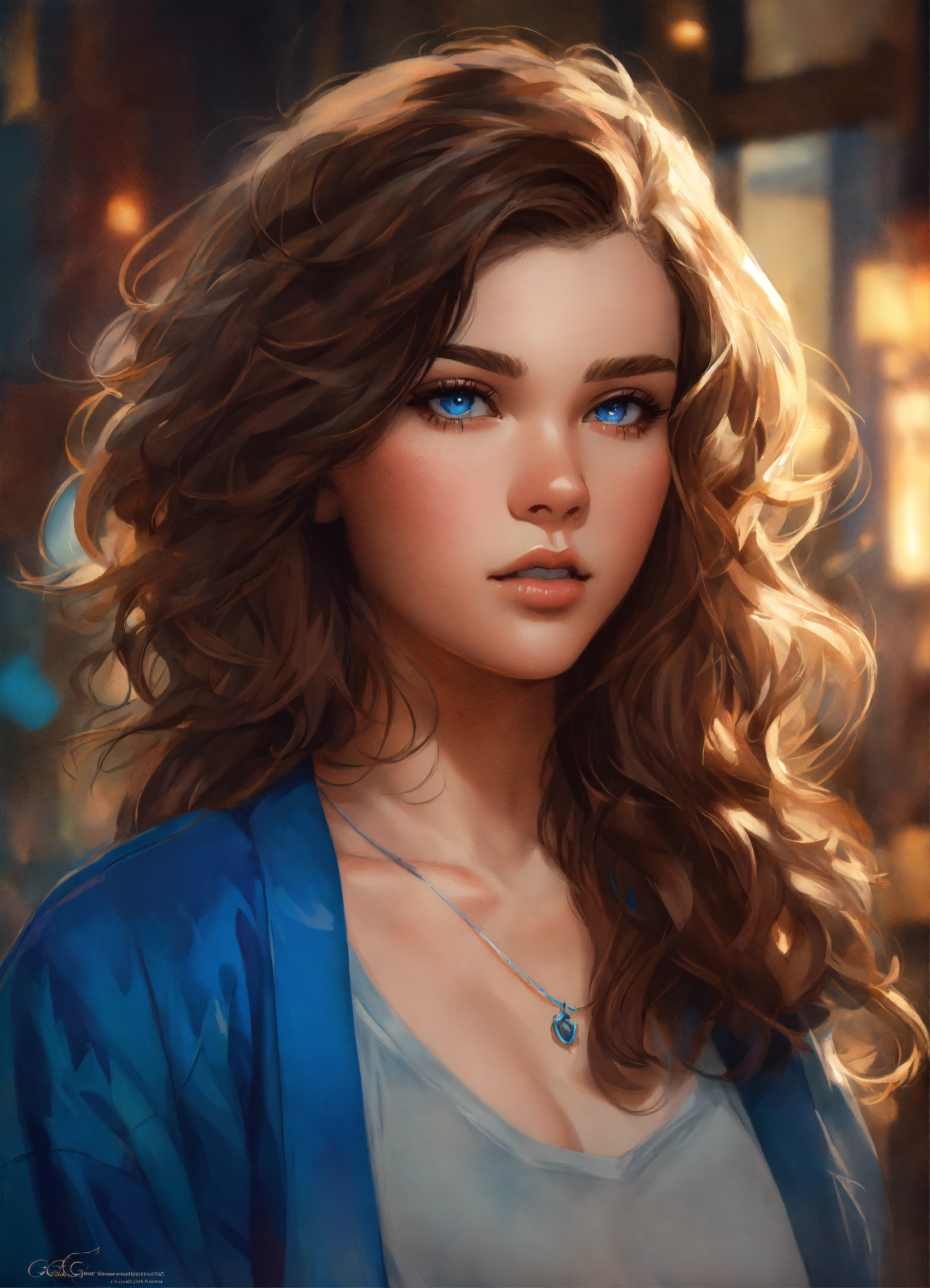 Highly detailed, digital painting, trending on artstation, concept art, sharp focus, illustration, art by artgerm and greg rutkowski and magali villeneuve. 20 years old. female. modern clothes. brown hair. curly hair. blue eyes. pretty. hailee steinfeld