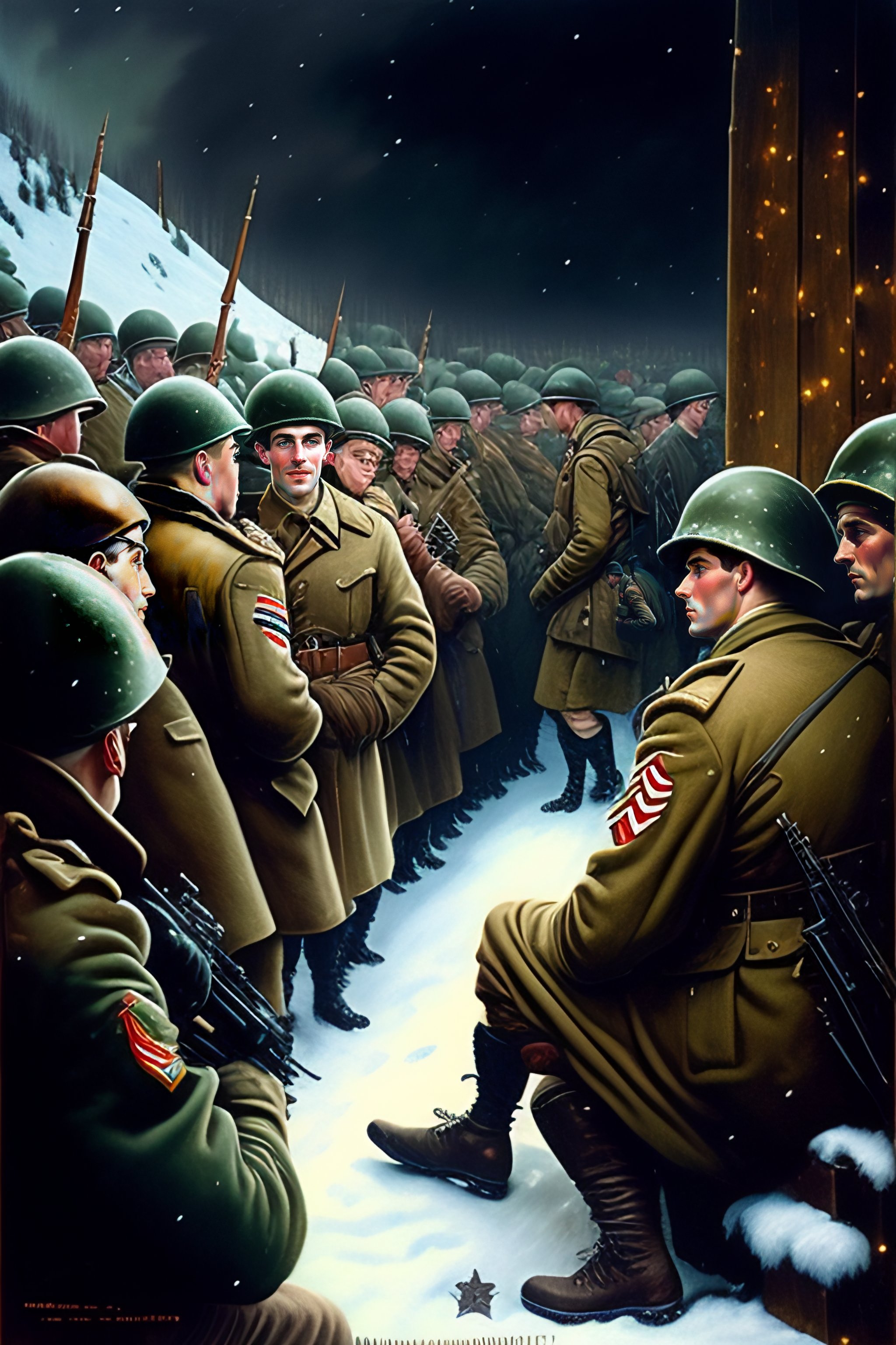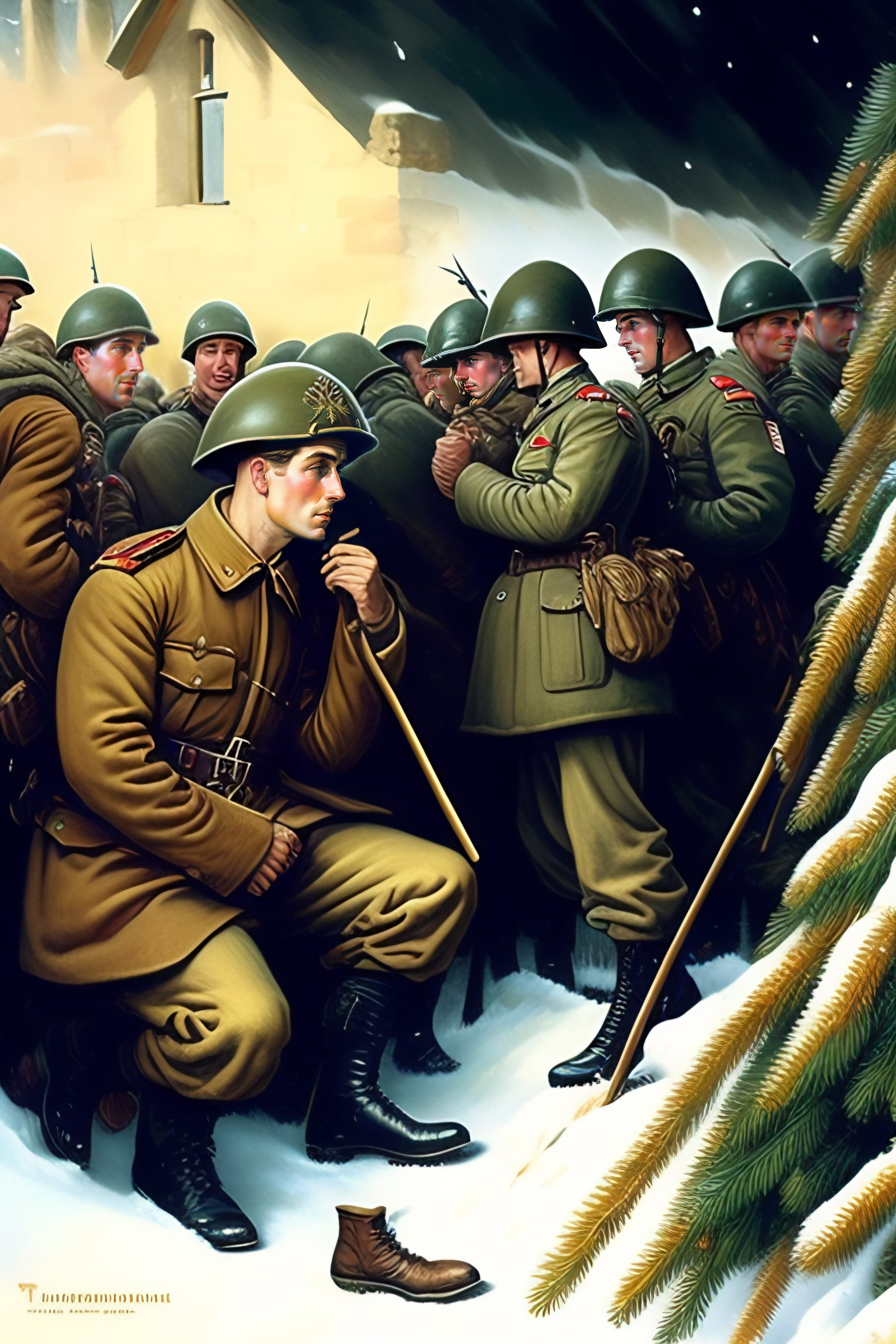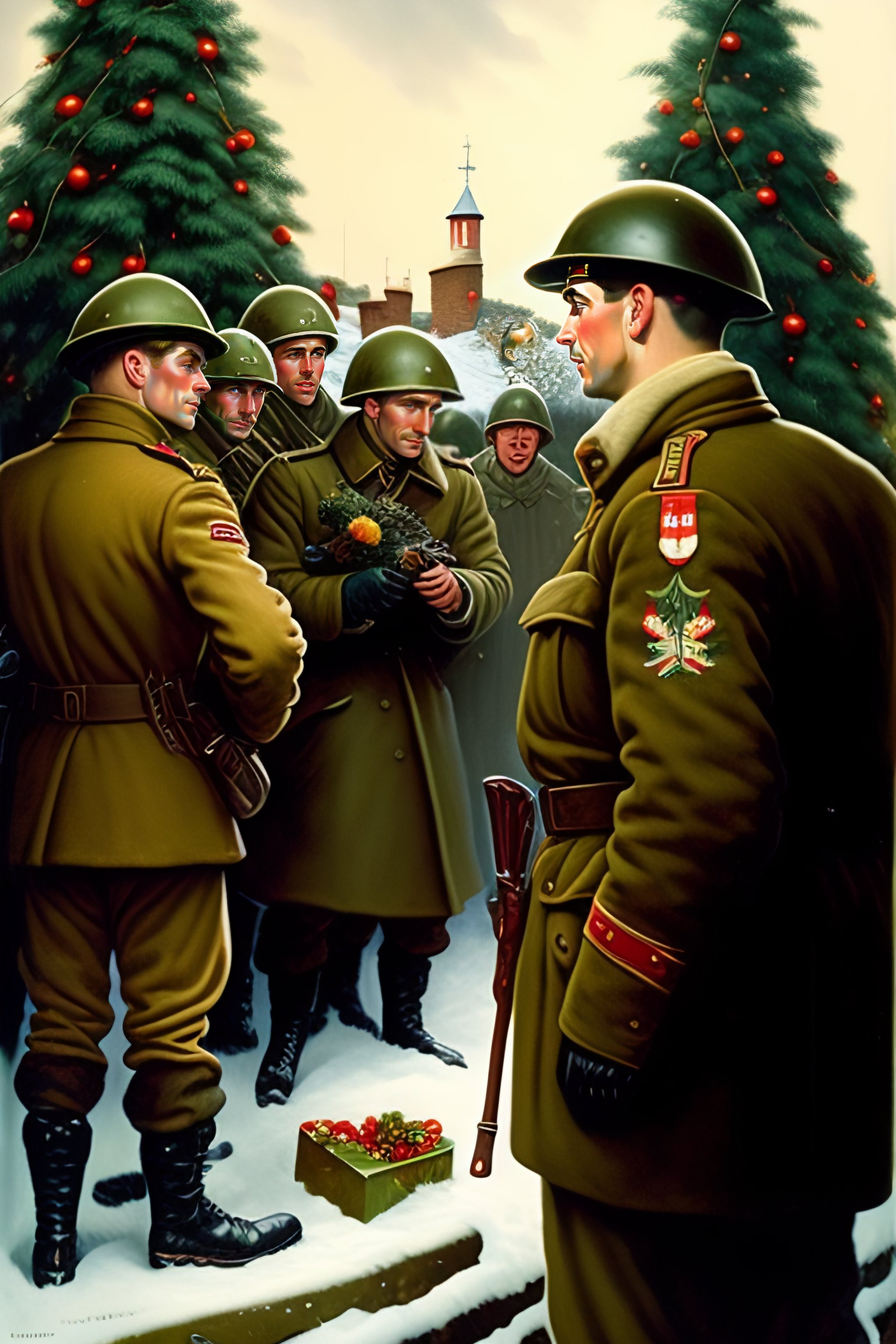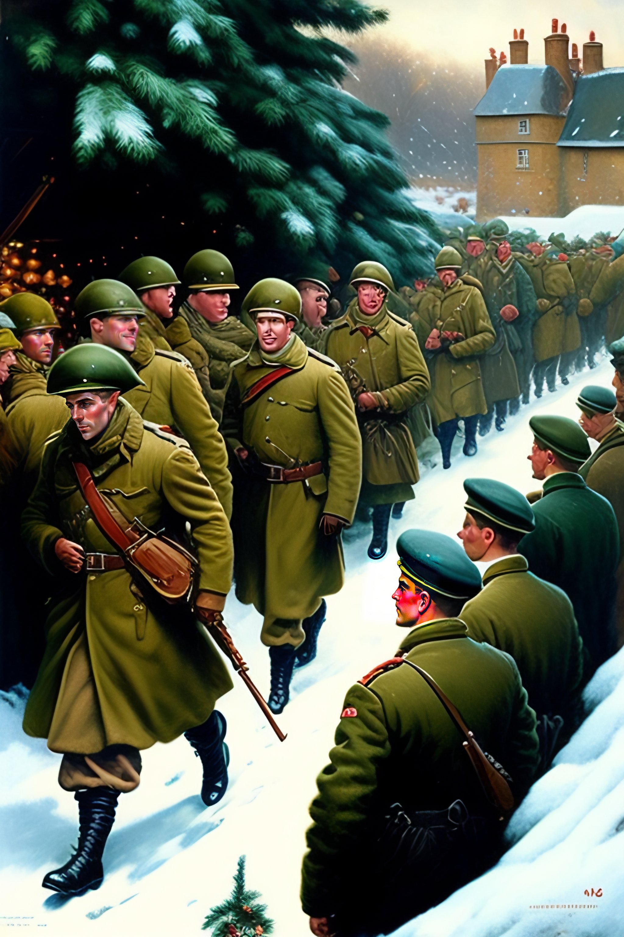 Wwii british soldiers in the trenches celebrating chritmas day, in dunkerke with trhee wise men, nativity and christmas trees, in the style of norman rockwell, wwii propaganda poster, highly detailed, award - winning, patriotic, uk, dark, gritty, ink
