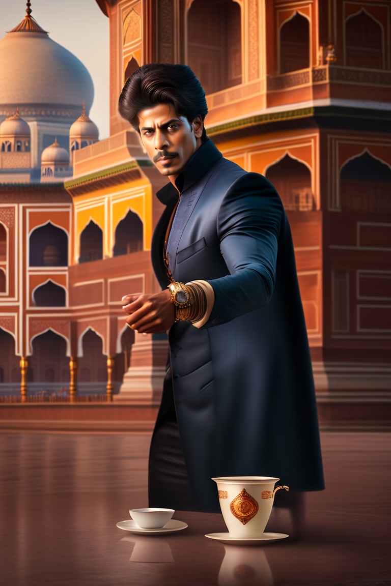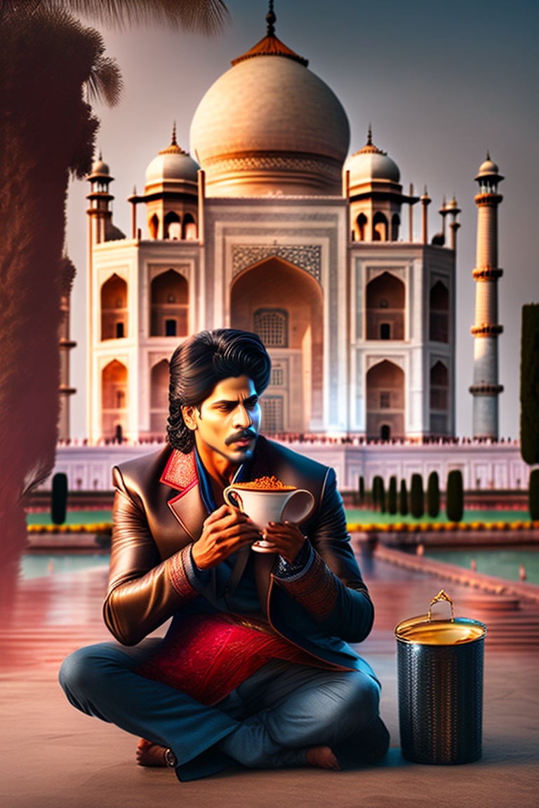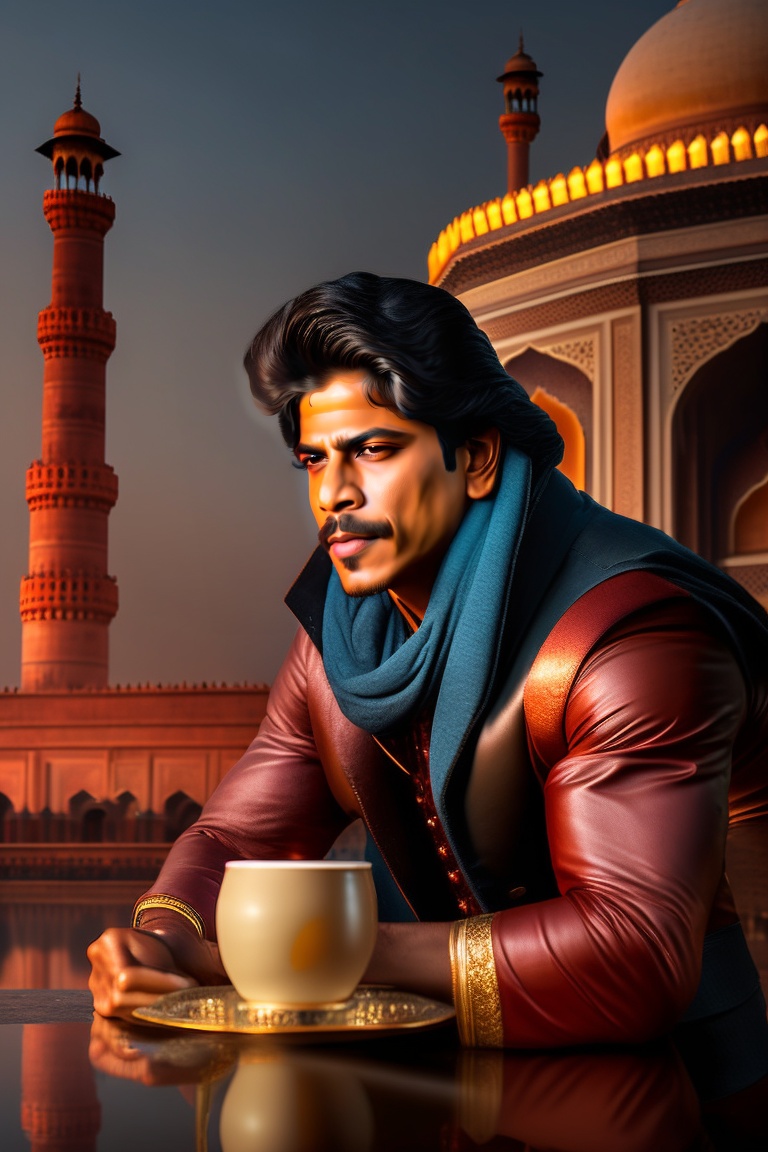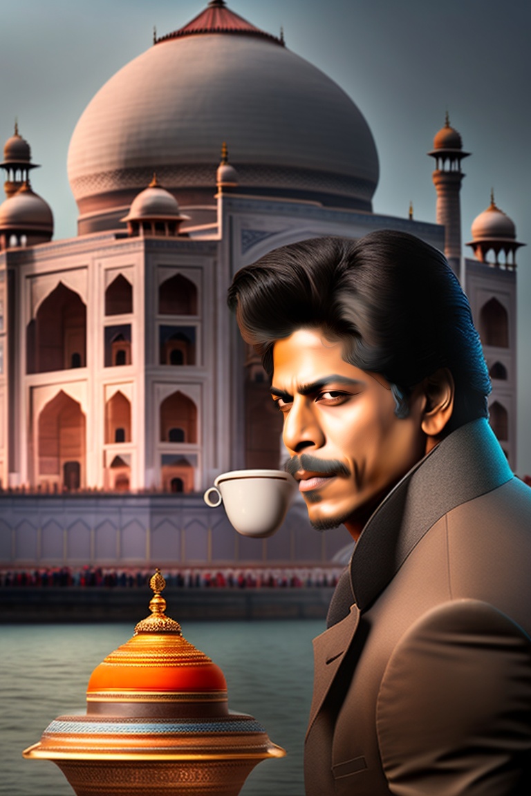 Real actor shahrukh khan selling tea in front of taj mahal, hyper realistic, dark colored, rtx, moody tone.