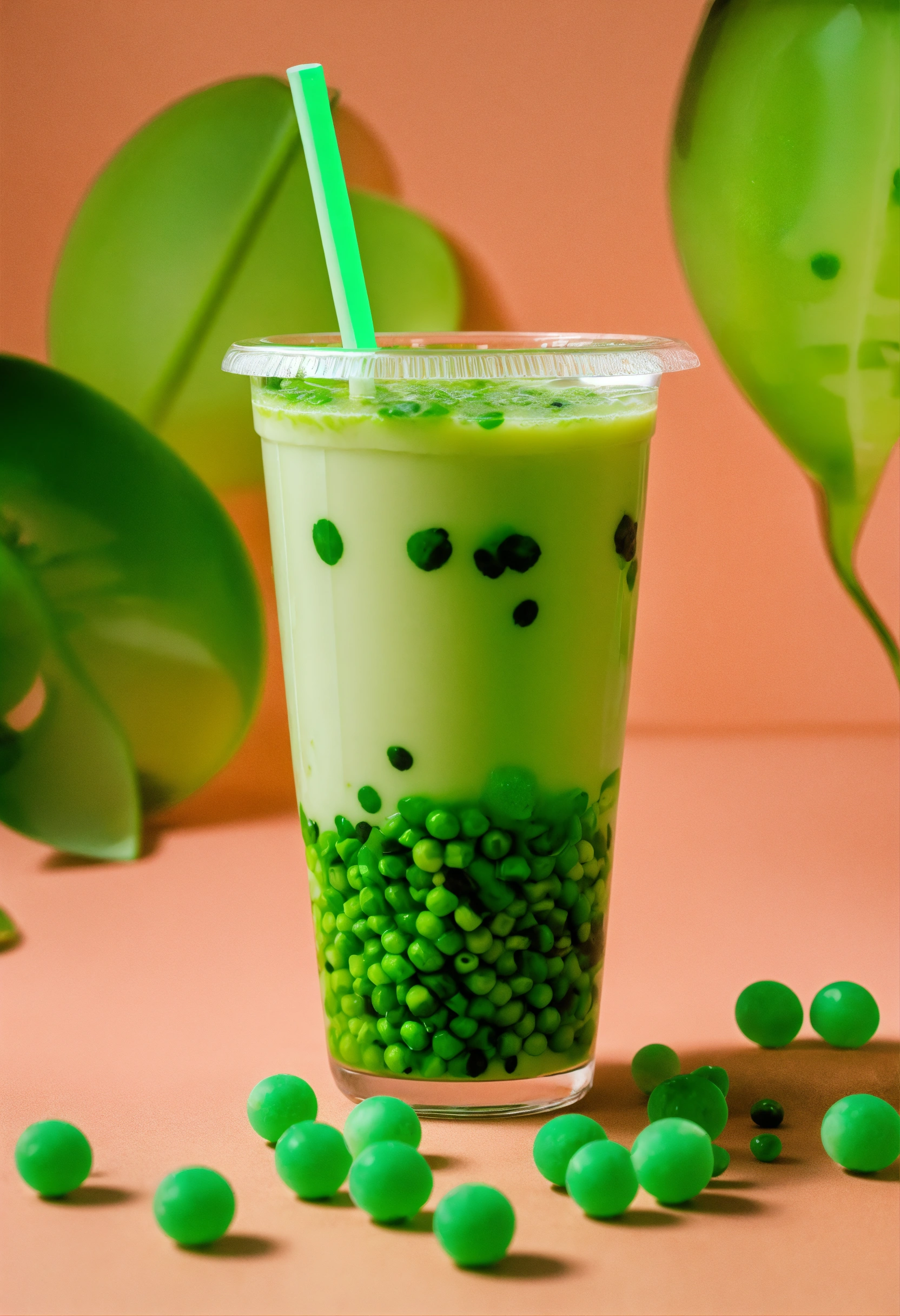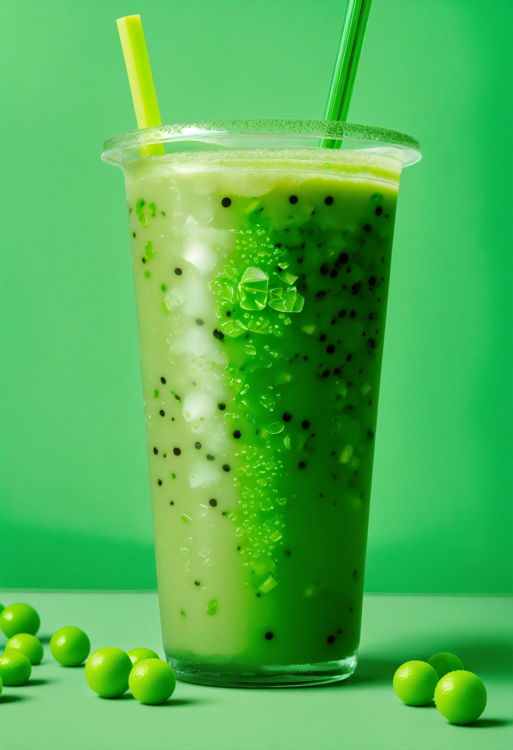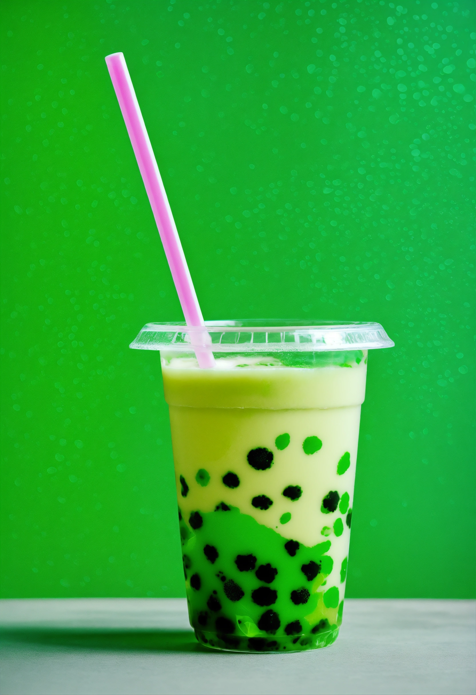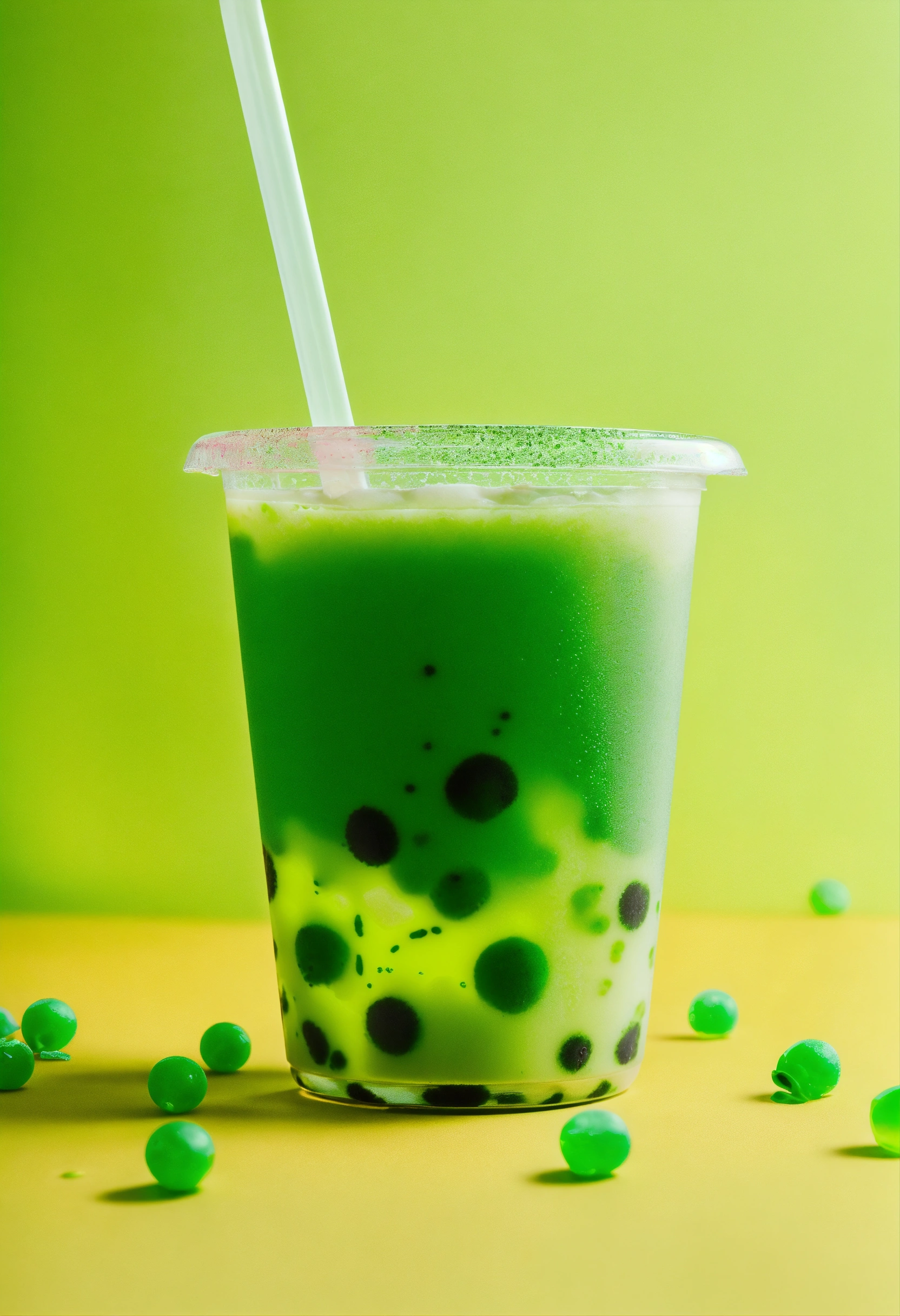 Floating green boba tea, a lot of bobas, stickers on cup, clear cup, studio photography, neutral tone background, pops of neon green