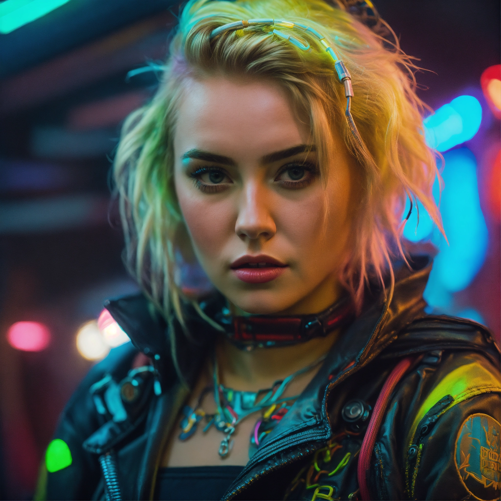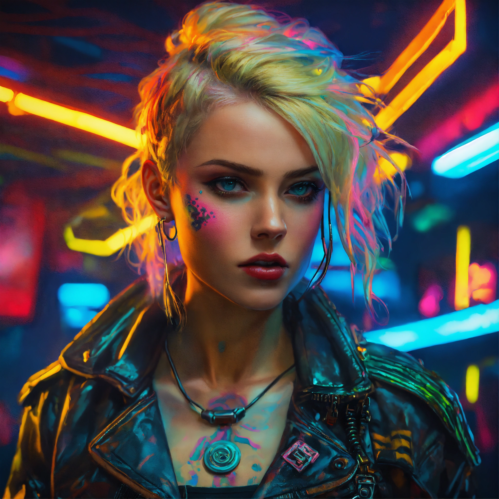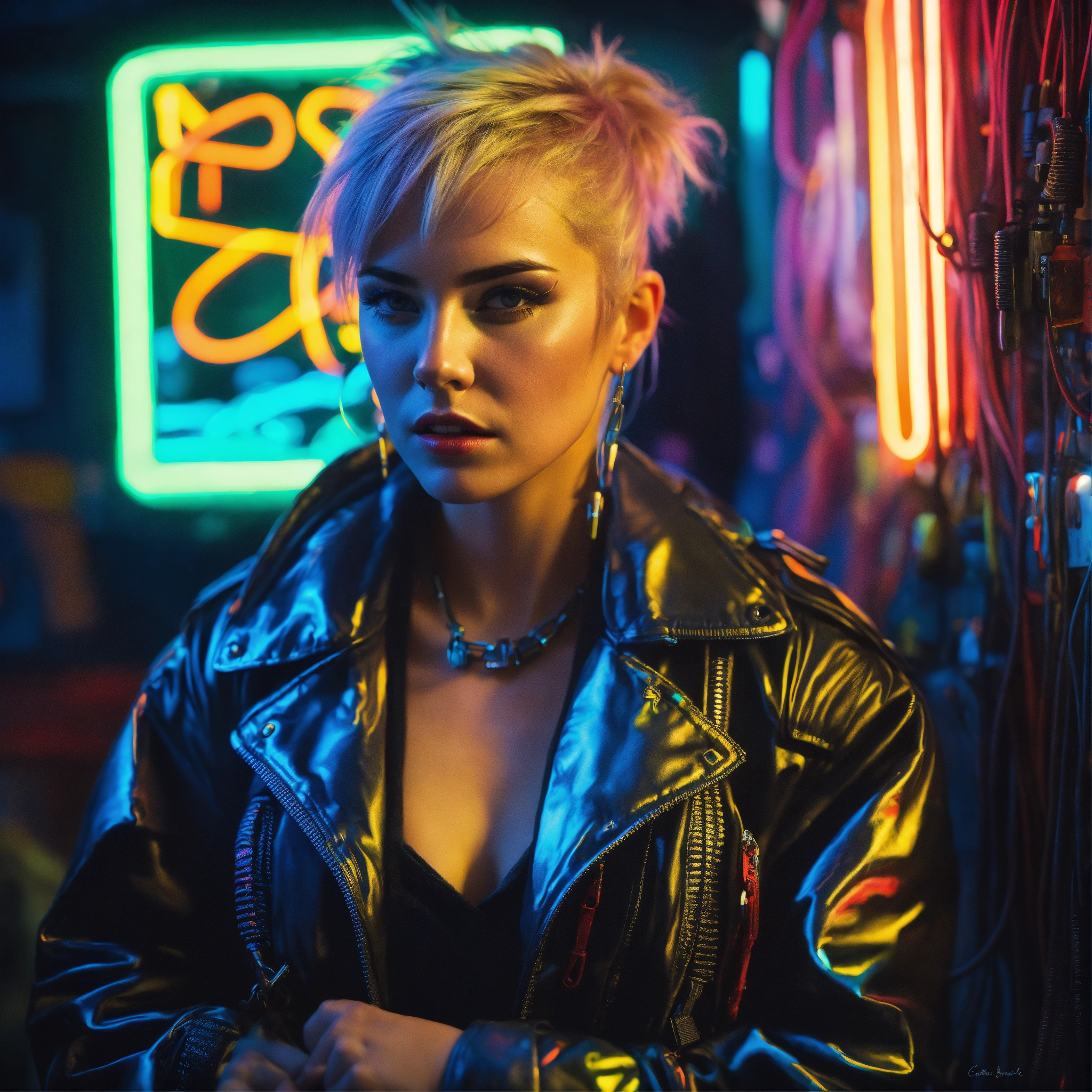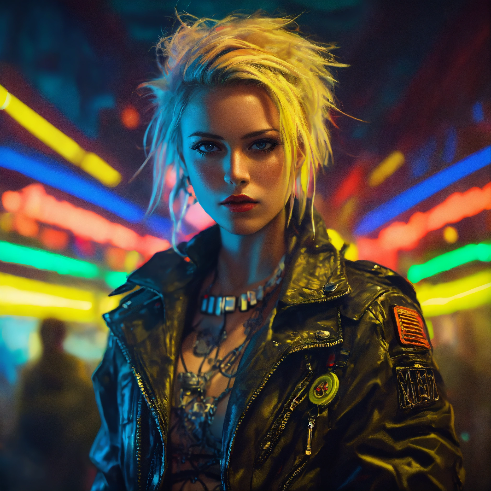 Blonde cute punk rock girl, mad max jacket, renaissance, cables on her body, hyper realistic style, oil painting, in neon lights, retro futuristic