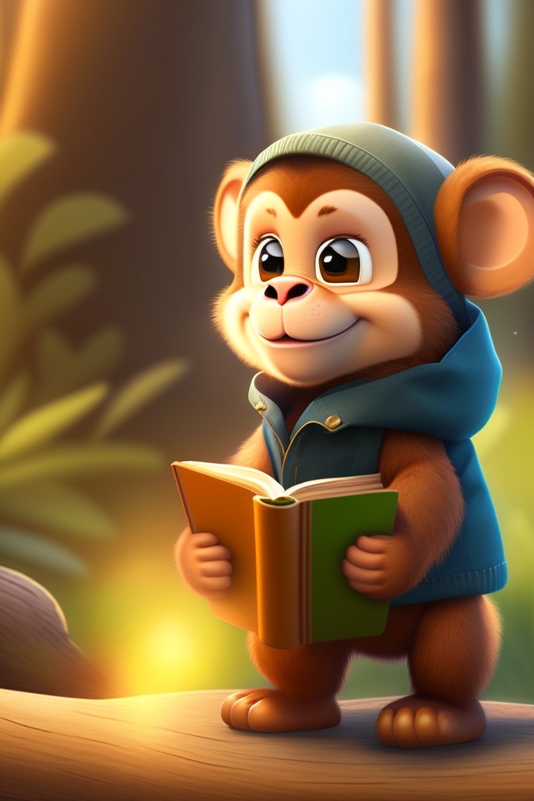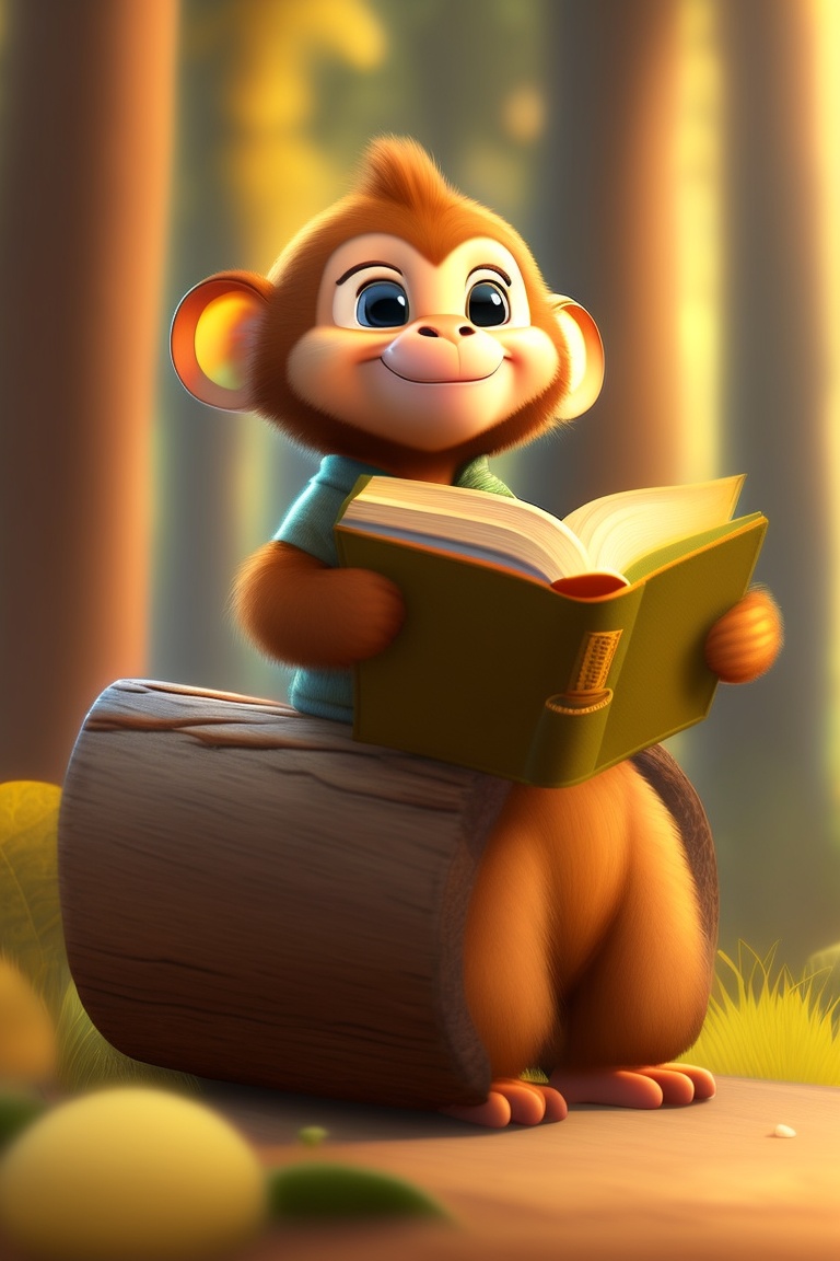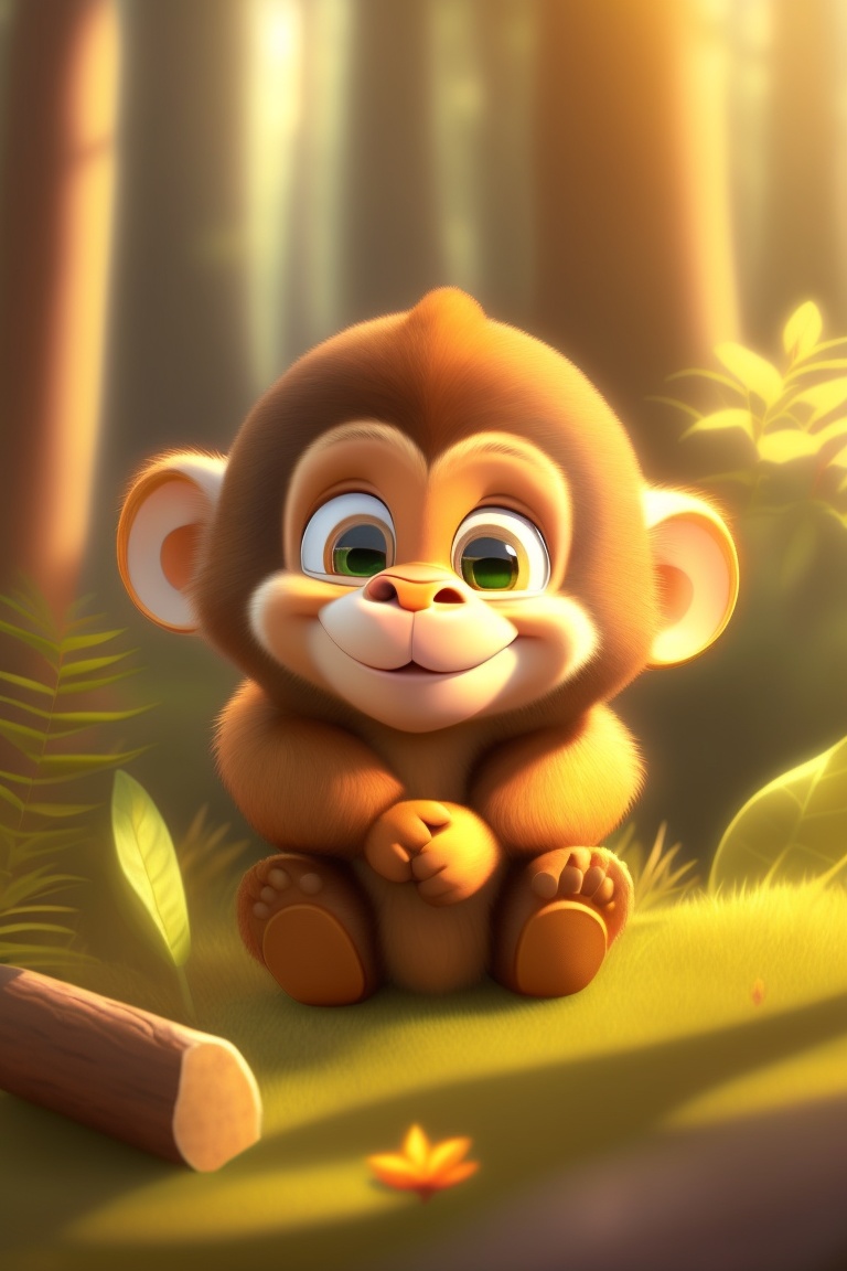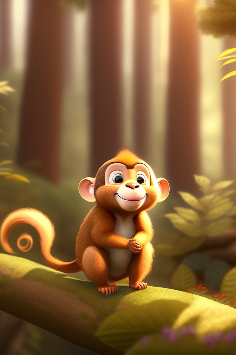 A cute little monkey for a children's storybook, where the monkey's tail is wrapped around a bundle of logs, carrying it through the sun-lit forrest, hd, cinematic quality pixar