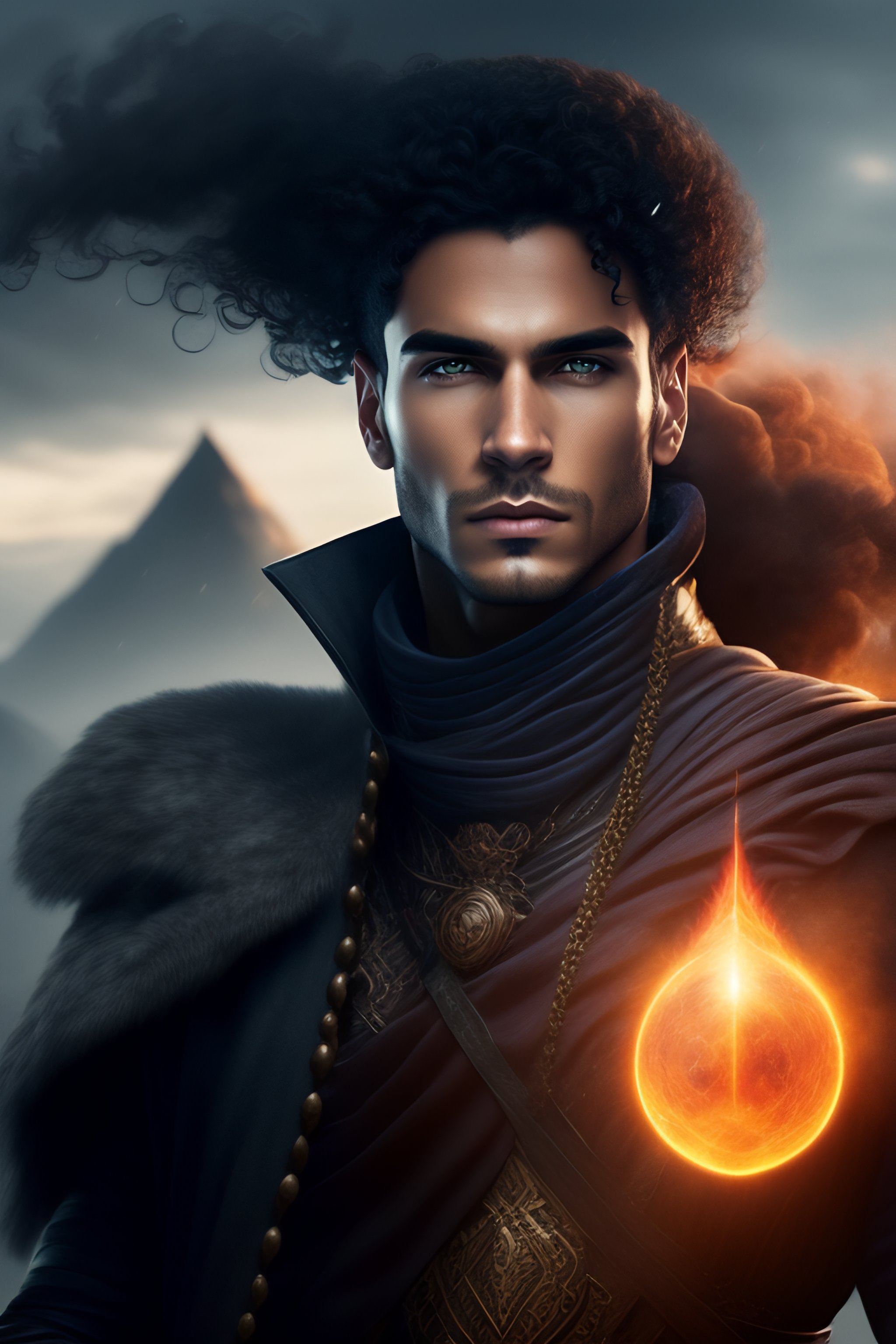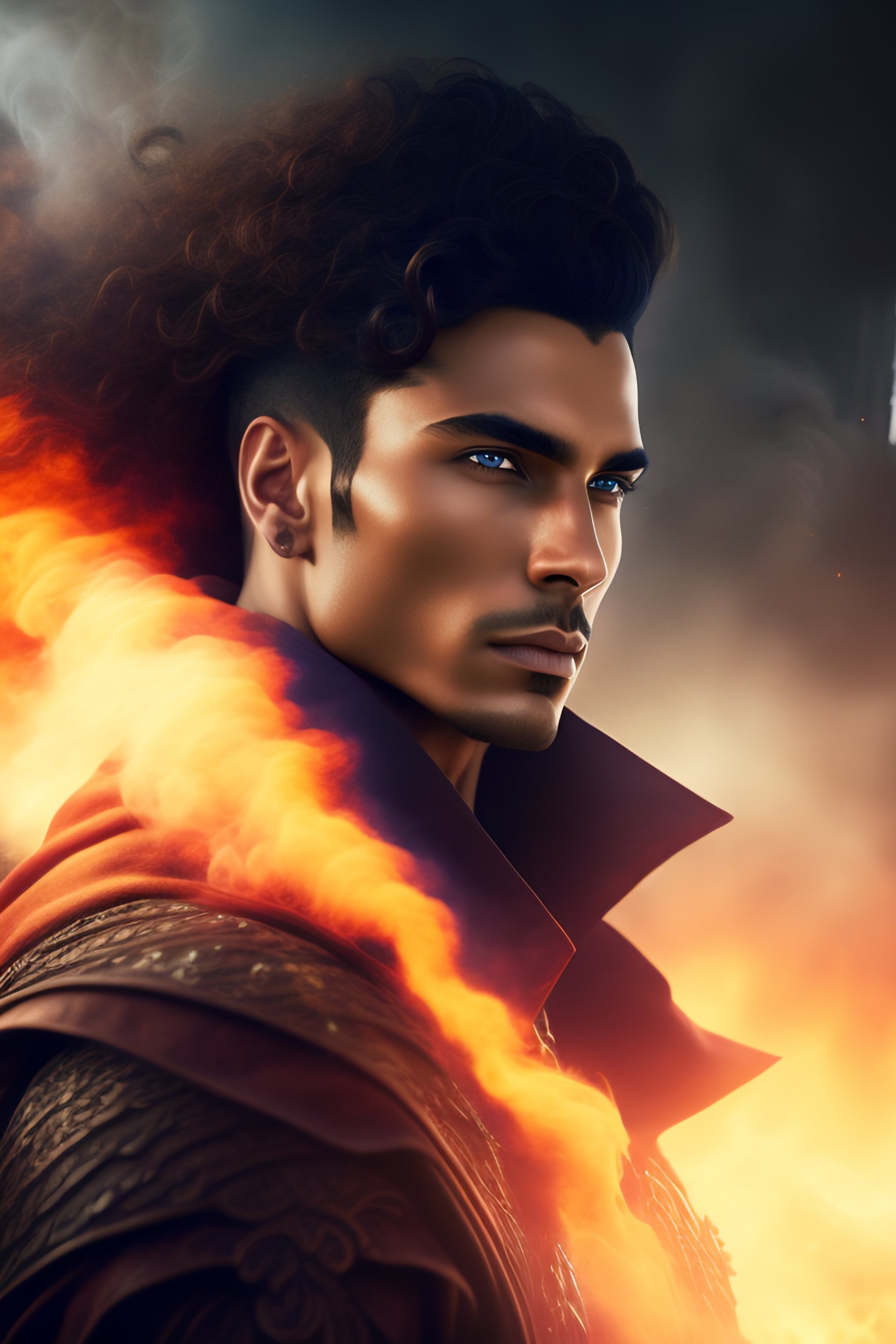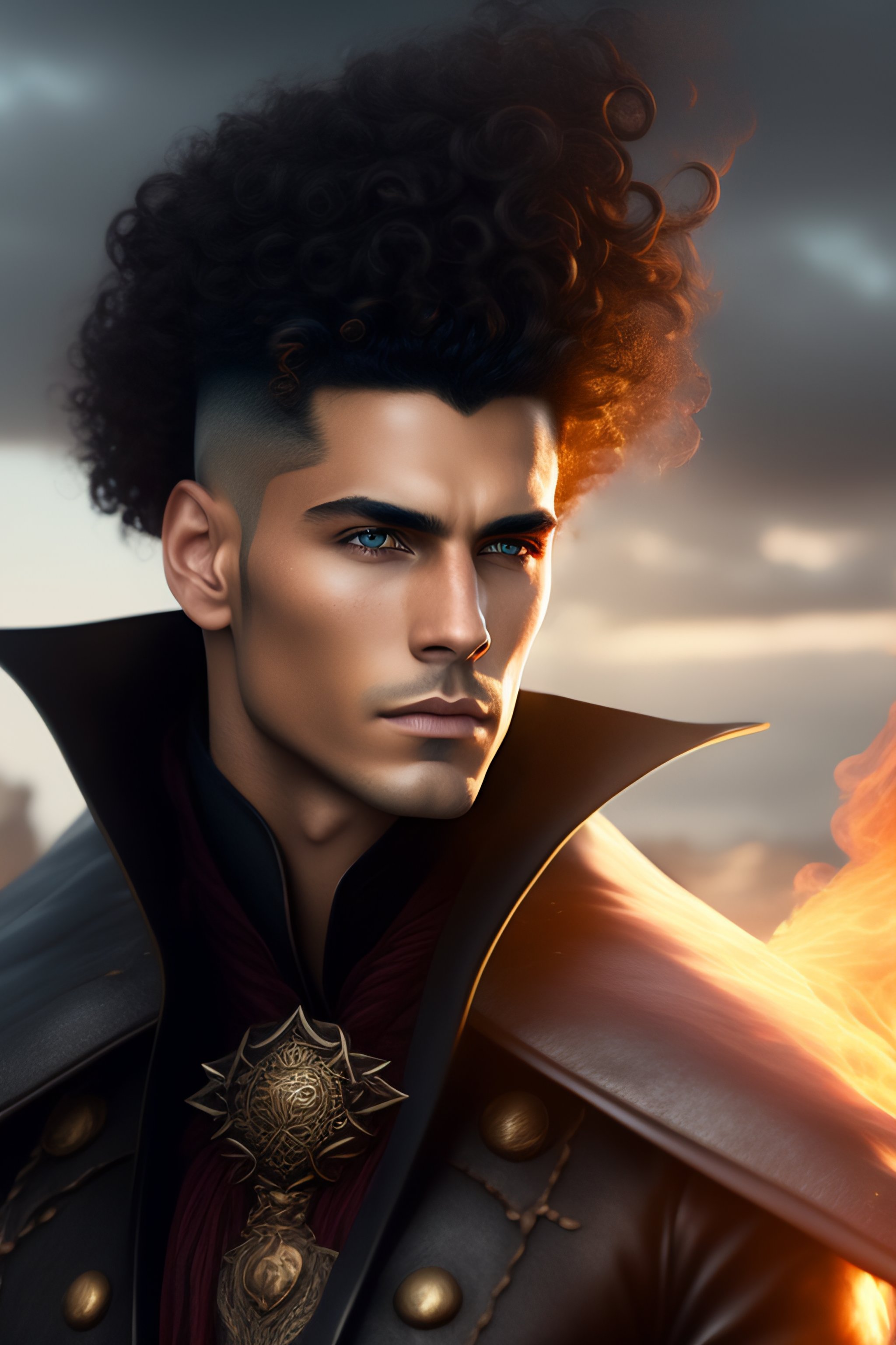 Male mage using powerful wind magic, curly hair slightly shaved on the sides, brown eyes, eerie gaze, full body shown over rubble, familiar crow wreathed in smoke, fantasy style