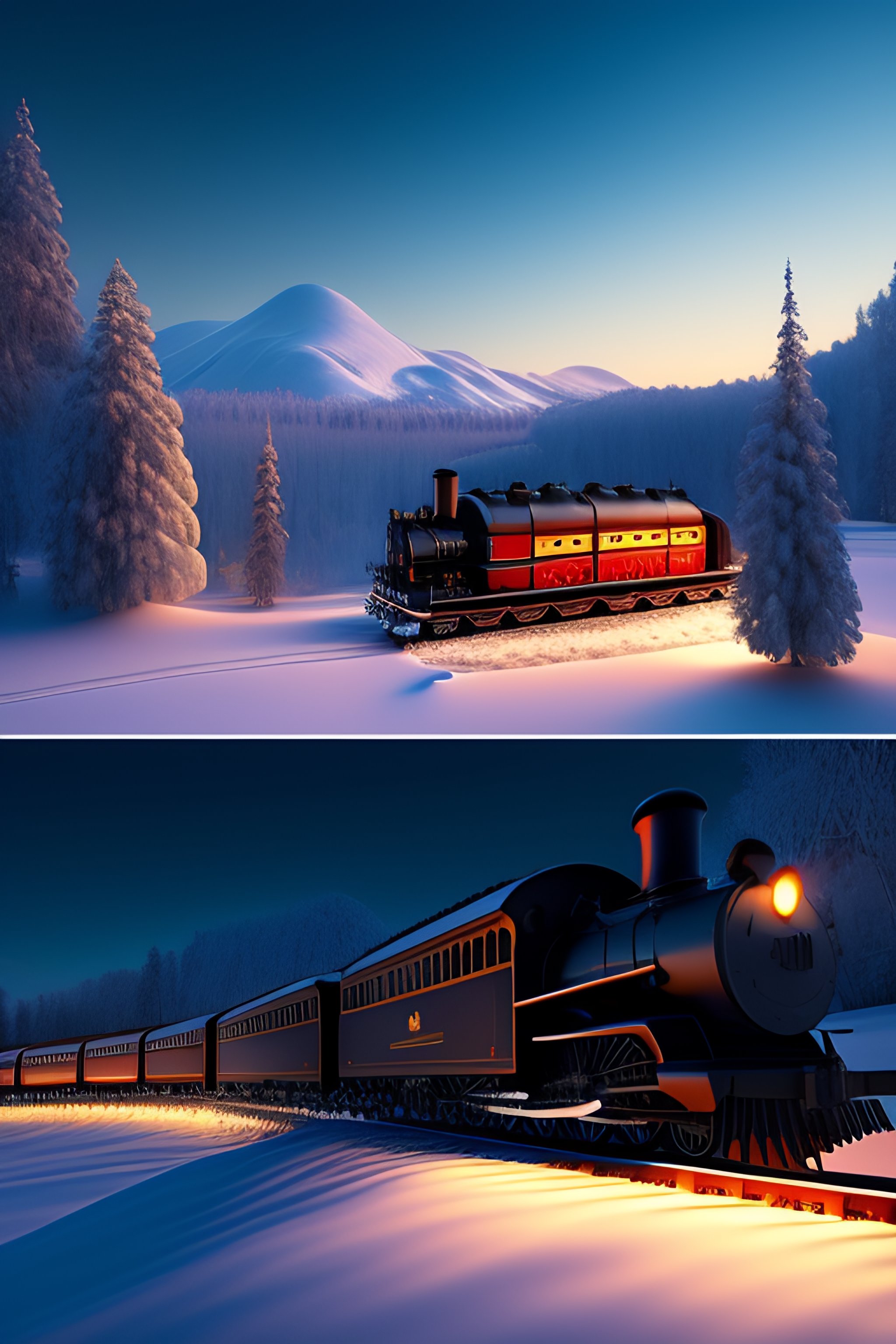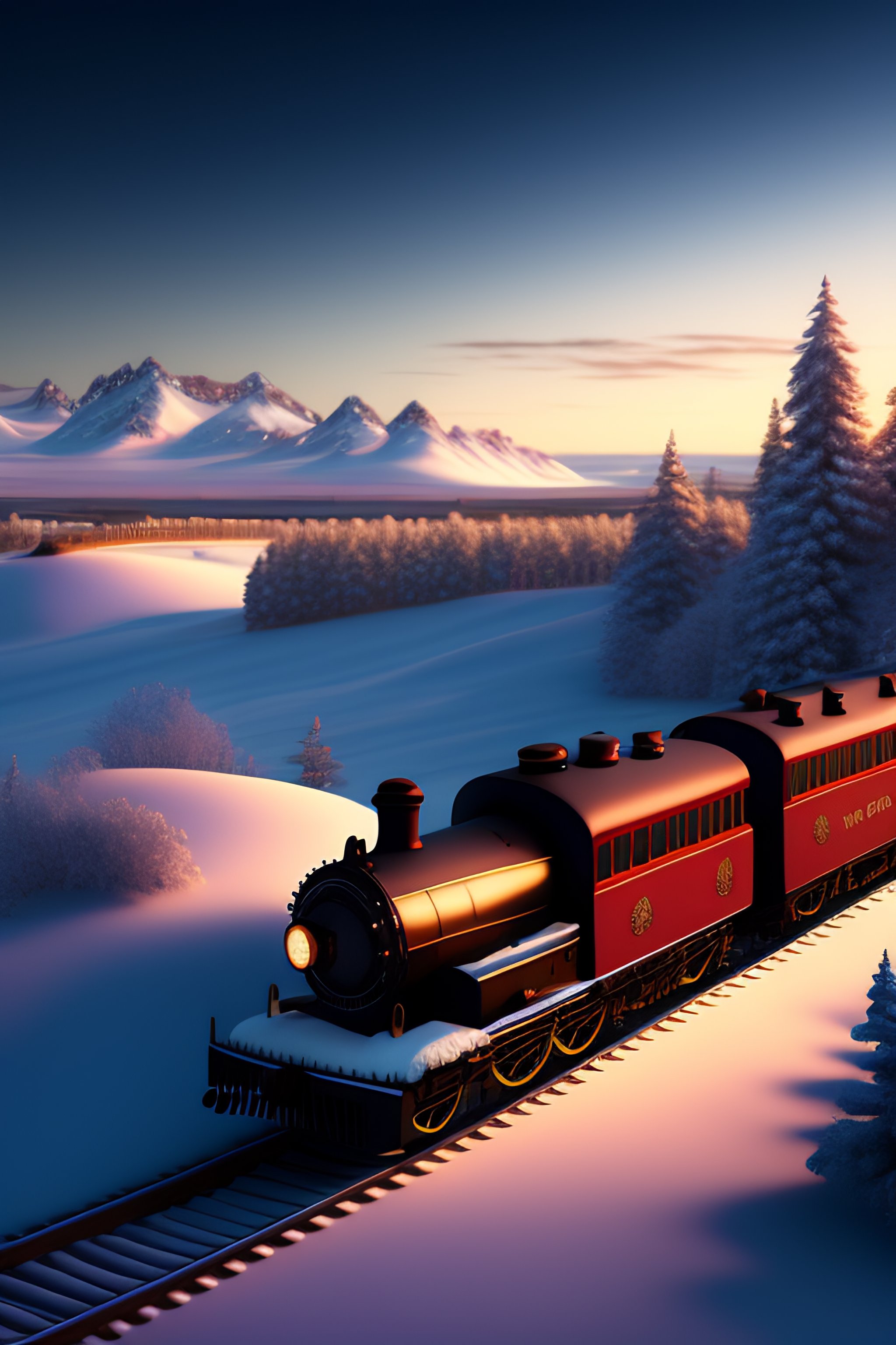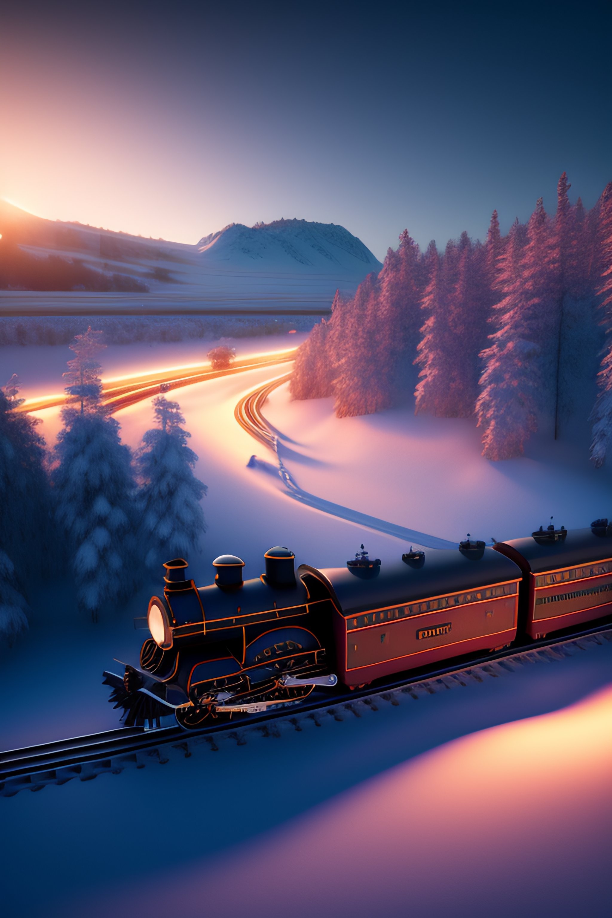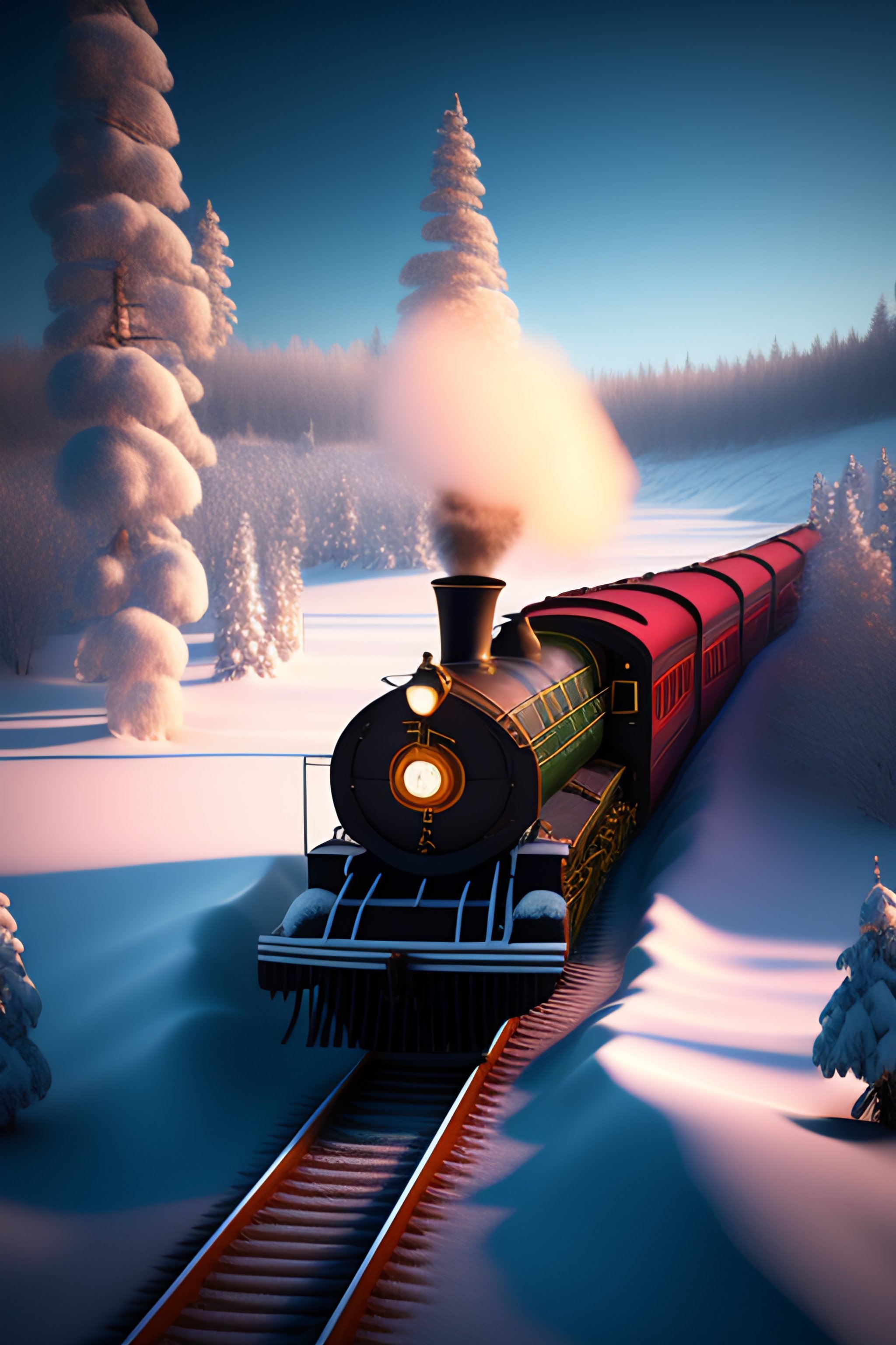 Pixar style, steam train driving through the snow, the polar express, scenic landscape, stunning environment, dusk, ultra detailed, octane render, ultra detail, intricate detail, volumetric lighting, dreamy magical atmosphere, vivid colours, photorealistic, photography, lifelike, high resolution, digital art, ultra wide angle lens, aerial view, elevated view, wallpaper --ar 3:2 --v 2