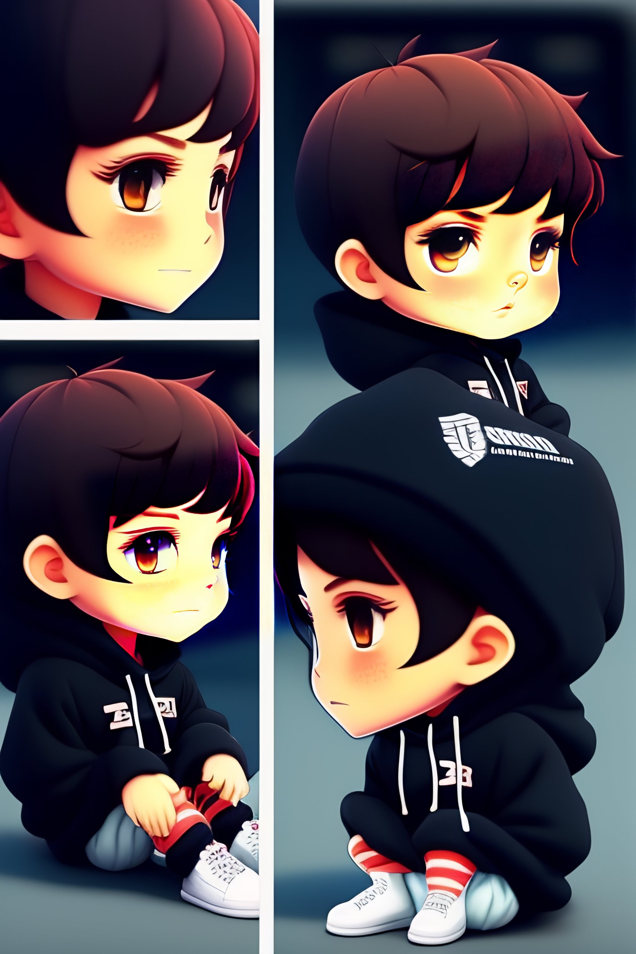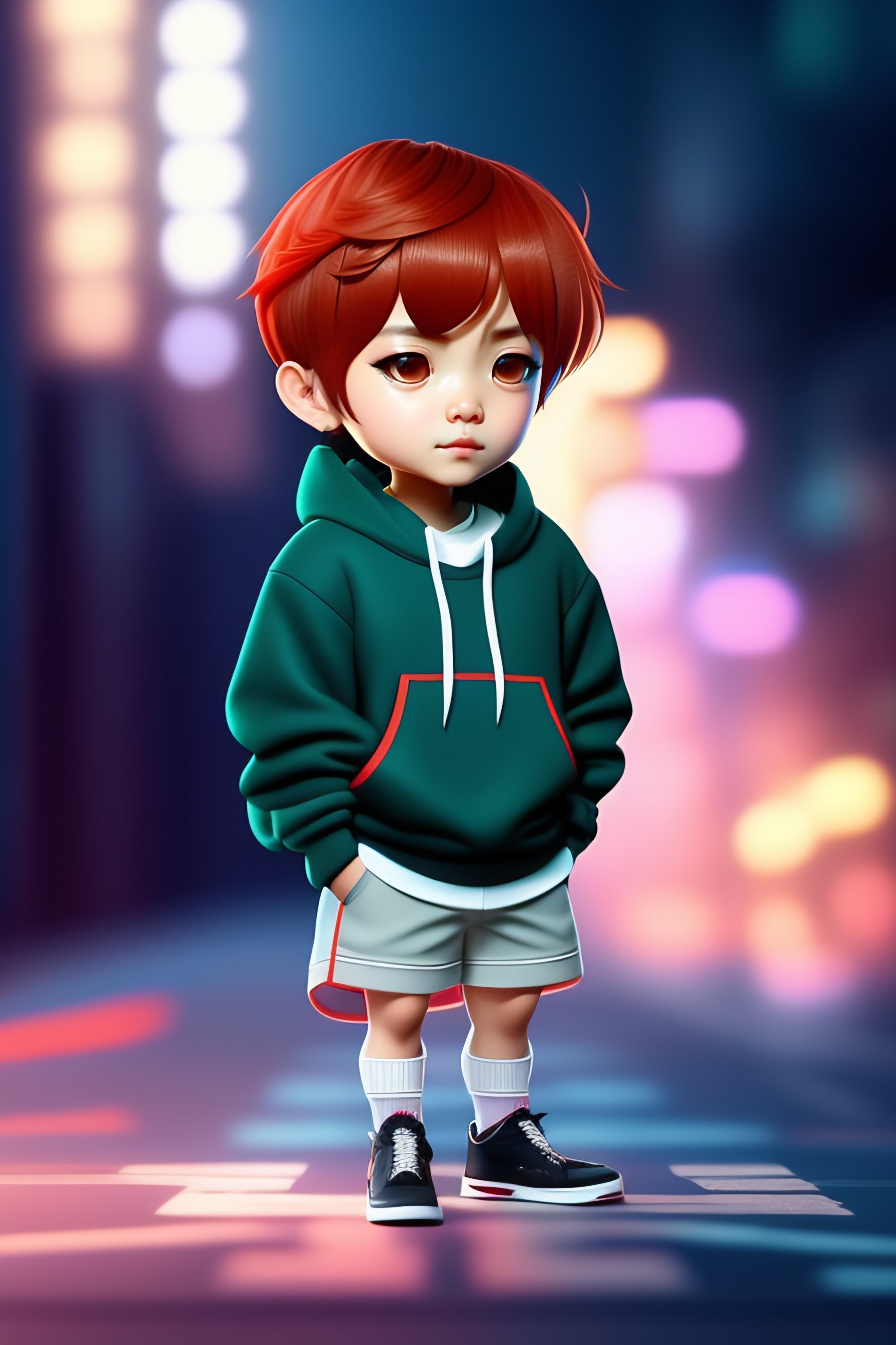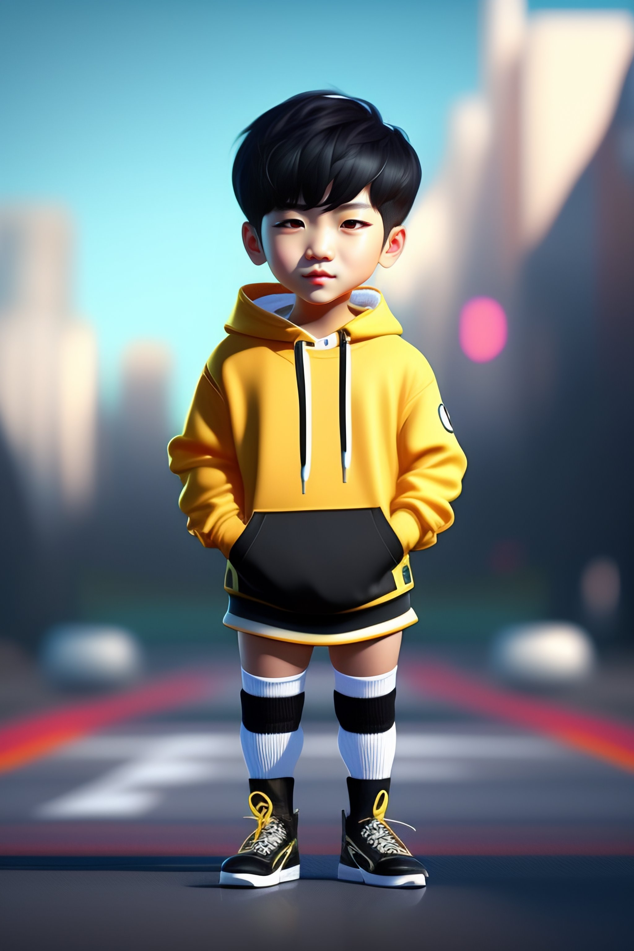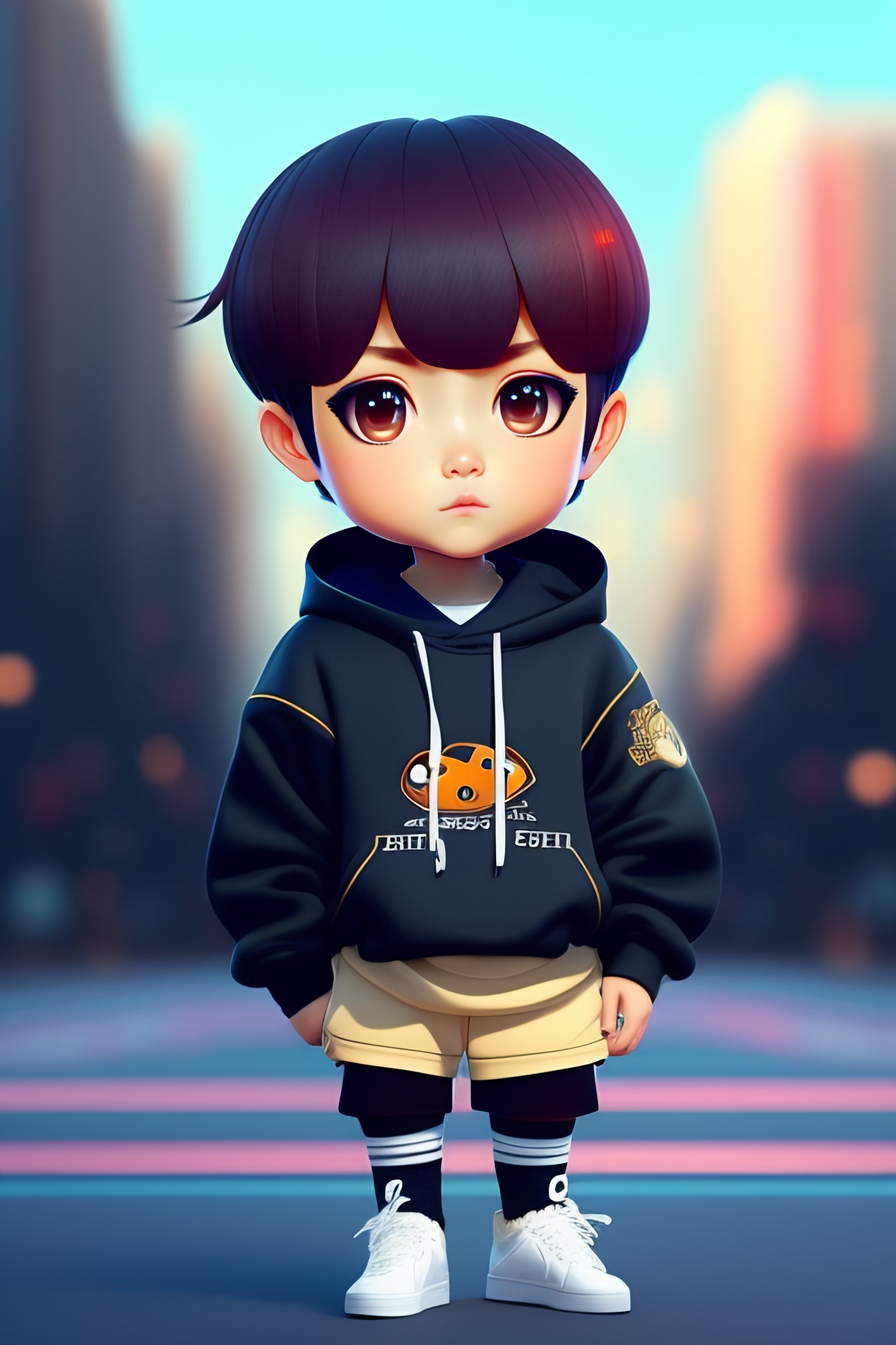 Chibi jung kook wearing an oversized hoodie and thigh socks, unreal engine, big eyes, super cute, stylish, extremely detailed