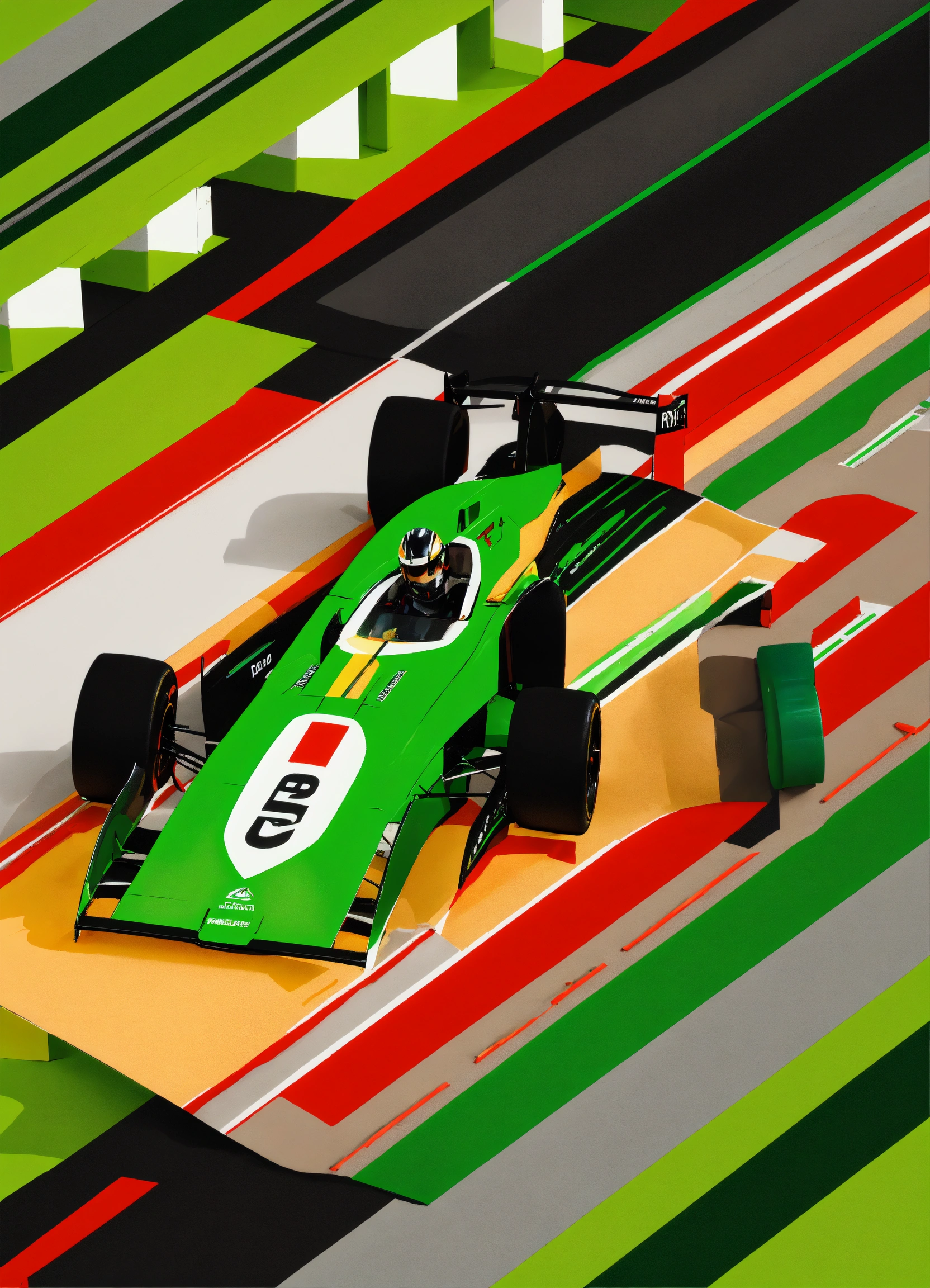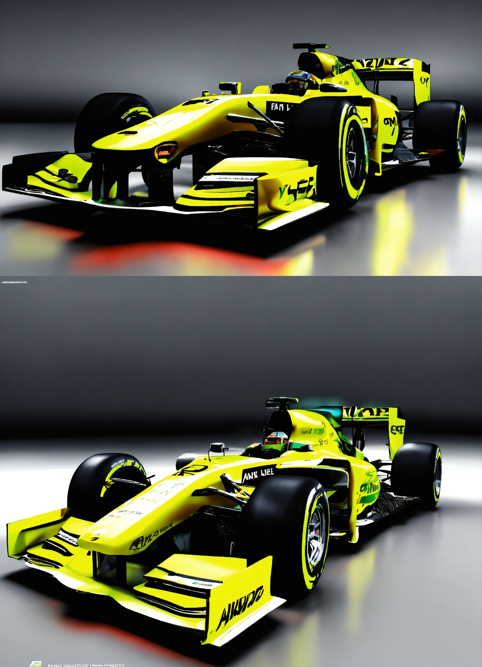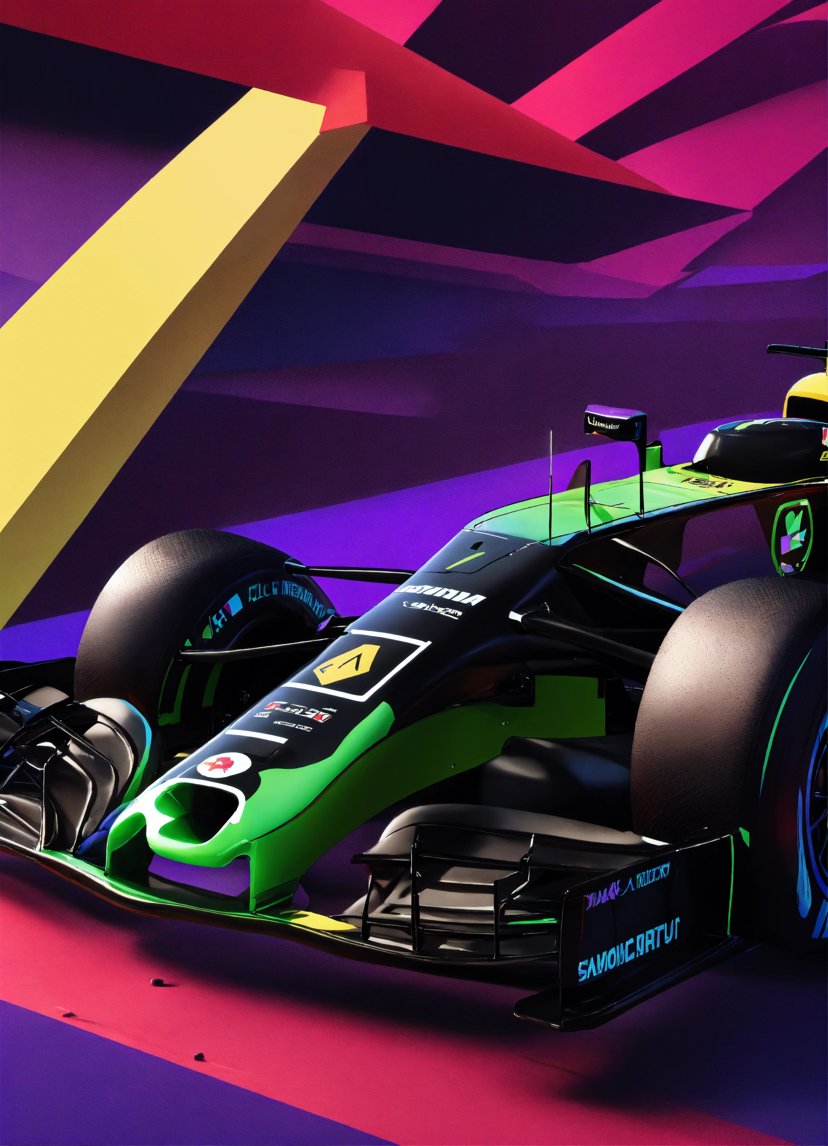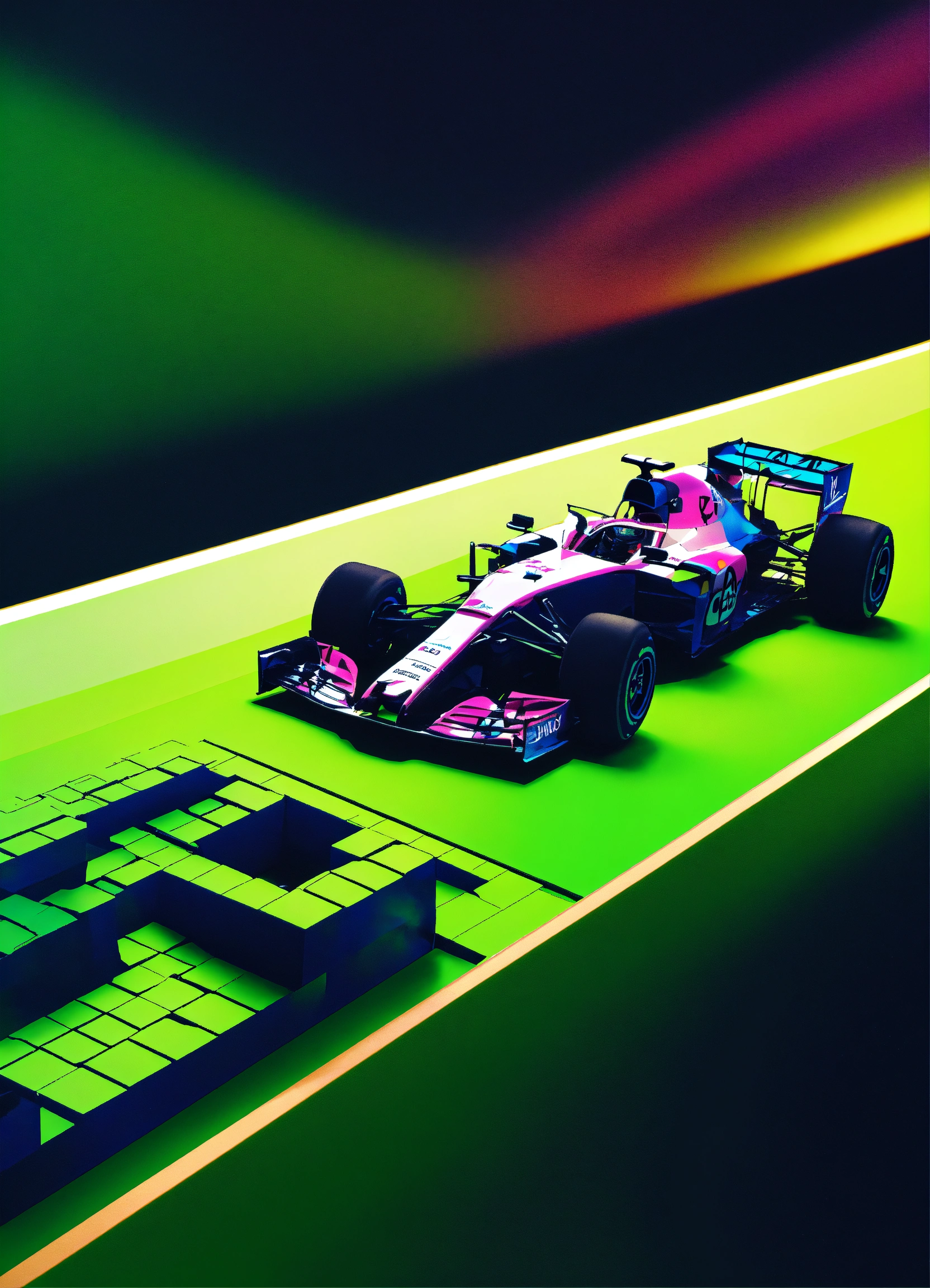Create an extreme 3d abstract formula one design. use an ai tool to generate the design, referencing a sample image that includes a black lime halftone. apply the design to a mockup of a long shirt using a mockup generator tool. make sure the design fits well on the mockup and that the overall composition is cohesive. save the final design as a high-resolution jpeg file