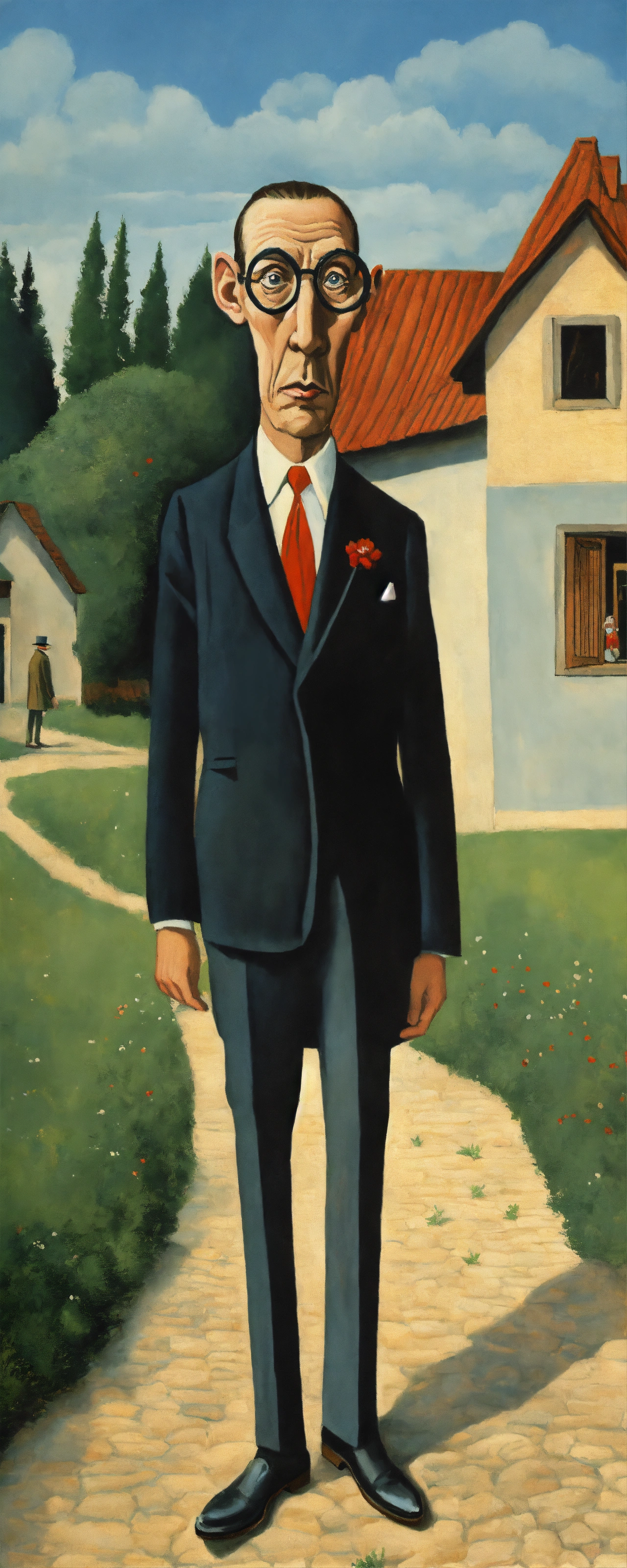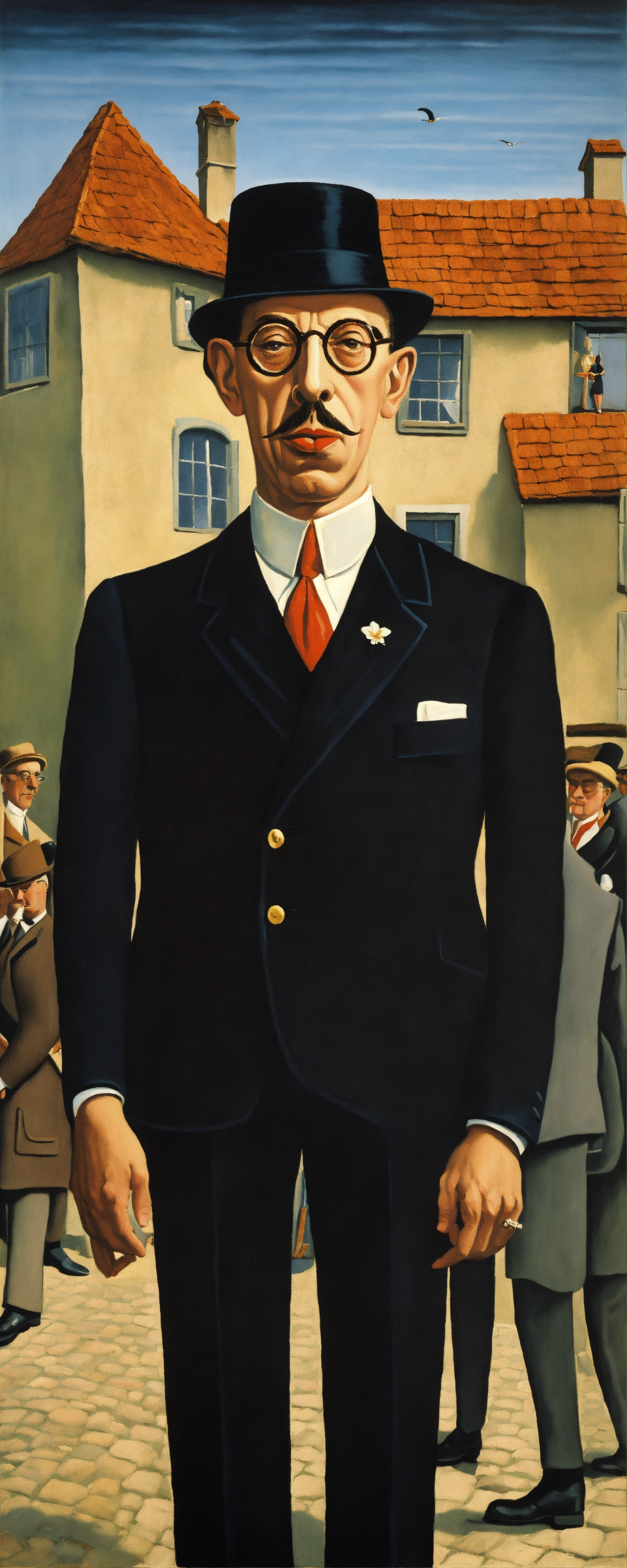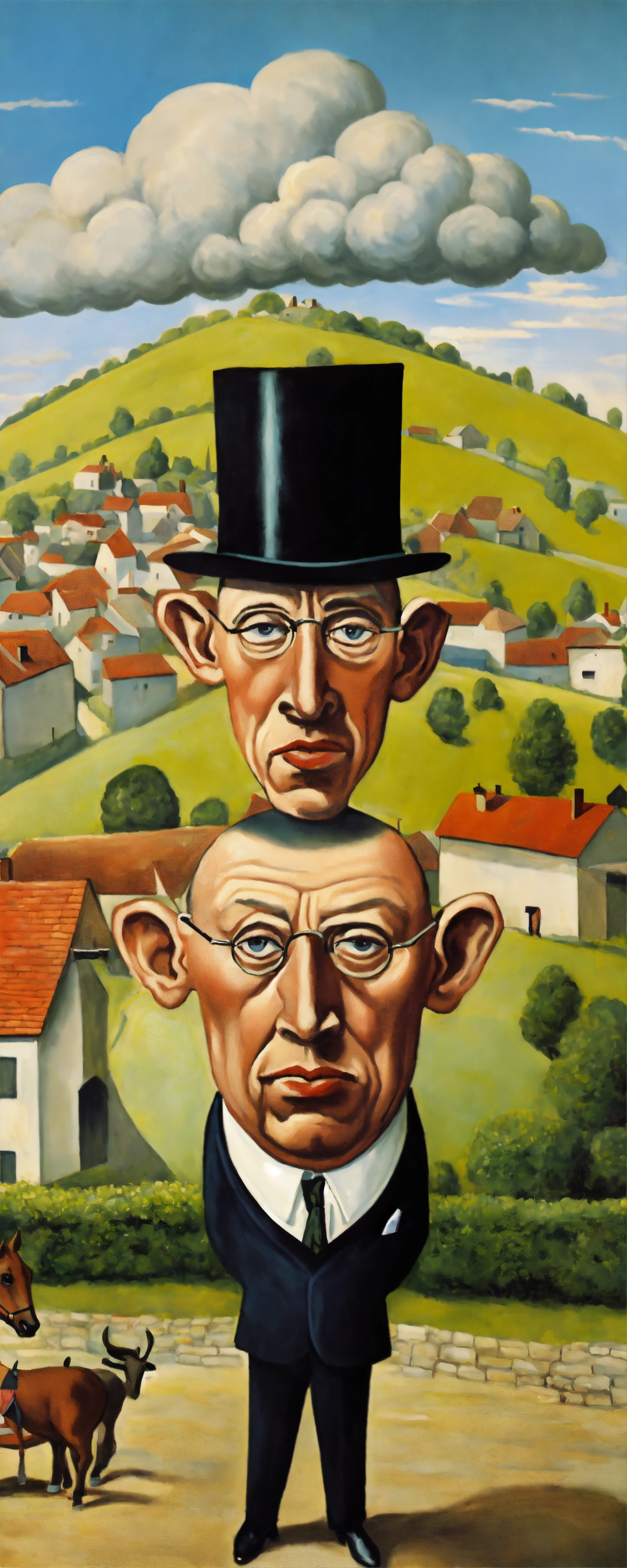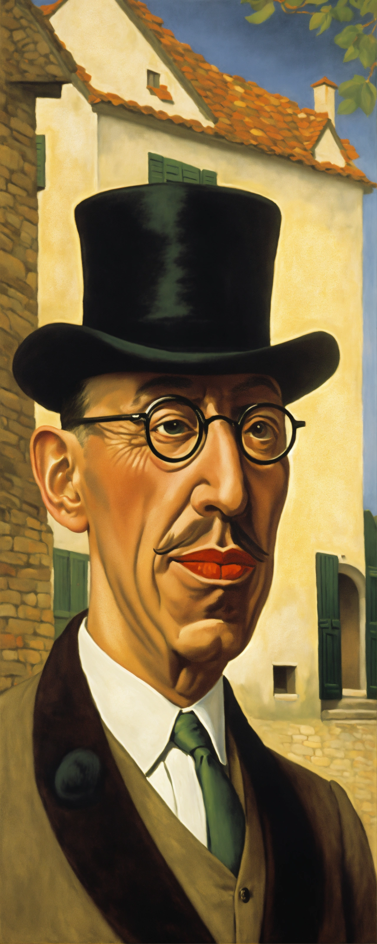 Fine illustration of the comedy cartoonish character "igor stravinsky" with his funny face in a village with people, in a painting by rene magritte