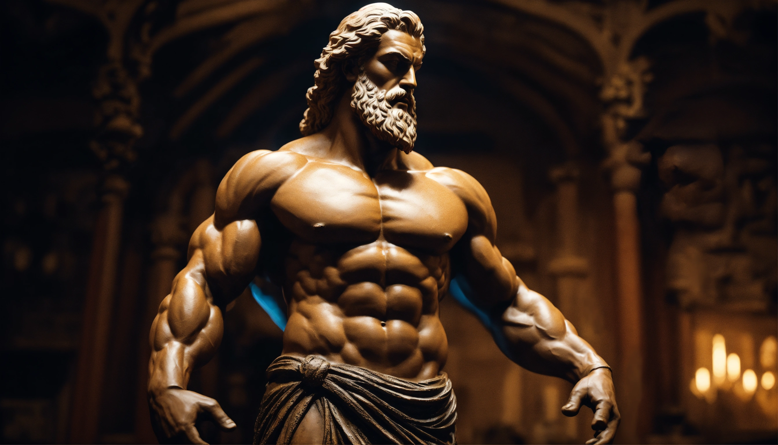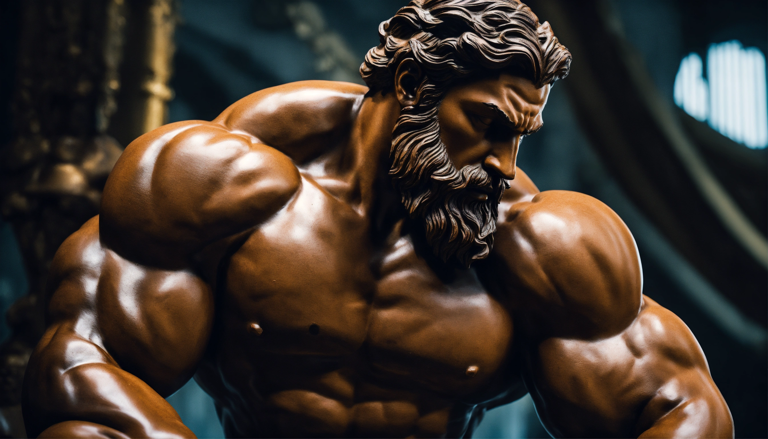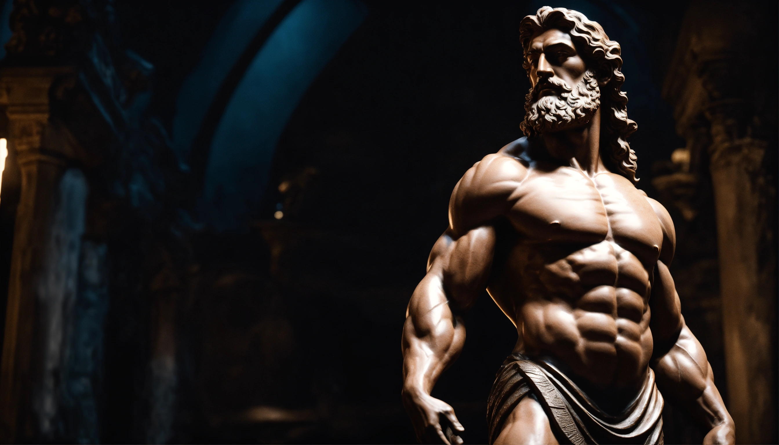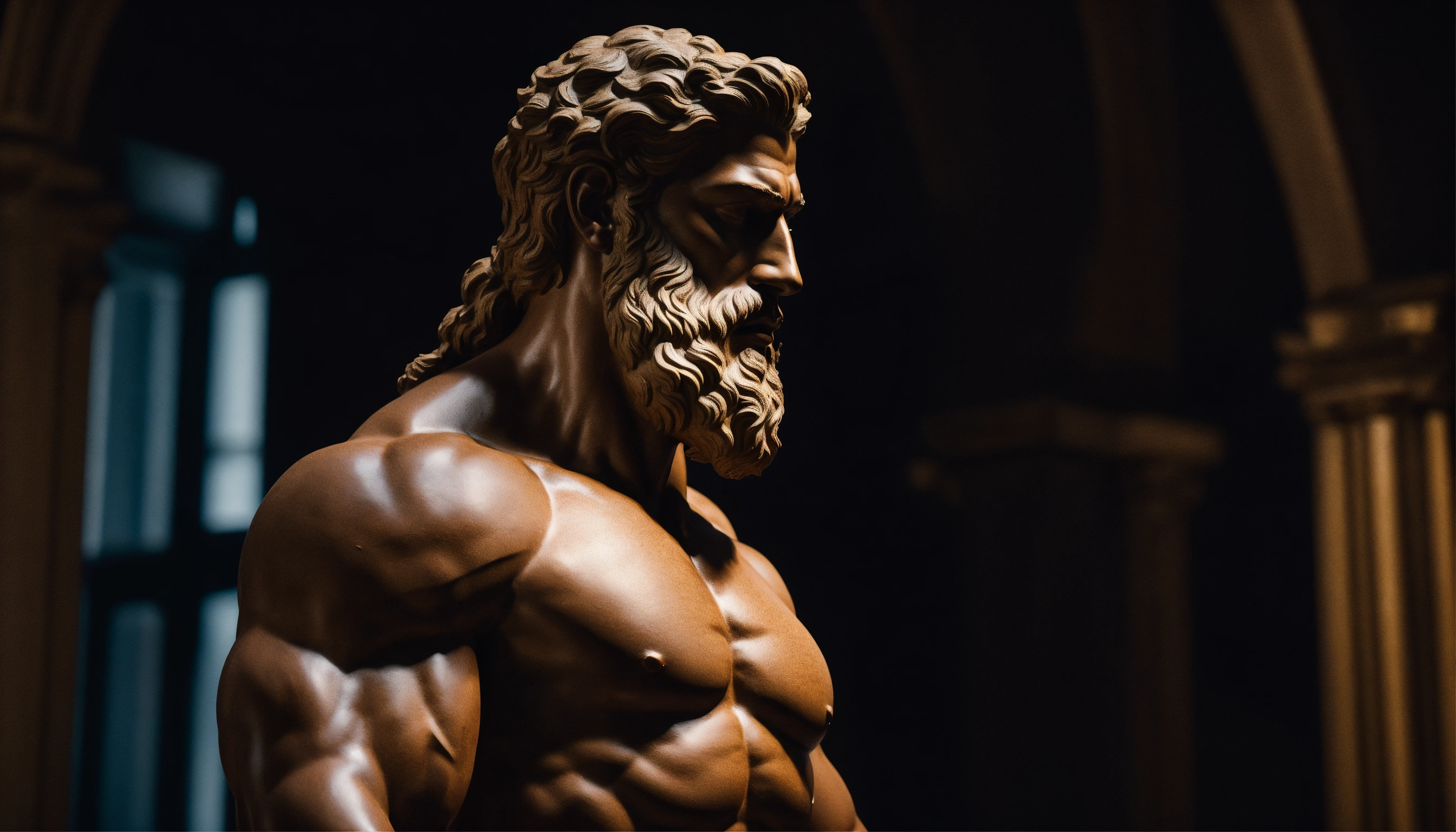 Wise philosopher sculpture with muscular body in profile, strong arms, hercules style, marco aurélio style, sêneca style, epiteto style, looking forward, cinematic, 8k, dark background