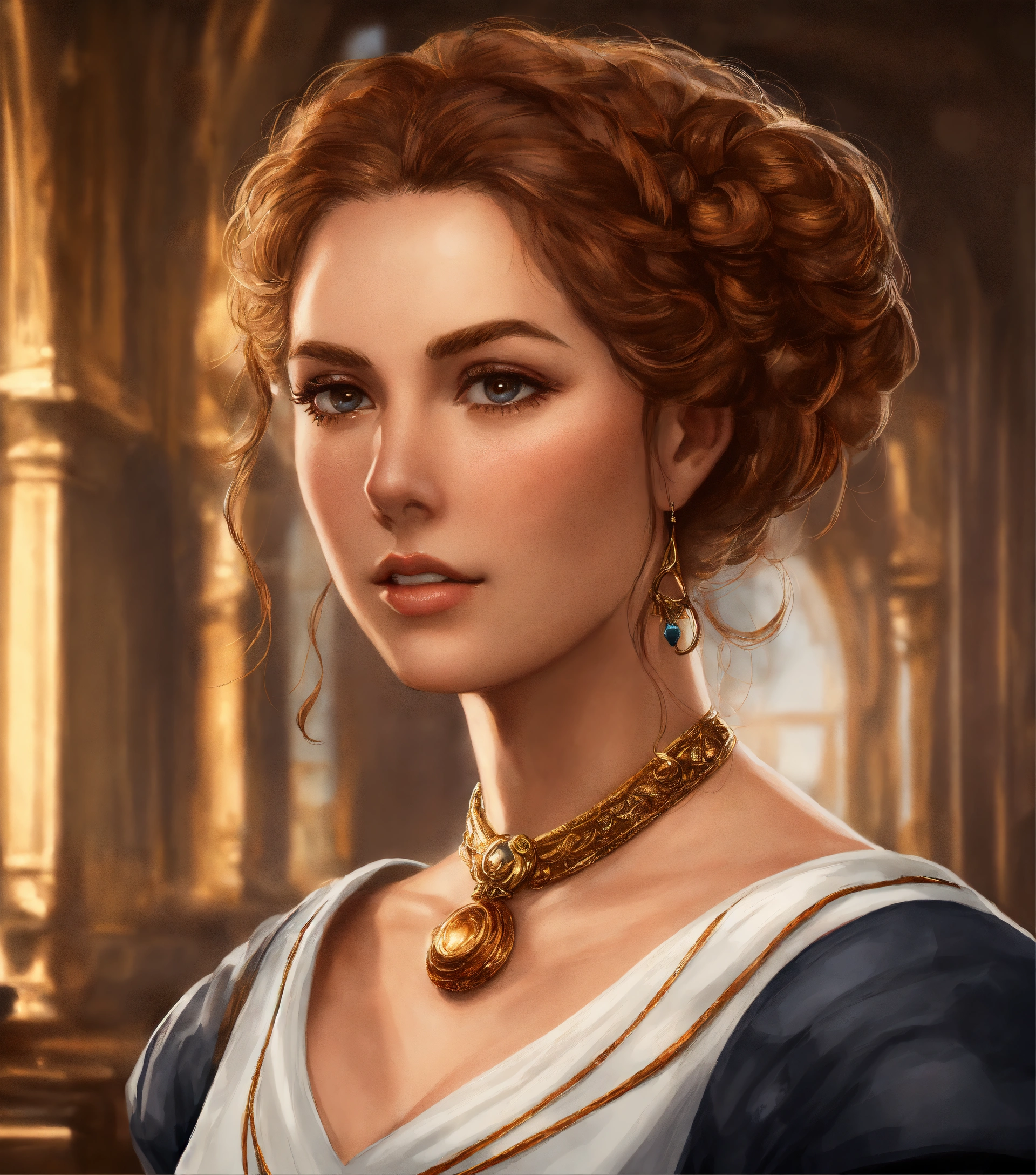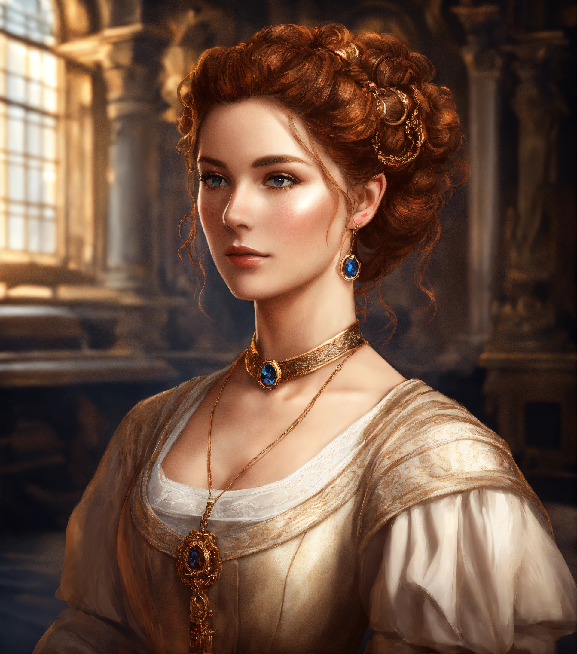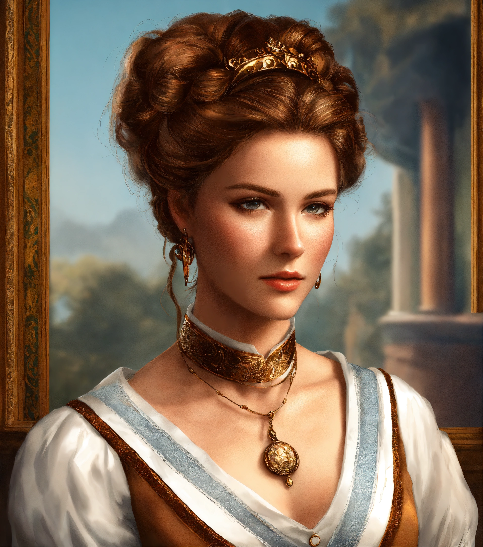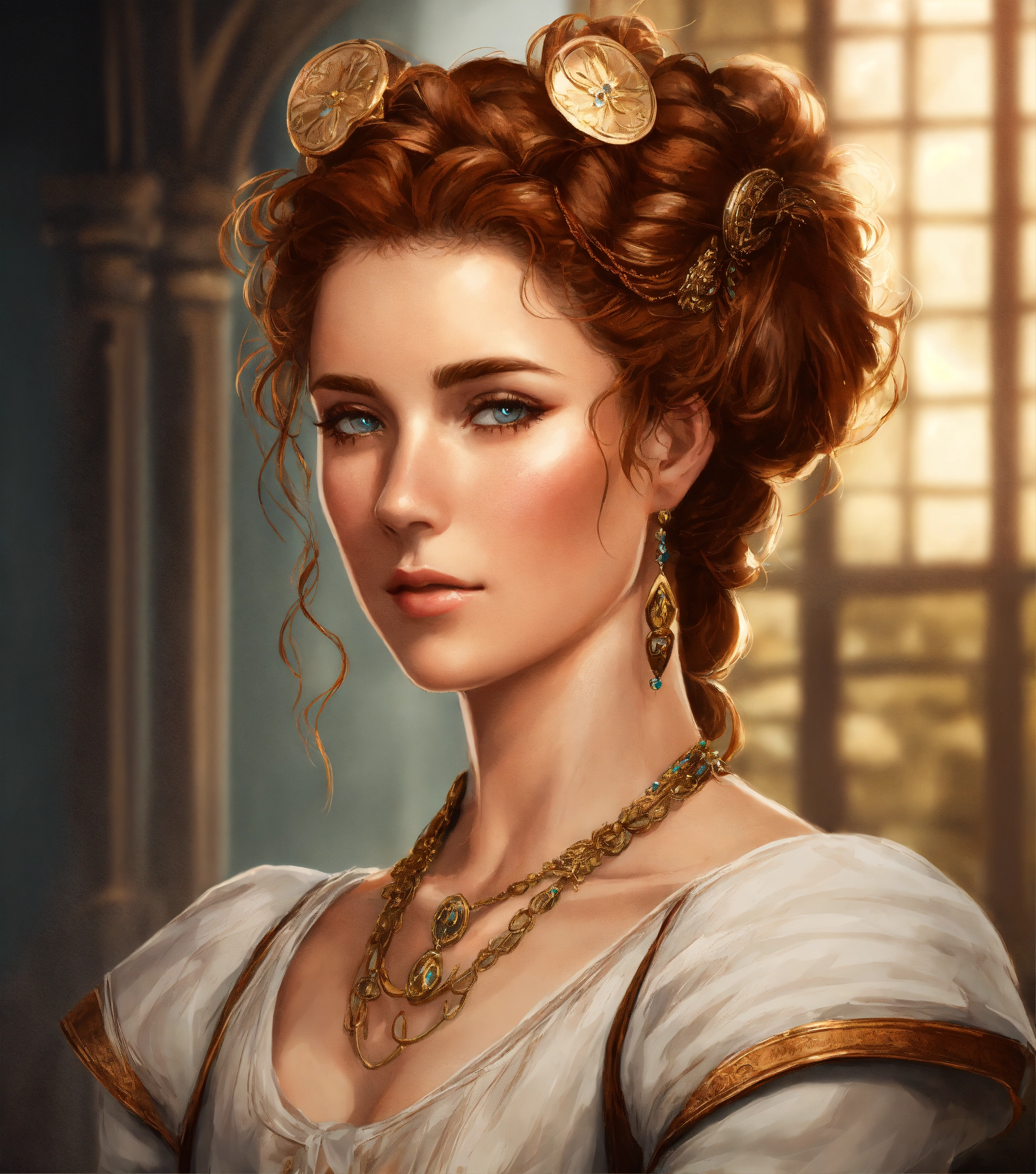 Digital art portrait of a beautiful, wealthy british noblewoman archaeologist with ringlet copper updo. she is wearing a low white blouse. detailed face.