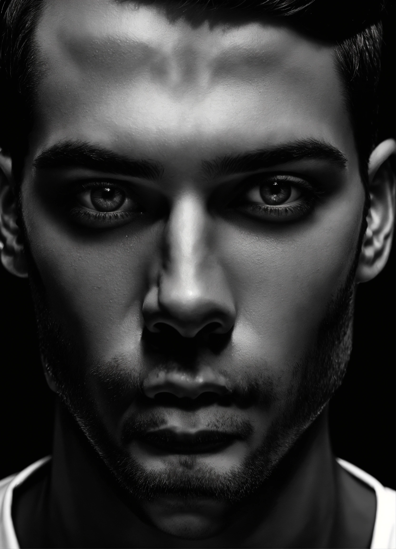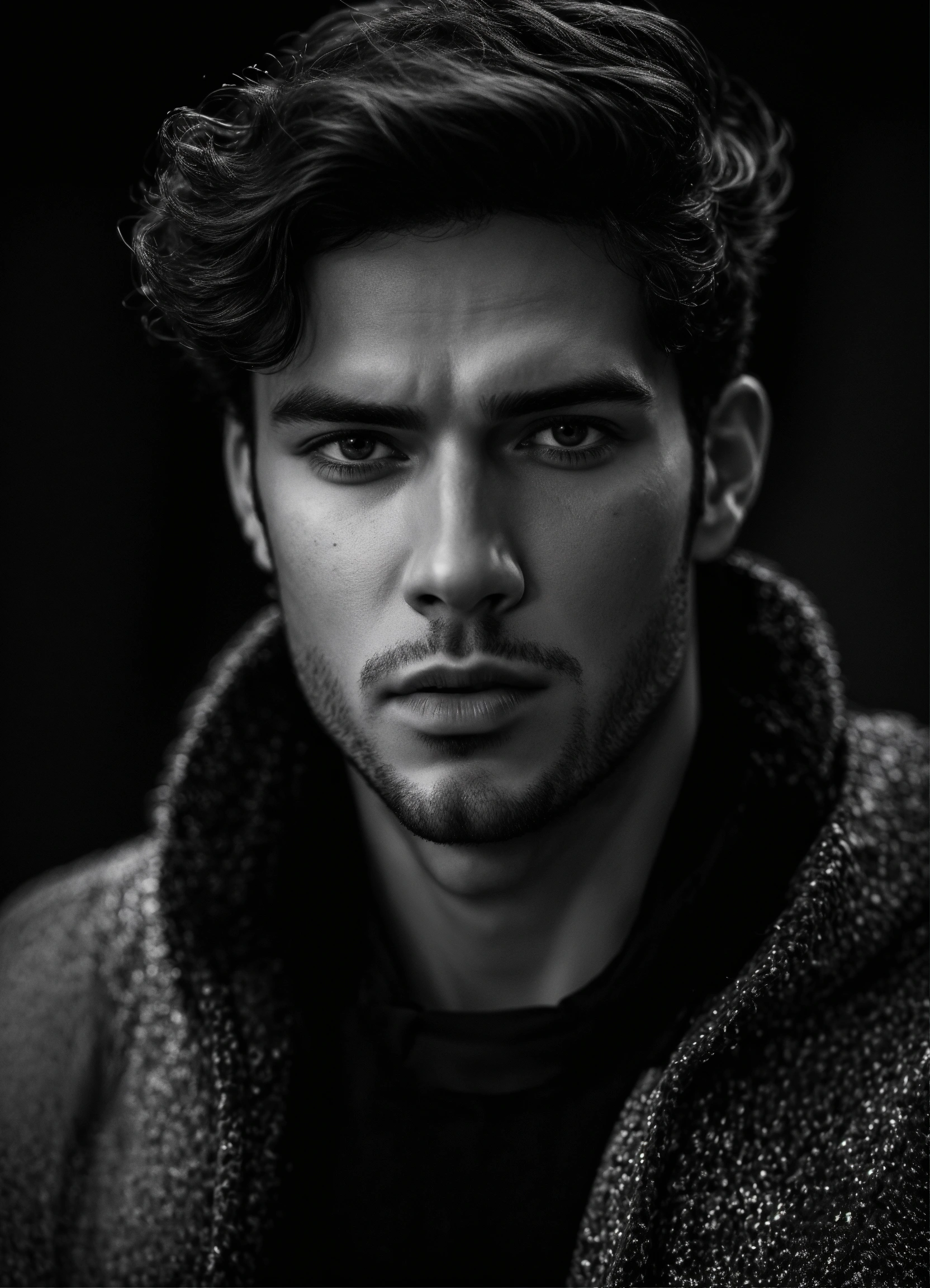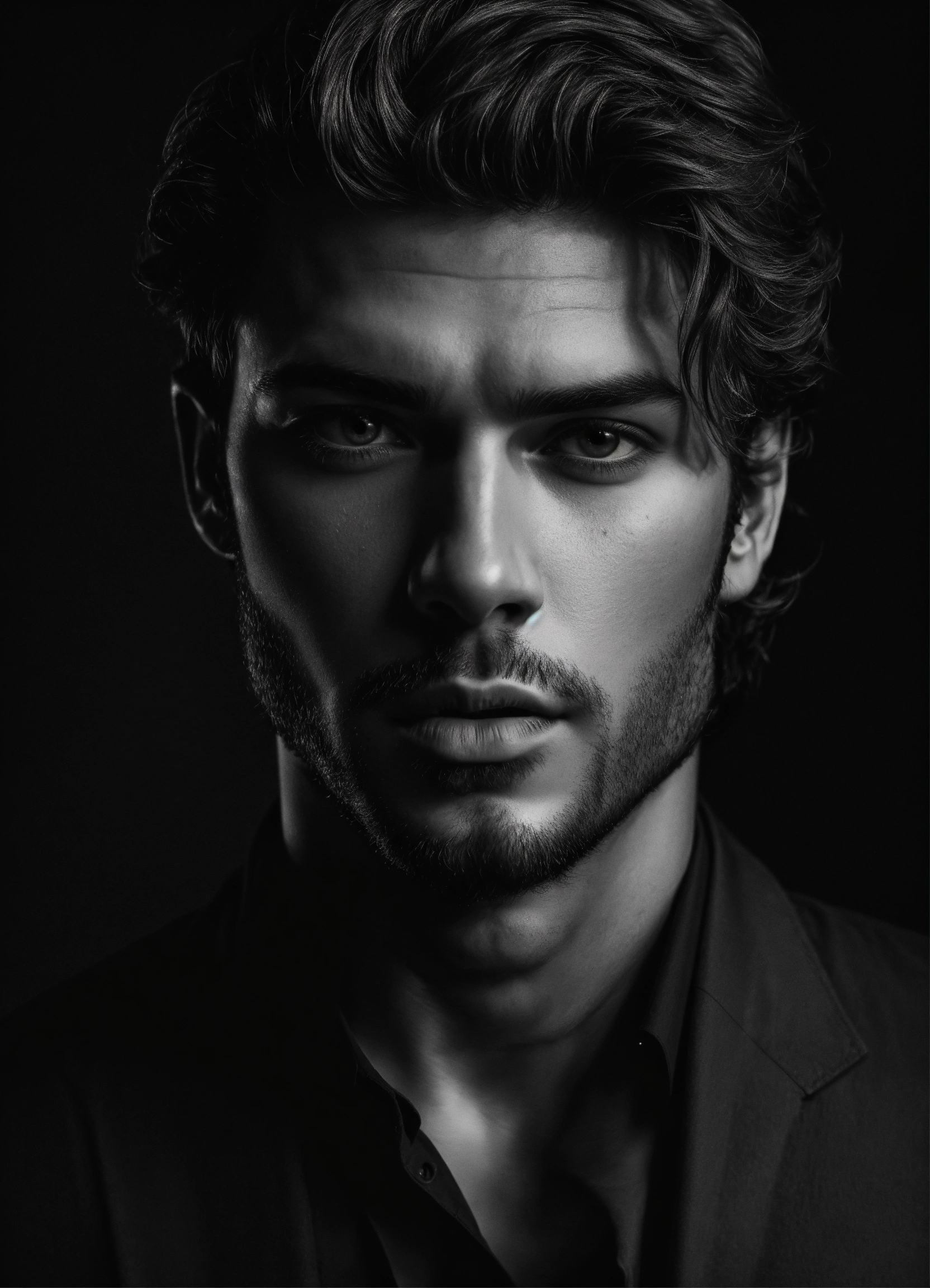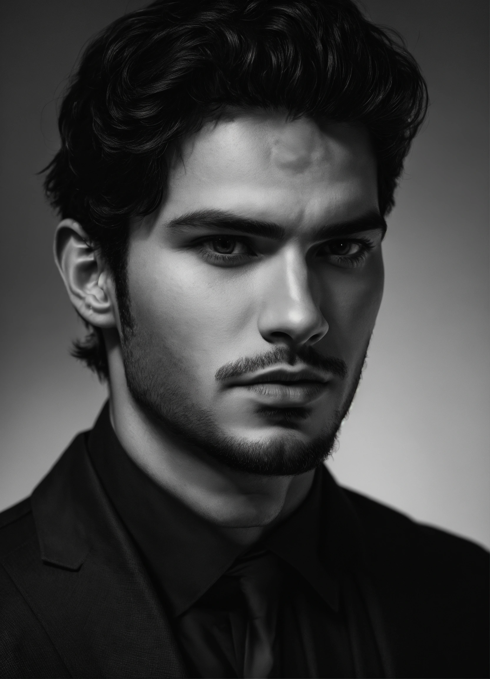 Photo of male model gonçalo teixeira, black and white, realistic, portrait, not painted, very detailed faces, skin with pores, 4k, dark suit, black plain background, skin not smoothed, face from left to right, desire in the eyes, half profile, glowering, looking into the camera, dark shirt.