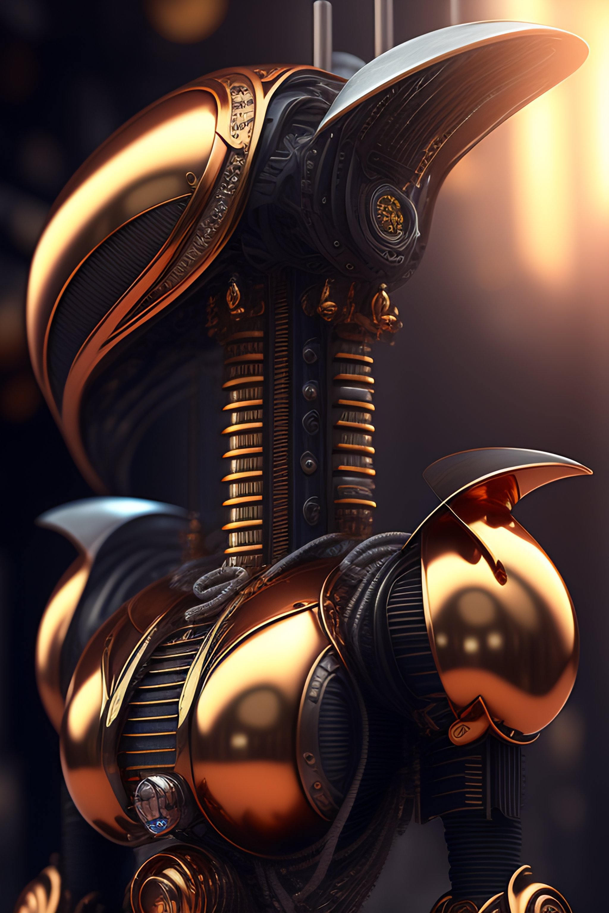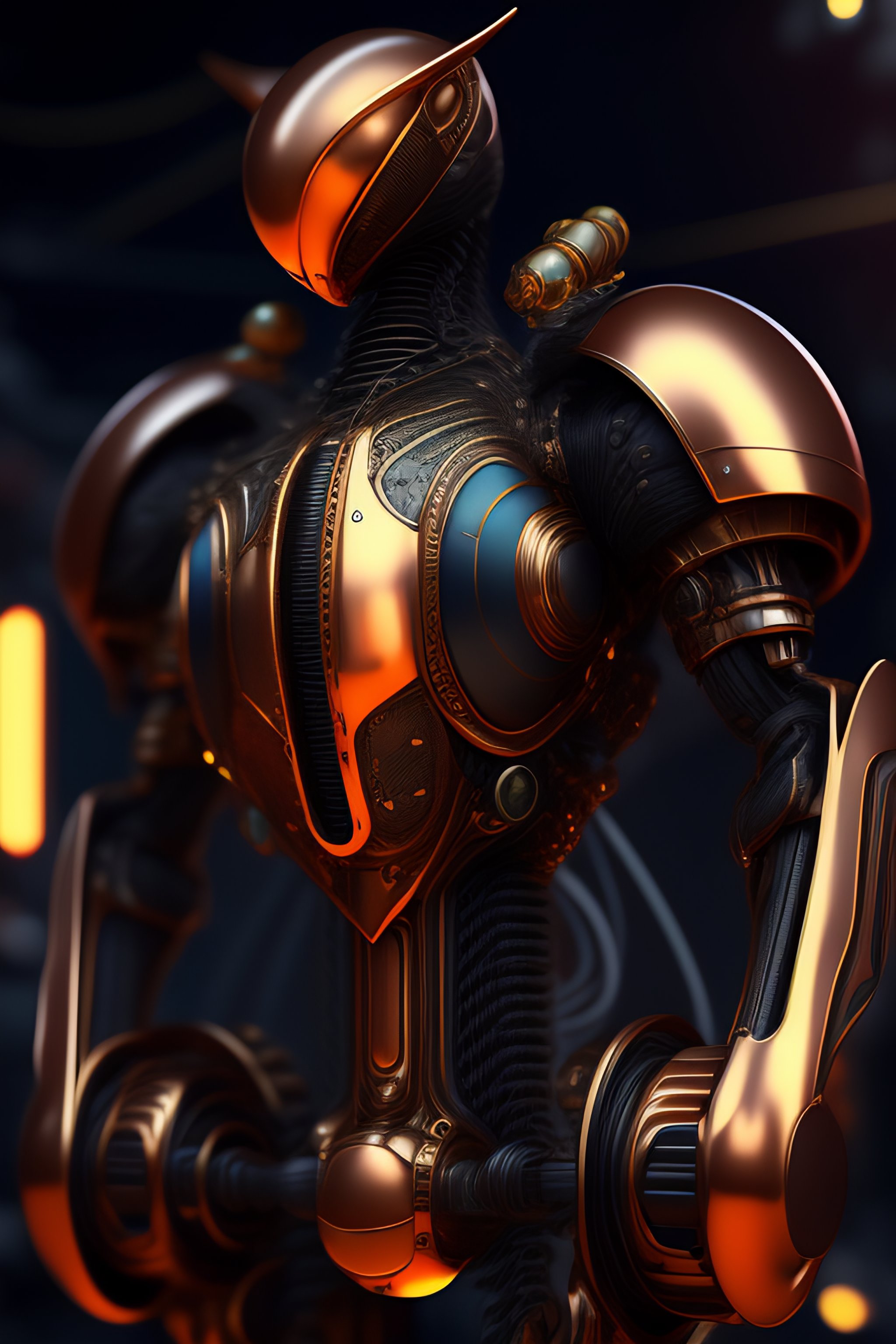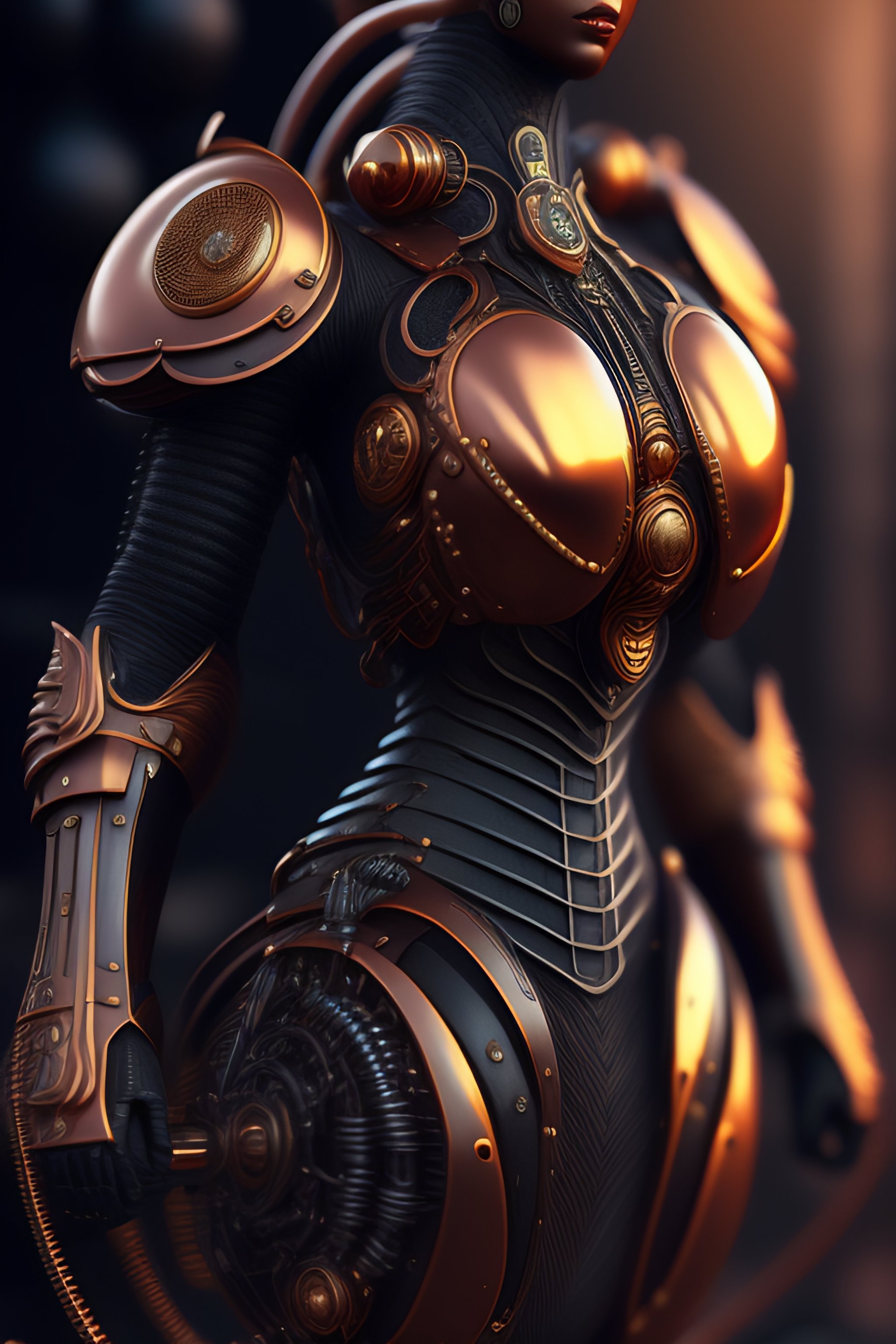 Alien biomechanic, upper body cinematic style digital art render with mechanical and futuristic details copper steampunk science laboratory