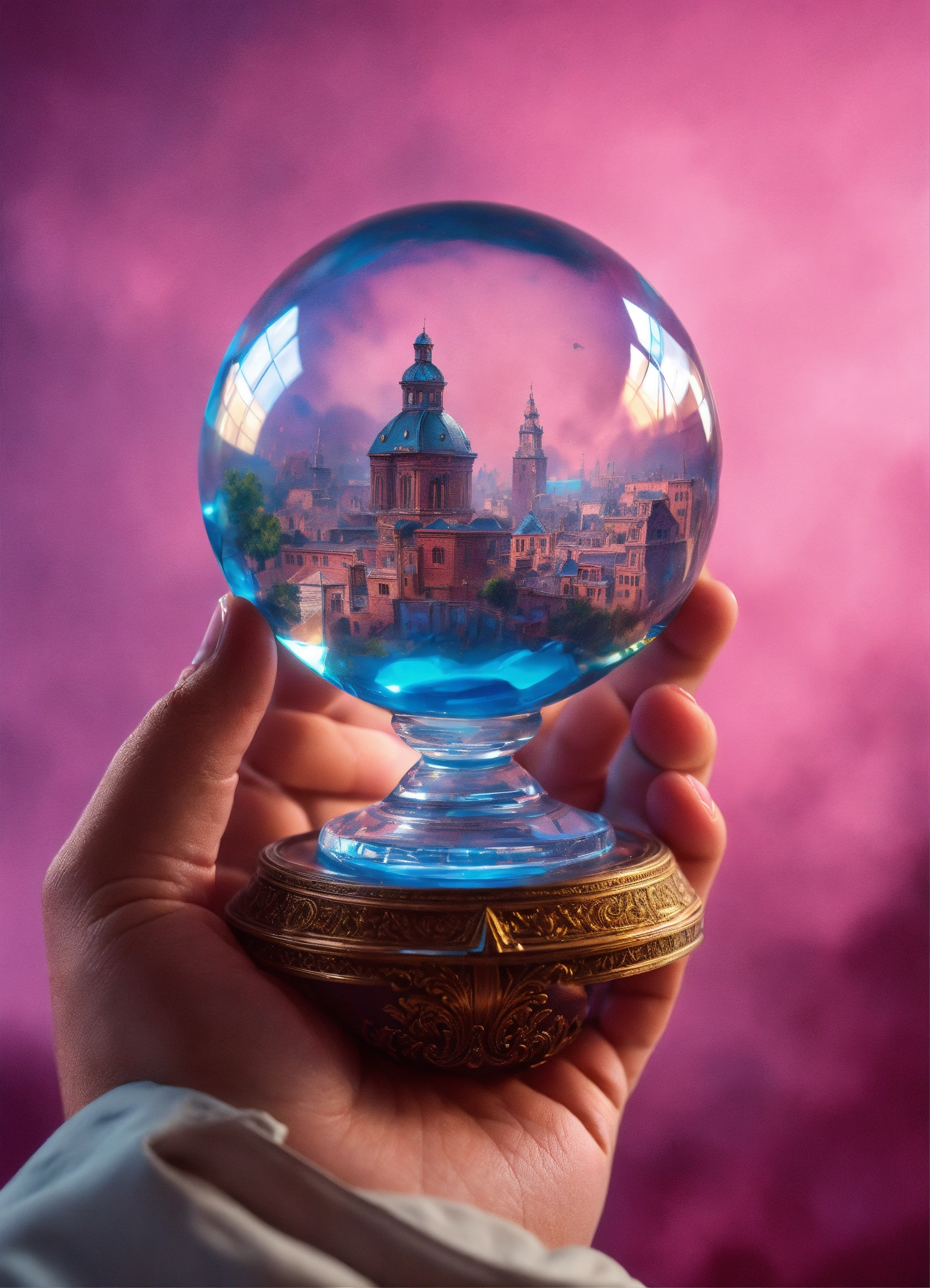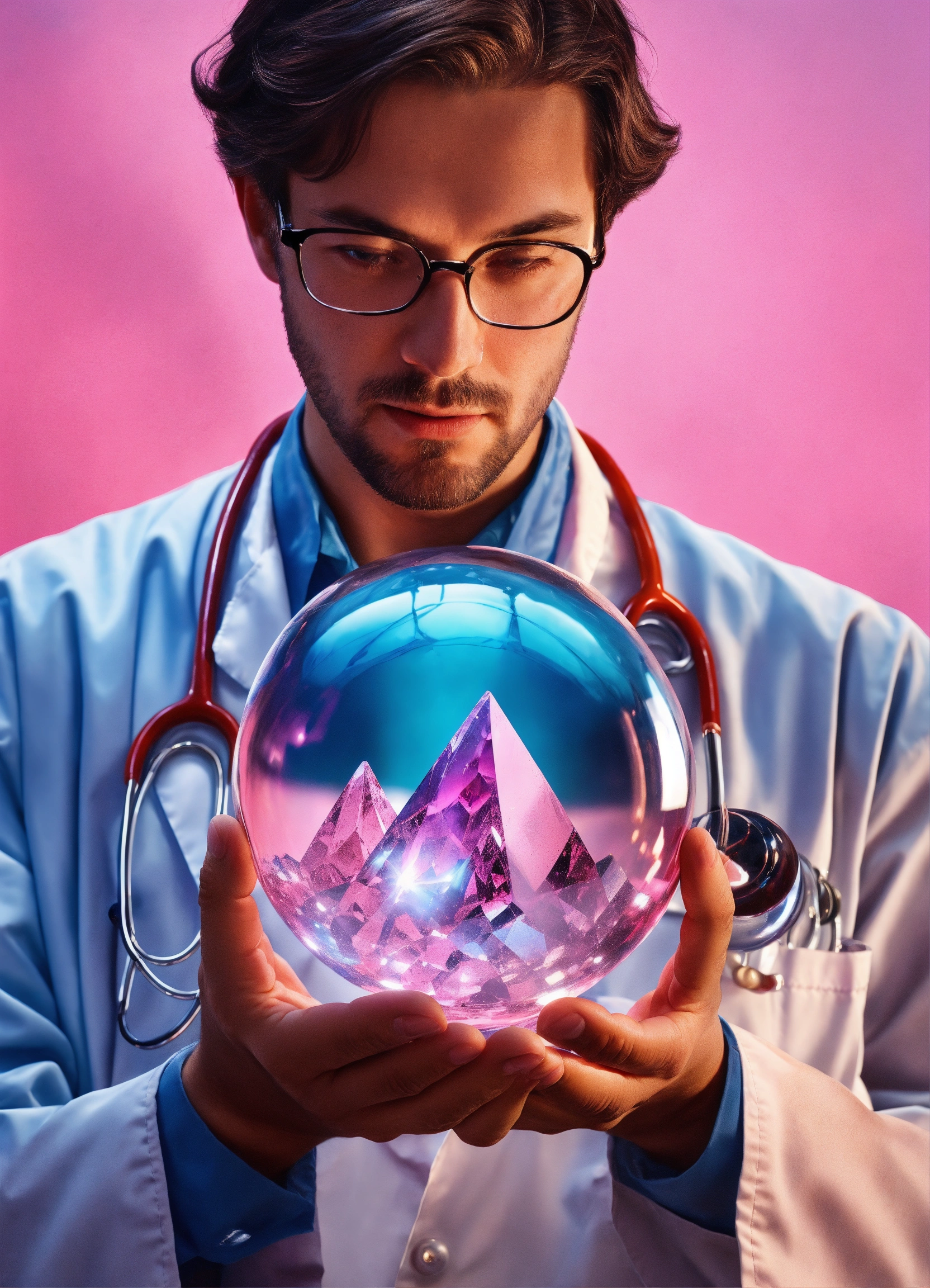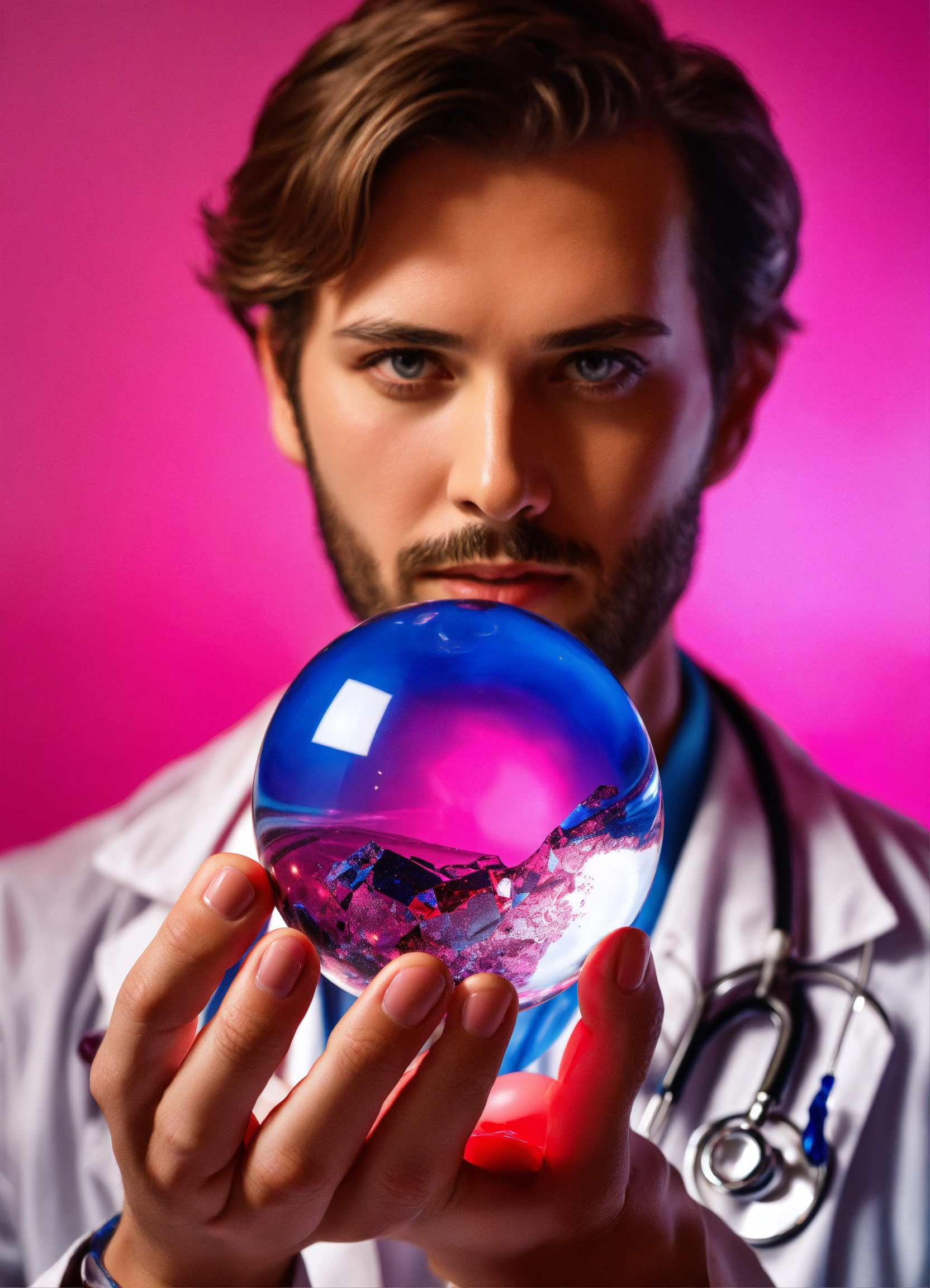 A doctor holds a blue crystal ball in his hand and looks through it, hyper-realistic photograph, painting by greg rutkowski, trending on artstation, highly detailed, intricate details, 8k, pink background