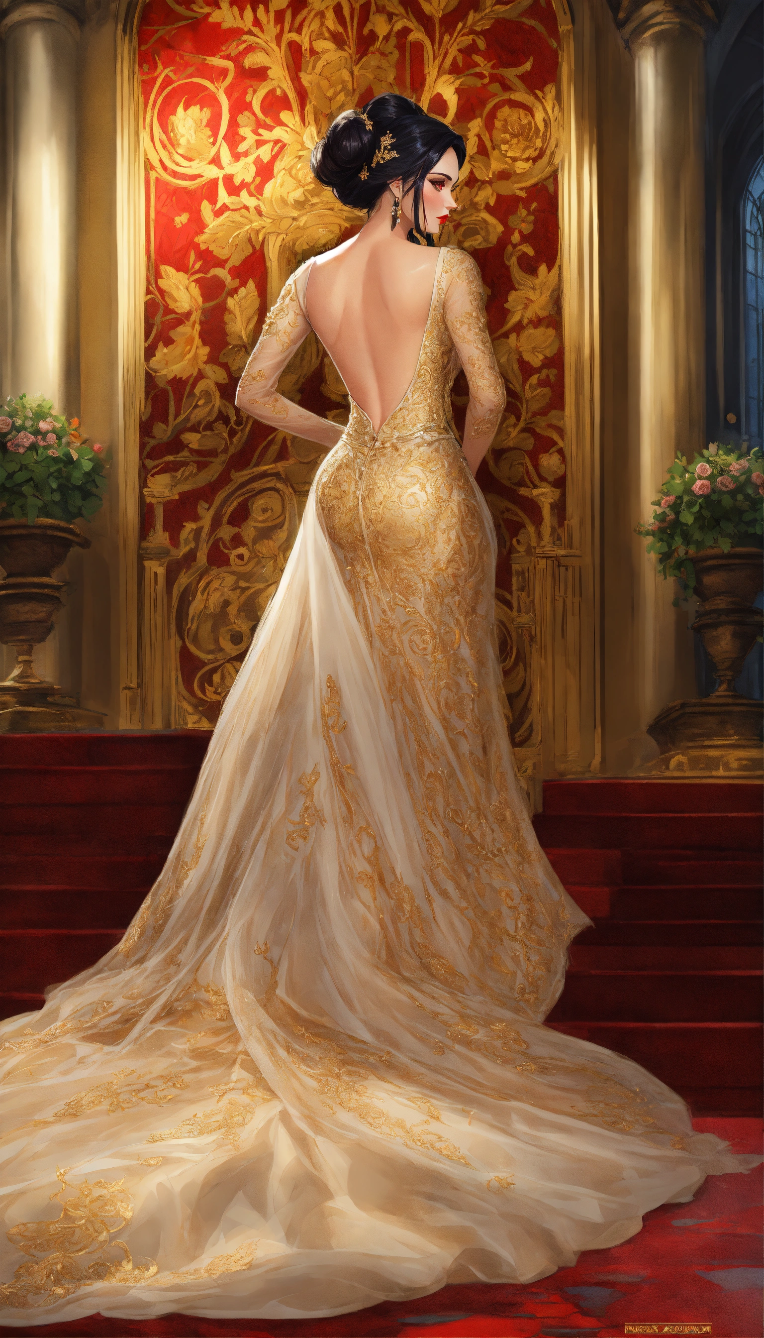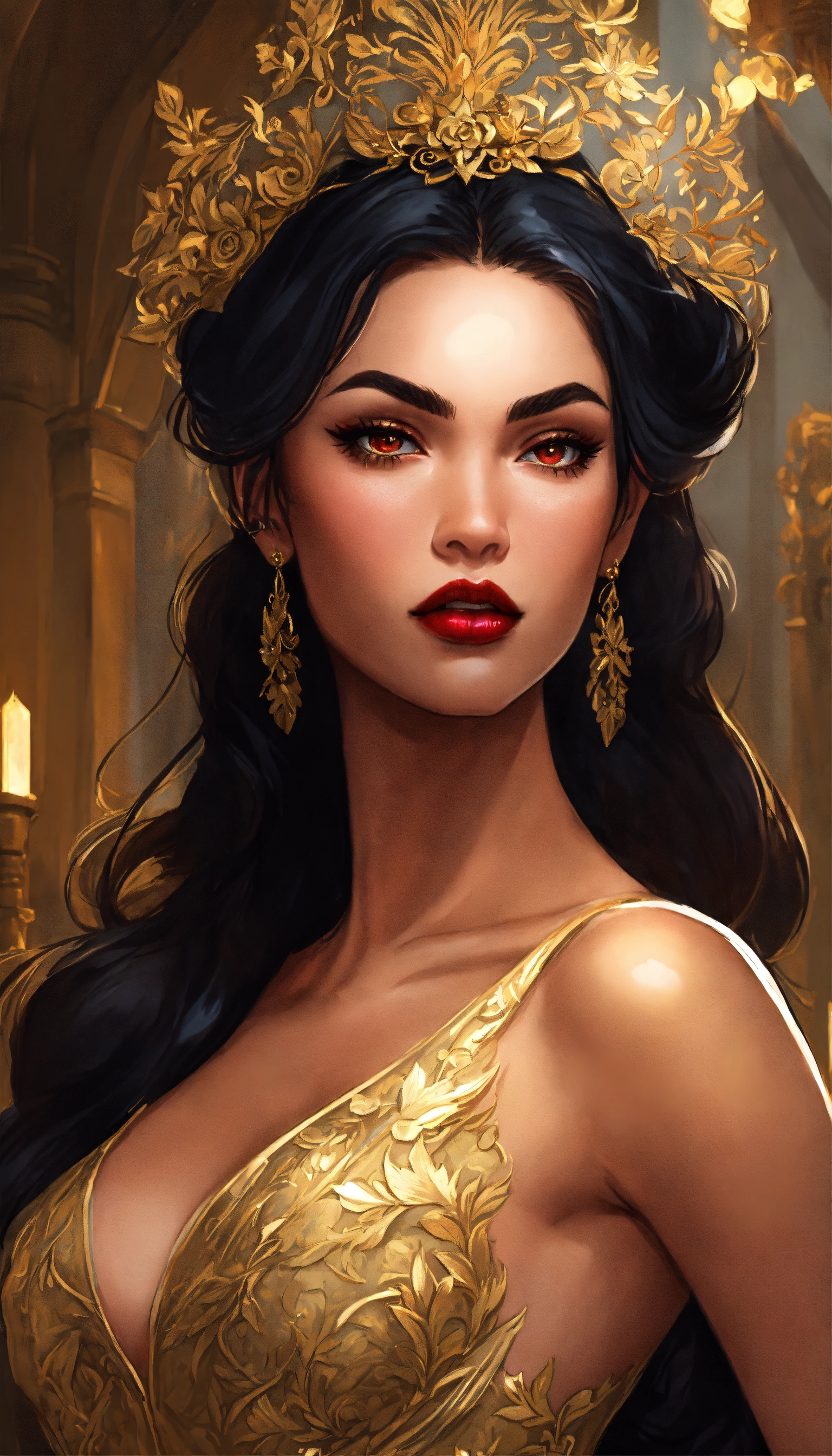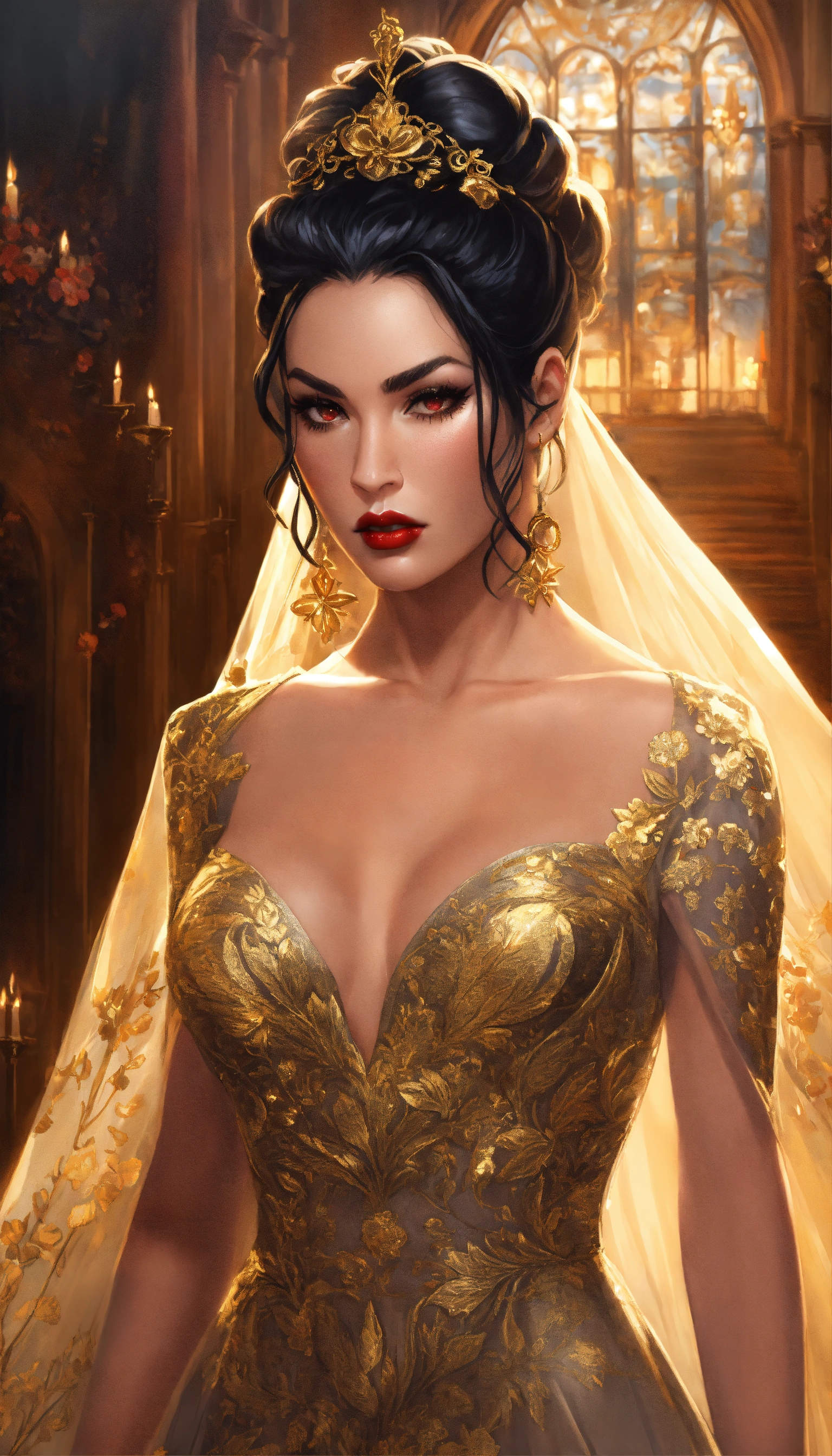 Concept art of ravenna, megan fox, glowing red eyes, curled voluminous flowing black hair in a formal wedding updo, hair in a bun, updo, bun, curled black hair tied up in a wedding bun, beautiful, tan skin, realistic, sabine rich, artgerm, j scott campbell, artgerm, perfect body, detailed, intricate, round face, slim nose, long black eyelashes, red lips, sharp jawline, perfect detailed face, realistic, floor length gold veil, full body view, evil dark sorceress, gloomy grey castle background, gloomy dark flowers forest castle, gold floor length fitted full skirts bridal gown, low cut neckline, gold high heels, voluminous curled long hair, gold train updo veil, gold wedding gown, very long transparent golden long veil and hair tied up, golden fitted bridal gown, big voluminous long train full skirt gown, forest, yennefer, zuhair murad bridal, zuhair murad bridal a line gown, gold textured silk shimmer fabric embroidered dress, gold long train wedding dress, walking down aisle, sleeves