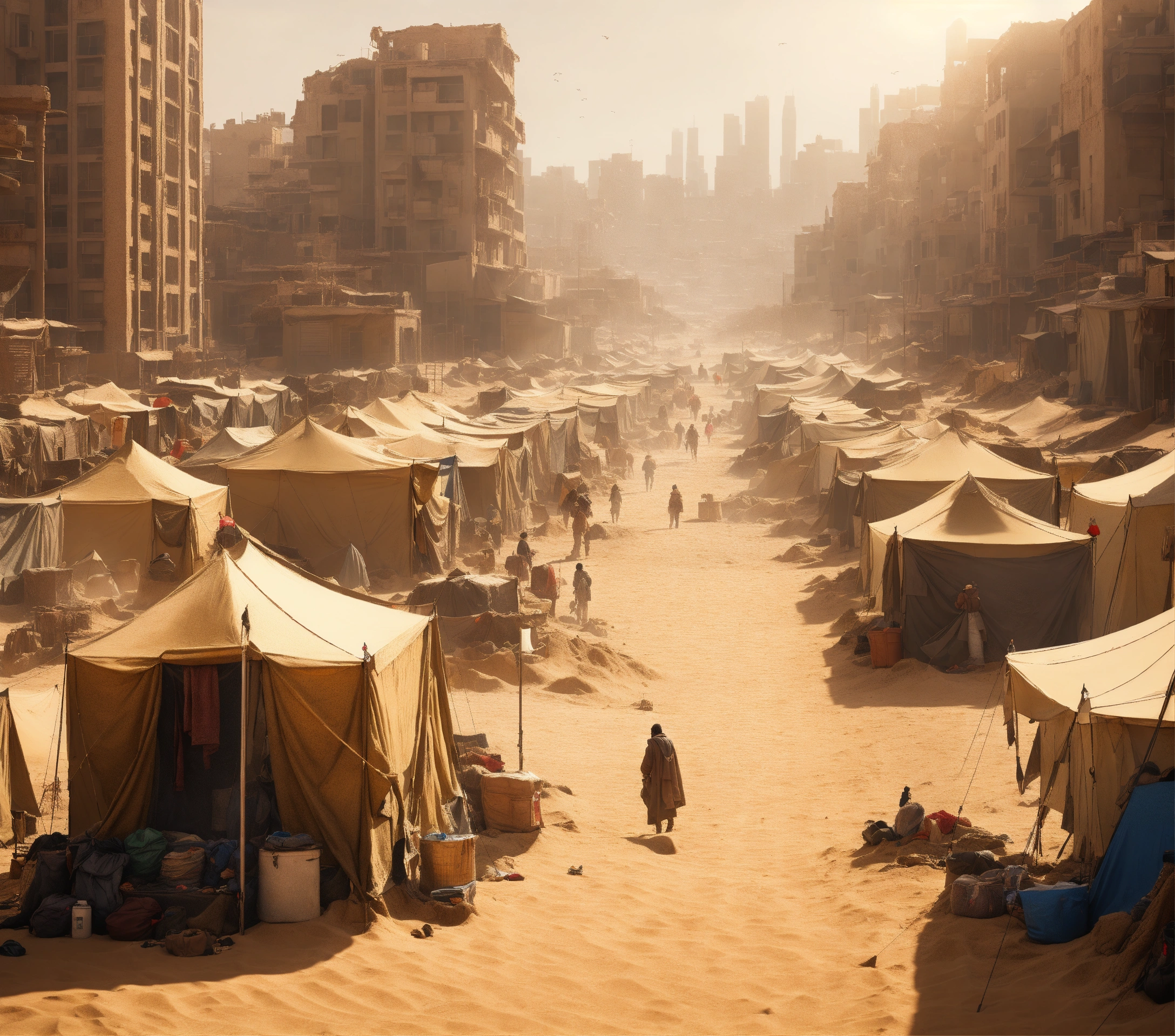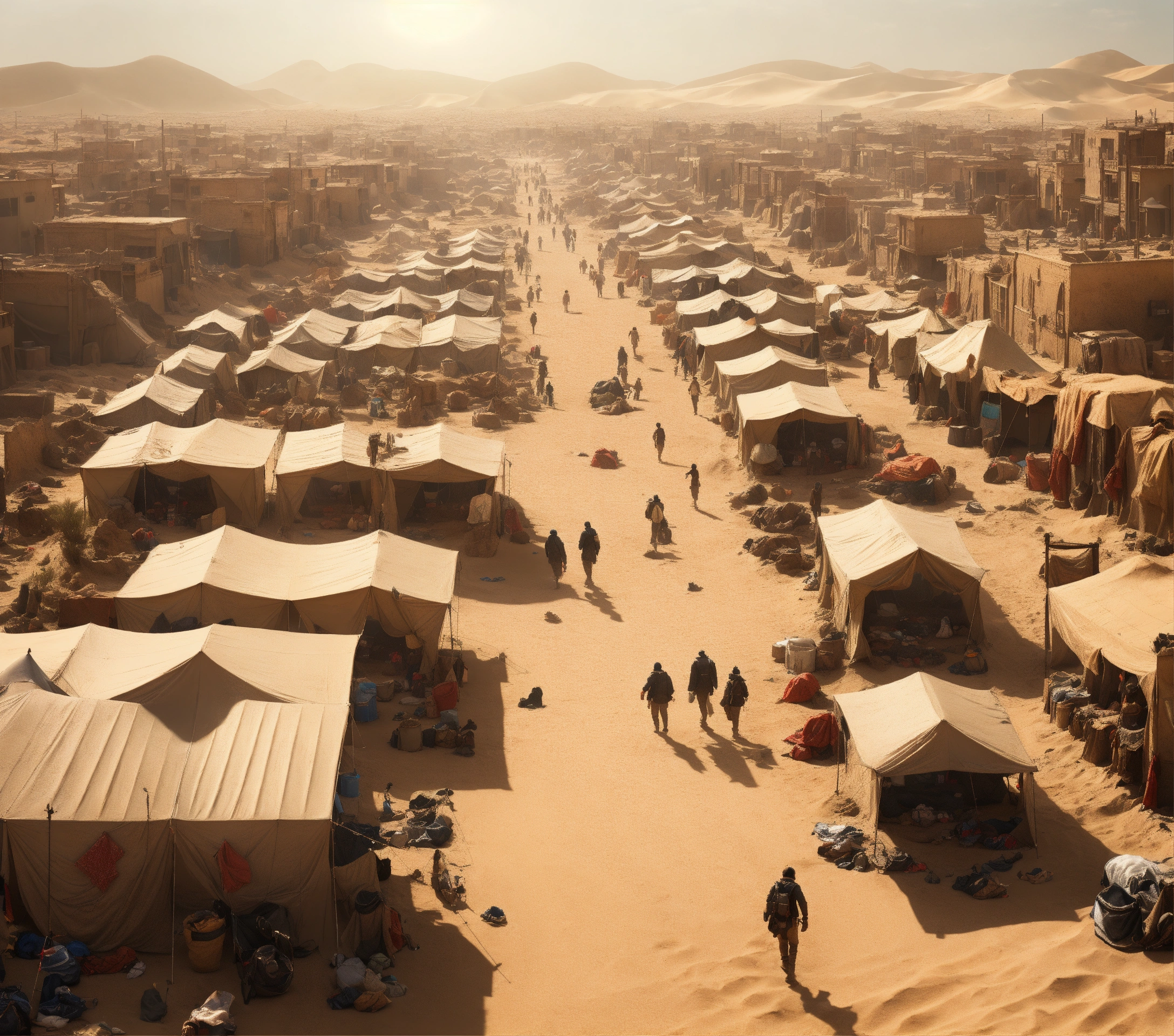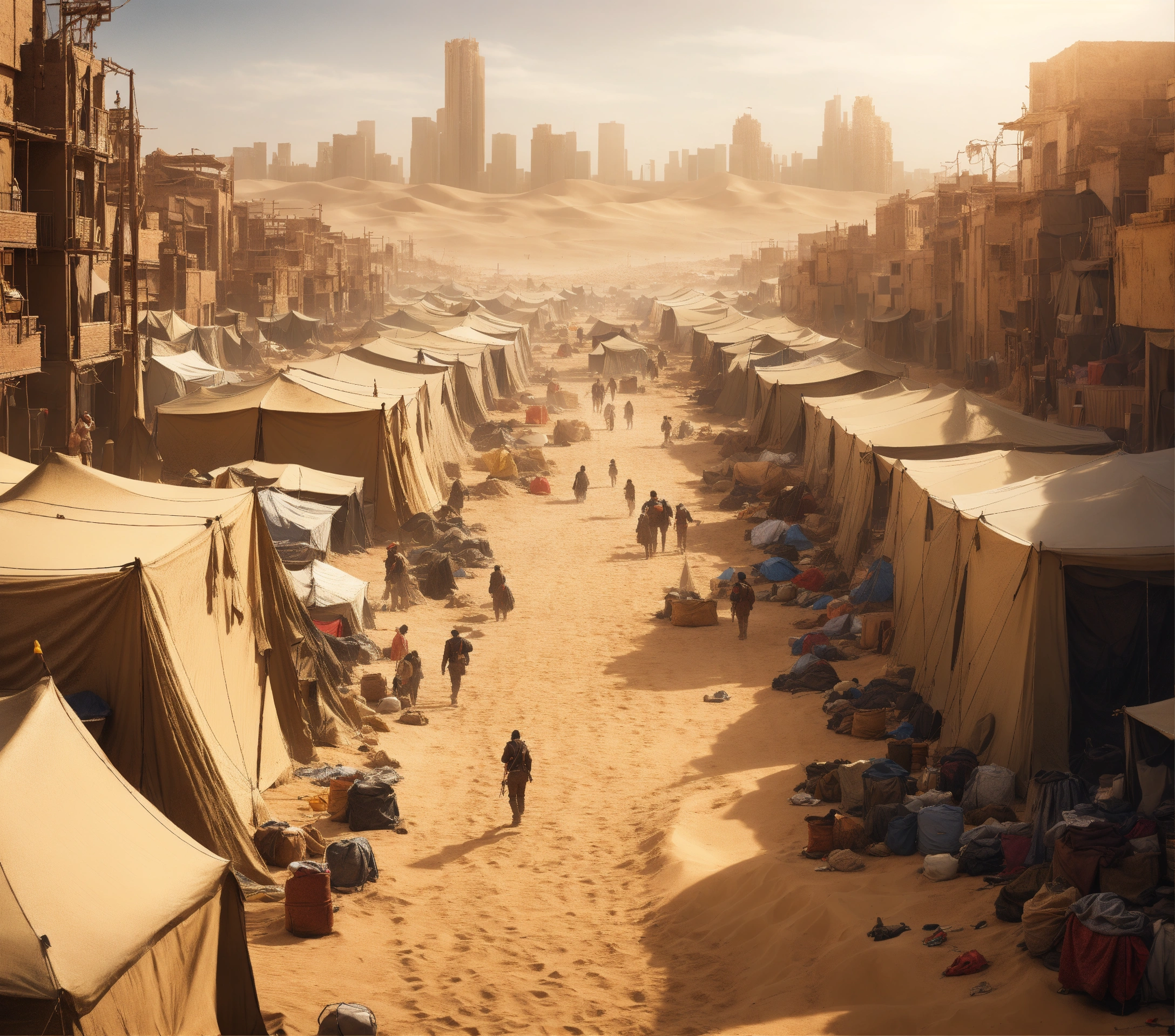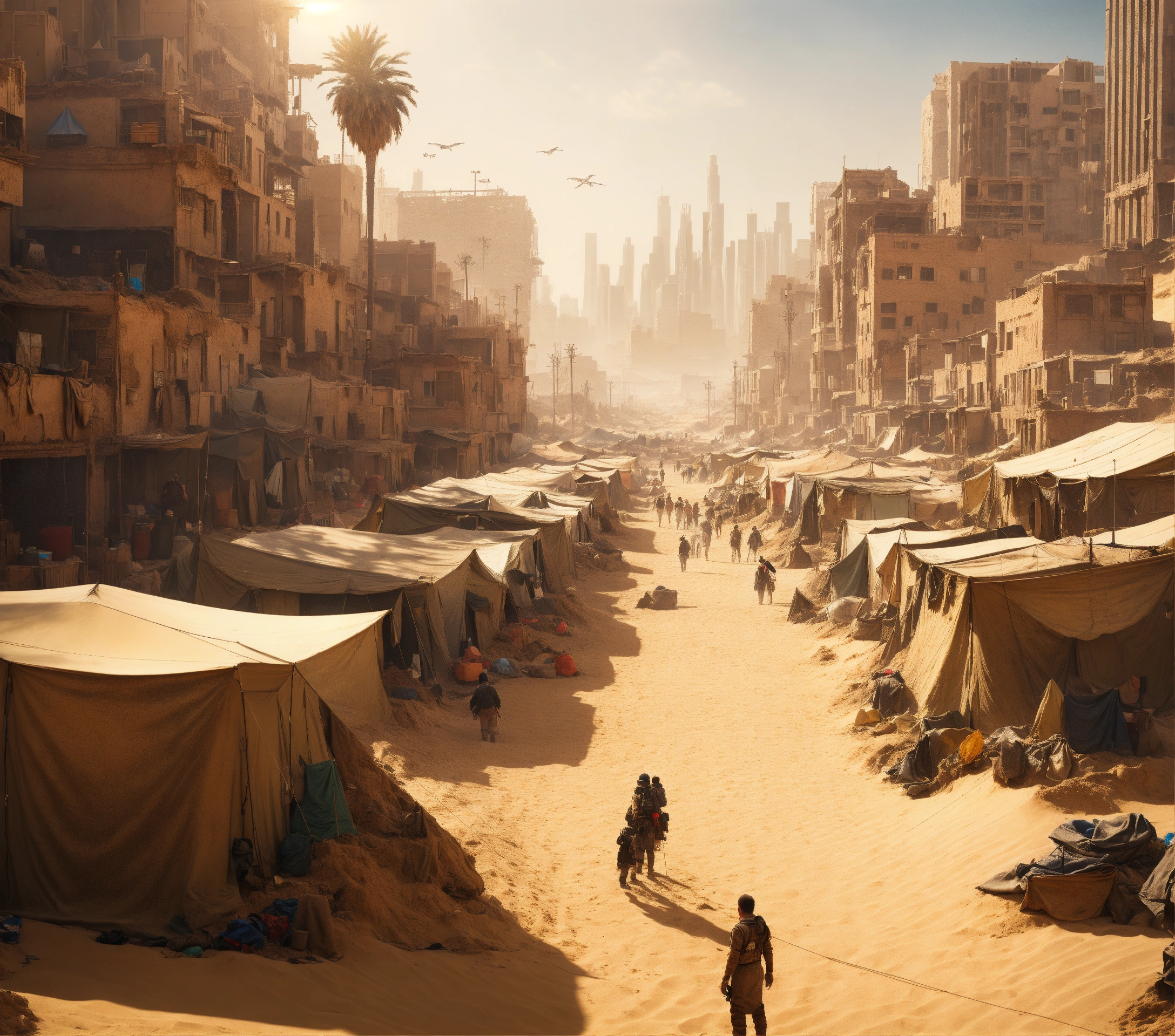 A highly detailed photo of a very very crowded city alley in a desert city covered with sand, with tents on the sides, and tall buildings covered with sand, sunny, covered with sand, post-apocalyptic, hyperrealistic, hyperdetailed, 4k