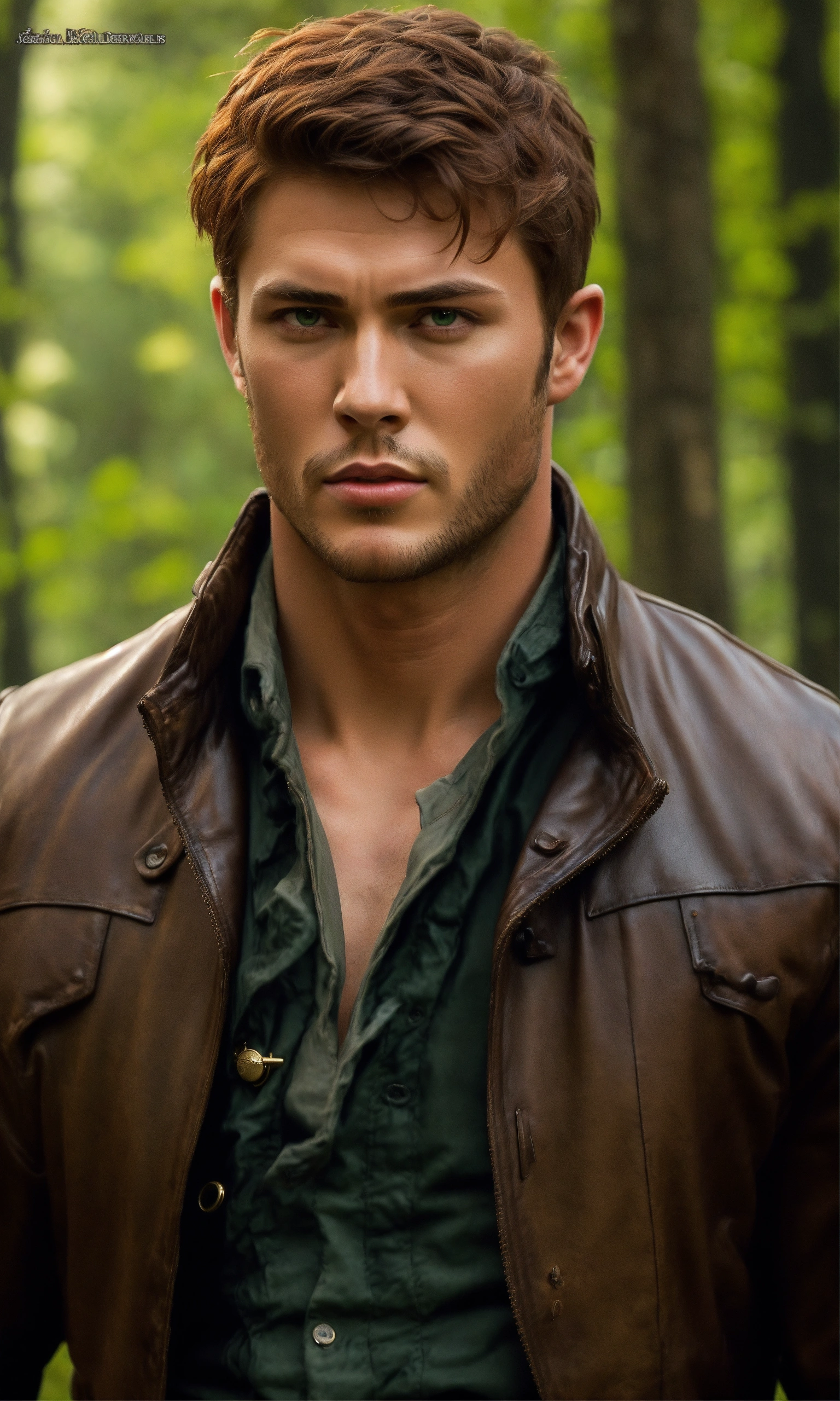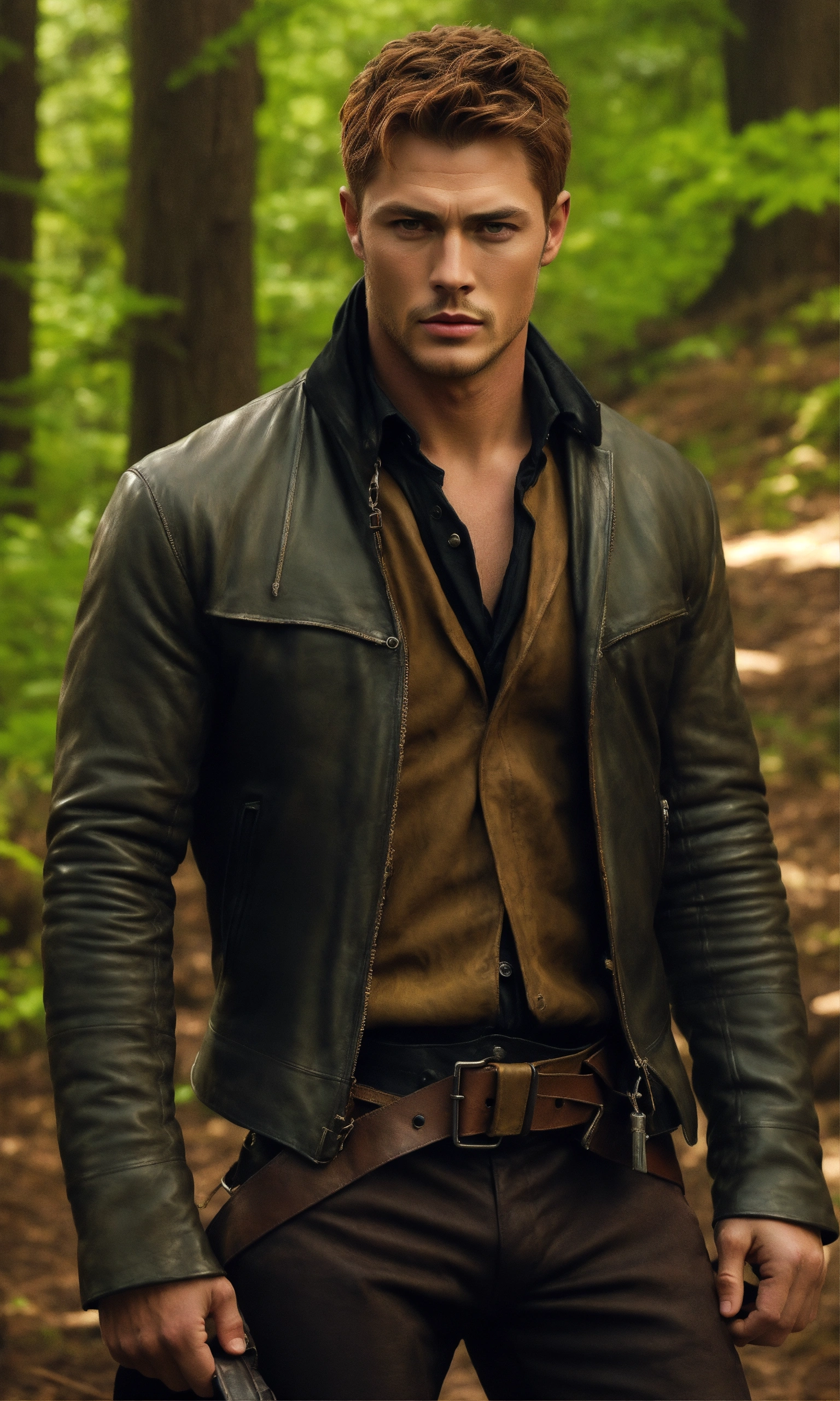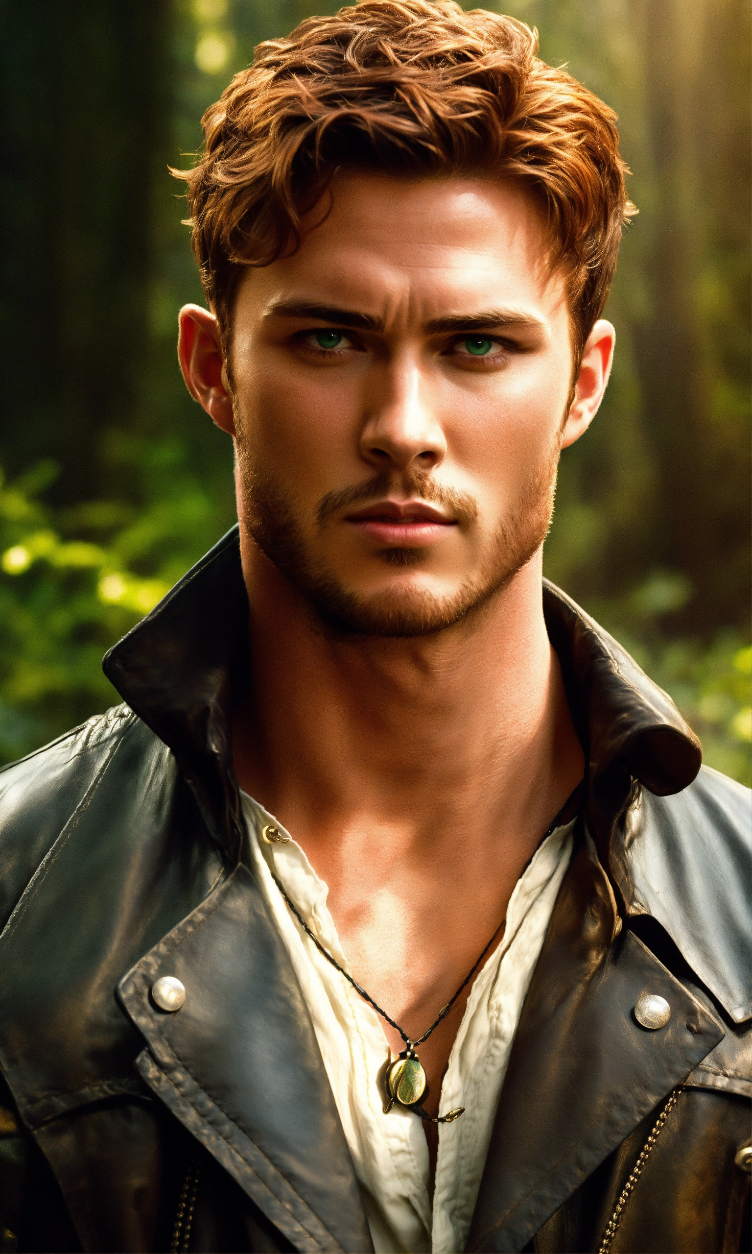 Concept art of handsome period man, poldark, poldark, megan fox, jamie fraser, outlander, period man in forest farm, short ginger red hair, very tan skin, hazel green eyes, jenson ackles, jenson ackles, realistic illustration, sabine rich, artgerm, j scott campbell, perfect body, sharp facial features, slim thin nose, perfect full lips, sharp jawline, sharp high cheekbones, dark black long weathered leather jacket, perfect detailed face, cinematic, full body, full body outfit view, flower forest cottage background, full body, fitted black weathered pants, tight fitted knee high boots, detailed, realistic illustration, colonial american, dean winchester, short straight hair, dean winchester, short buzz cut hair, black fitted shirt, dean winchester's leather jacket, hyper realistic, dark weathered clothes, dark fabric, jenson ackles, buzz cut, straight hair, period, straight hair, dark clothes, black pants, green eyes, black long leather jacket, pendant necklace, tiny pendant necklace