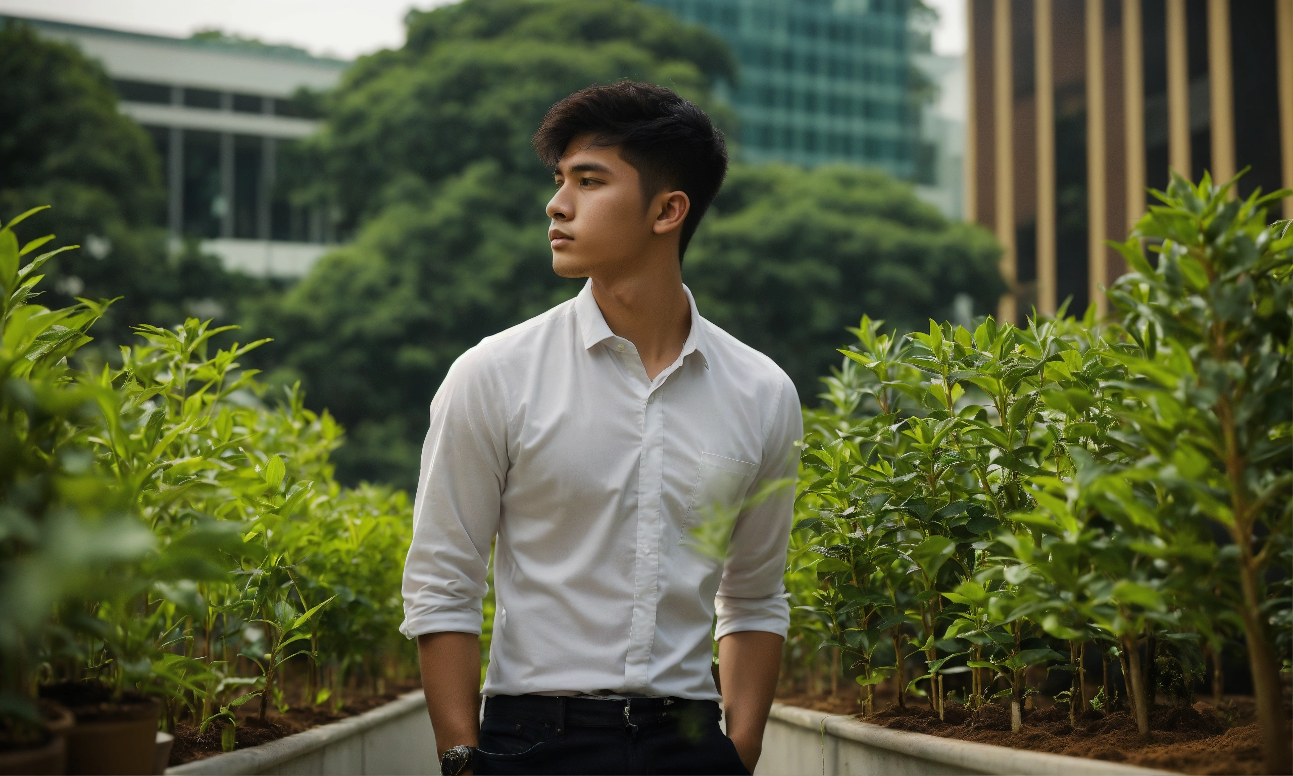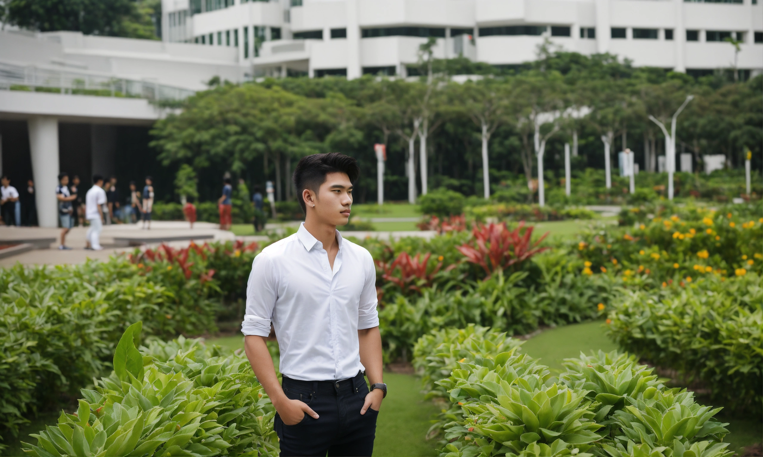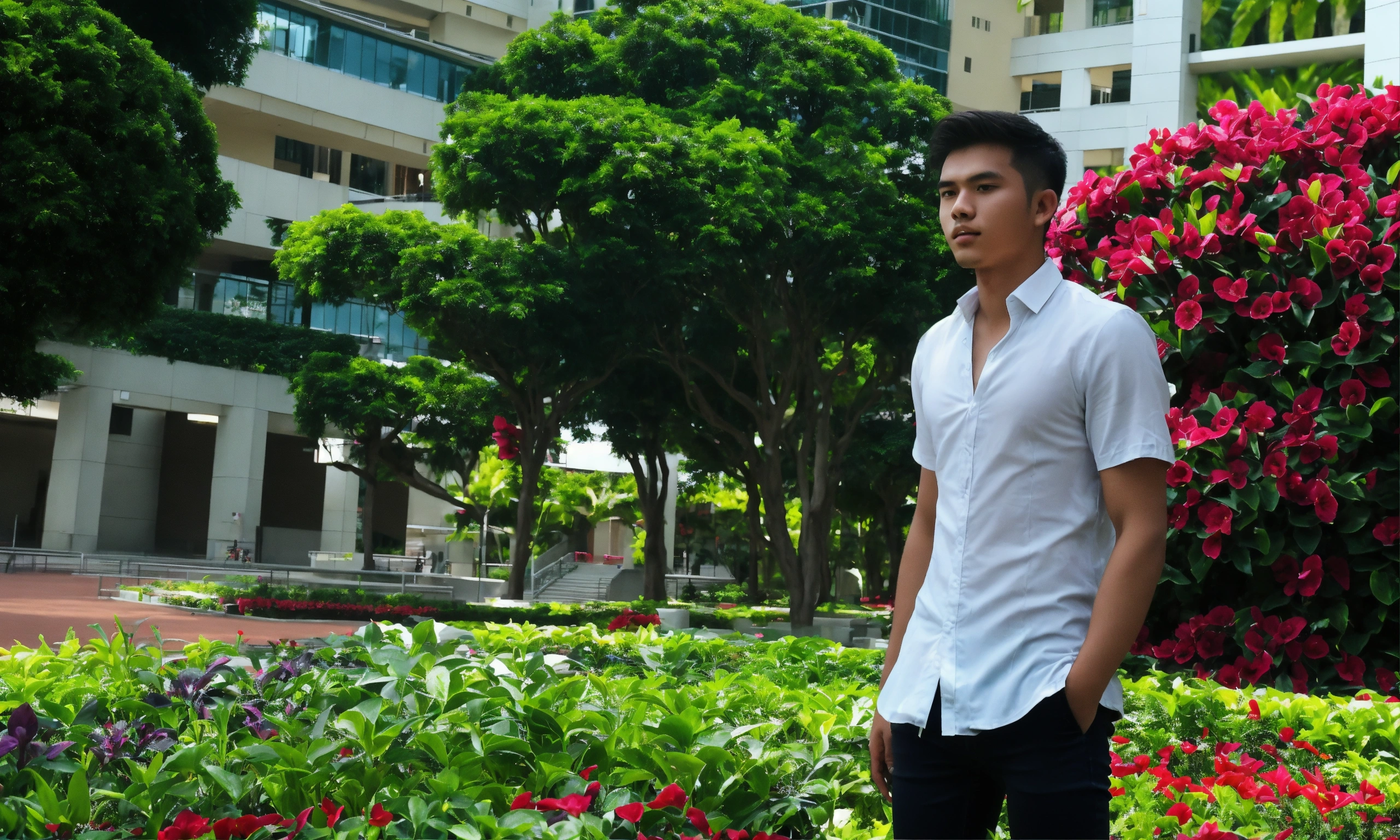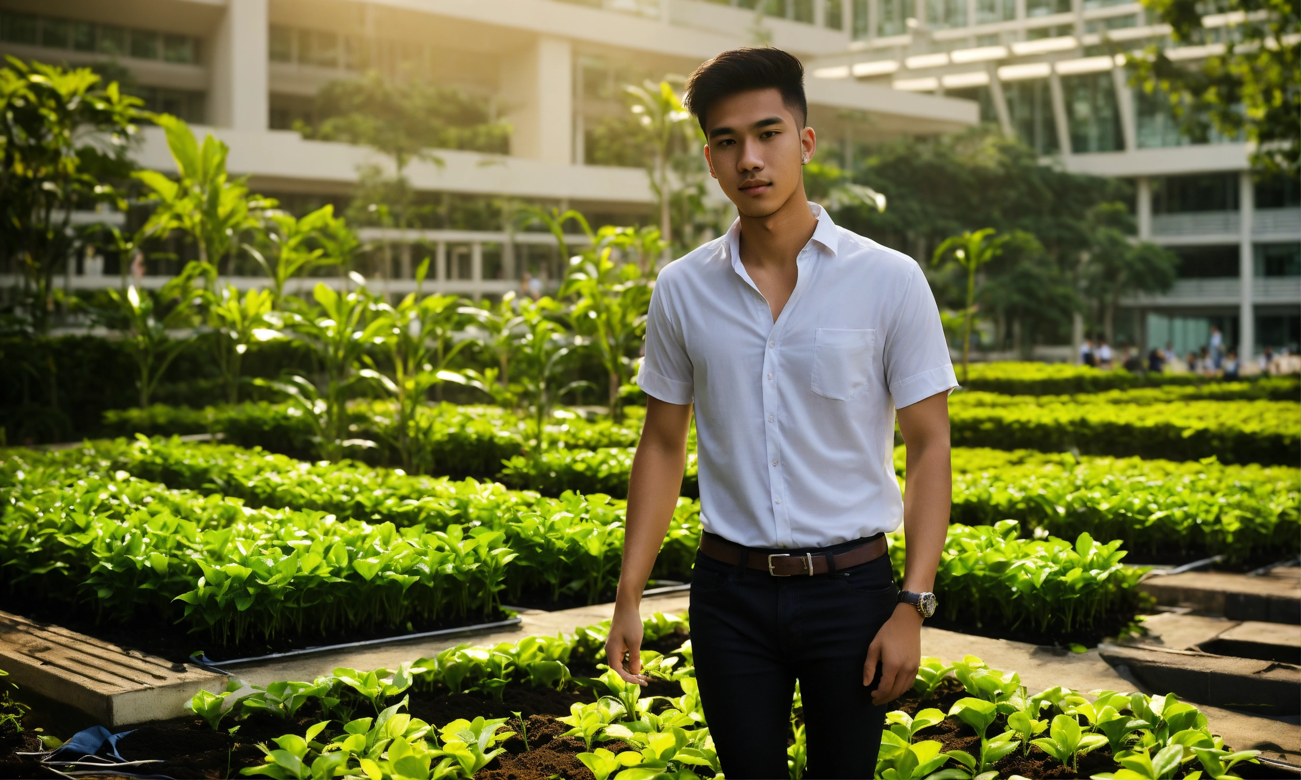 A 21 year old handsome man, in a long white shirt, black jeans, against the background of singapore management university as the background, there are other students there as well. he just stood up from planting plants. looking down at plants hands on his hips. he's not looking at the camera.