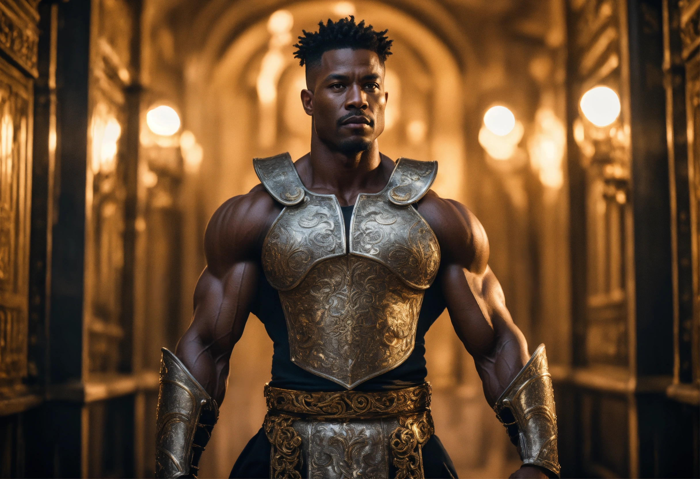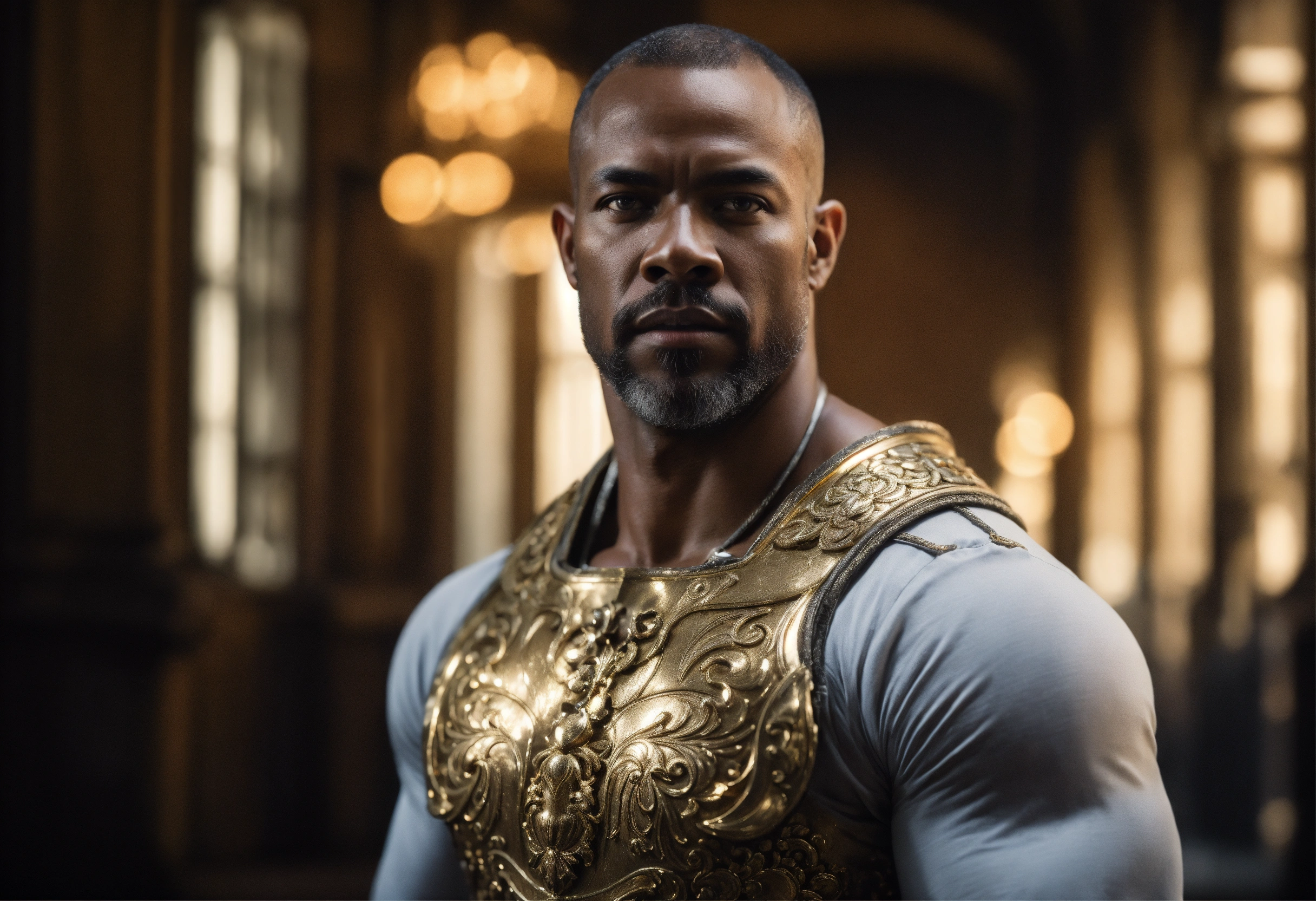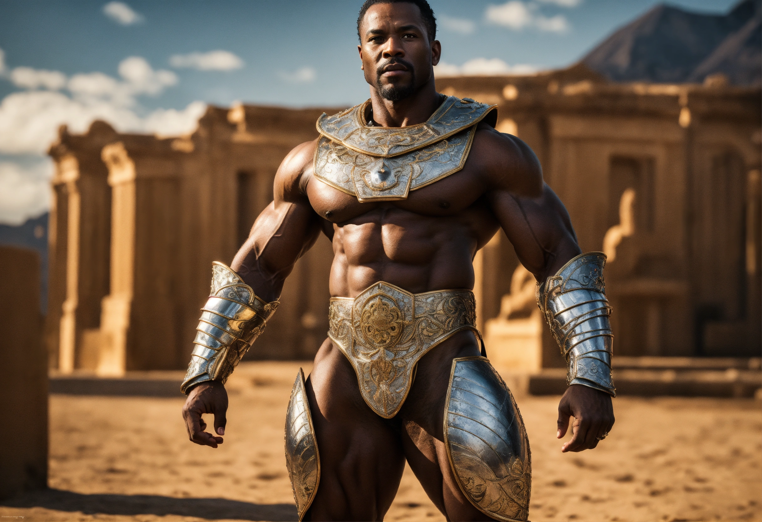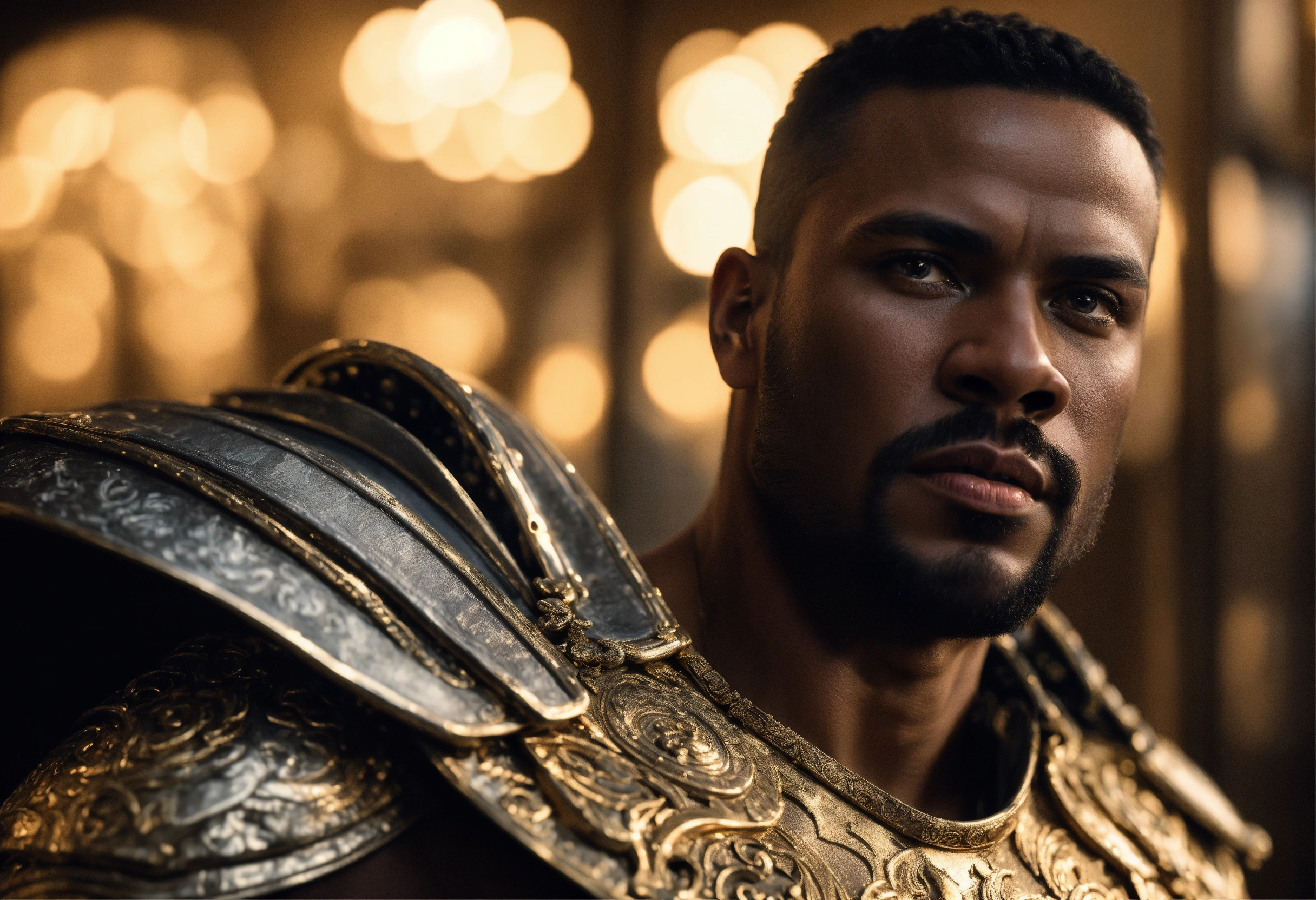 Full body shot of a stunningly beautiful middle age black warrior in soft light, mister olympia anatomy, broad muscle legs, big delts, ripped, intricate, elegant, depth of field, zeiss lens, detailed, symmetrical, centered, fashion photoshoot, by annie leibovitz and steve mccurry, david lazar, jimmy nelsson, breathtaking, 8 k resolution, extremely detailed, beautiful, establishing shot, artistic, hyperrealistic, beautiful face, octane render, in ornate silver and gold armor