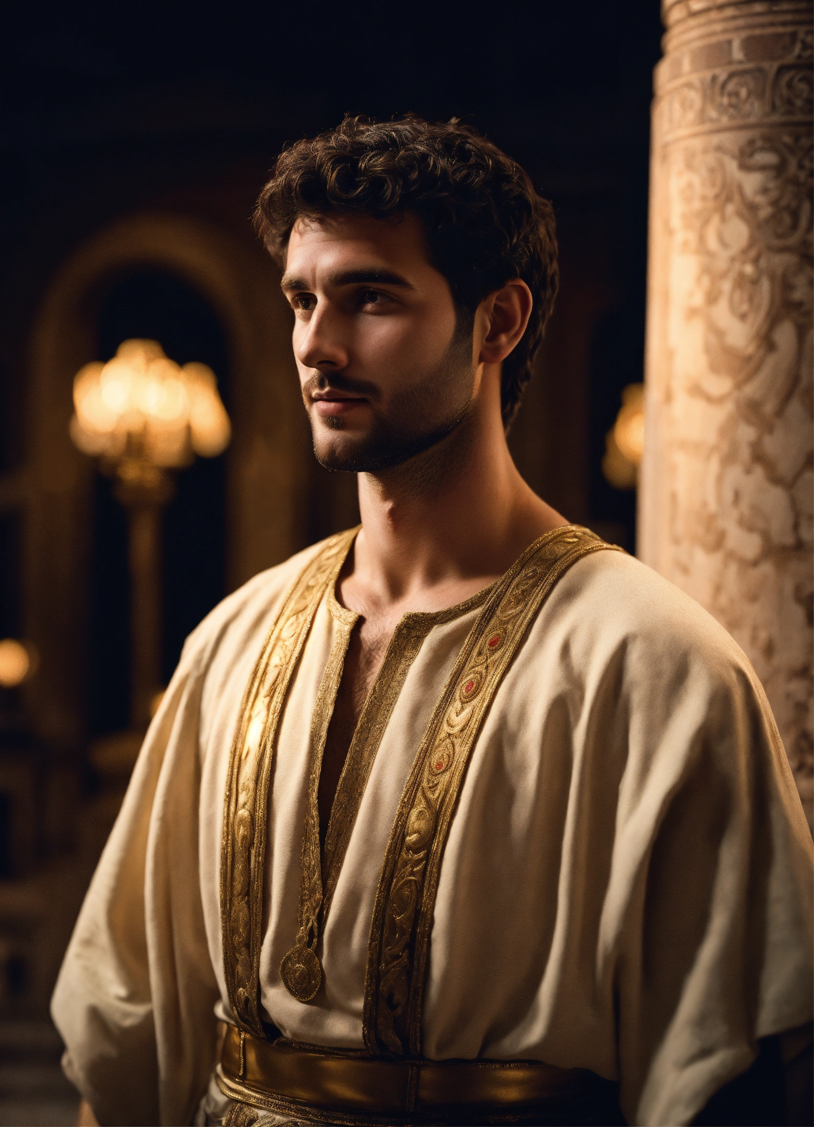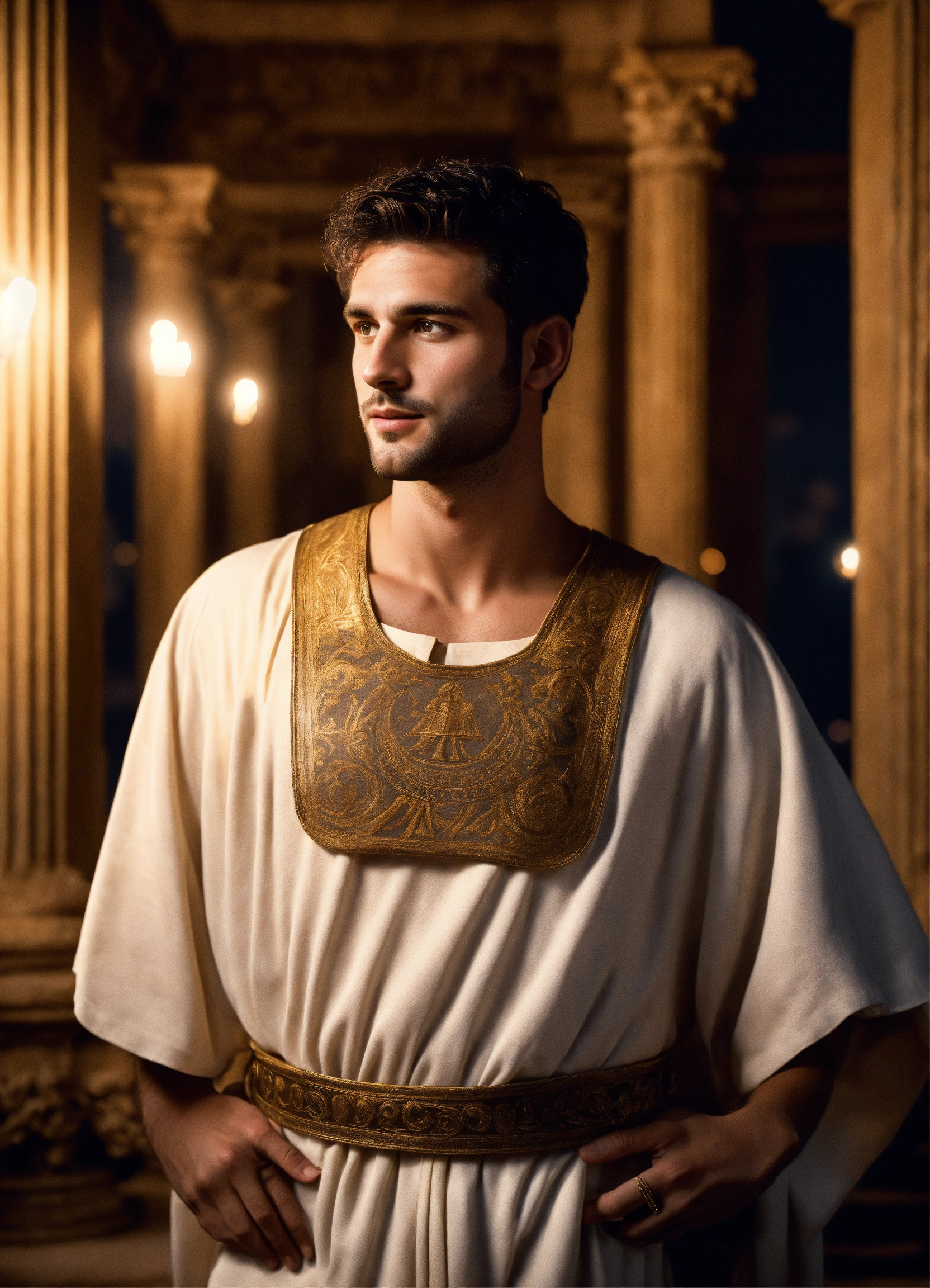 A young rich noble handsome roman man wearing a light-colored tunic, smart, solemn, amused, 30 years old, charismatic, ancient rome, in his luxurious pompeian villa with a detailed colored decor, photorealistic, hyperdetailed, 8k, clean-shaved face, at night, glamorous lights