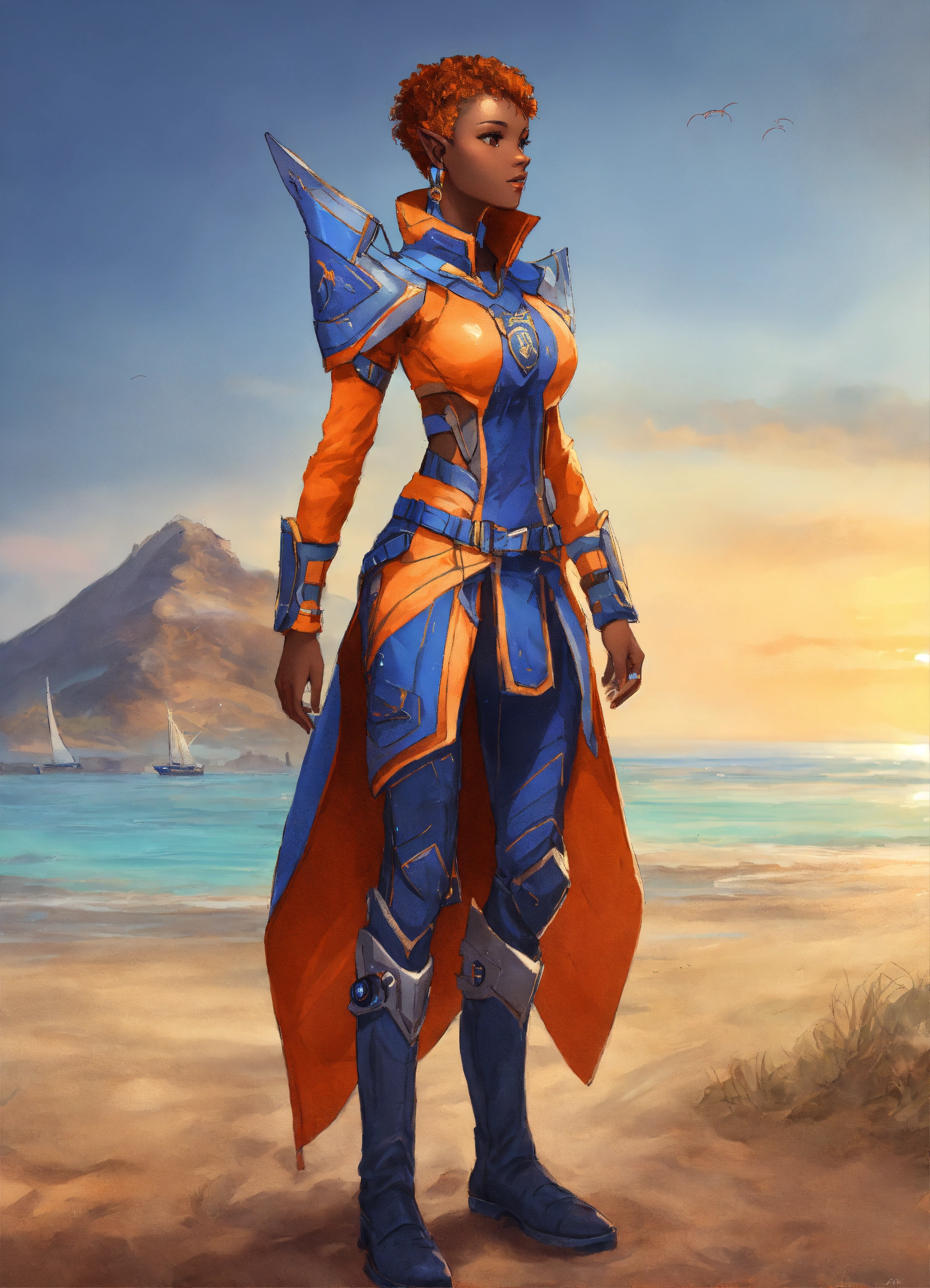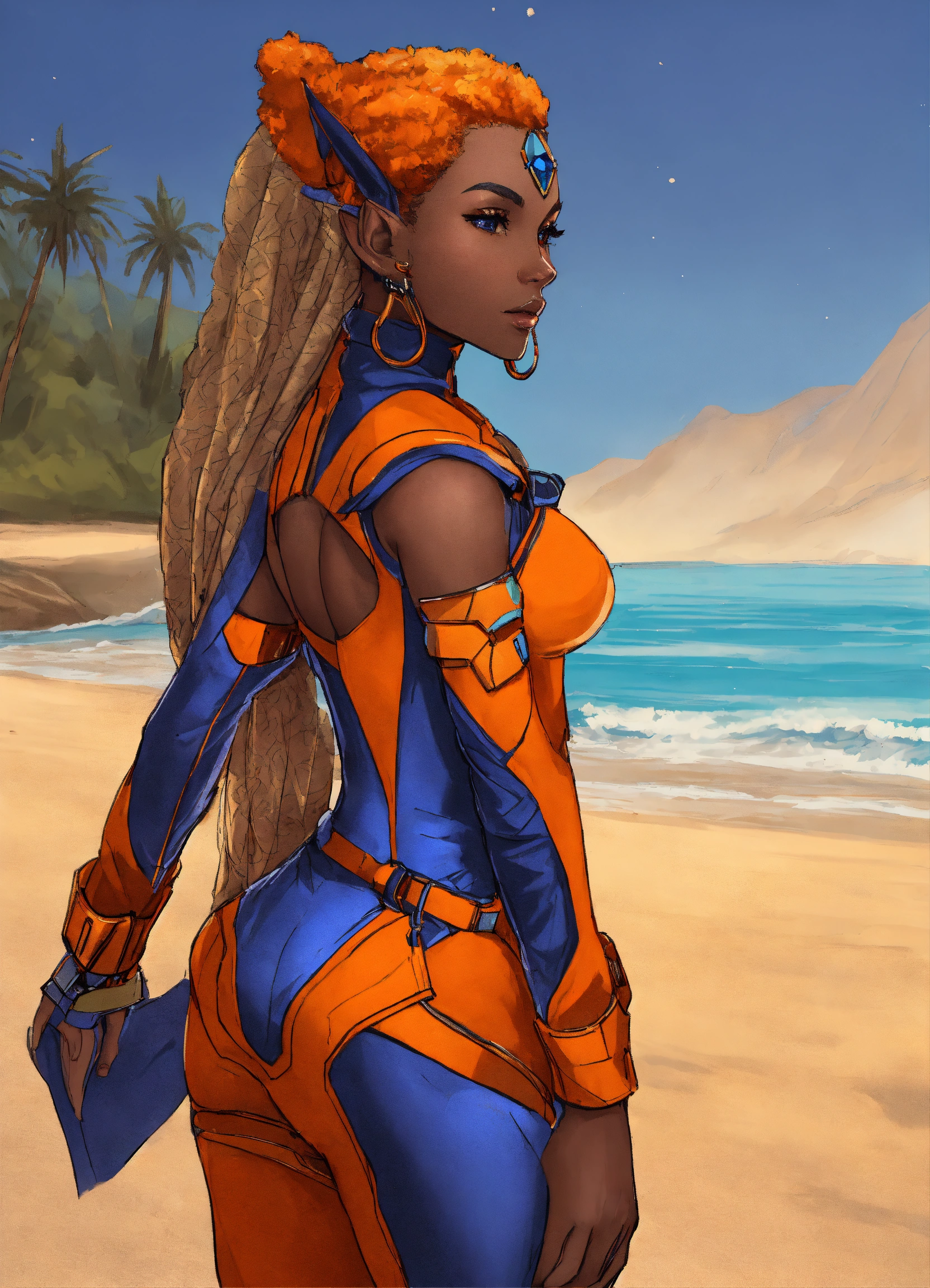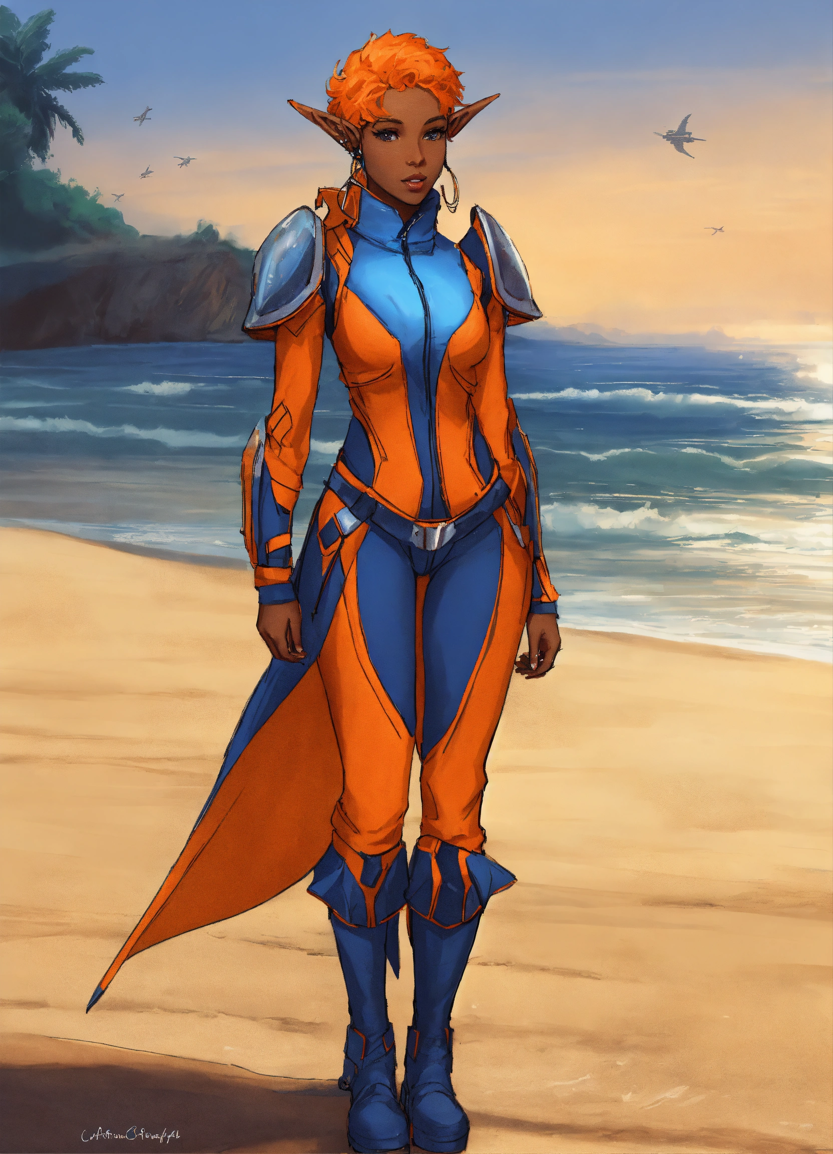 Drawing of an elf, royalty, sci fi, cybernetic, orange and navy blue royal sci fi outfit and boots, african elf, standing on a beach, beautiful, female elf, 24 years old
