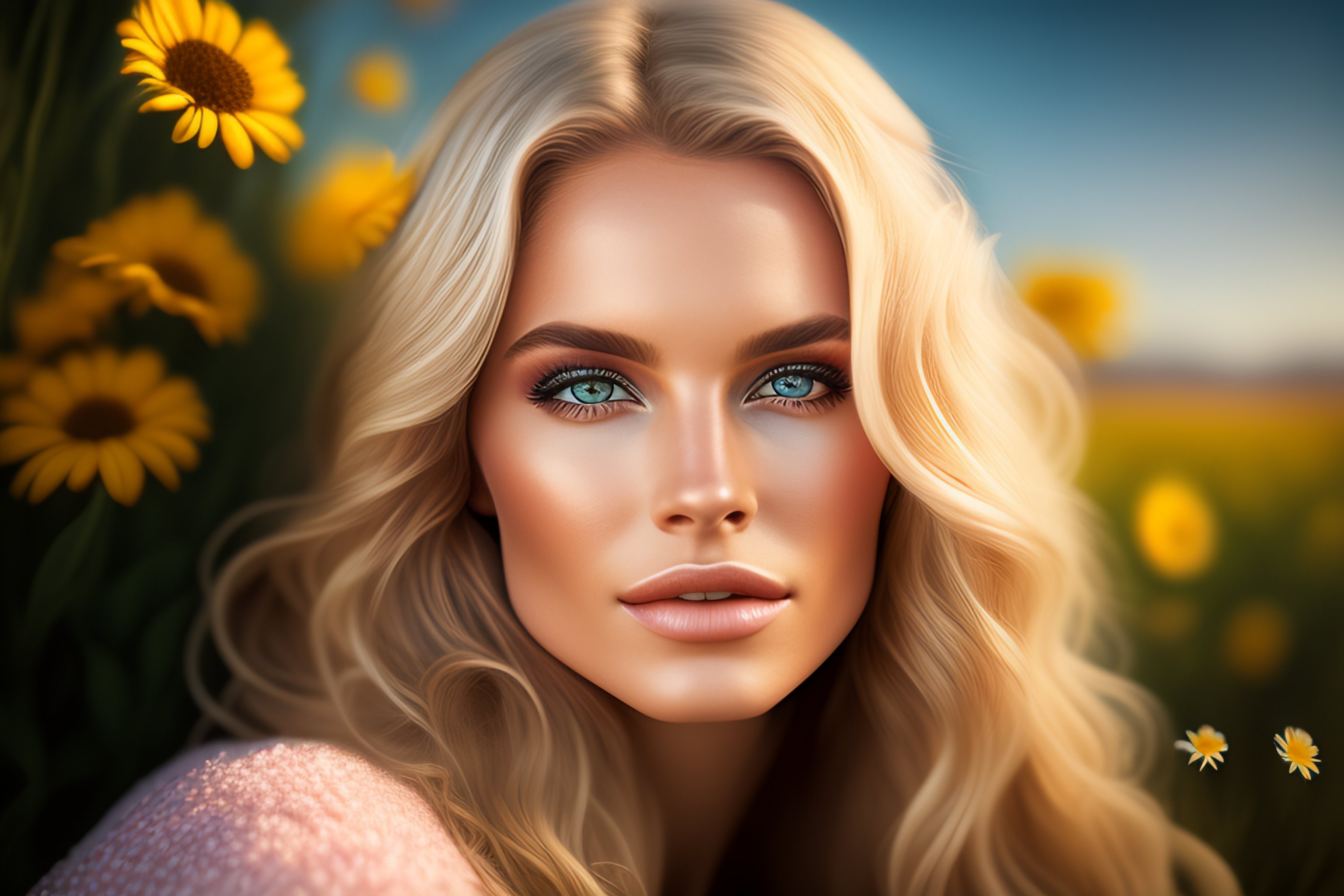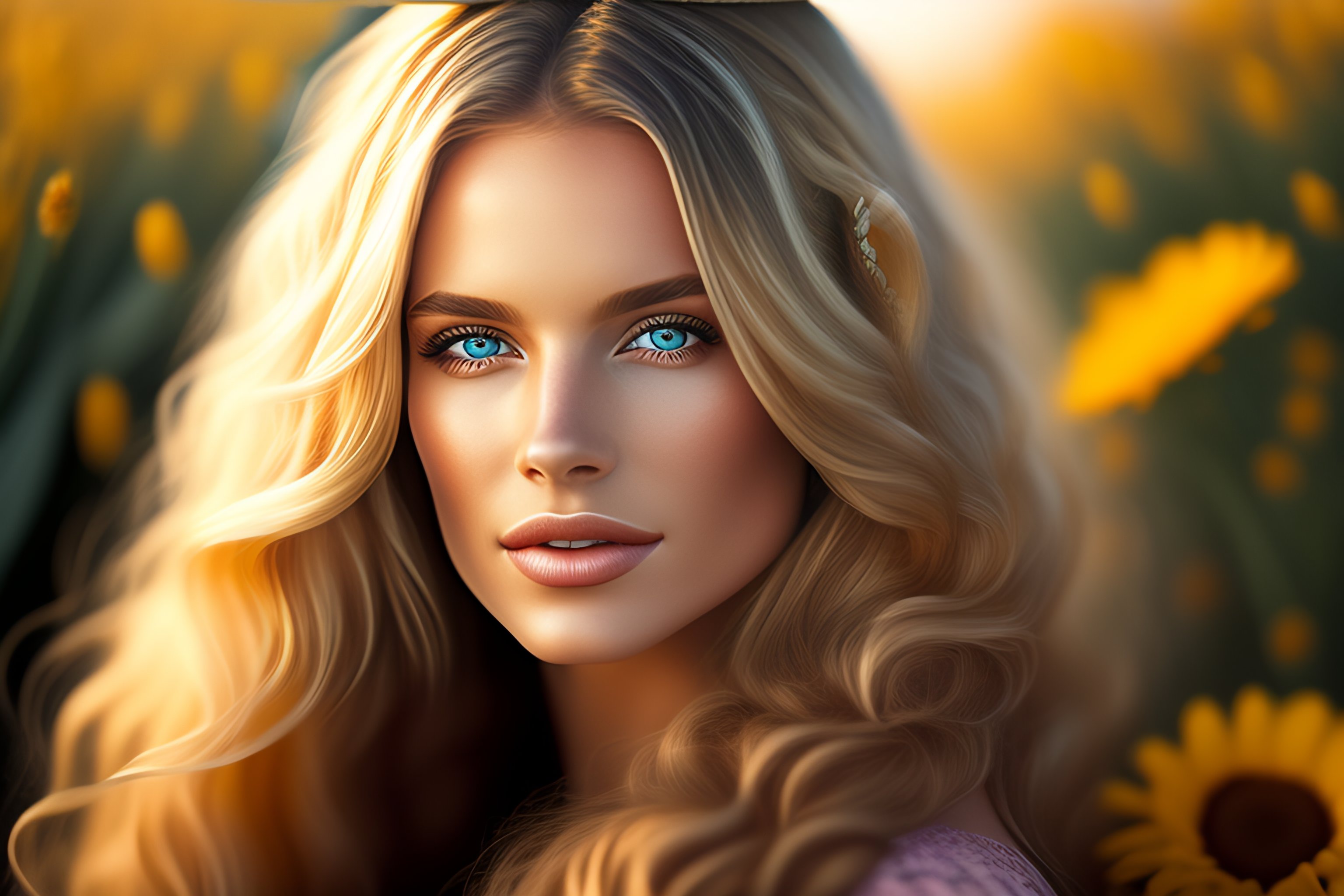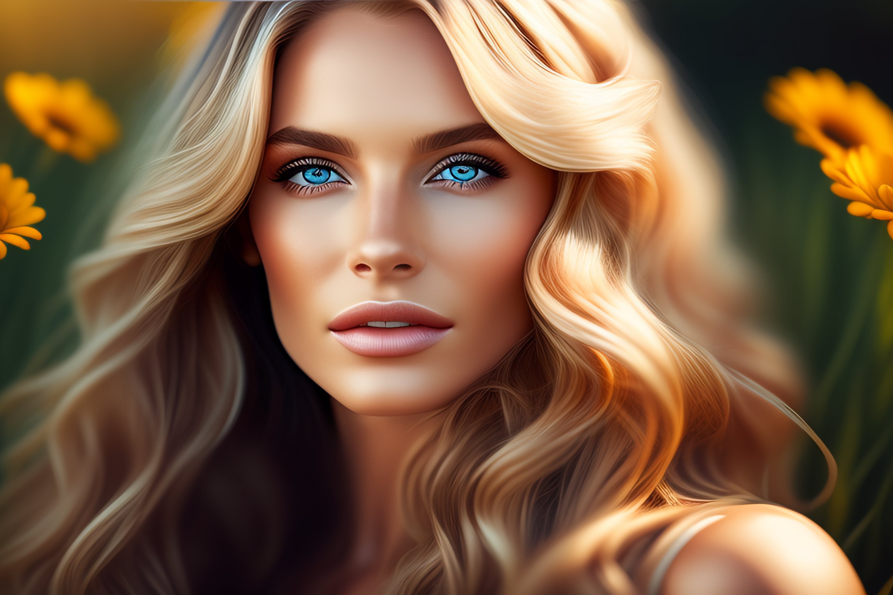 Photorealistic beautiful woman, full body, highly detailed, long wavy, blond hair with daisy flowers, big brown eyes, bokeh background, portrait --ar 9:16 --testp