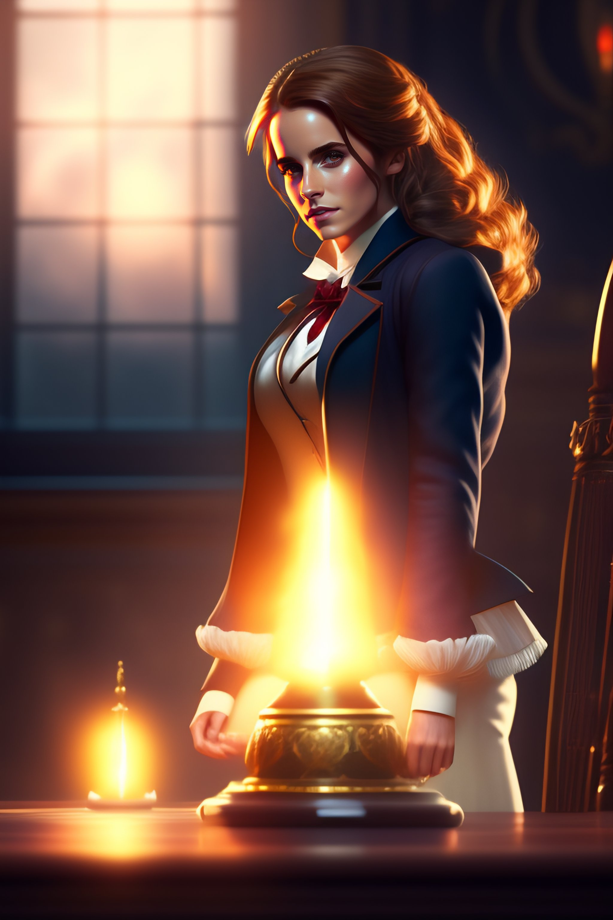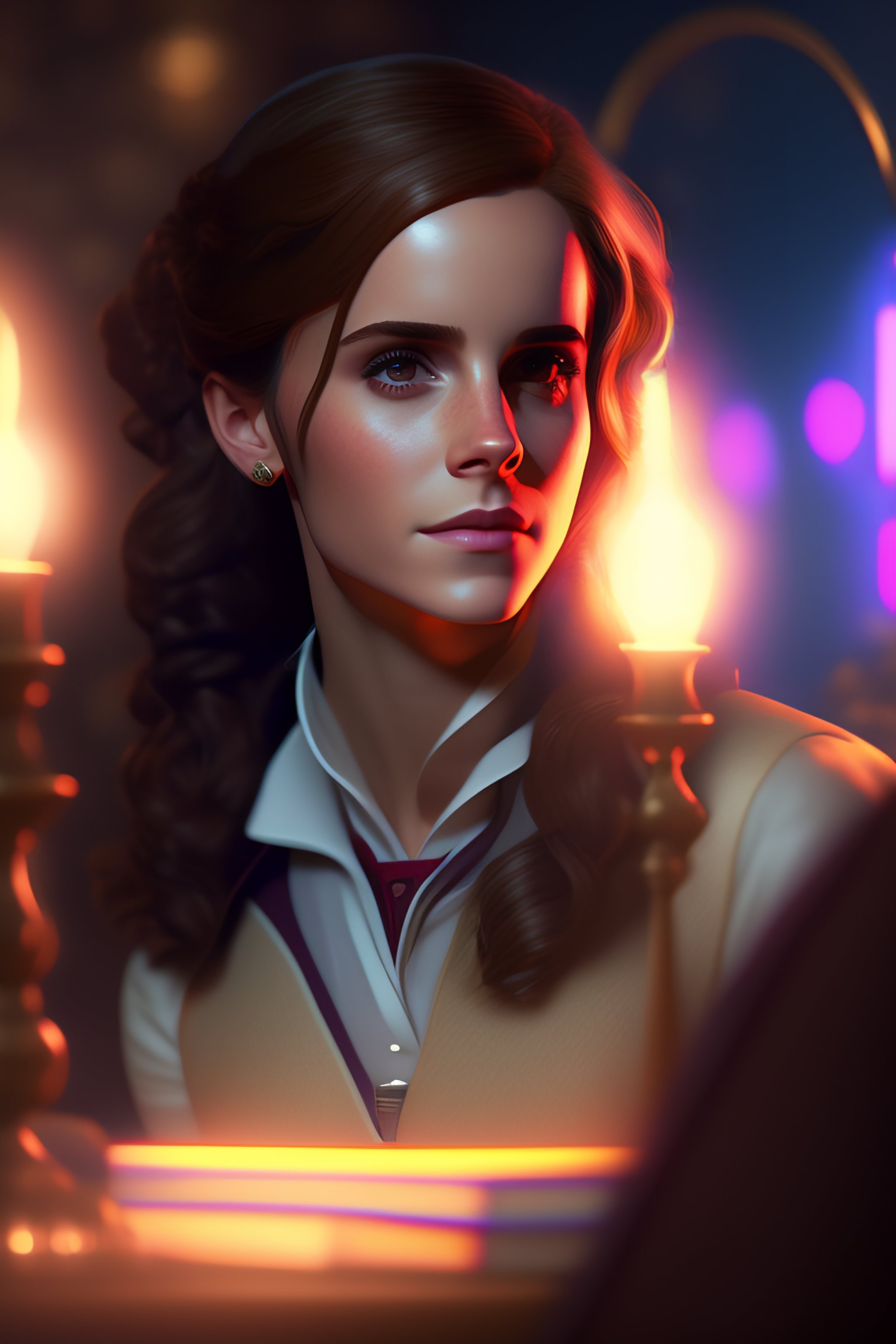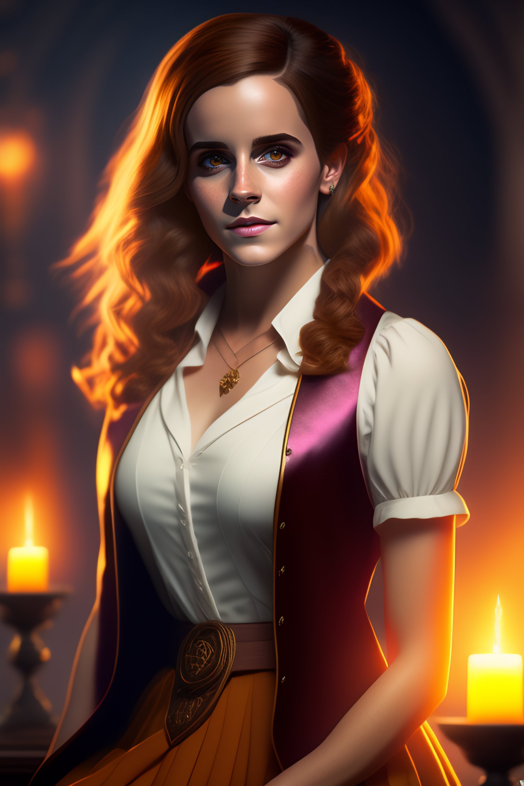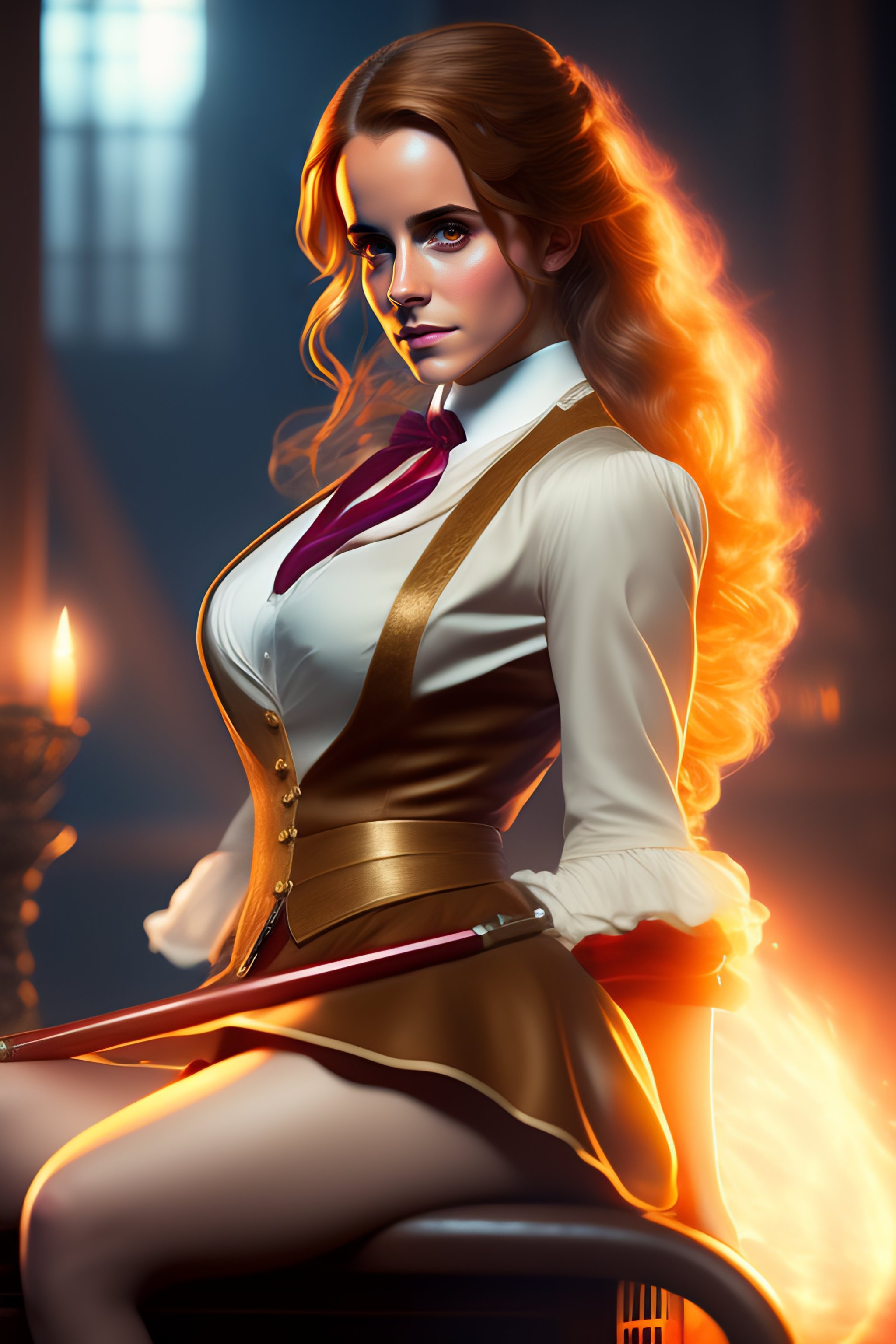 Emma watson cosplaying as hermione granger in a sexy hogwart's school uniform wearing a short skirt while sitting on a chair leaning back and balancing with her active wand in hand, by award winning digital artists, 8k resolution, hd, concept art portrait by greg rutkowski, artgerm, wlop, alphonse mucha dynamic lighting hyperdetailed intricately detailed splash art trending on artstation triadic colors unreal engine 5 volumetric lighting"