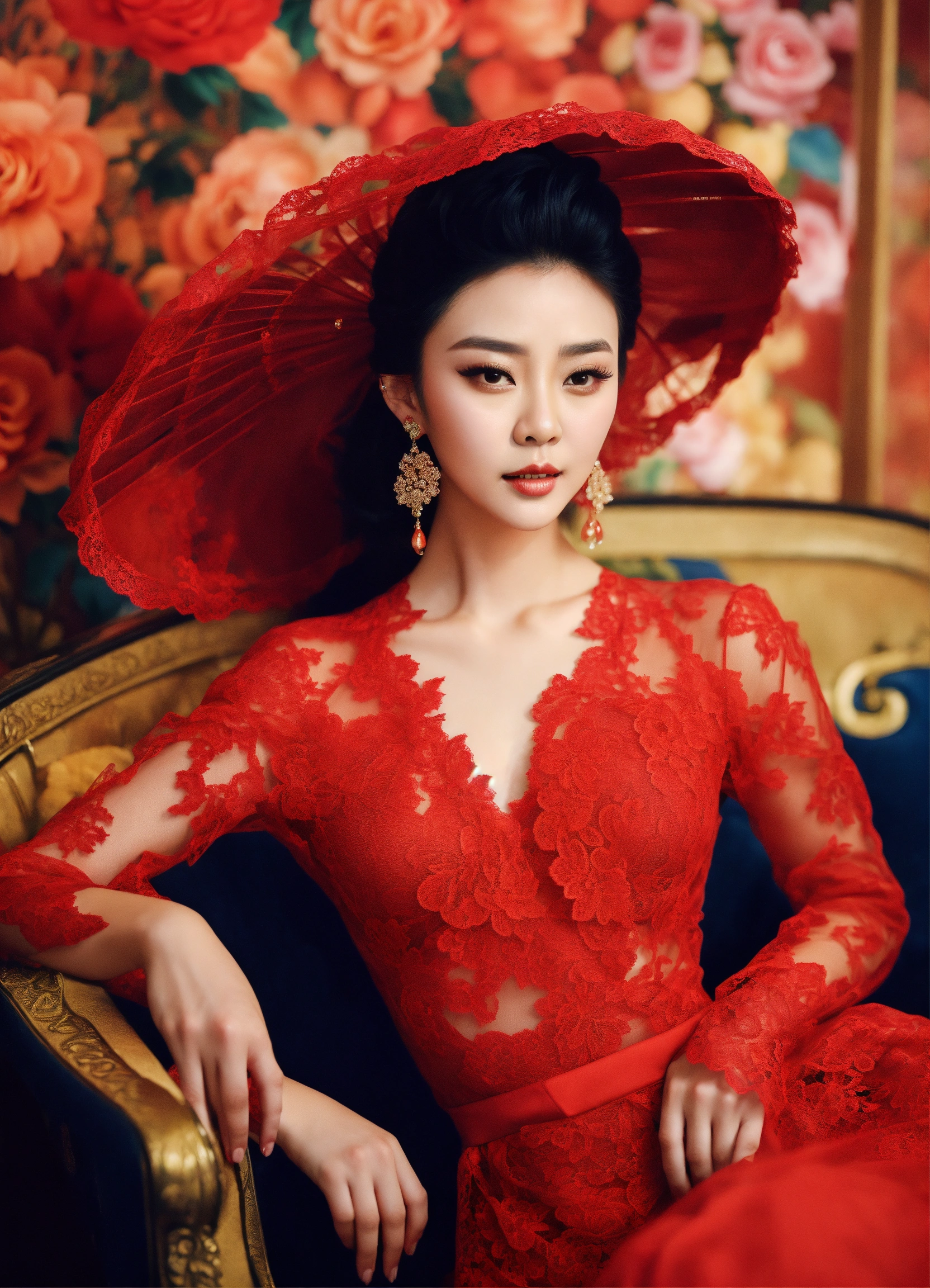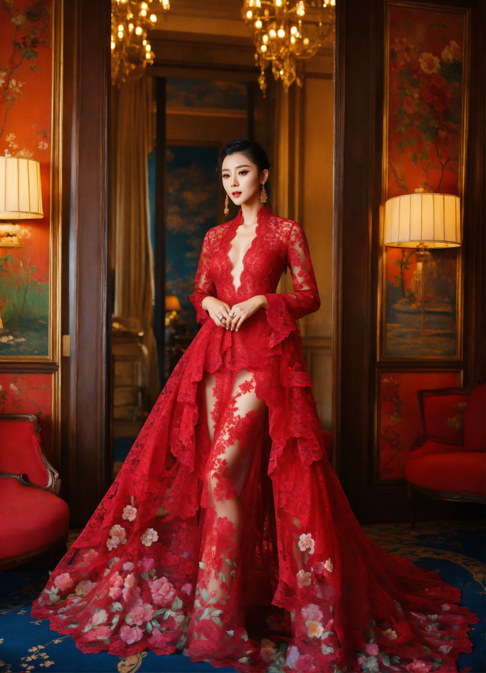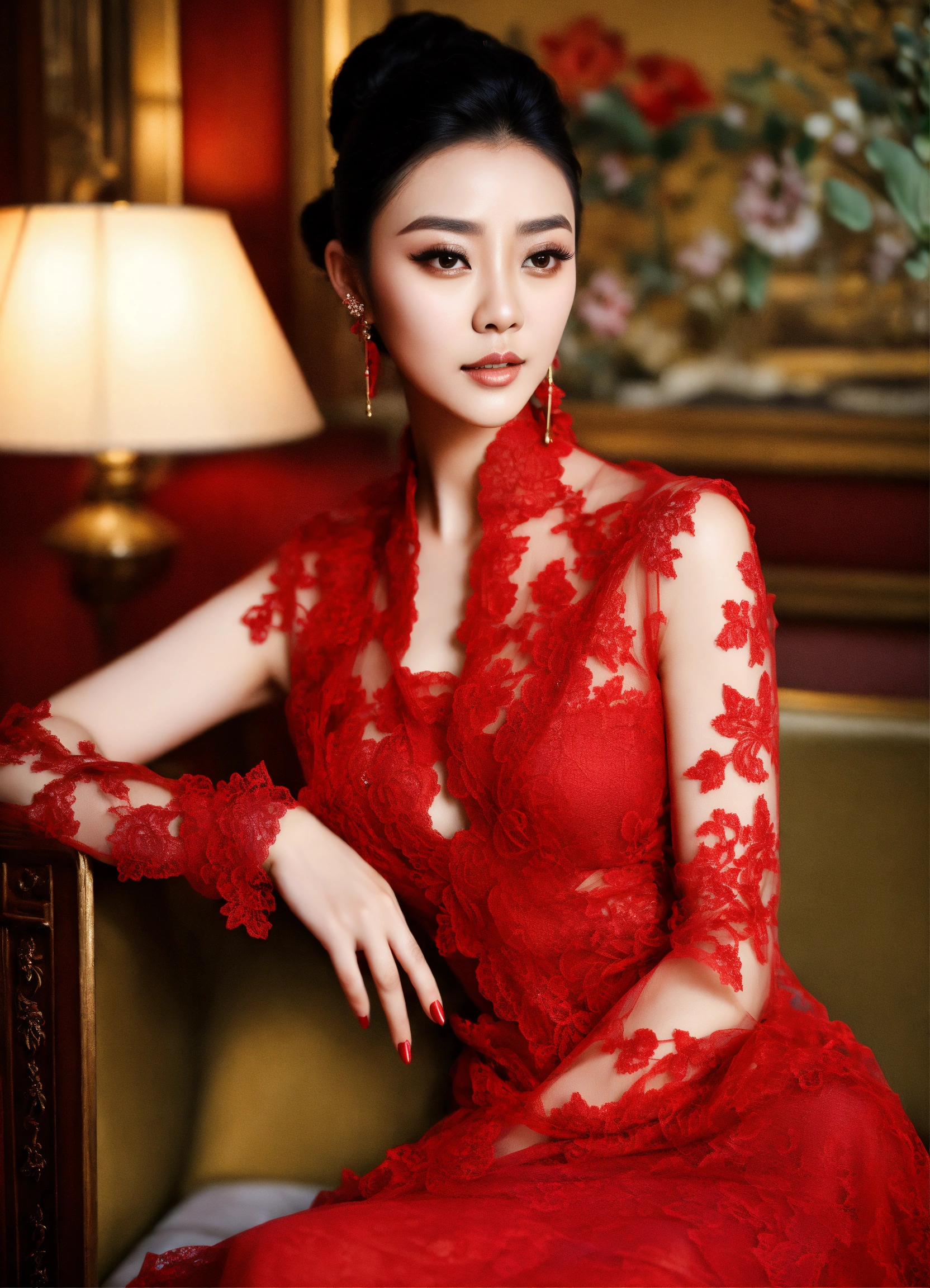 Gorgeous fan bing bing wearing red lace in a fancy hotel