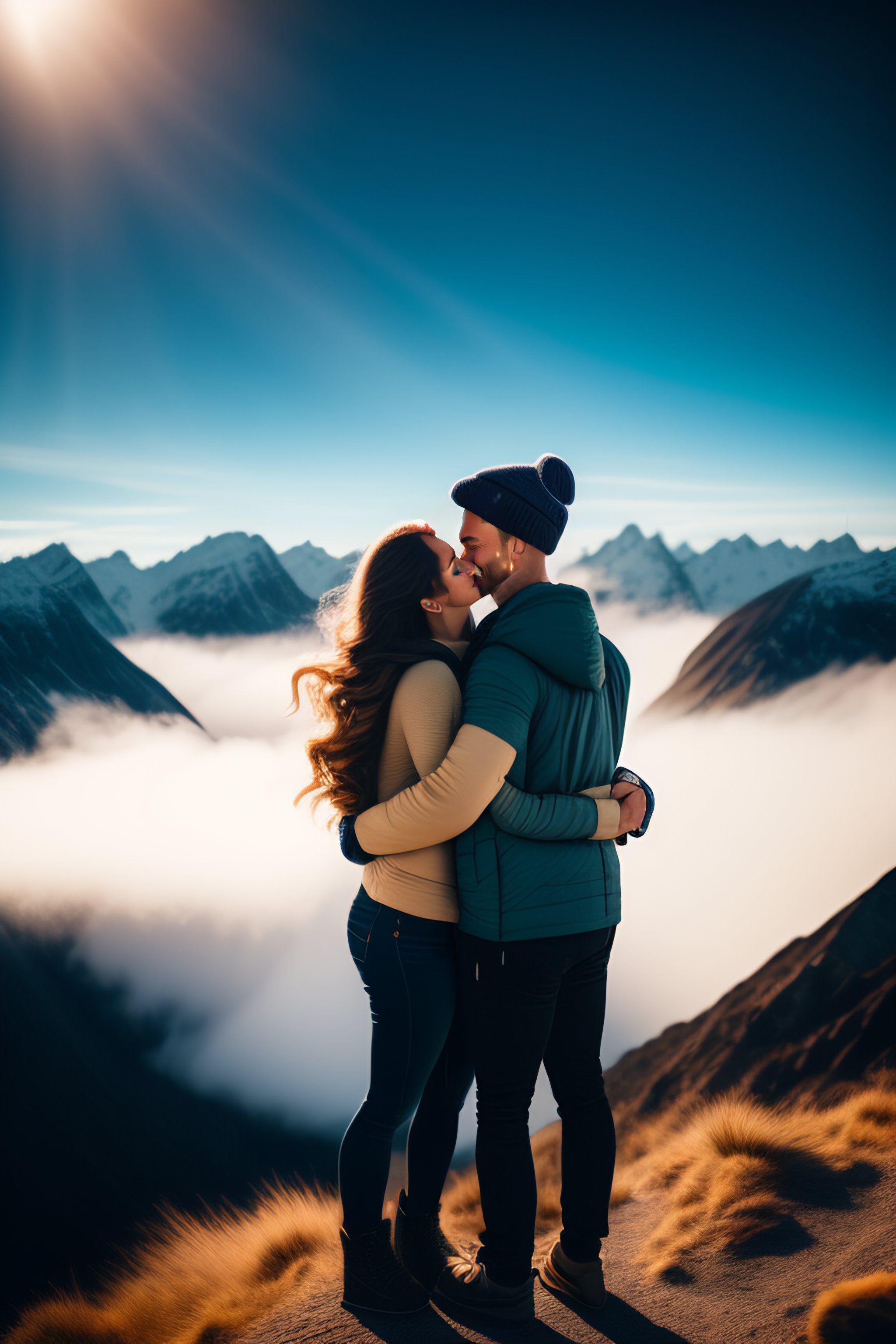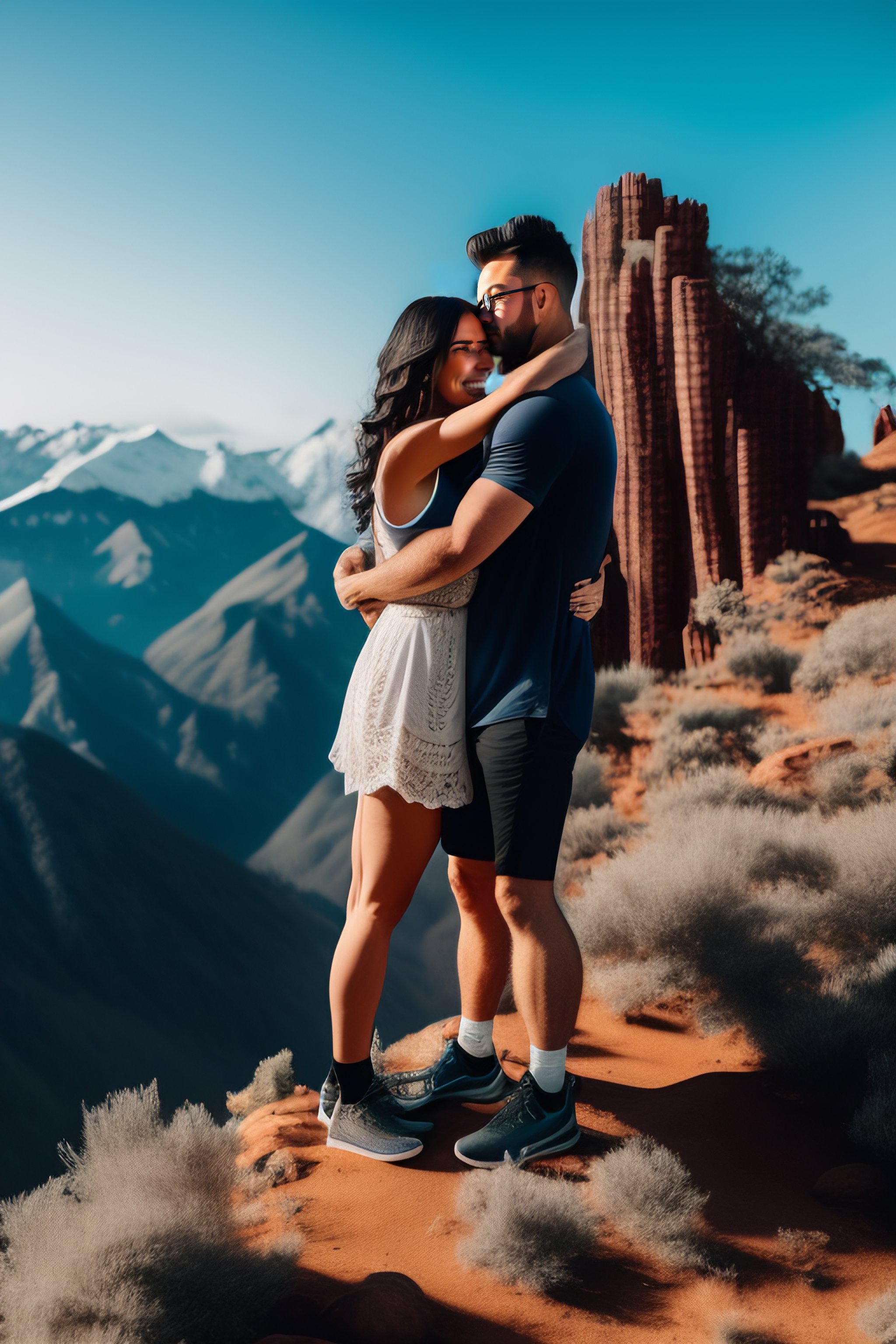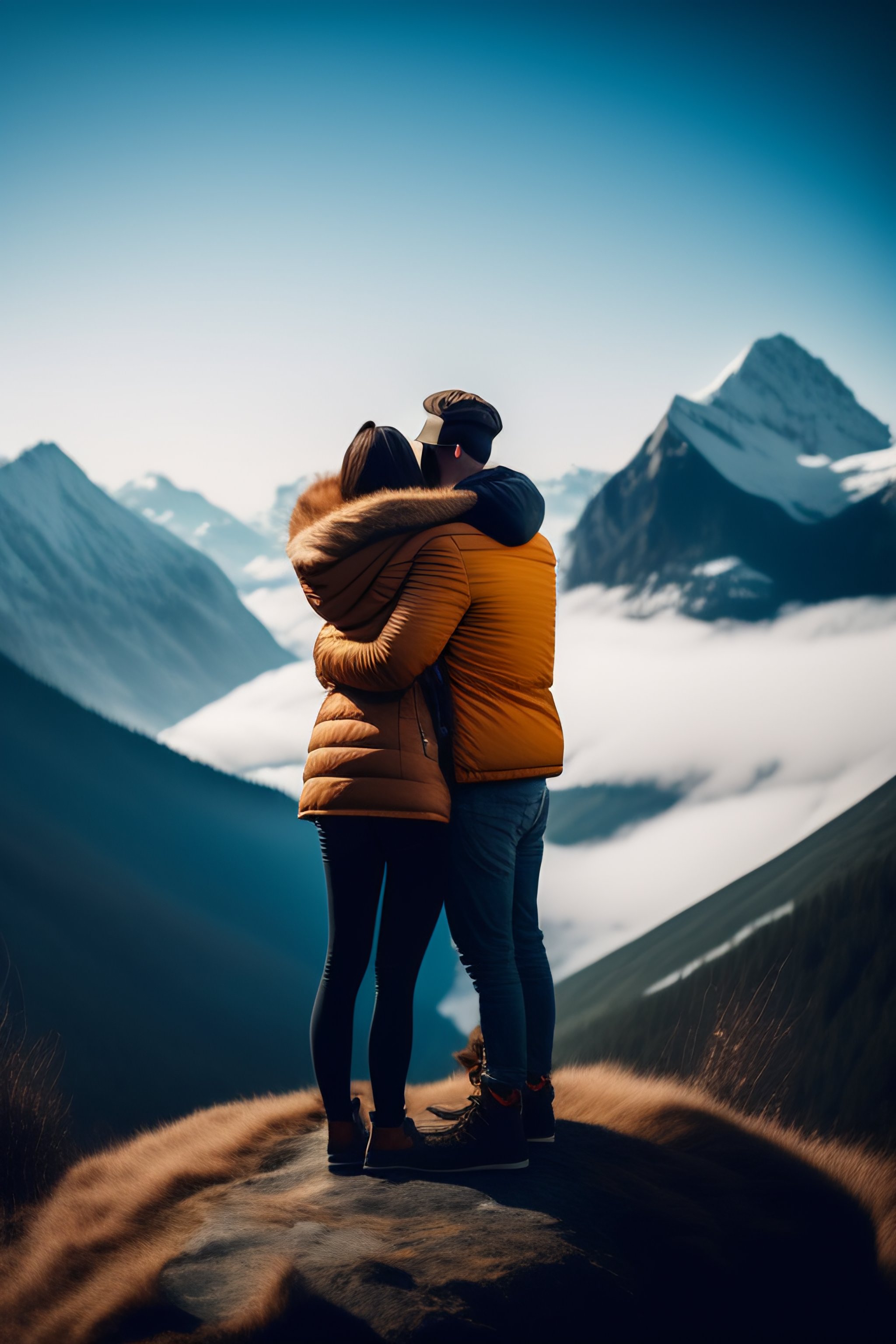 A short girl and tall boy hugging on top of mountains