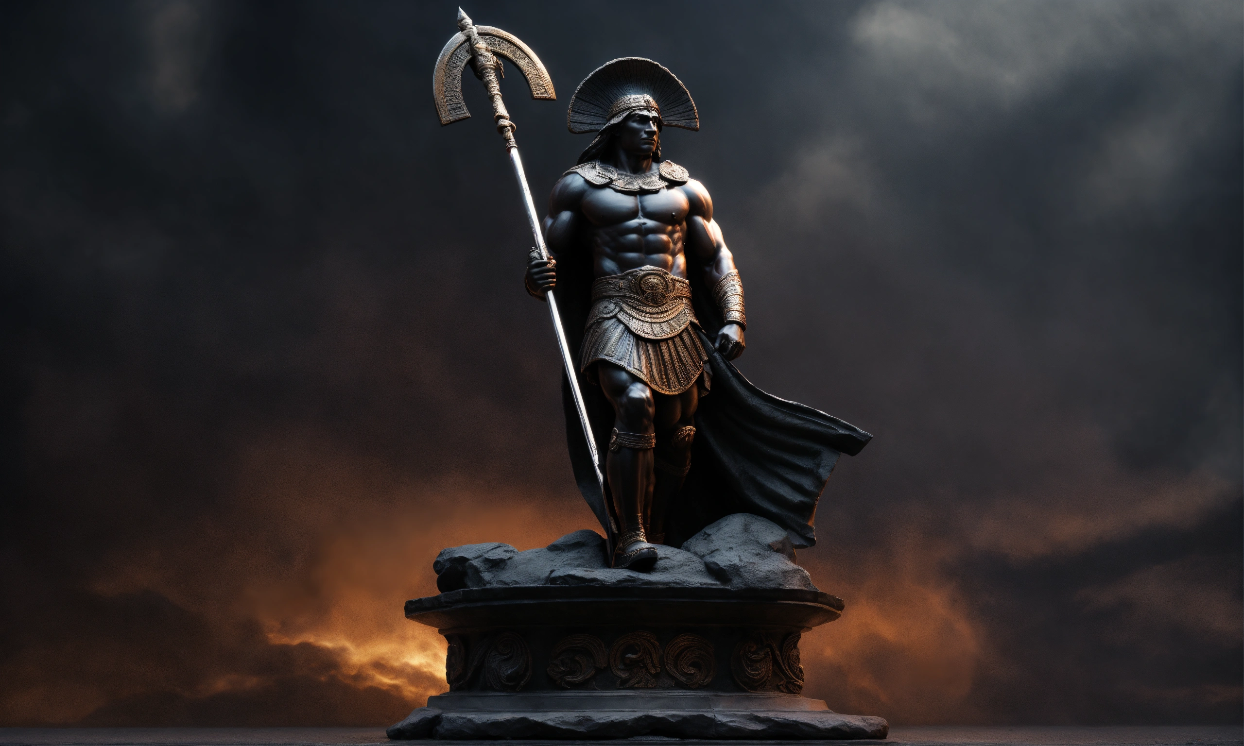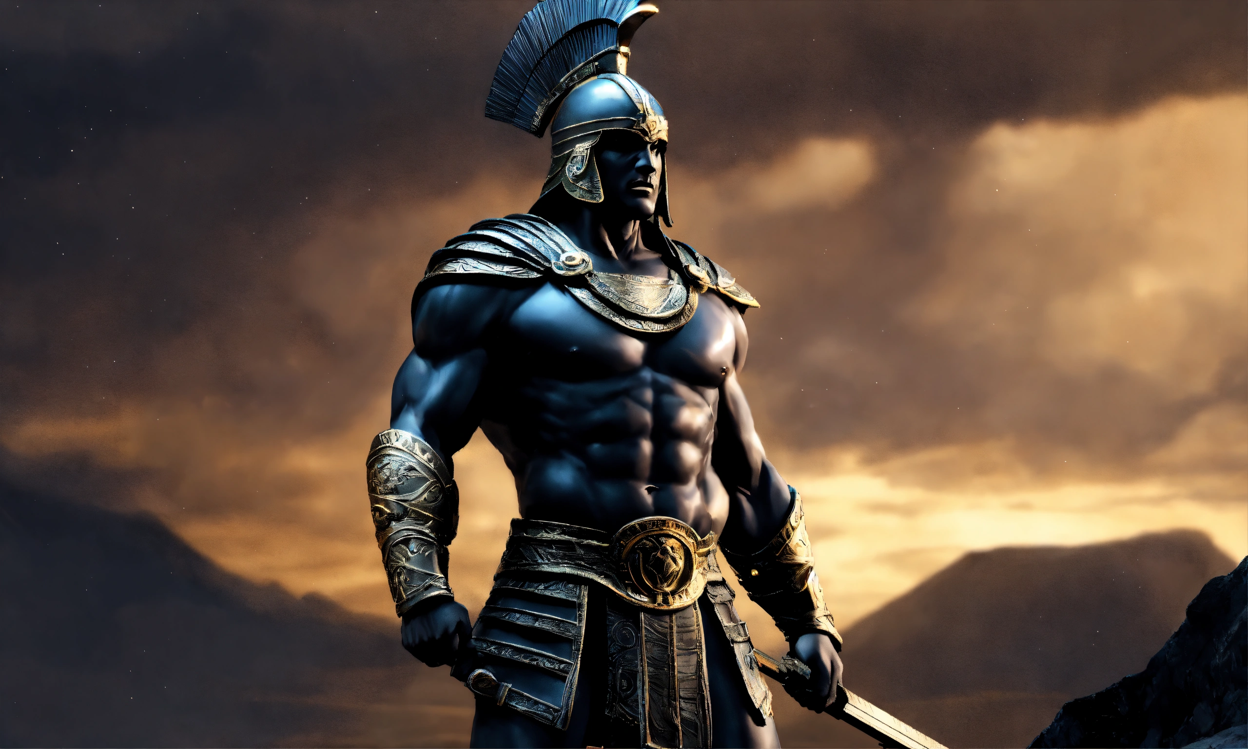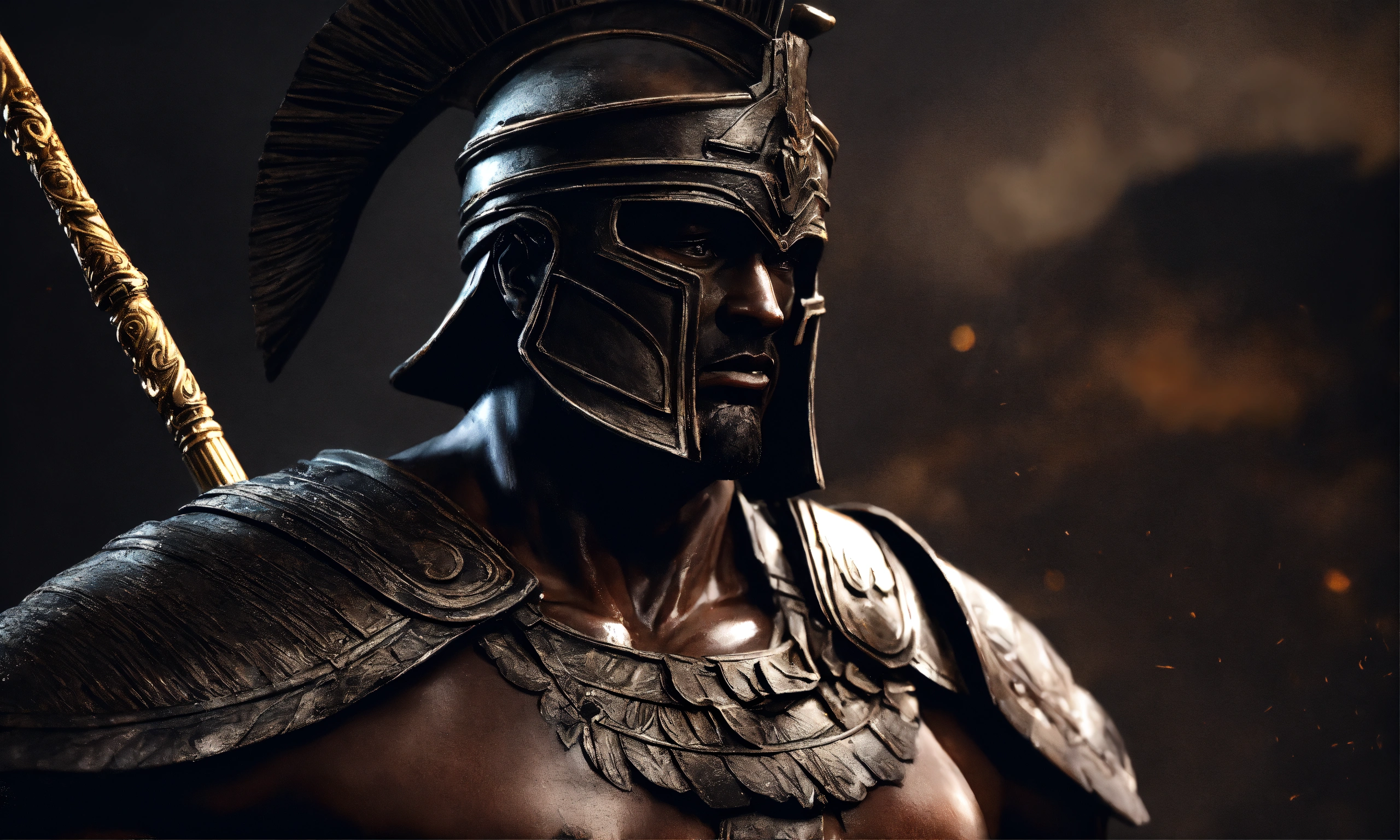 Black warrior statue, muscular, dark, ancient greek background, dark smoky background, realistic, well done, detailed, 169, 8k