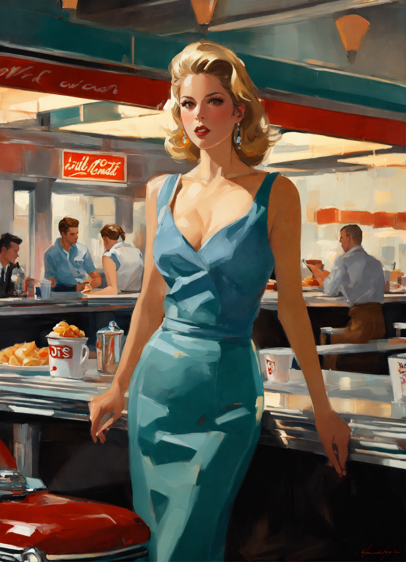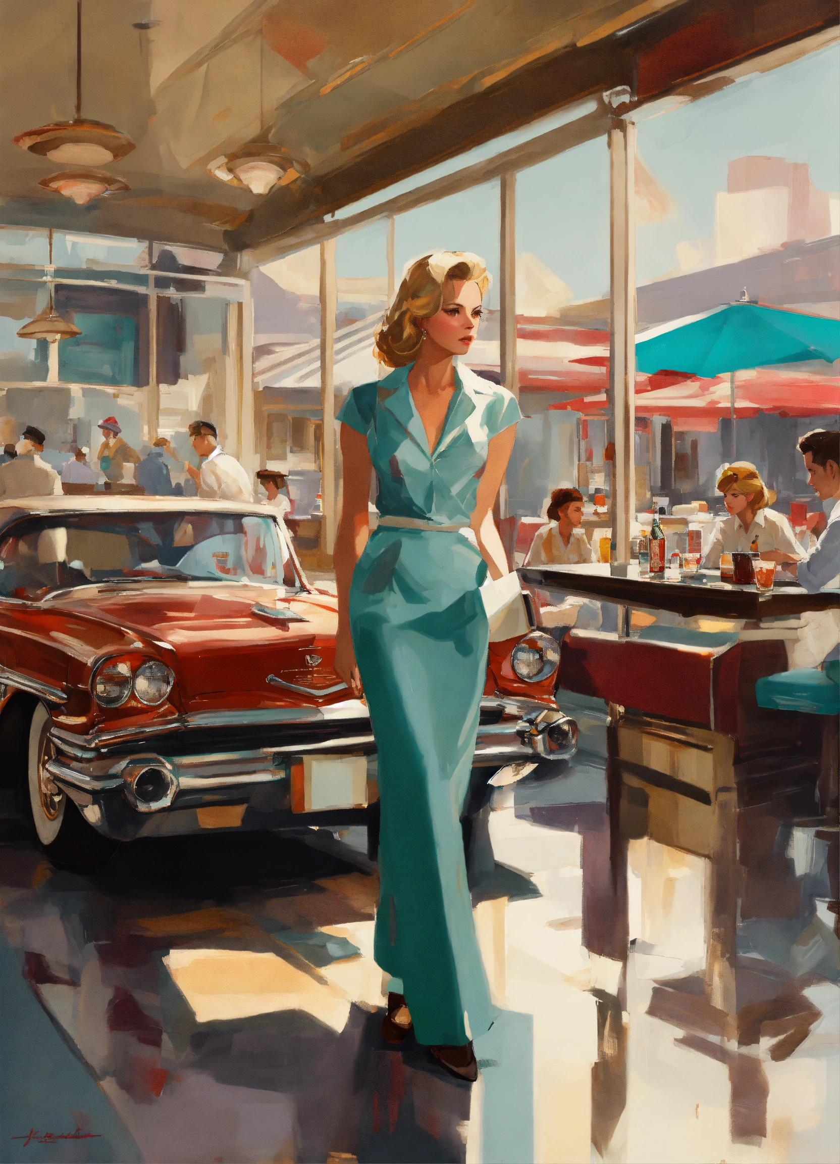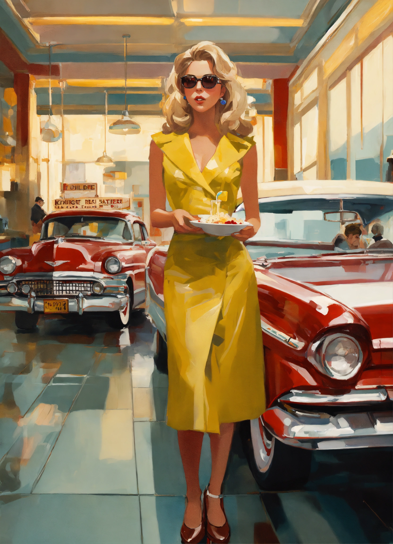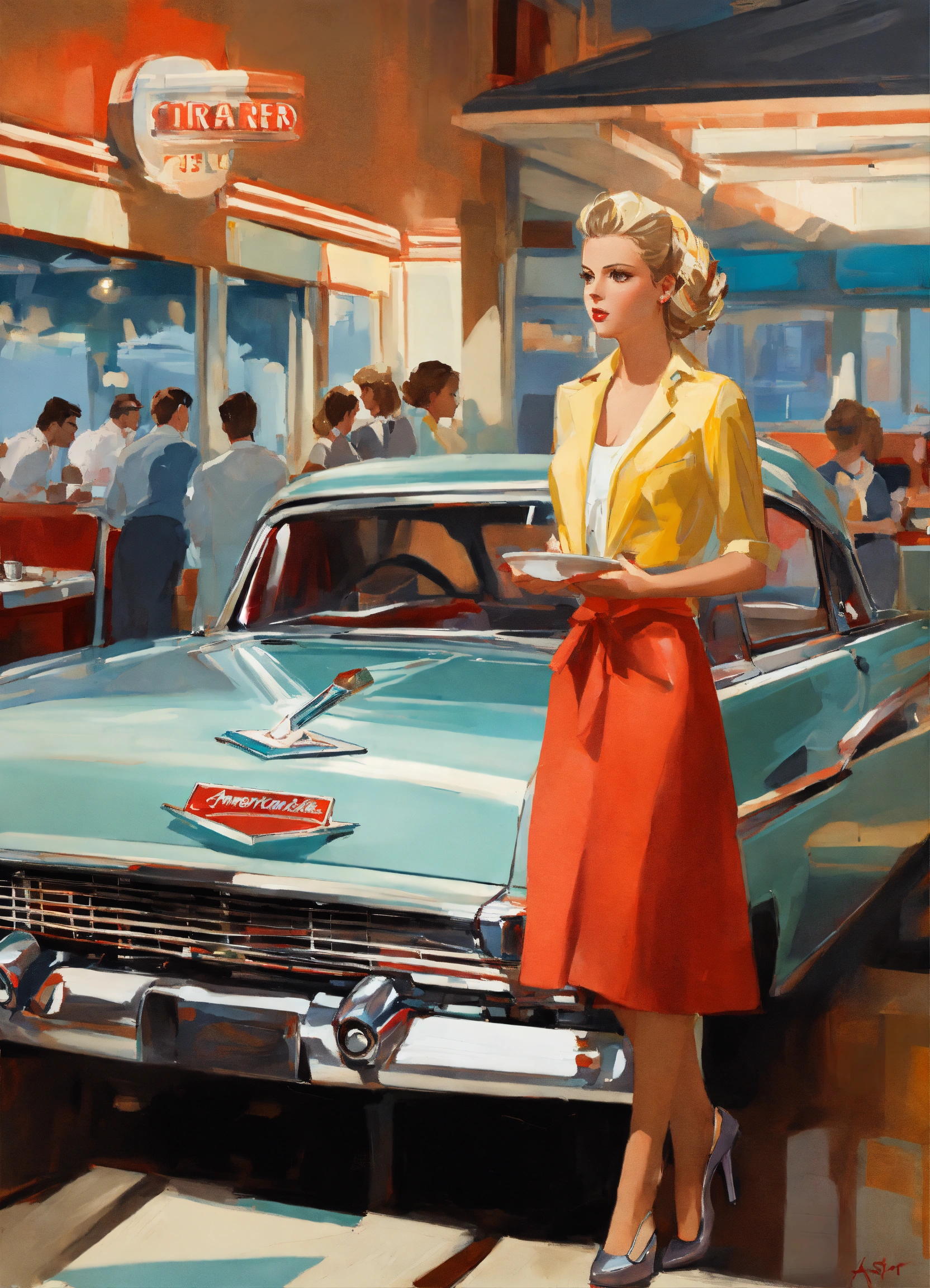 Ultra realistic full body photo of american diner, with waitress, elizabeth montgomery, vintage fashion and classic cars, trending on art by josef kote