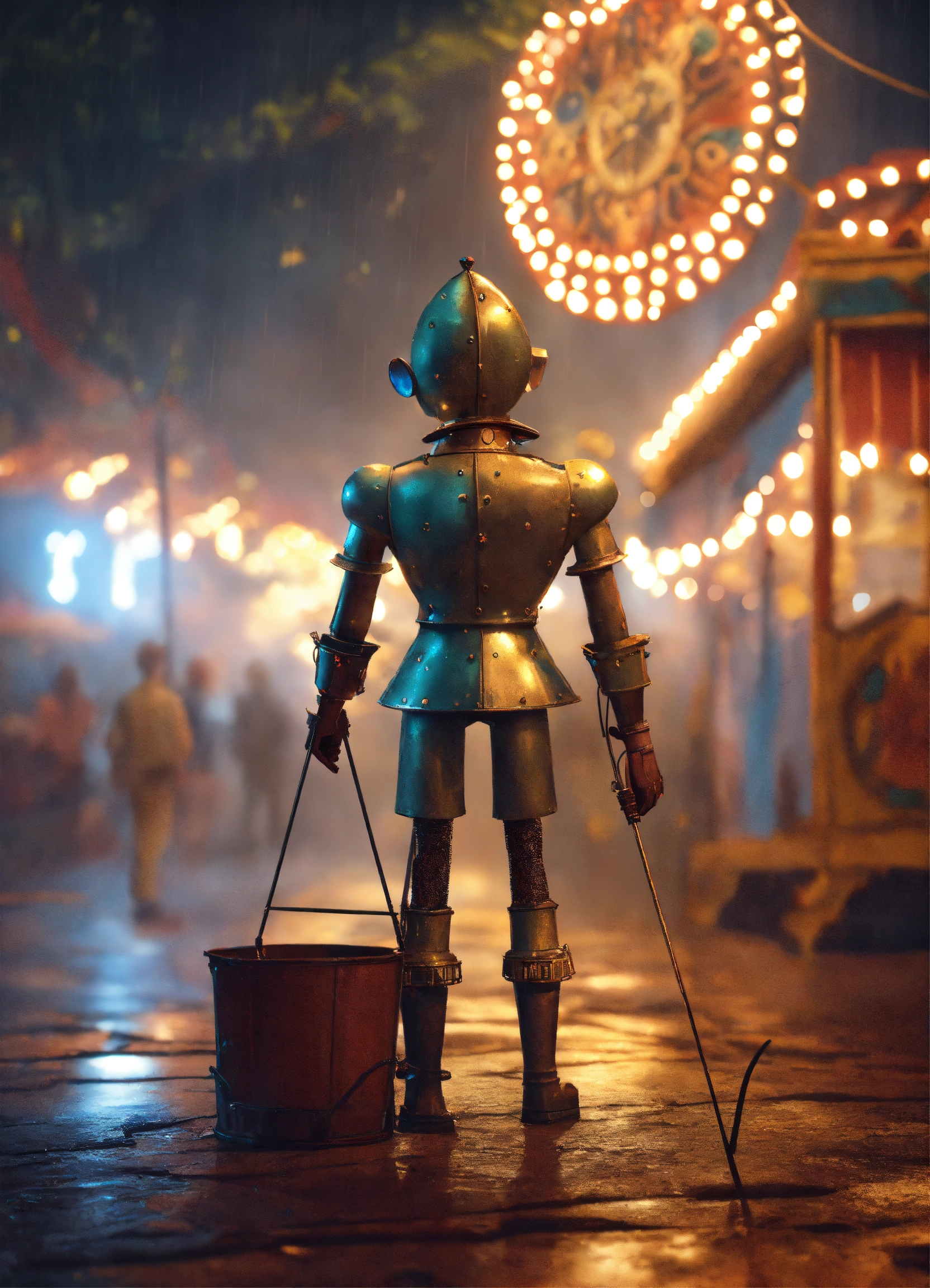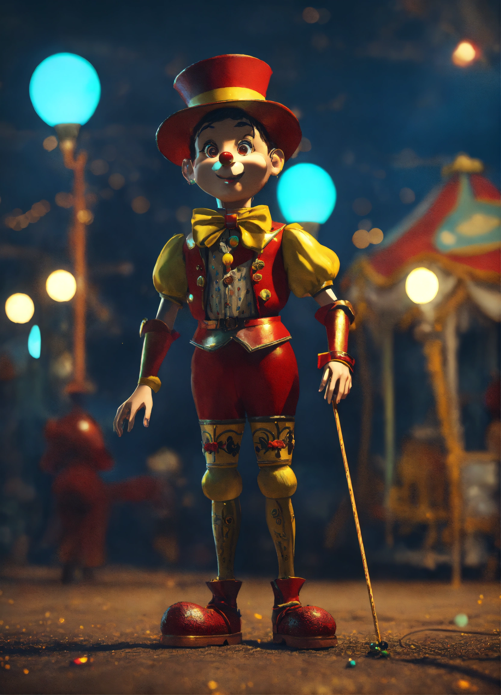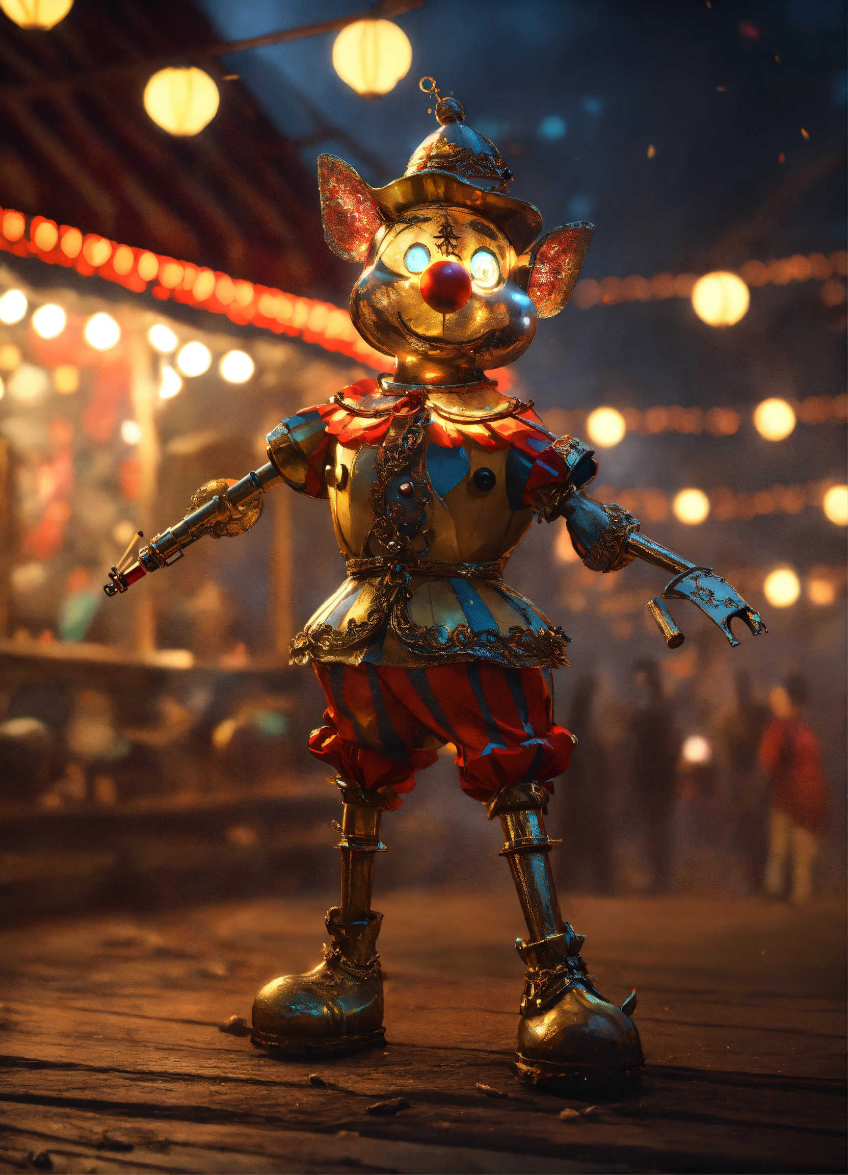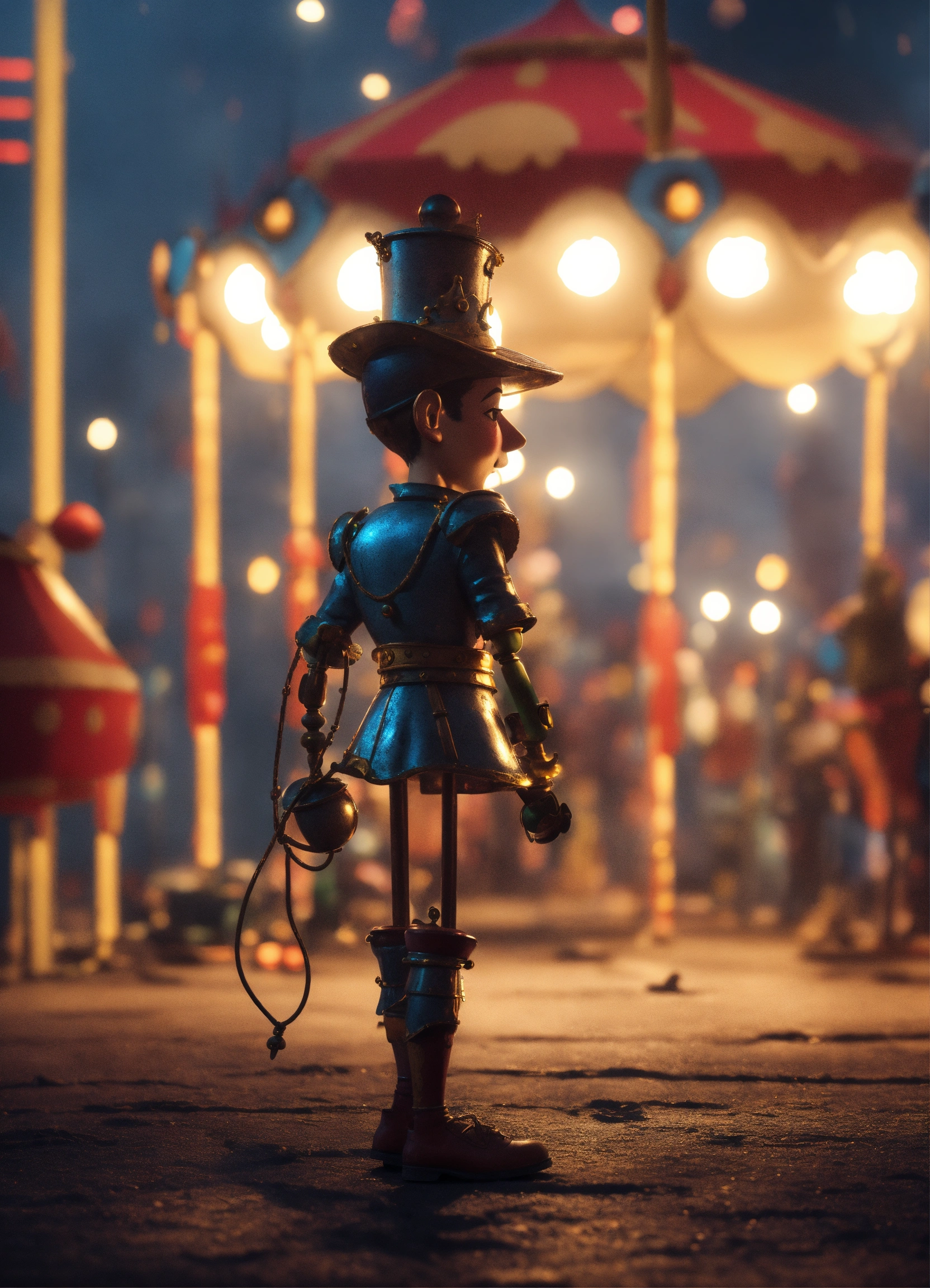 Pinocchio made of metal, vintage circus carnival, foggy weather, night light, intricate, sharf focus, concept art, artstation, fantasy, octane render, cinematic lighting, otherworldy