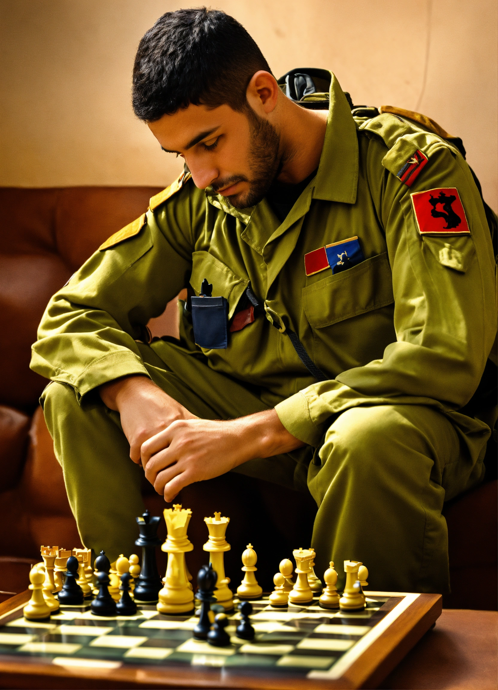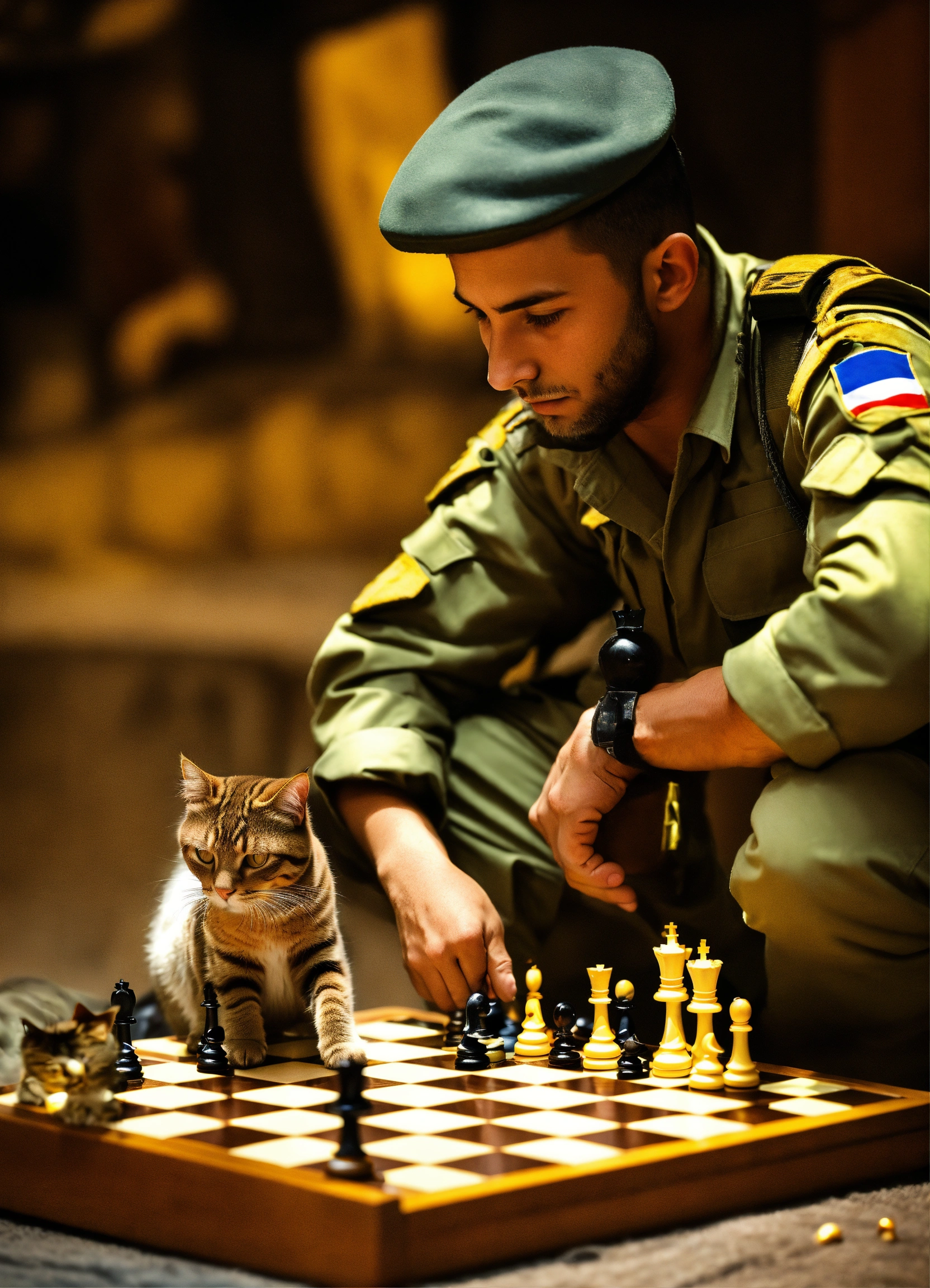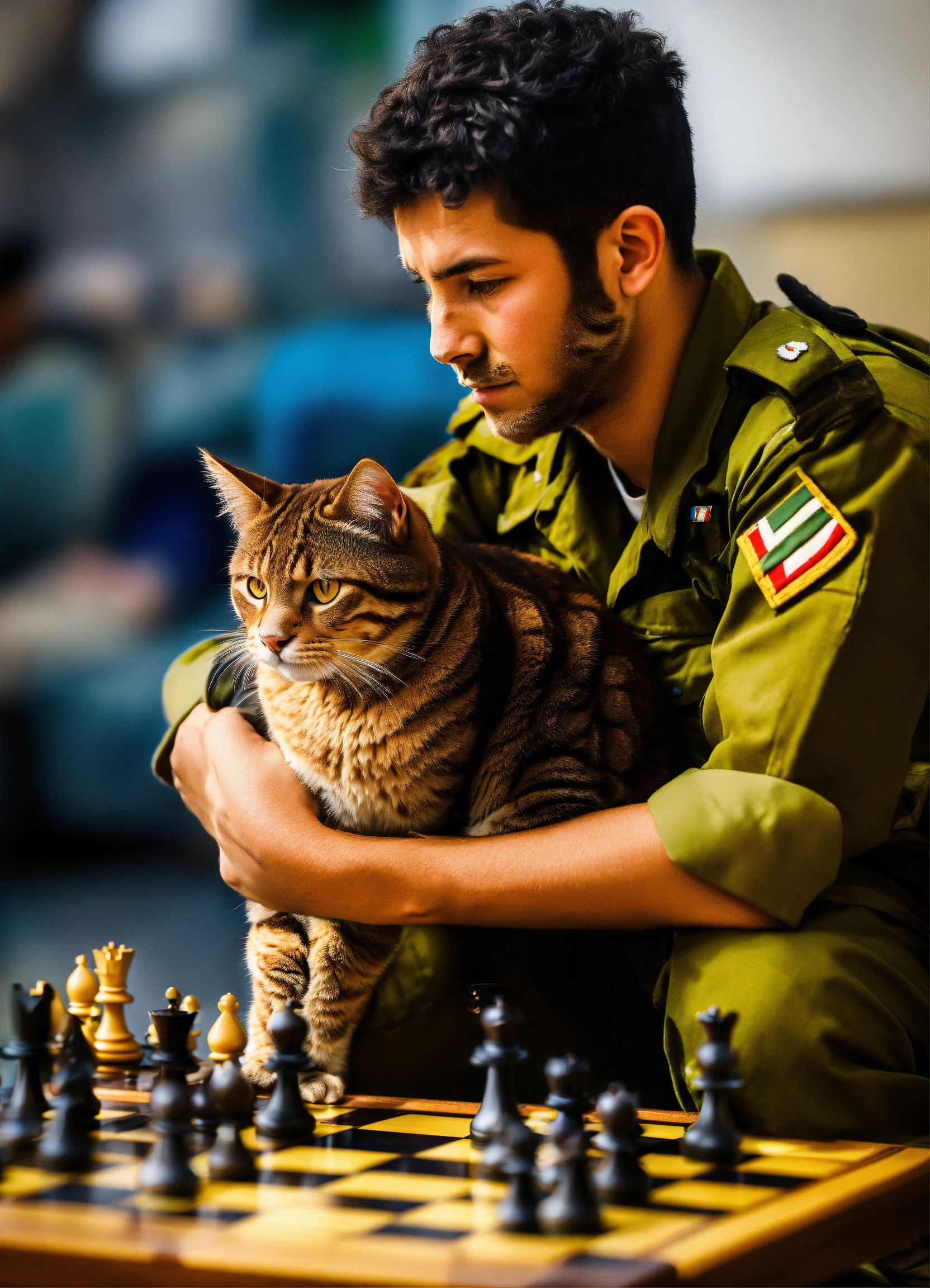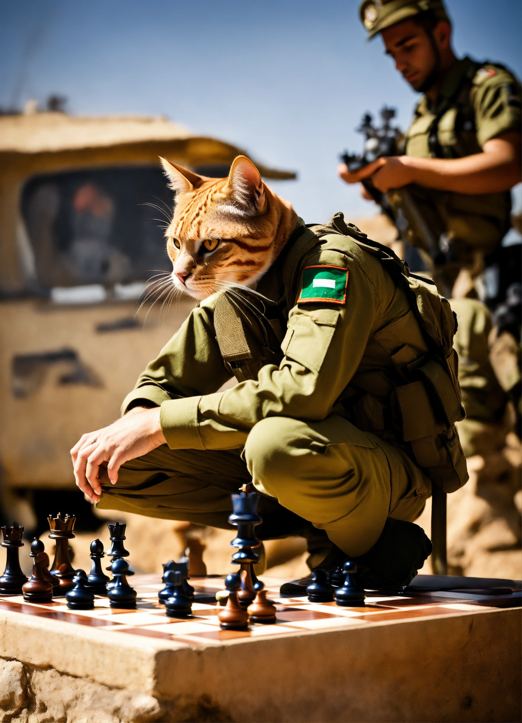 Israeli soldier waiting intensively for his turn in a chess match with brown cat, it is a cat move now, cat is holding the figure
