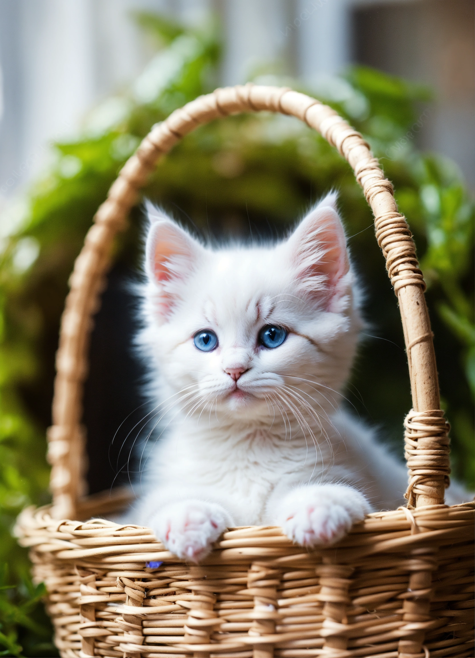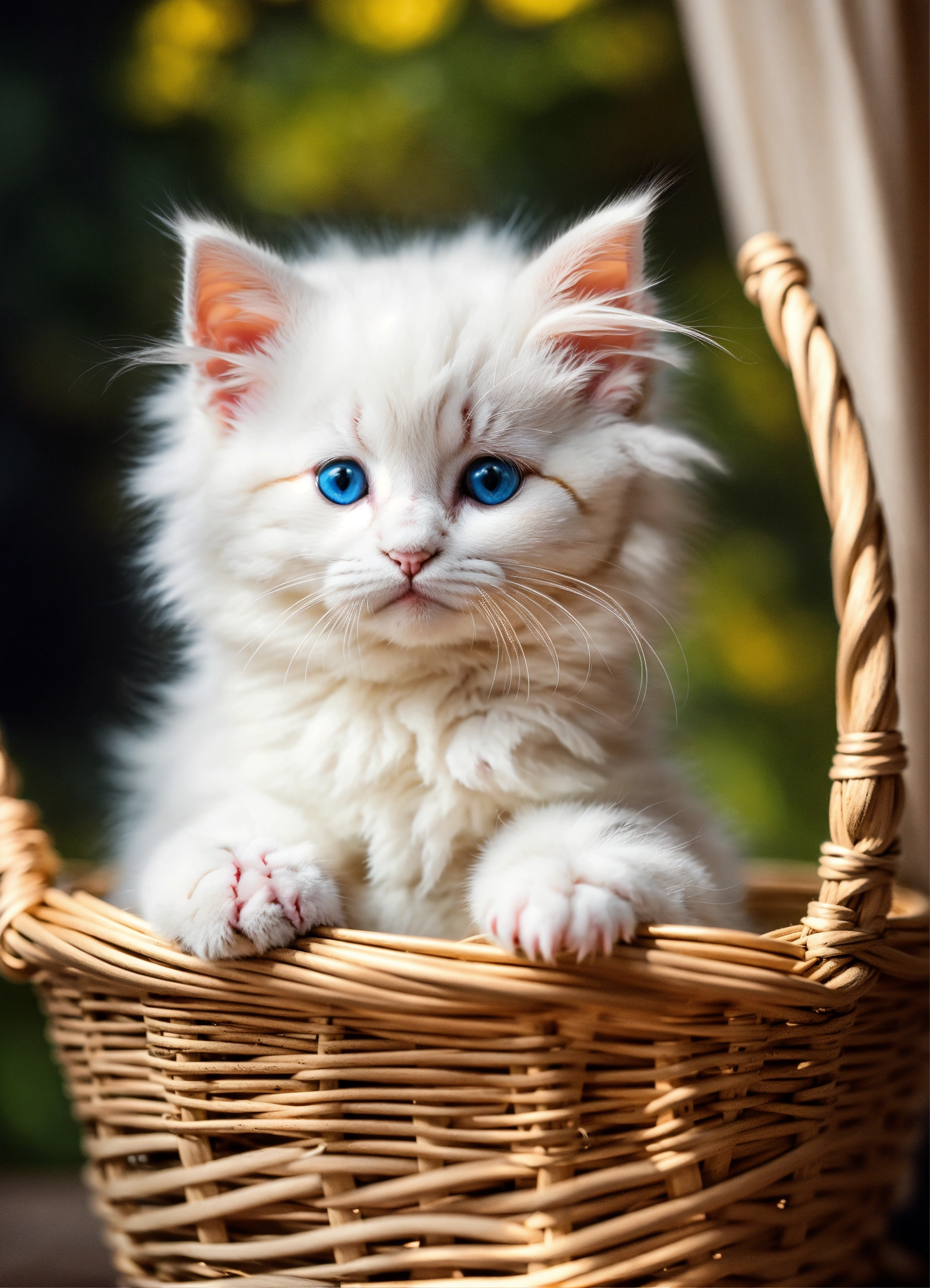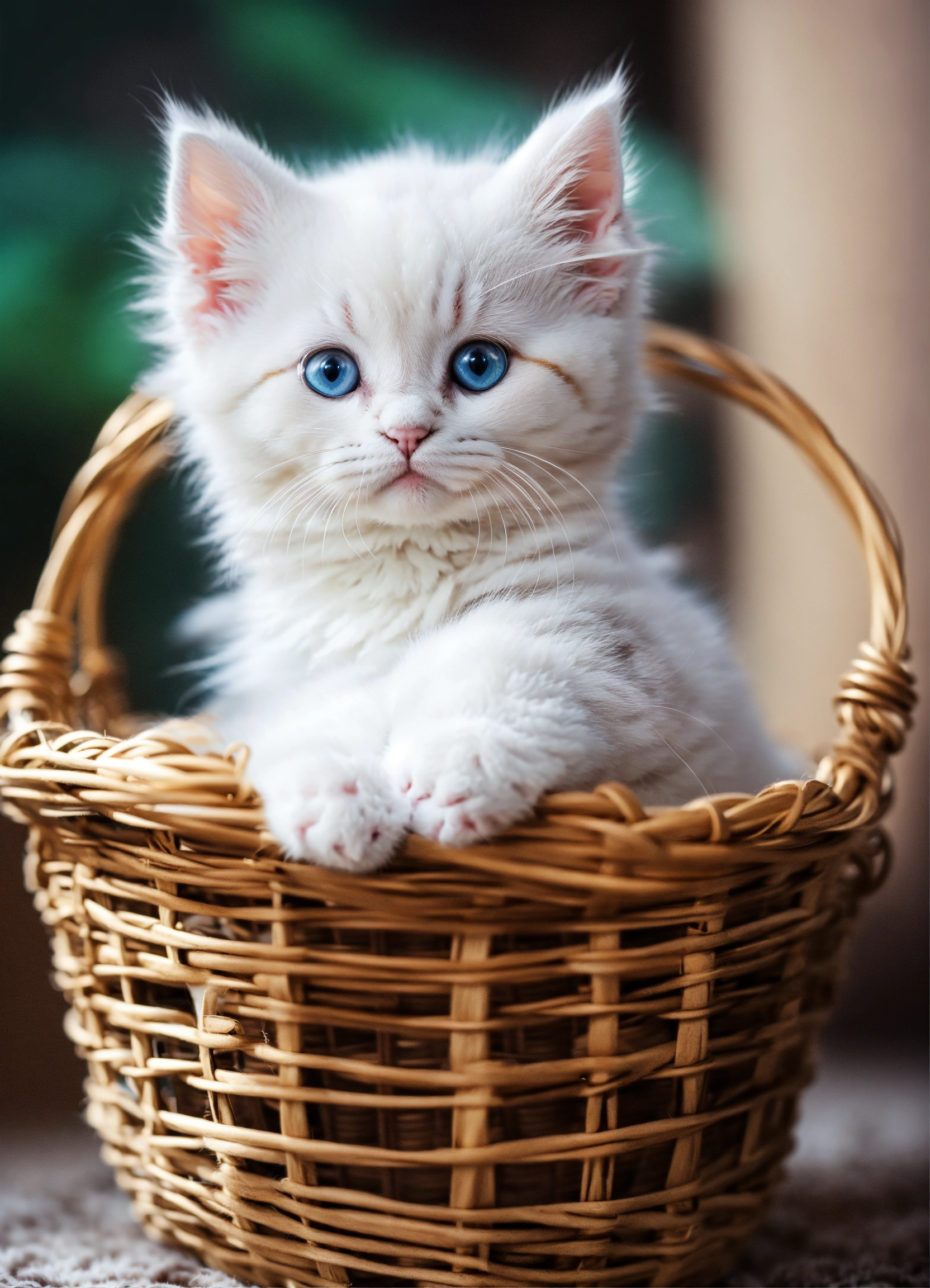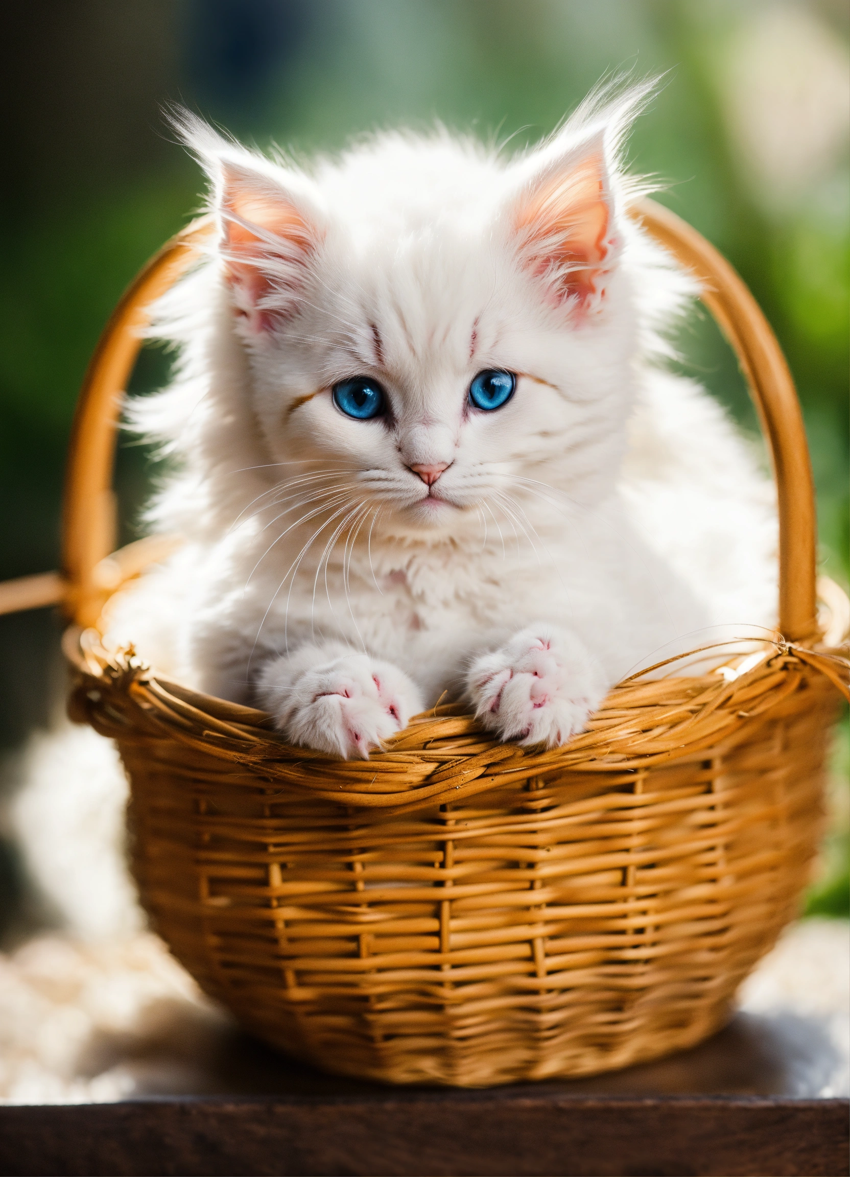 Cute beautiful white small kitten in the basket fluffy fantasy style