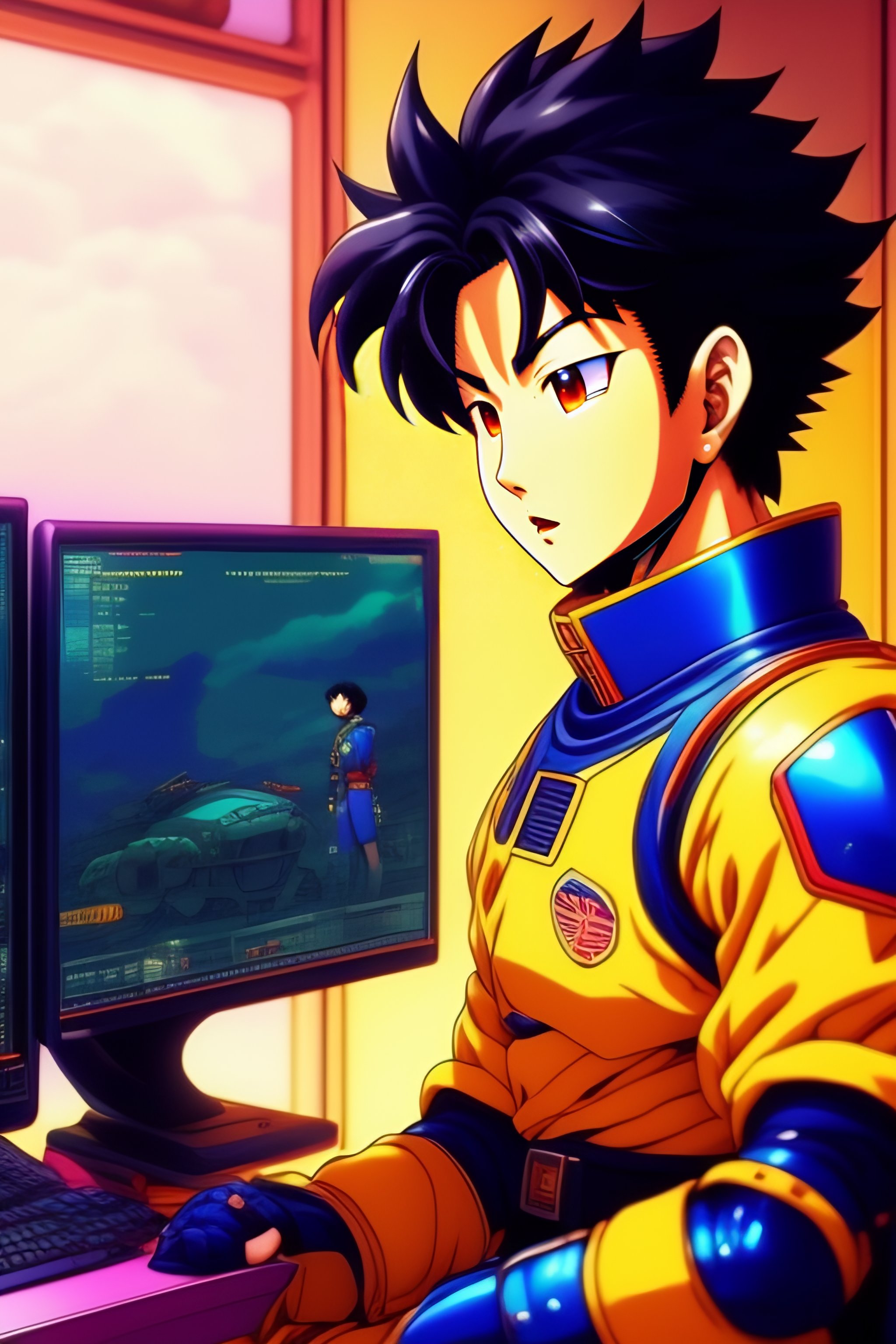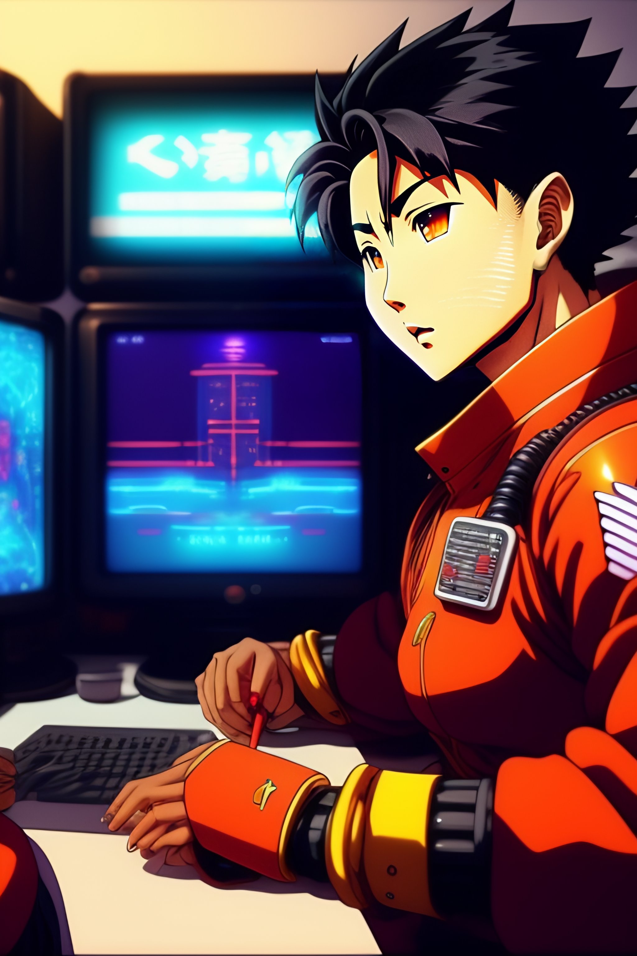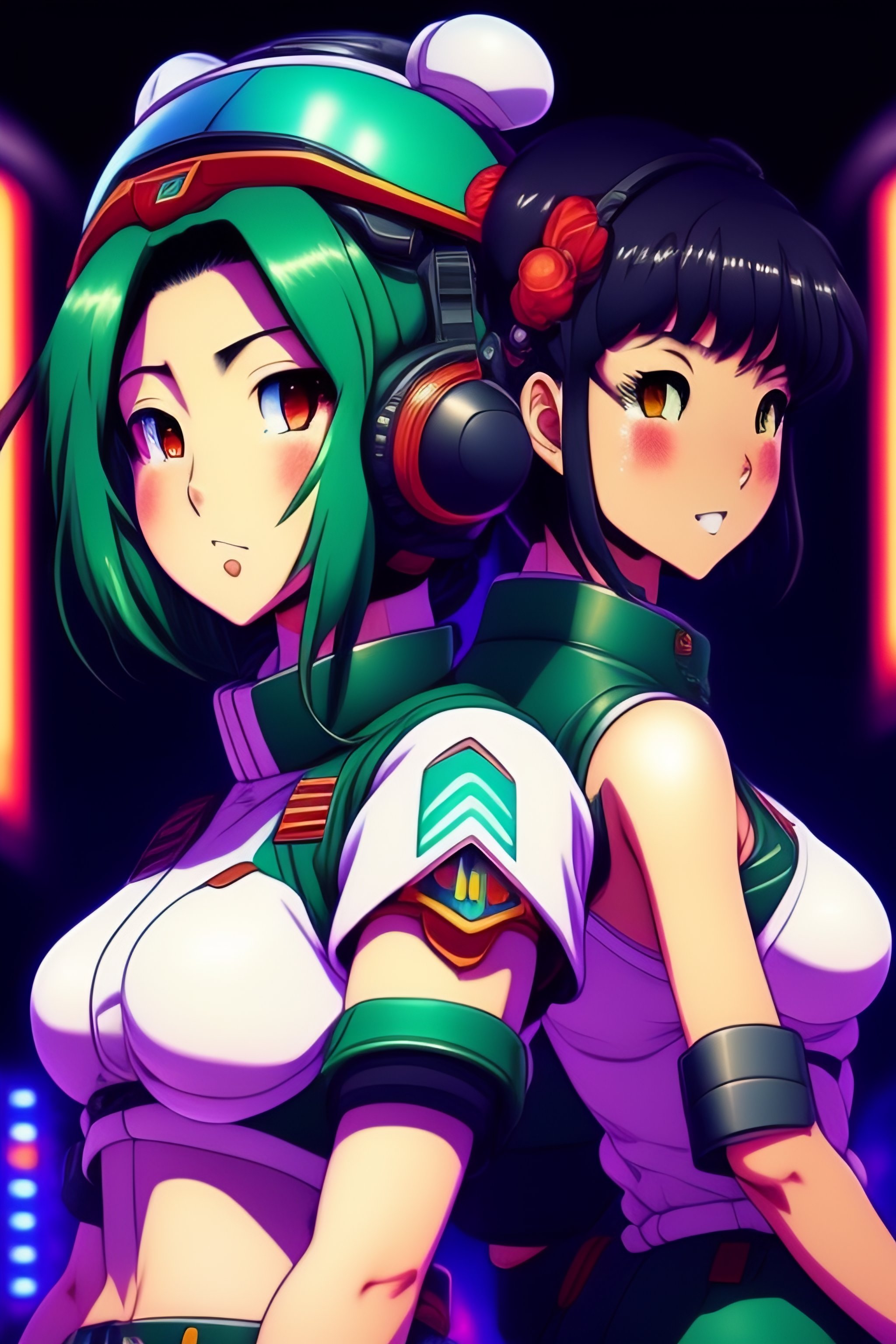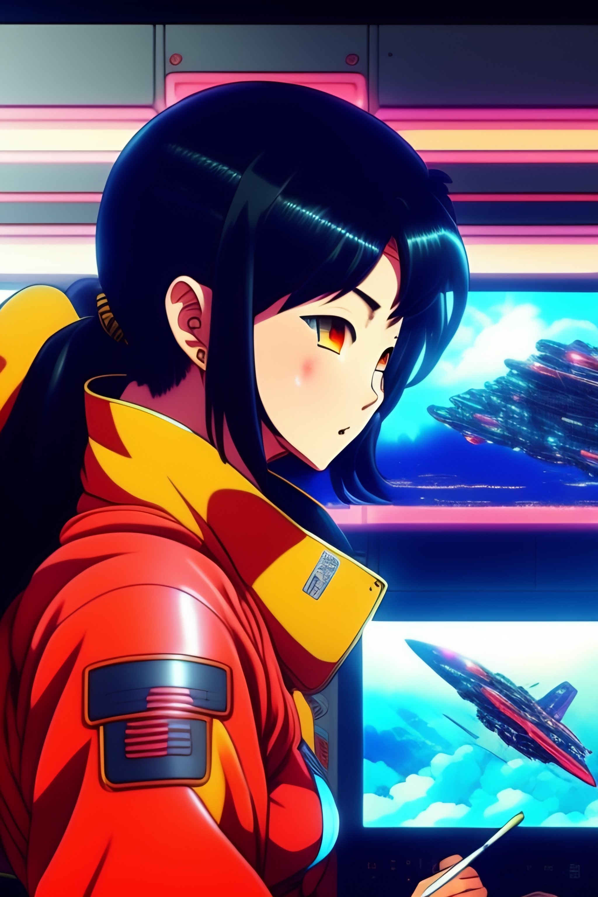 Two attractive asian gundam pilots answering emails at a computer drawn in 90's anime vintage style, akira toriyama, kentaro miura, colours, sci-fi, hyper-detailed painting, studio ghibli, surrealism, fine details, inside a spaceship, neon