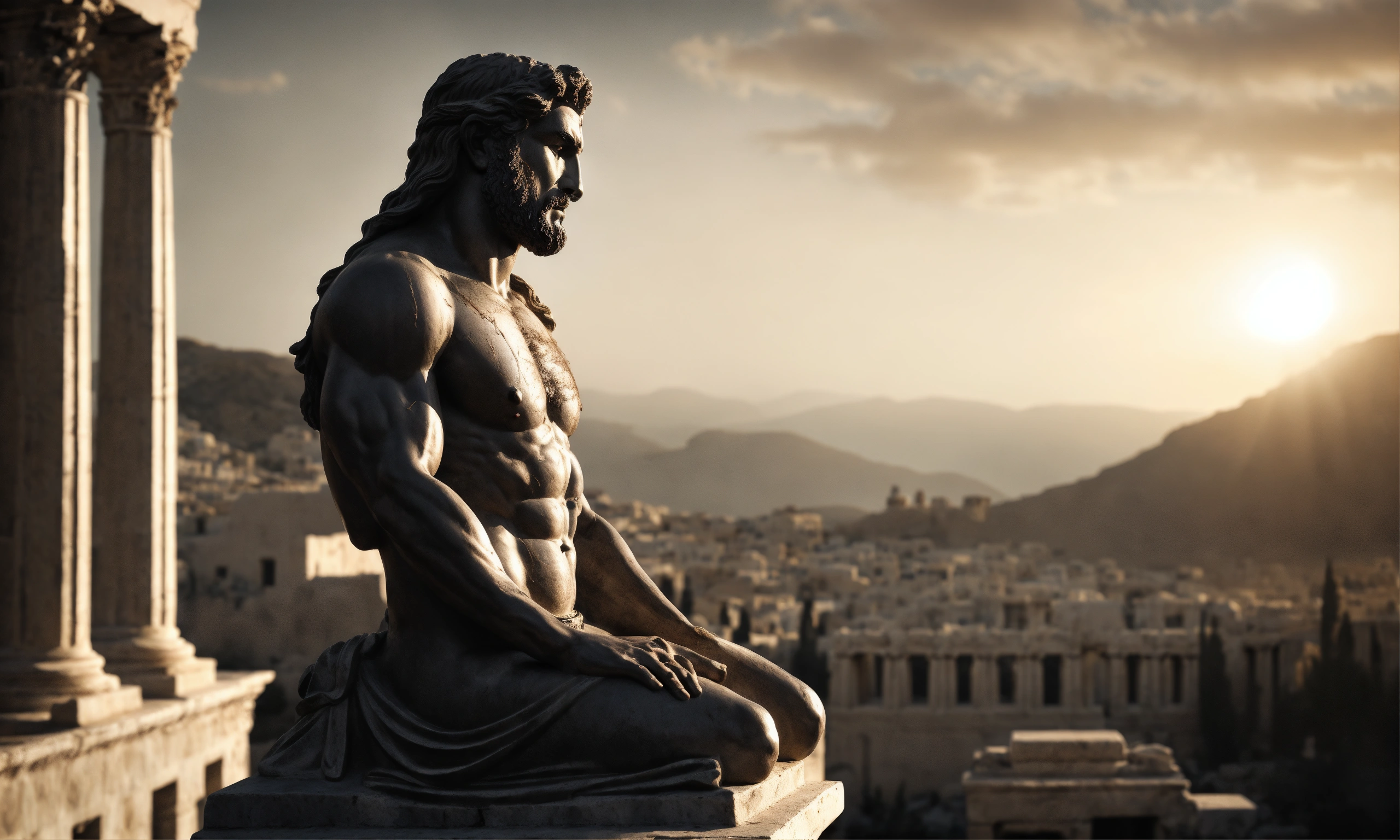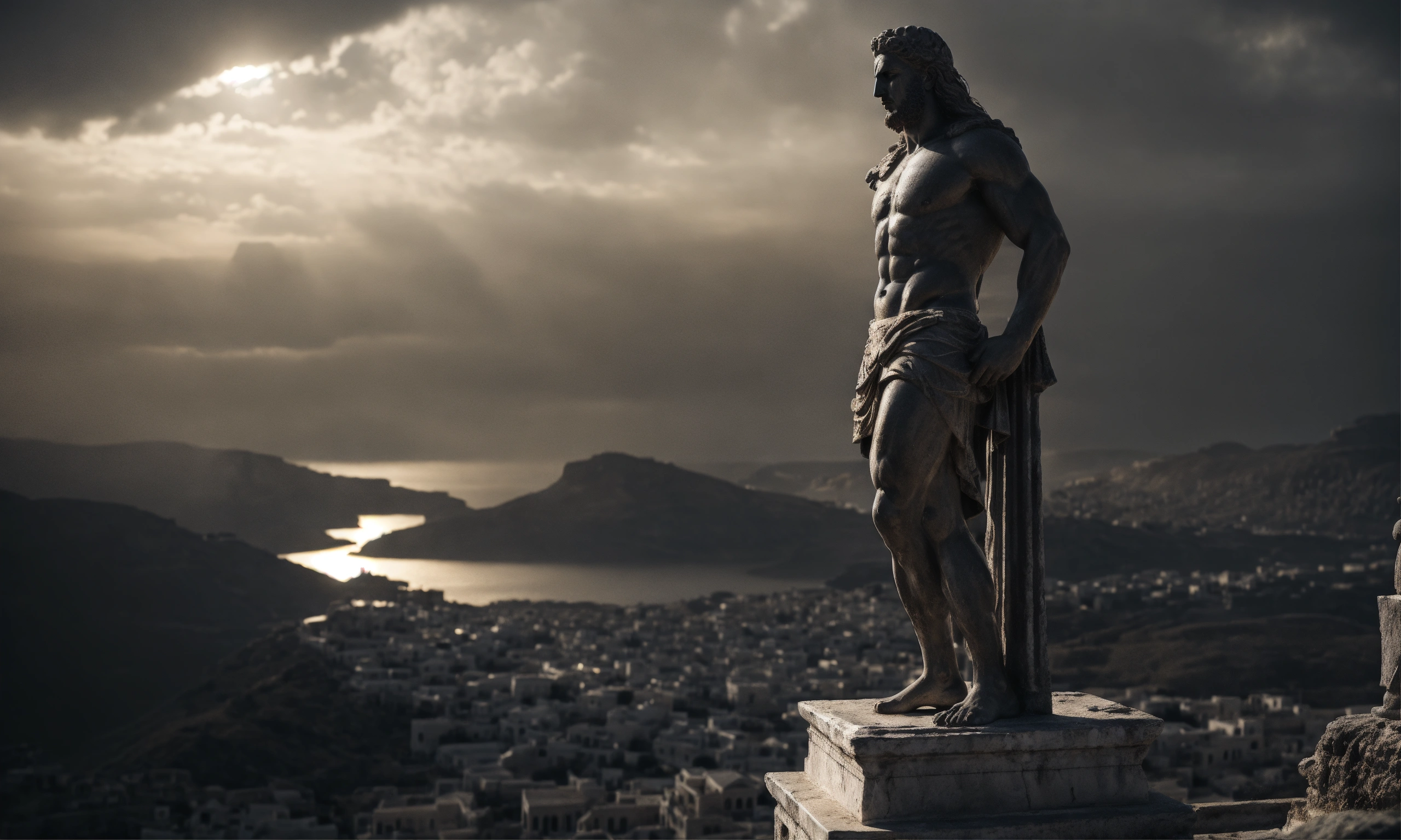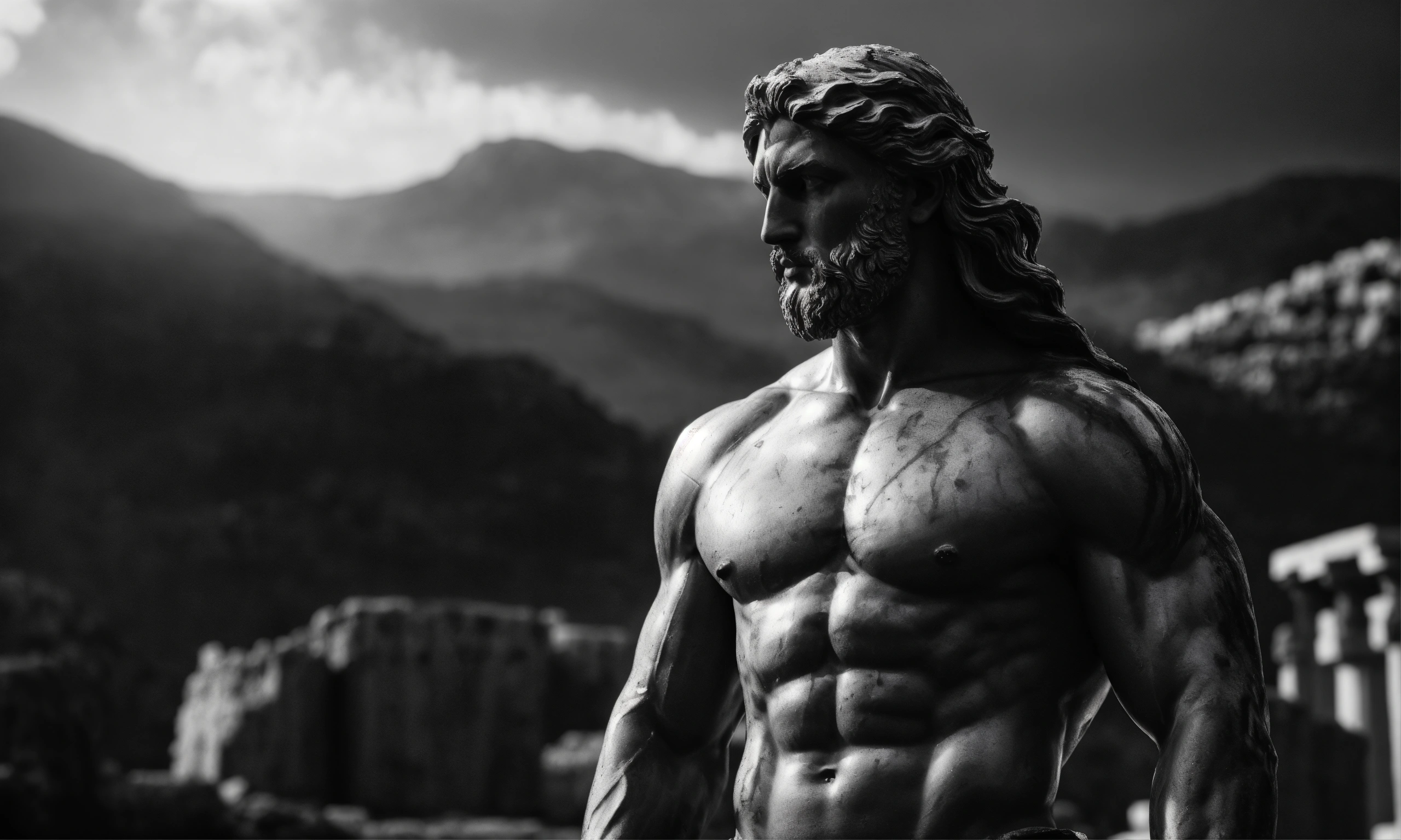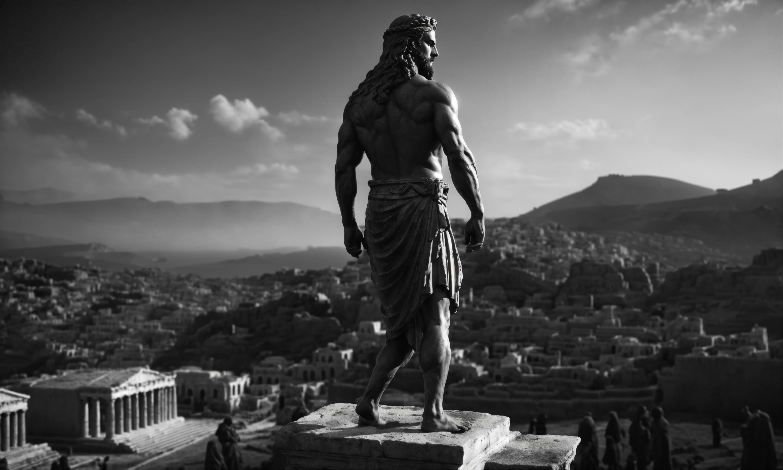 Please generate a greek statue-like image of a strong man with long hair and wounds on his body, with the image of ancient greece in the background. the scene should be lit only by the sun of the day, creating a mysterious and epic environment with its more frontal image and clear highlights." 8k black and white cinematic image, immersive and dark environment.