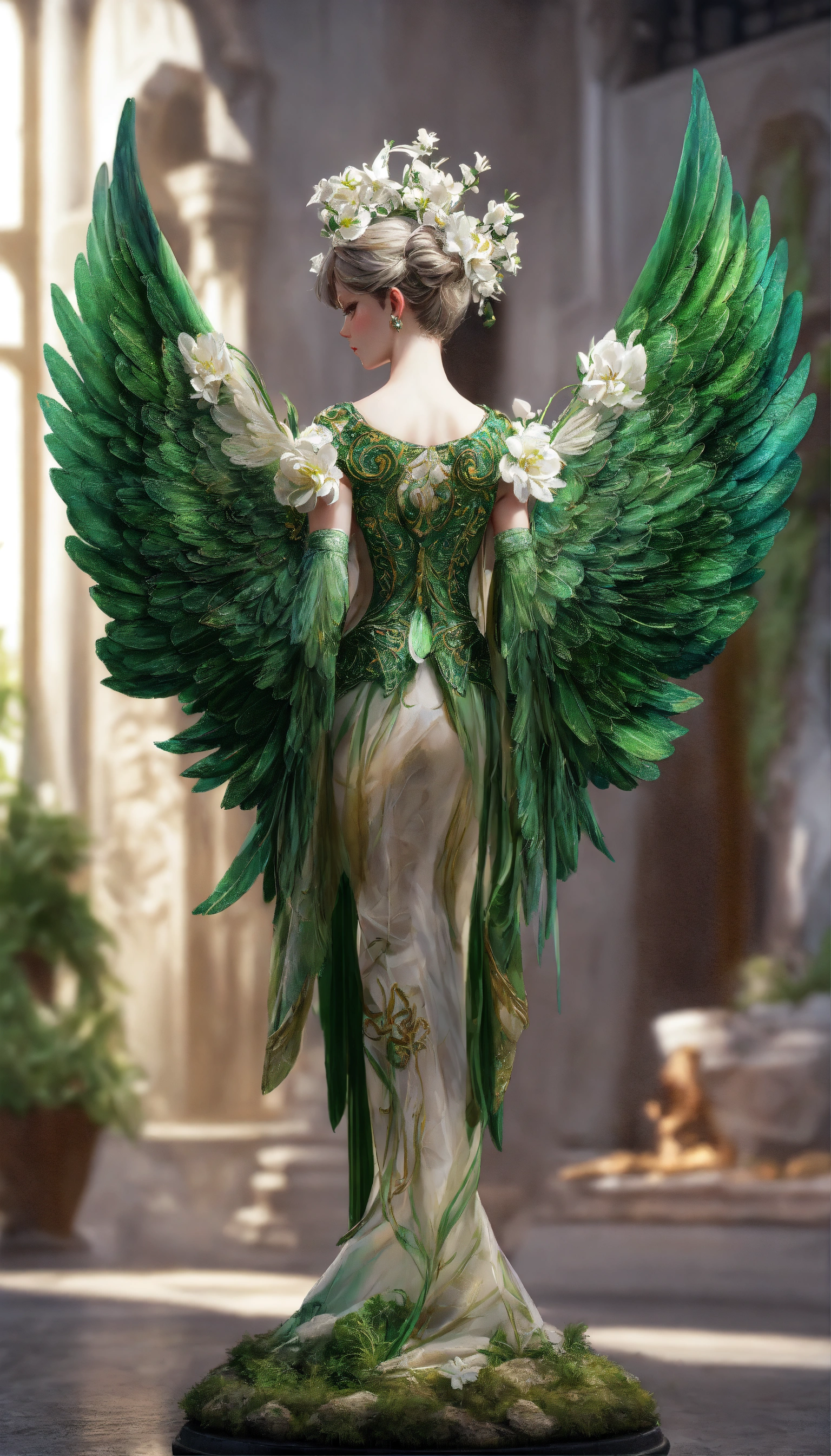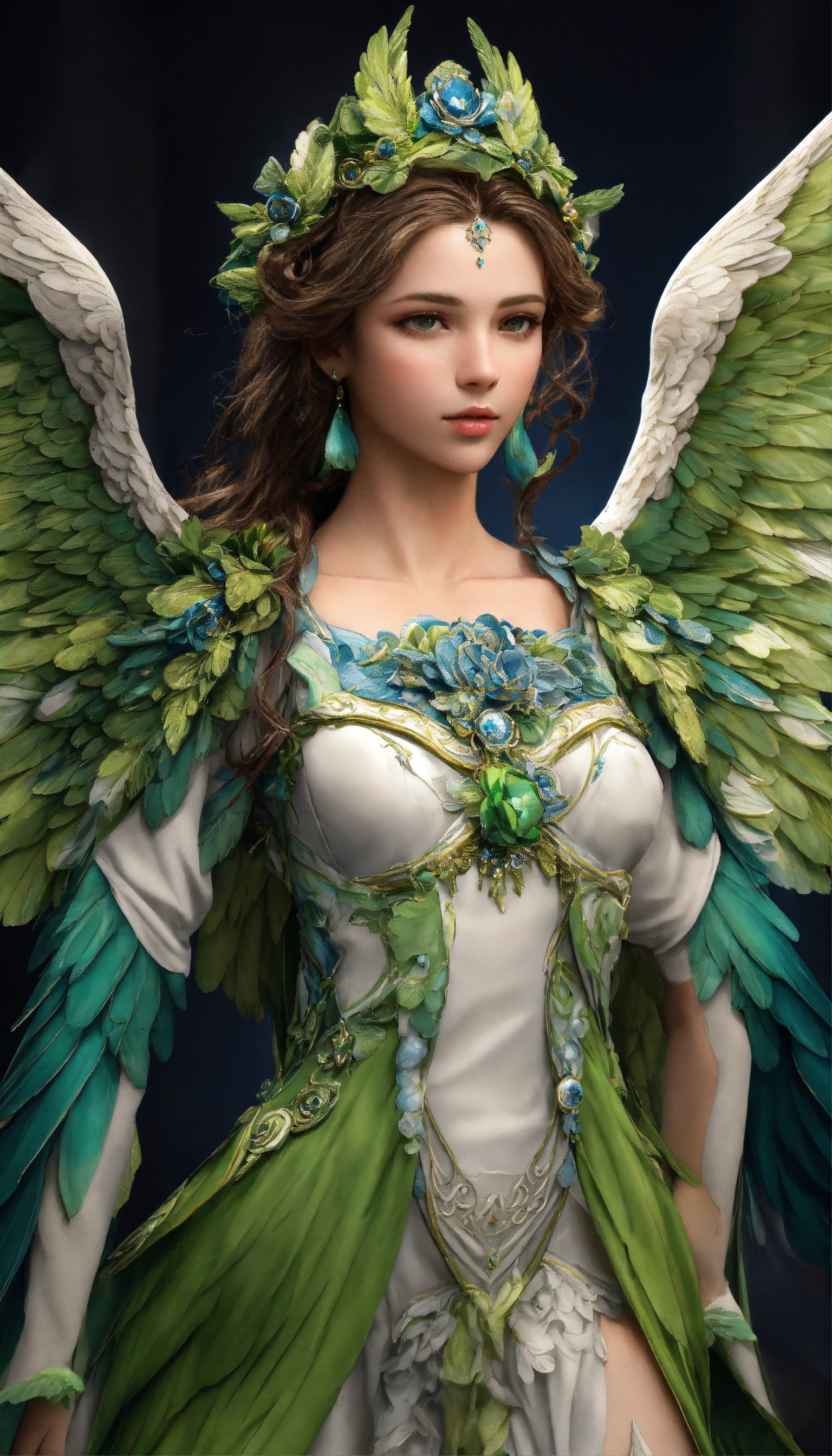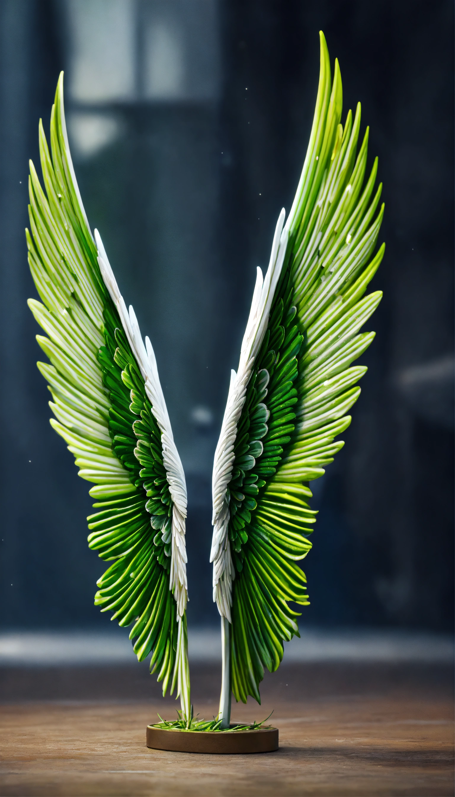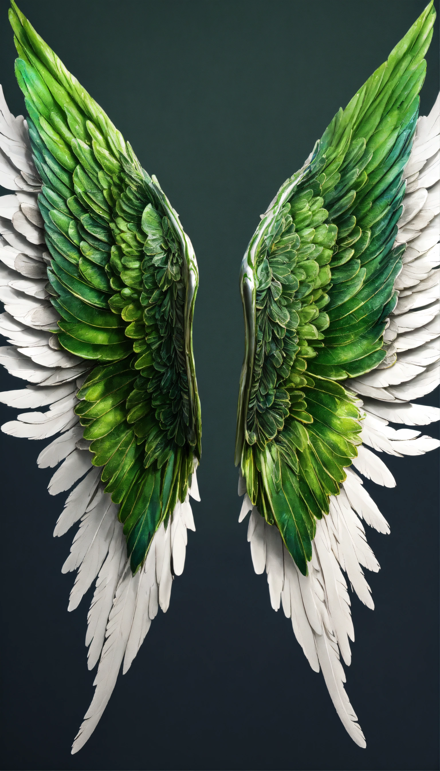 Beautiful and perfect small angel wings, green with white and many detailed and defined details. just a pair of small, complete green wings with white. hyper-detailed and hyper-realistic wings. wings with a slight decoration in shades of green and white. small wings complete both the right wing and the left wing, the background is dark blue, 3d, masterpiece. hd. realism. high resolution. high quality. digital art. 8k