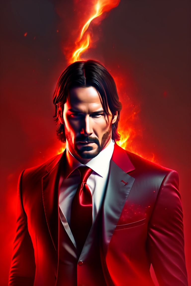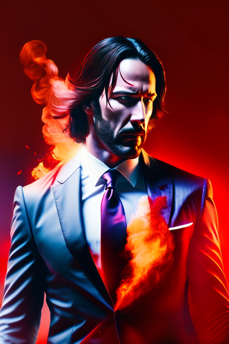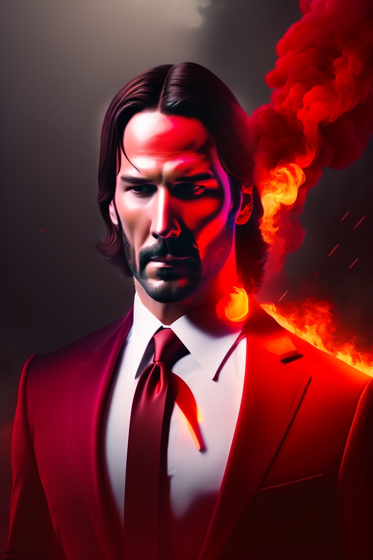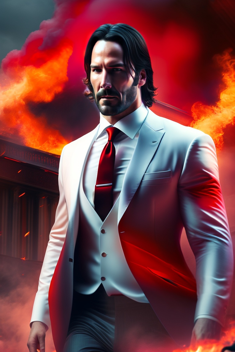 John wick, in white suit and blood-red tie, with silhouette stepping out of burning house, 4k, high res, masterpiece, best quality, sharp focus, (cinematic lighting), collarbone, [:(detailed body: 1.2):0.2]