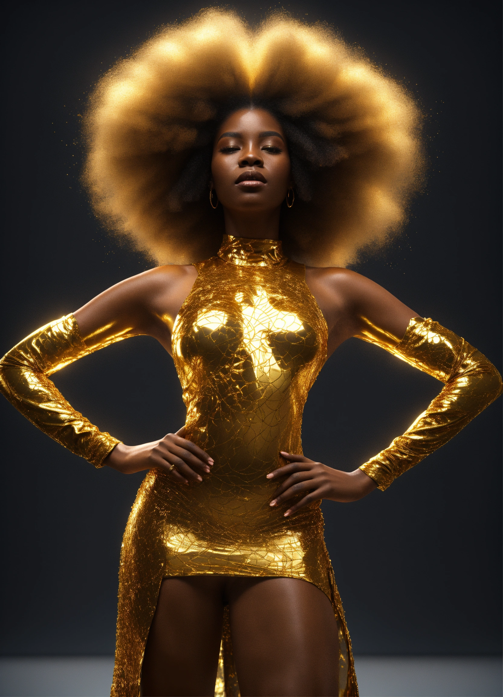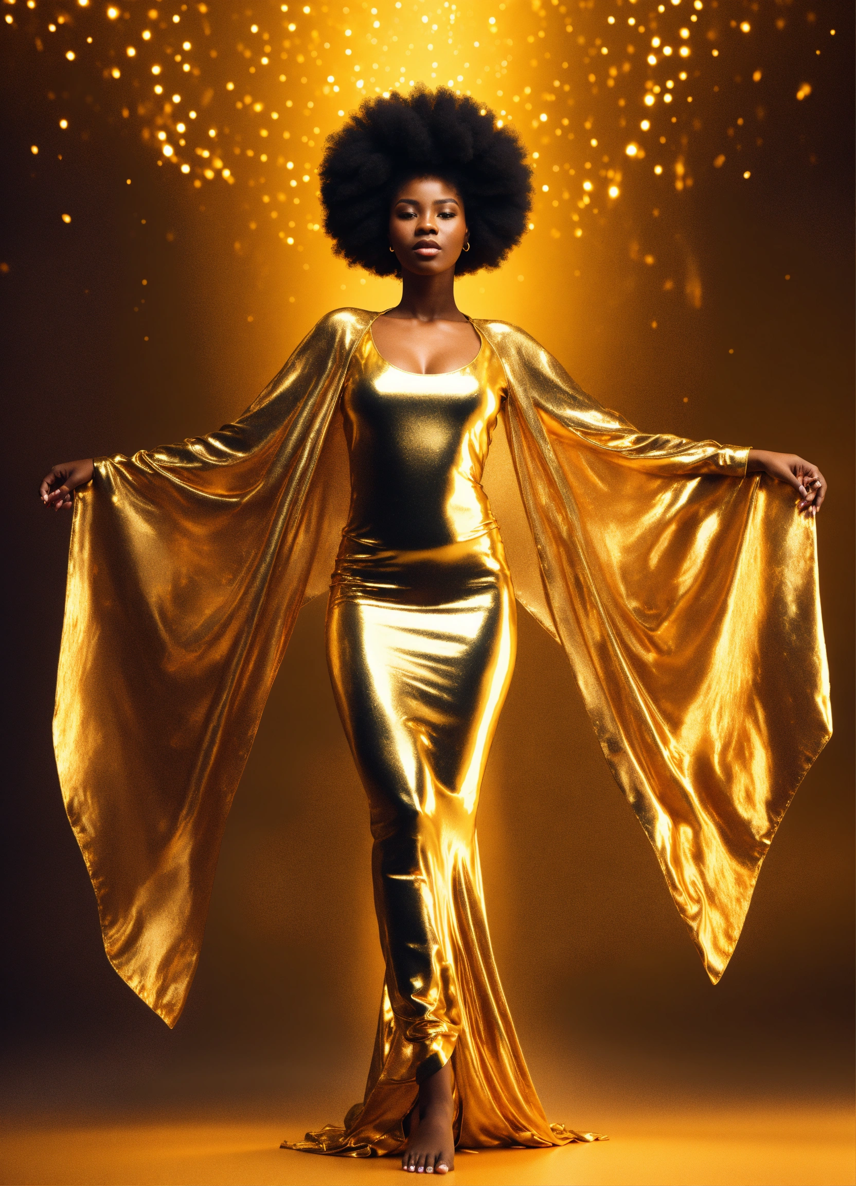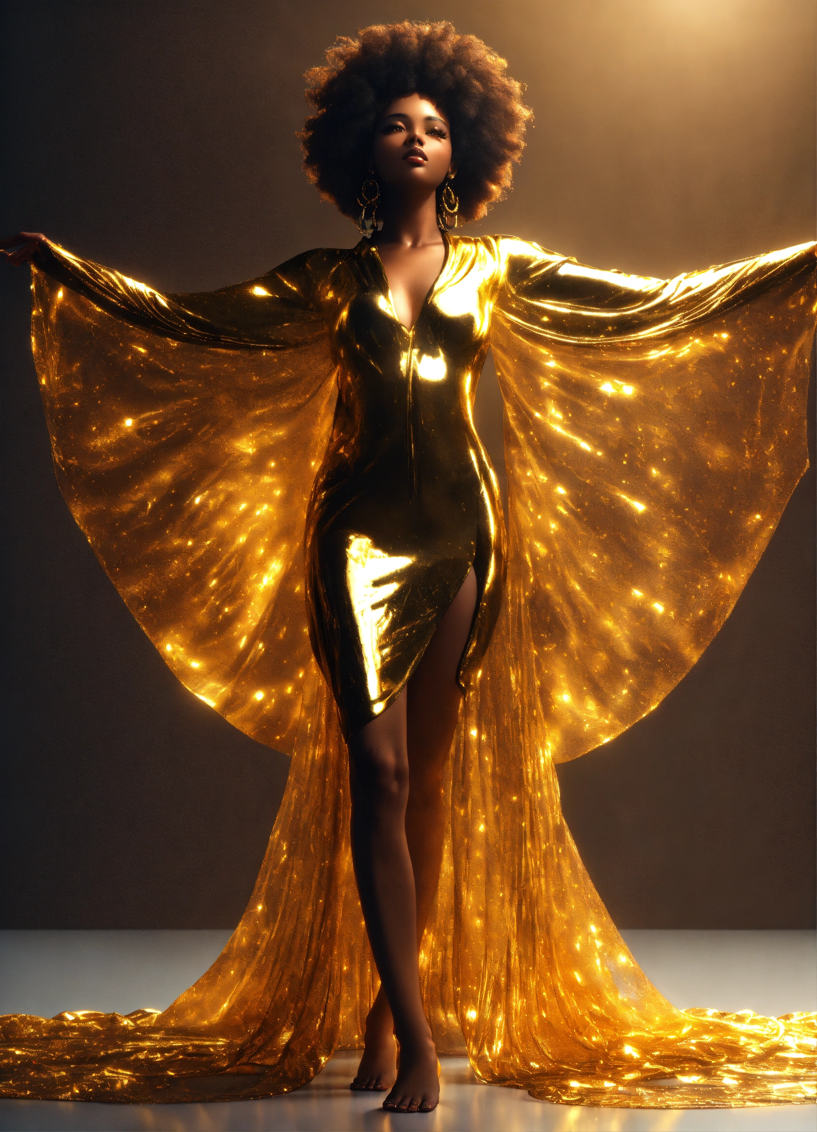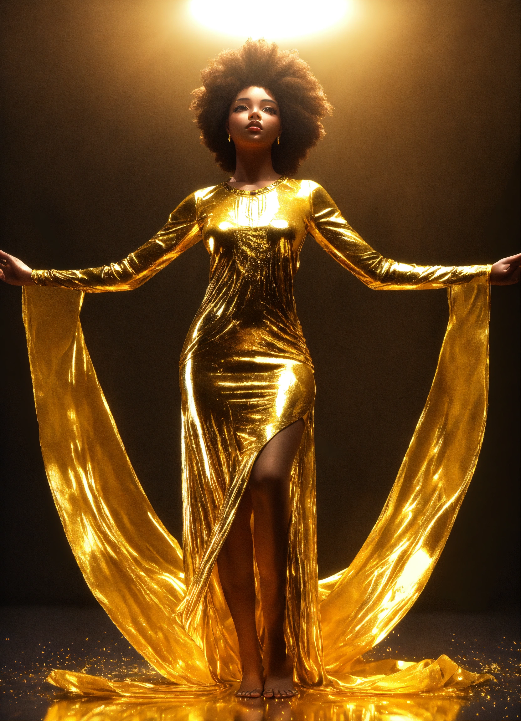 3d render of black woman with afro, full body shot, standing, arms outstretched to sides at shoulders palms up, eyes open looking directly into camera, translucent skin, liquid gold flows through her entire translucent face and body, illuminating her form from within, wearing long, flowing gold african style clothing