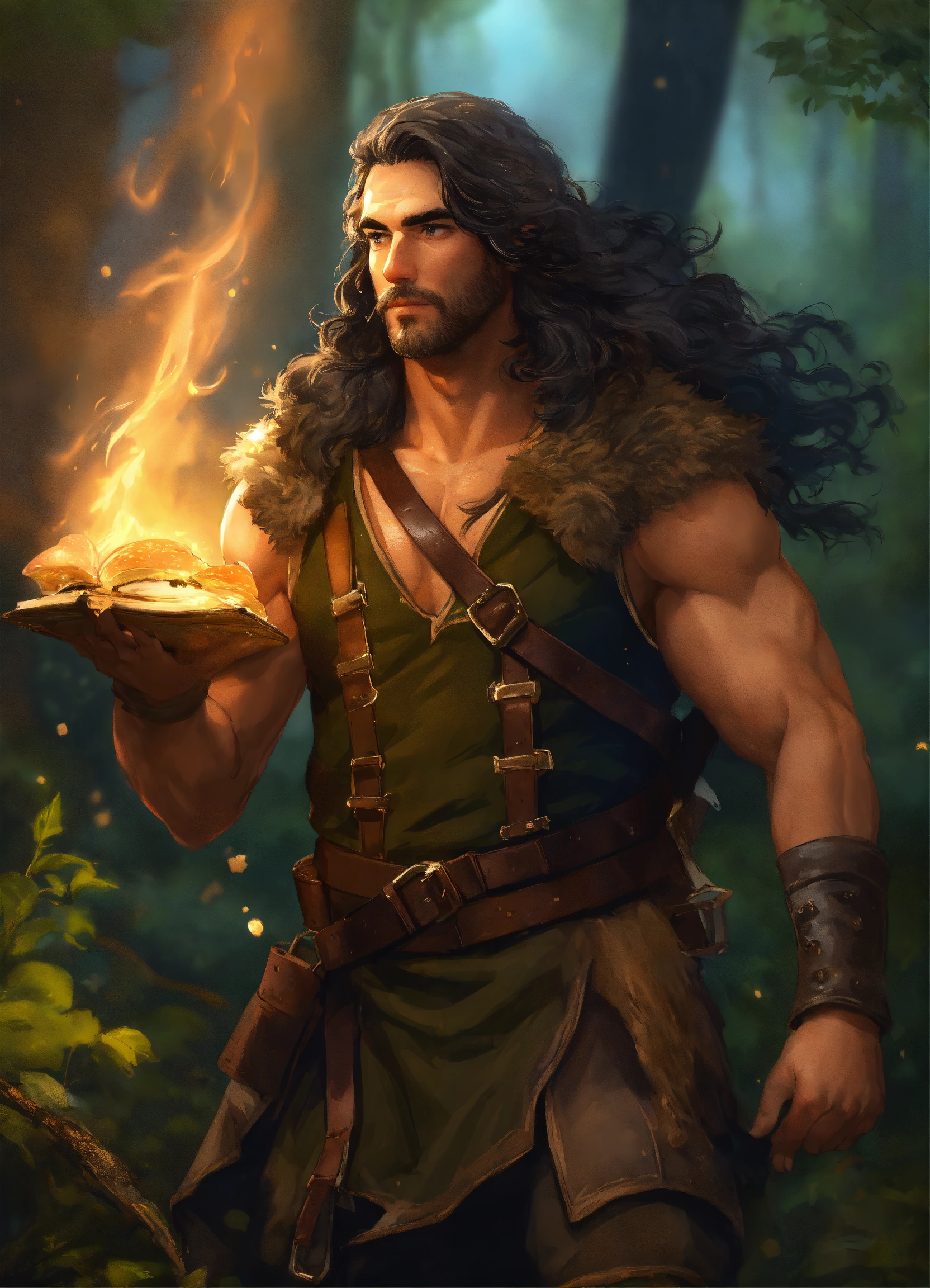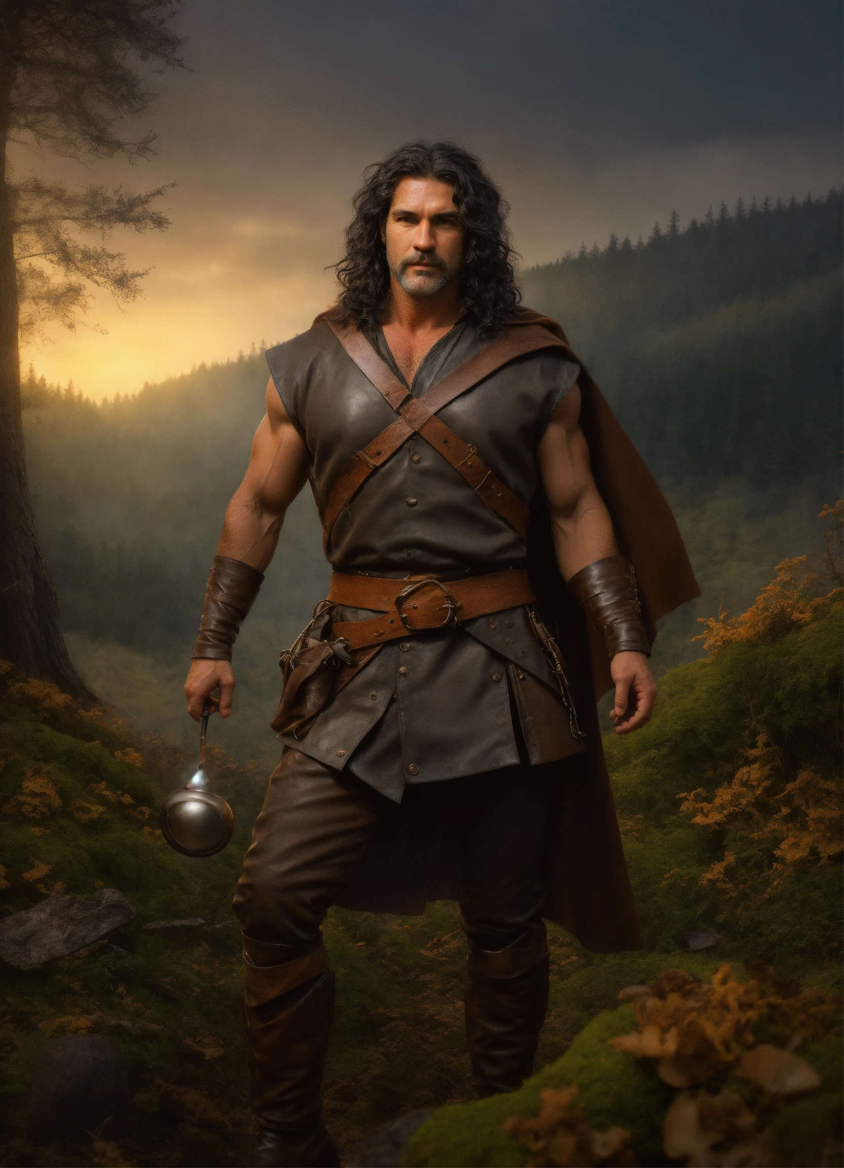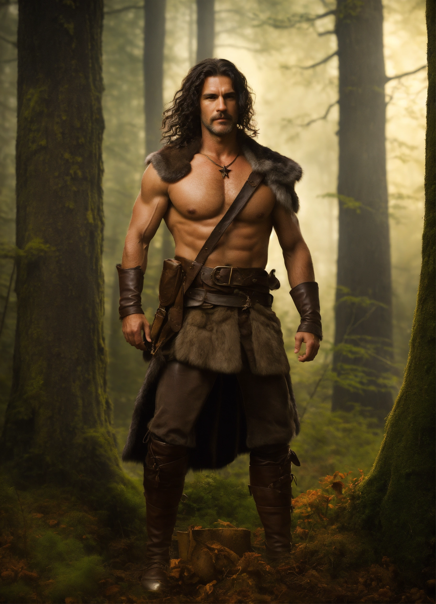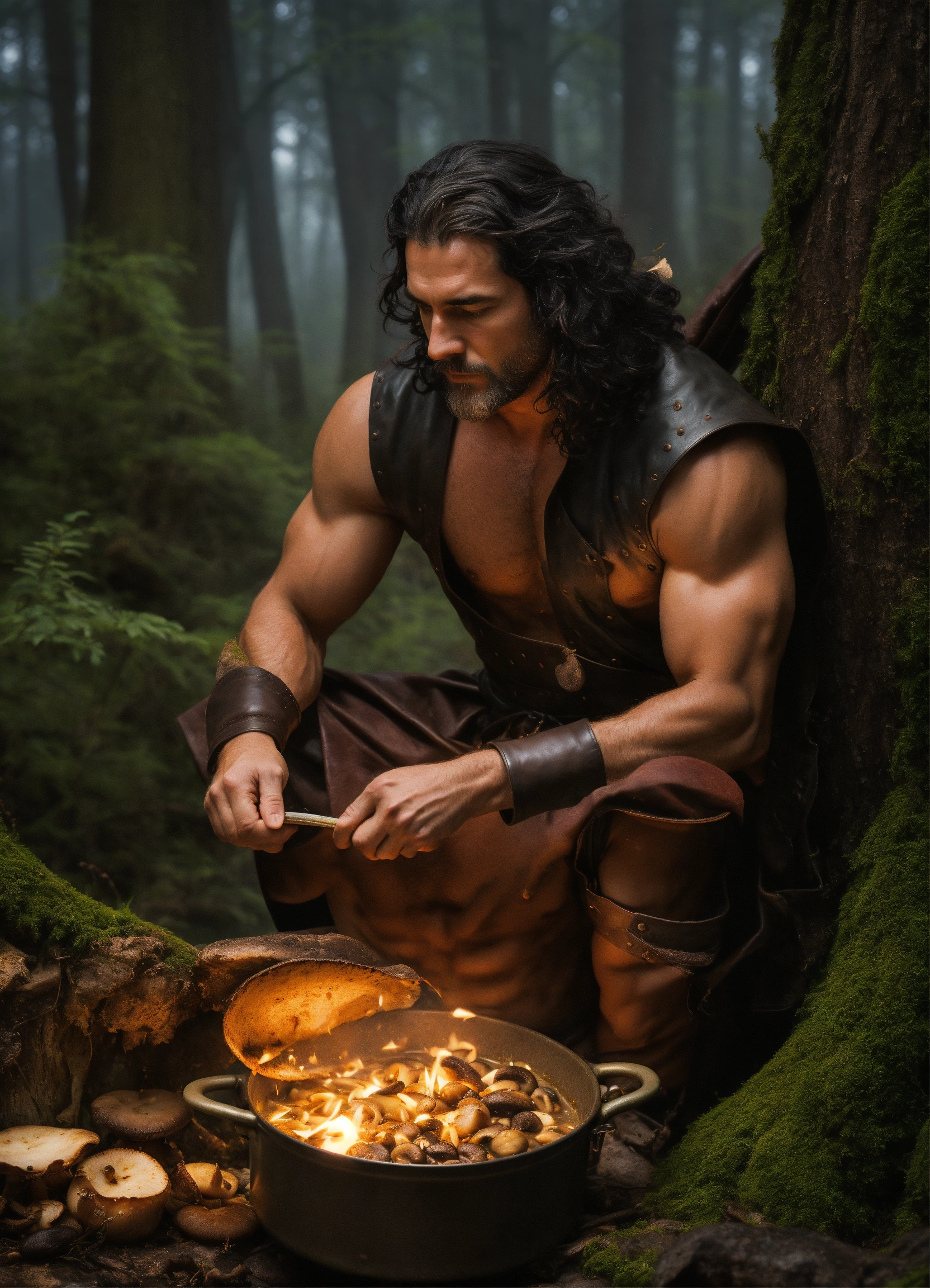 Thin body, thin arms, small chest, 45 year old male medieval mushroom hunter with very long wild curly black and gray colored hair blowing in the wind, hairy chest and forearms, chiseled jaw, square chin, dimples, clean shaven, long roman nose, strong brow, wearing a leather sleeveless vest, leather kilt, and fur cloak, shirtless, in night time a dark forest with stars above; cooking mushroom stew