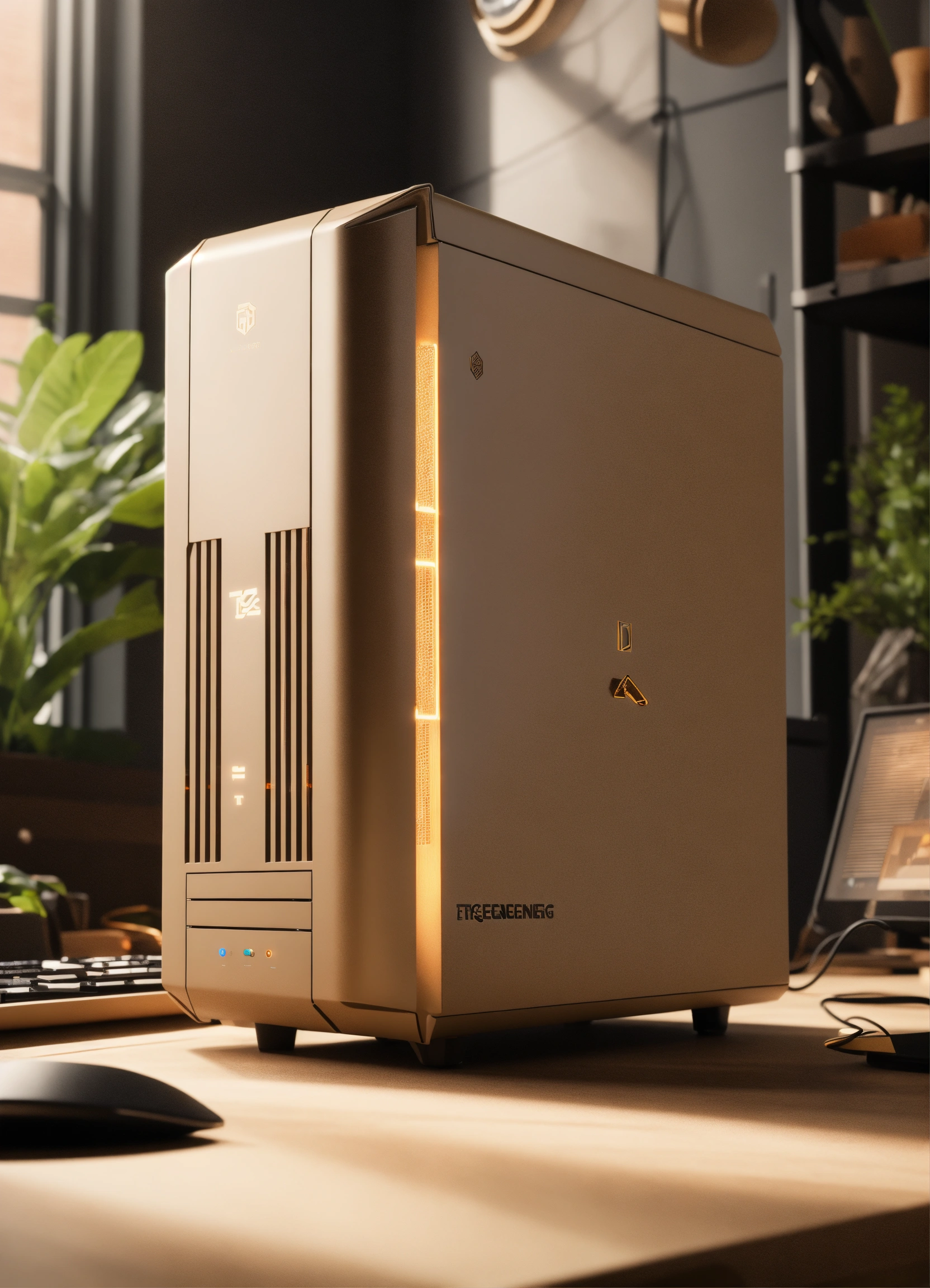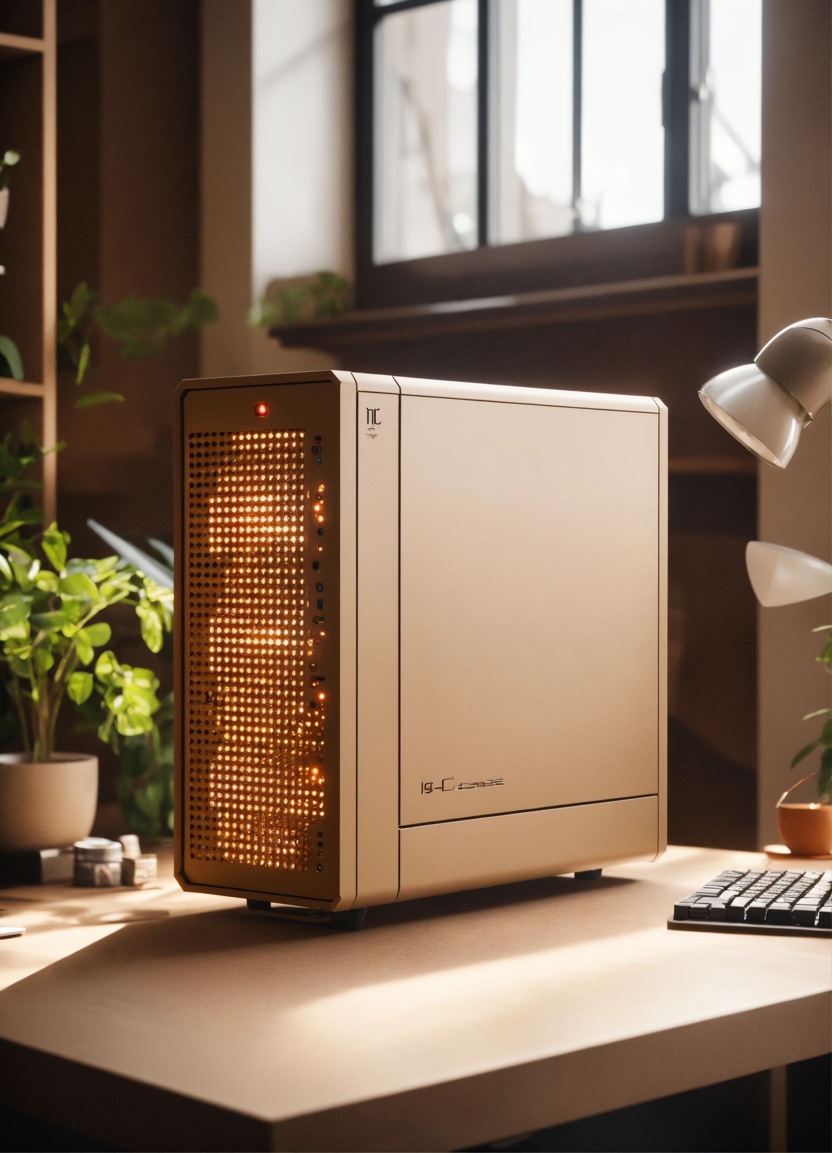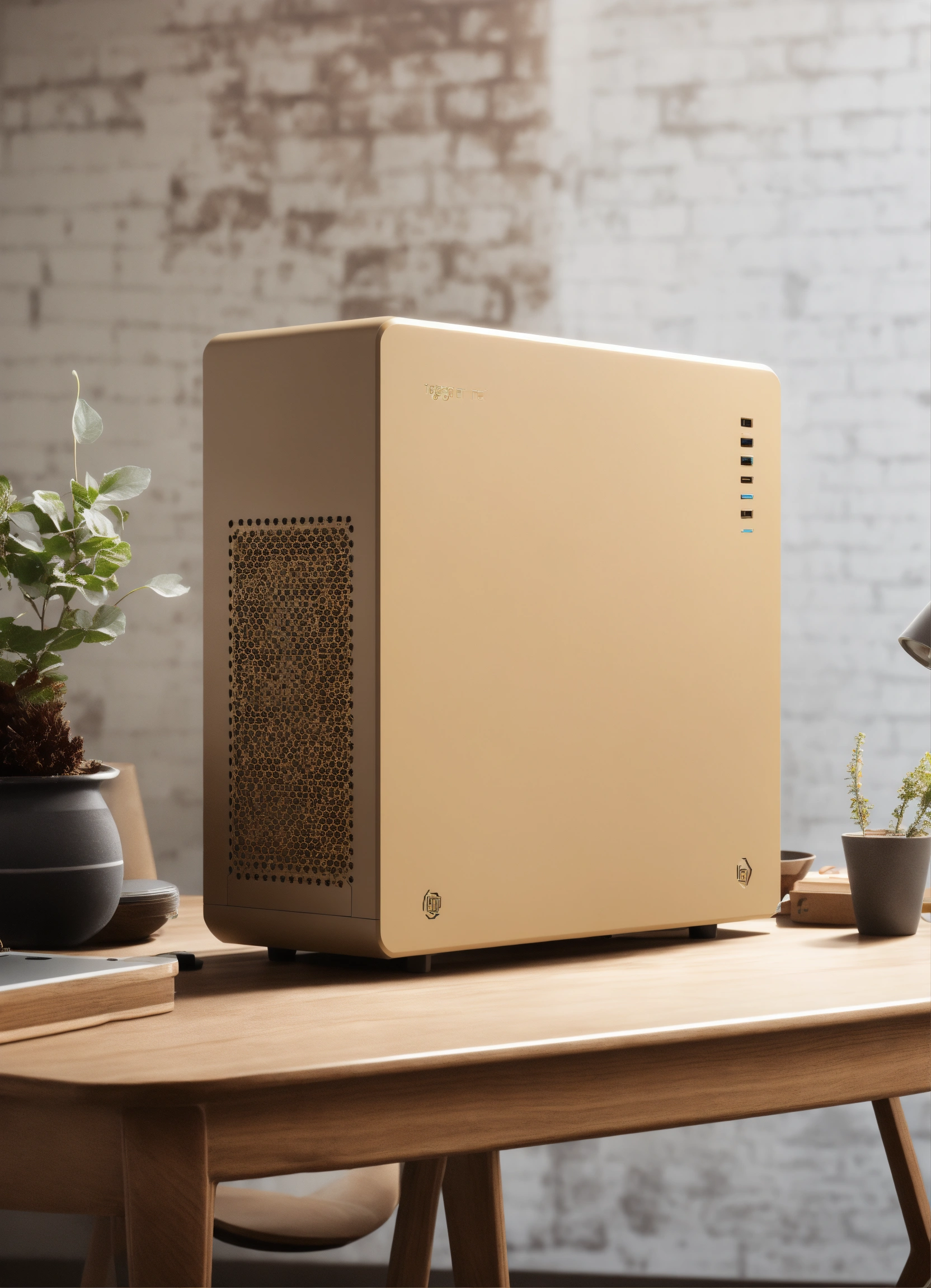 A stunning, minimalist beige pc case designed by teenage engineering. product ad retro. industrial design inspiration. unreal engine render, natural lighting, on desk, beautiful shot